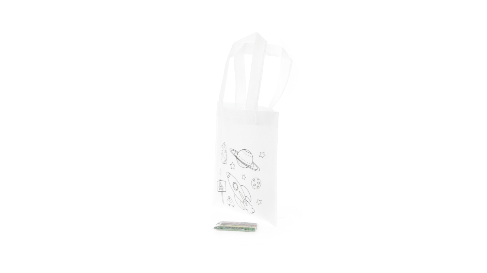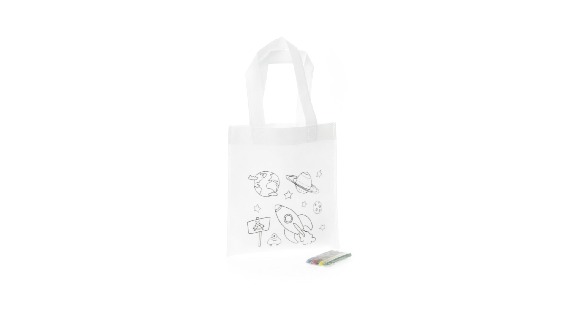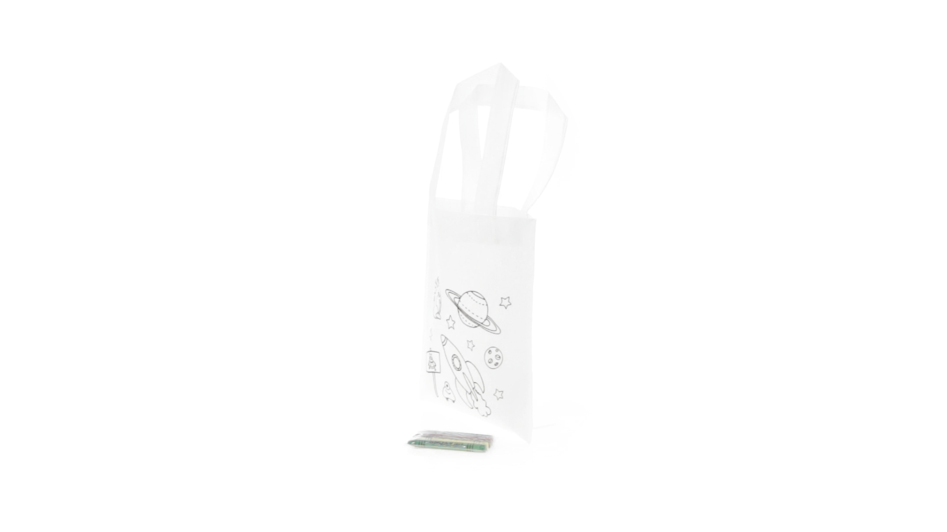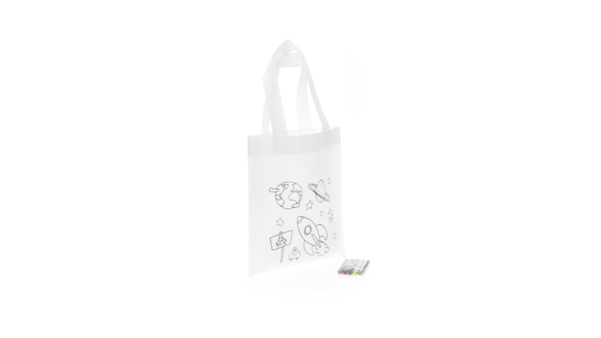 Non-Woven-Tasche aus Faservlies in Weiss. Speziell entwickelt für das Bemalen mit Wachsmalstiften. Enthält 5 zylinderförmige Wachsmalstifte in verschiedenen Farben. Mit 33 cm langen Henkeln und hitzeversiegeltem Finish.