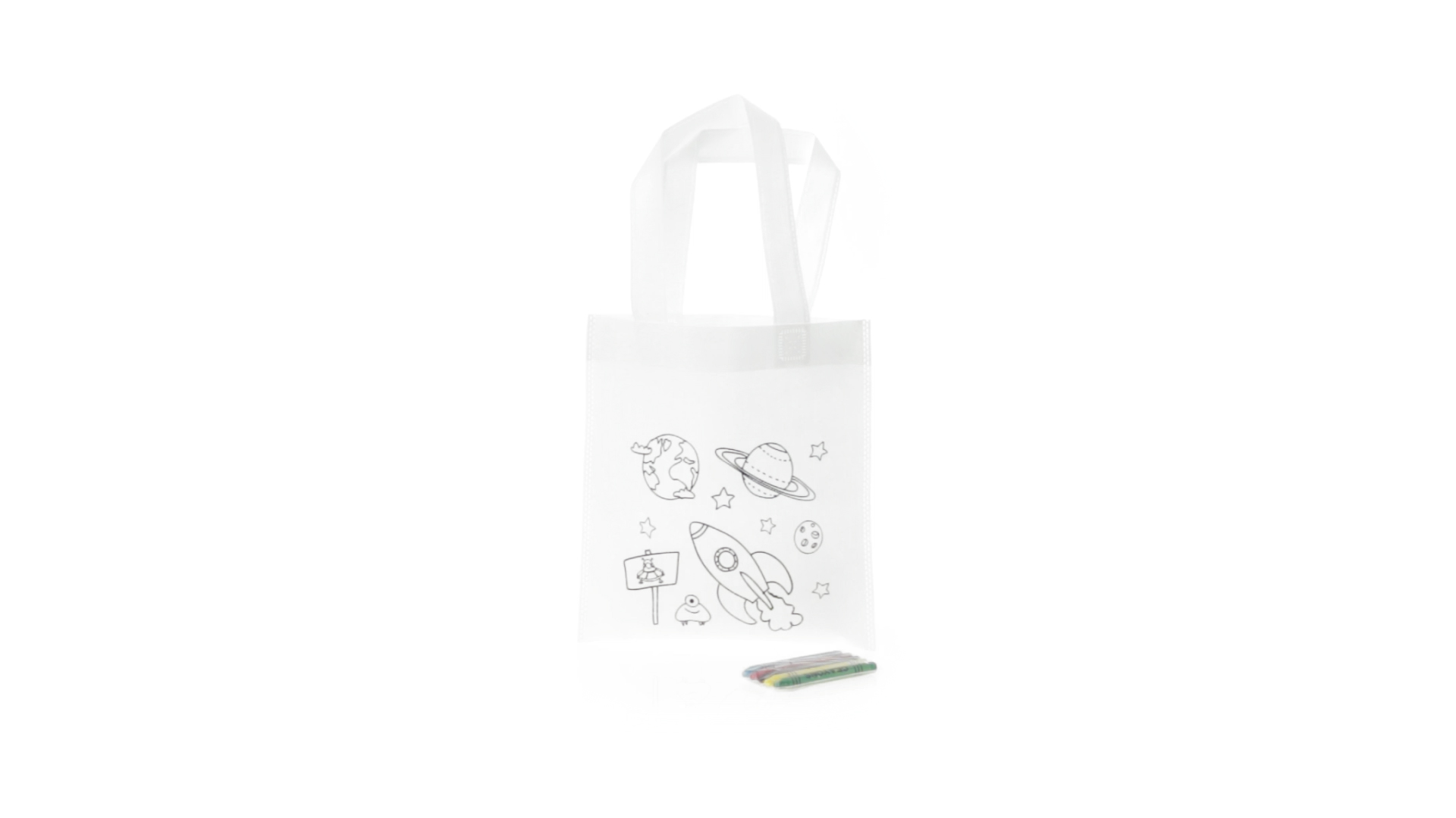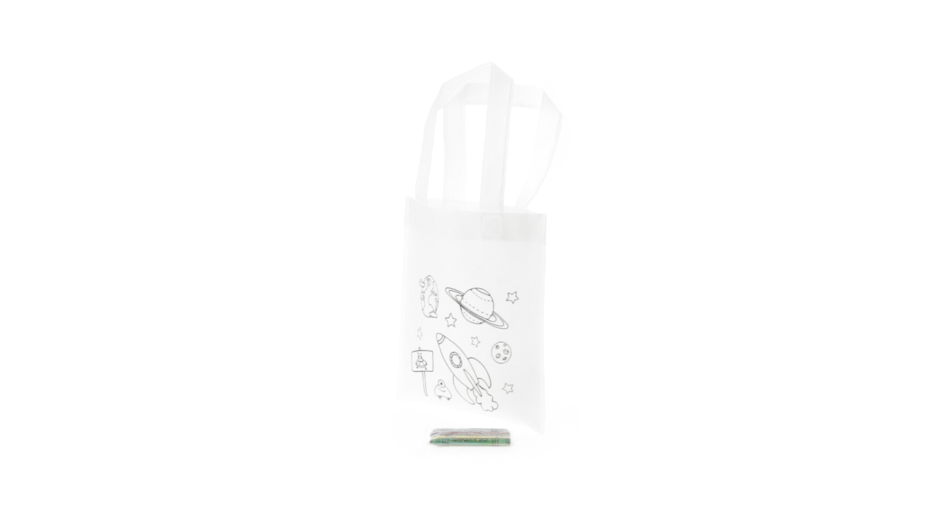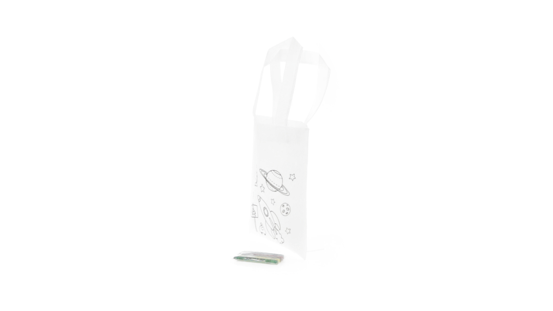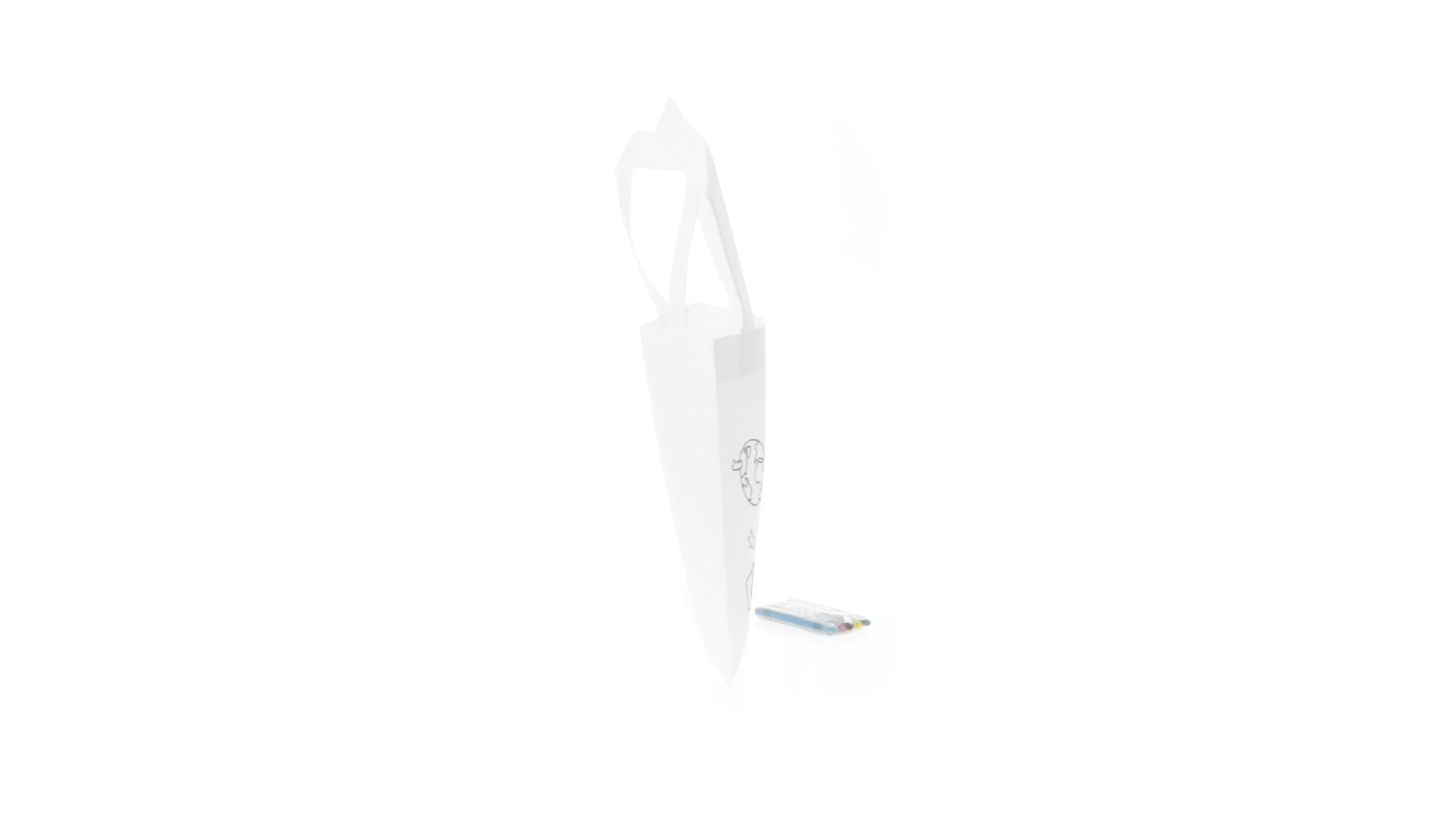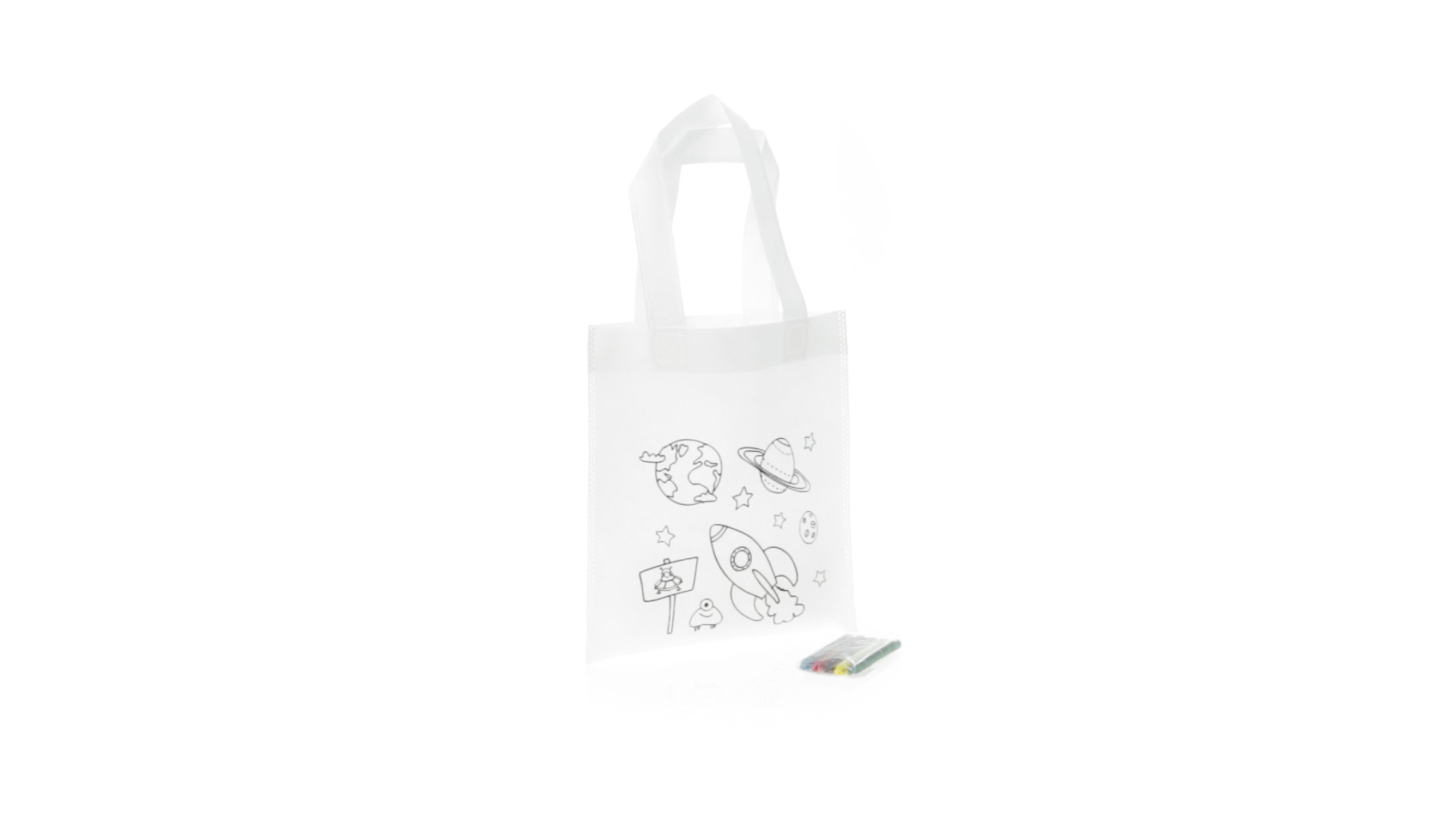 Non-Woven-Tasche aus Faservlies in Weiss. Speziell entwickelt für das Bemalen mit Wachsmalstiften. Enthält 5 zylinderförmige Wachsmalstifte in verschiedenen Farben. Mit 33 cm langen Henkeln und hitzeversiegeltem Finish.