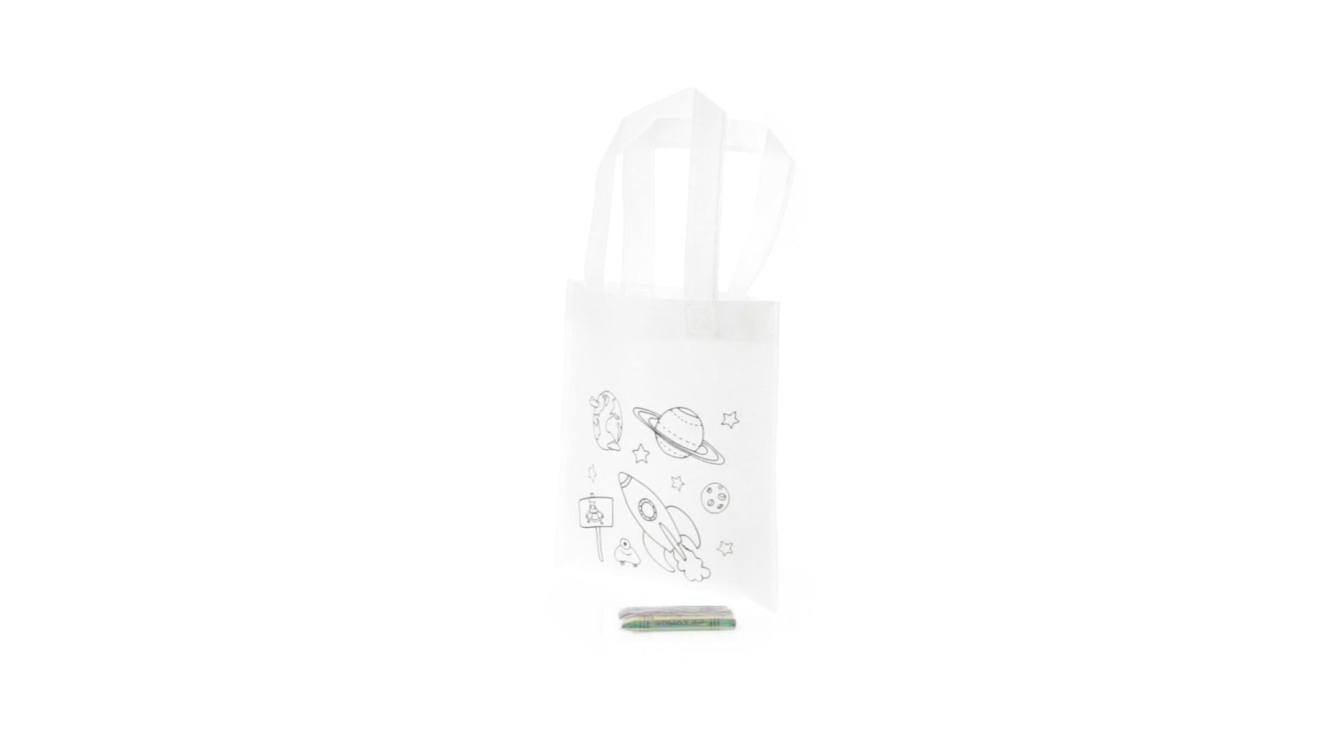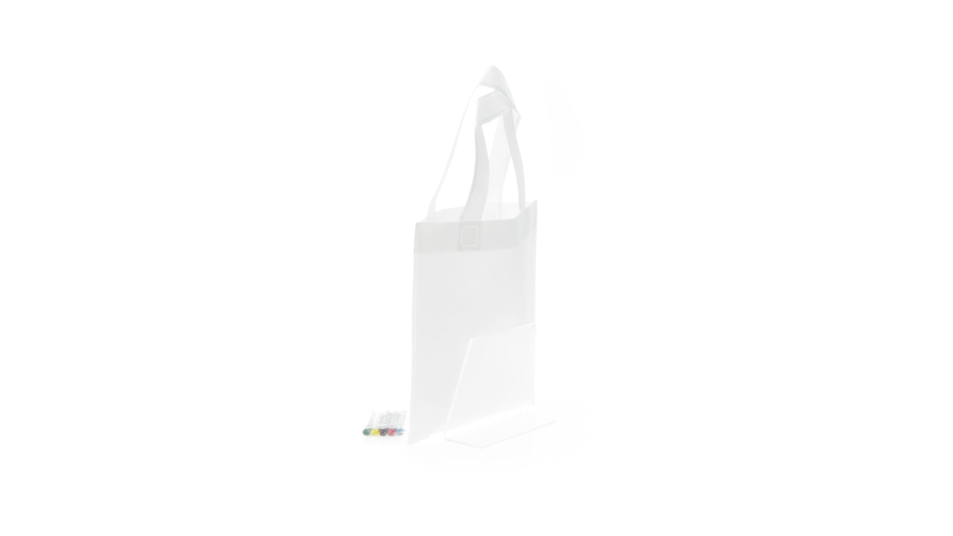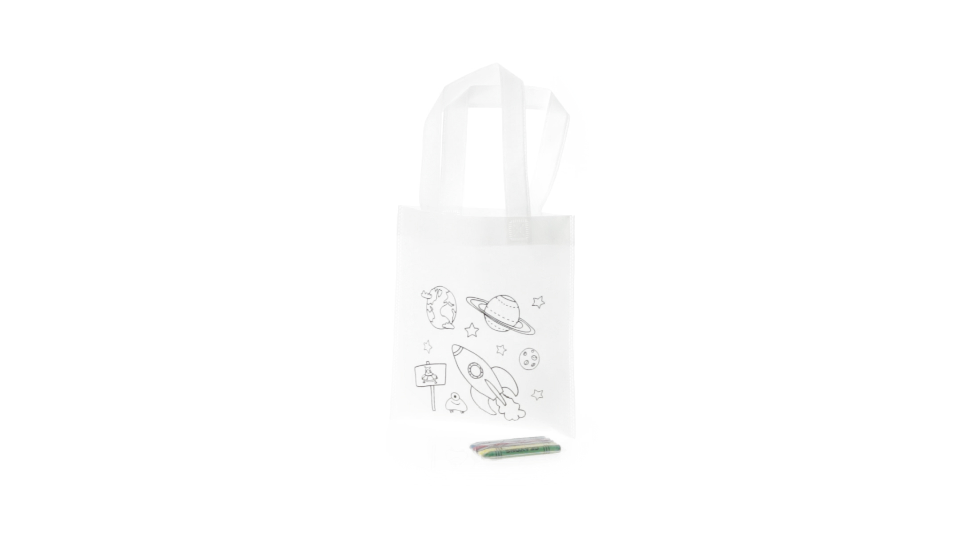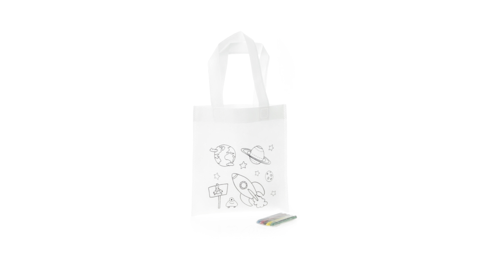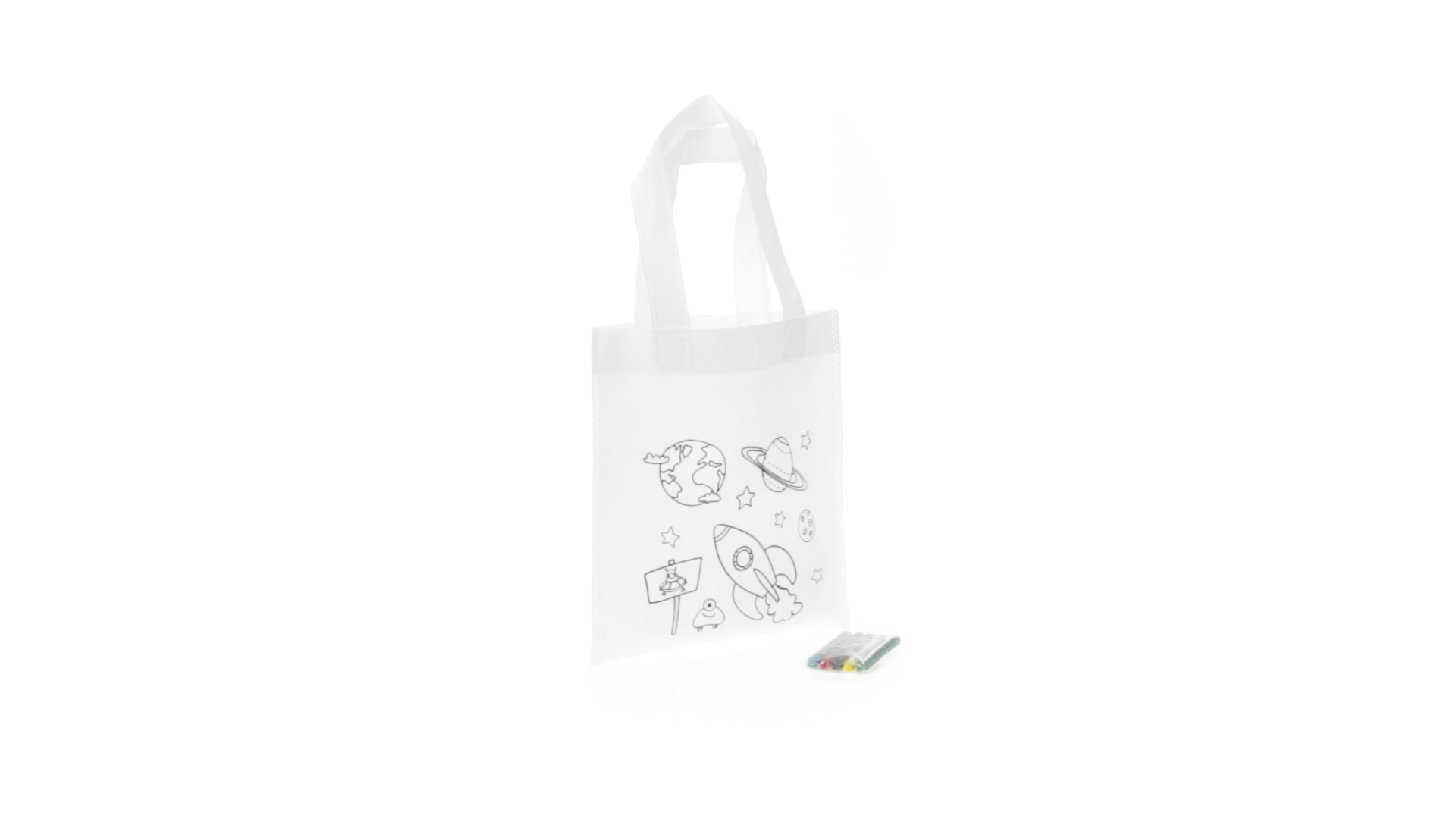 Non-Woven-Tasche aus Faservlies in Weiss. Speziell entwickelt für das Bemalen mit Wachsmalstiften. Enthält 5 zylinderförmige Wachsmalstifte in verschiedenen Farben. Mit 33 cm langen Henkeln und hitzeversiegeltem Finish.