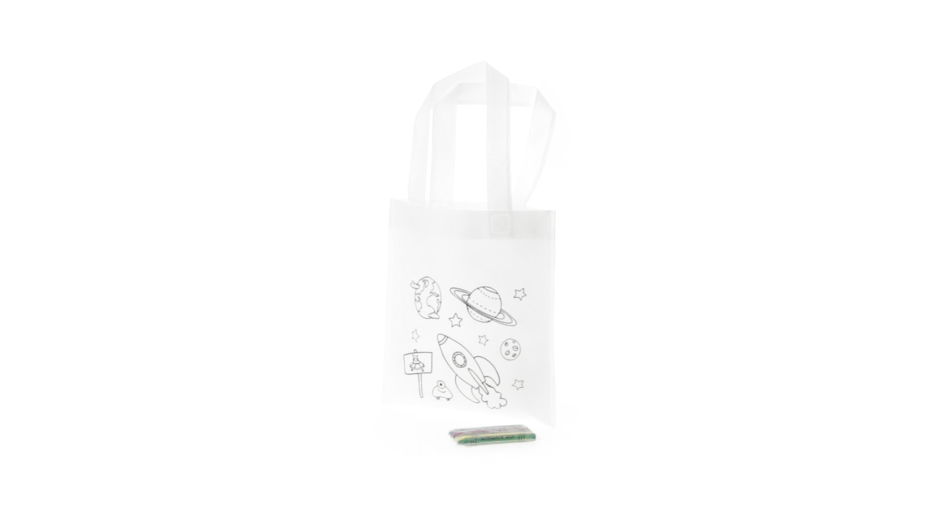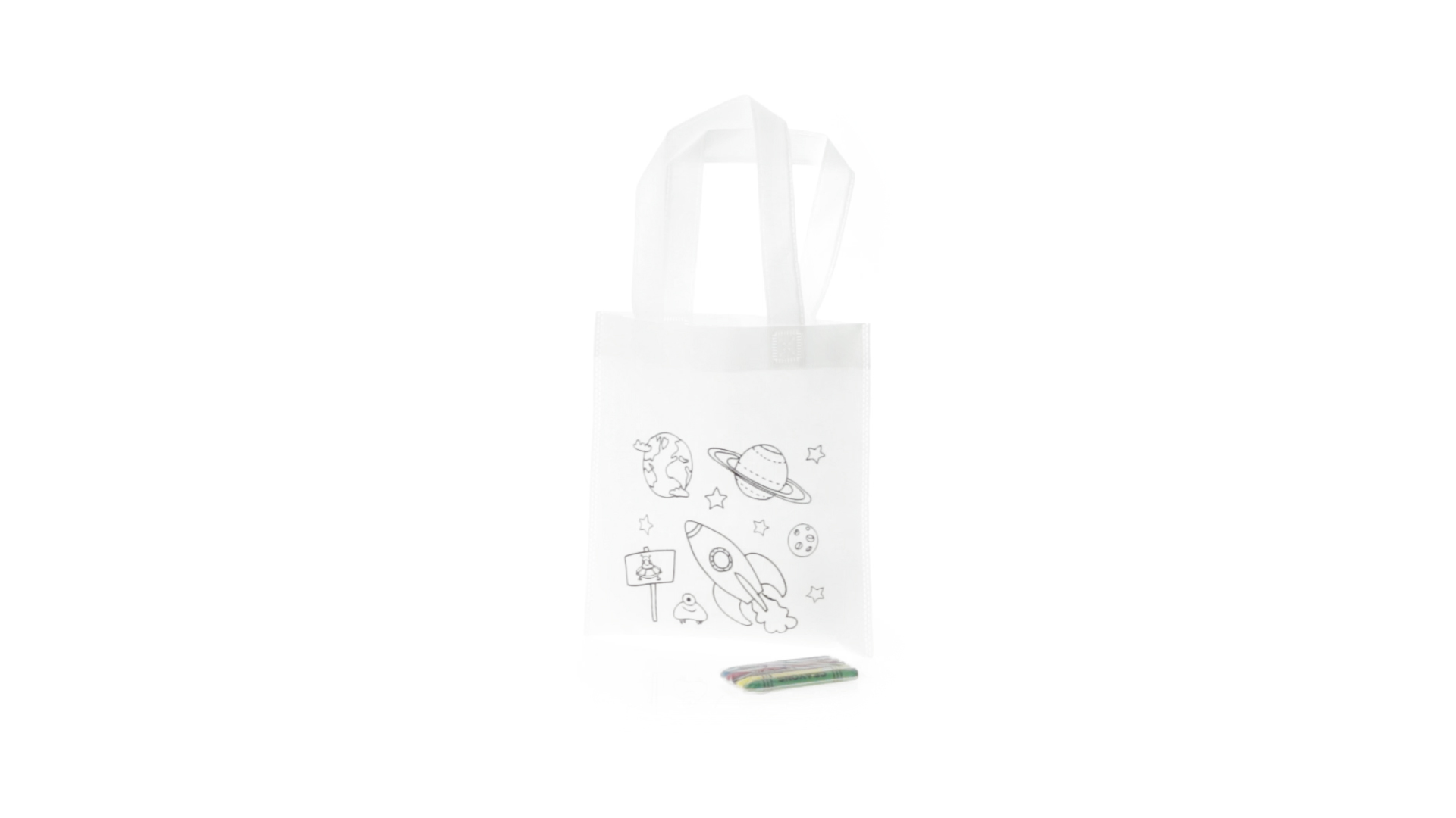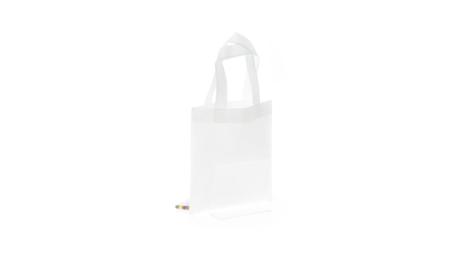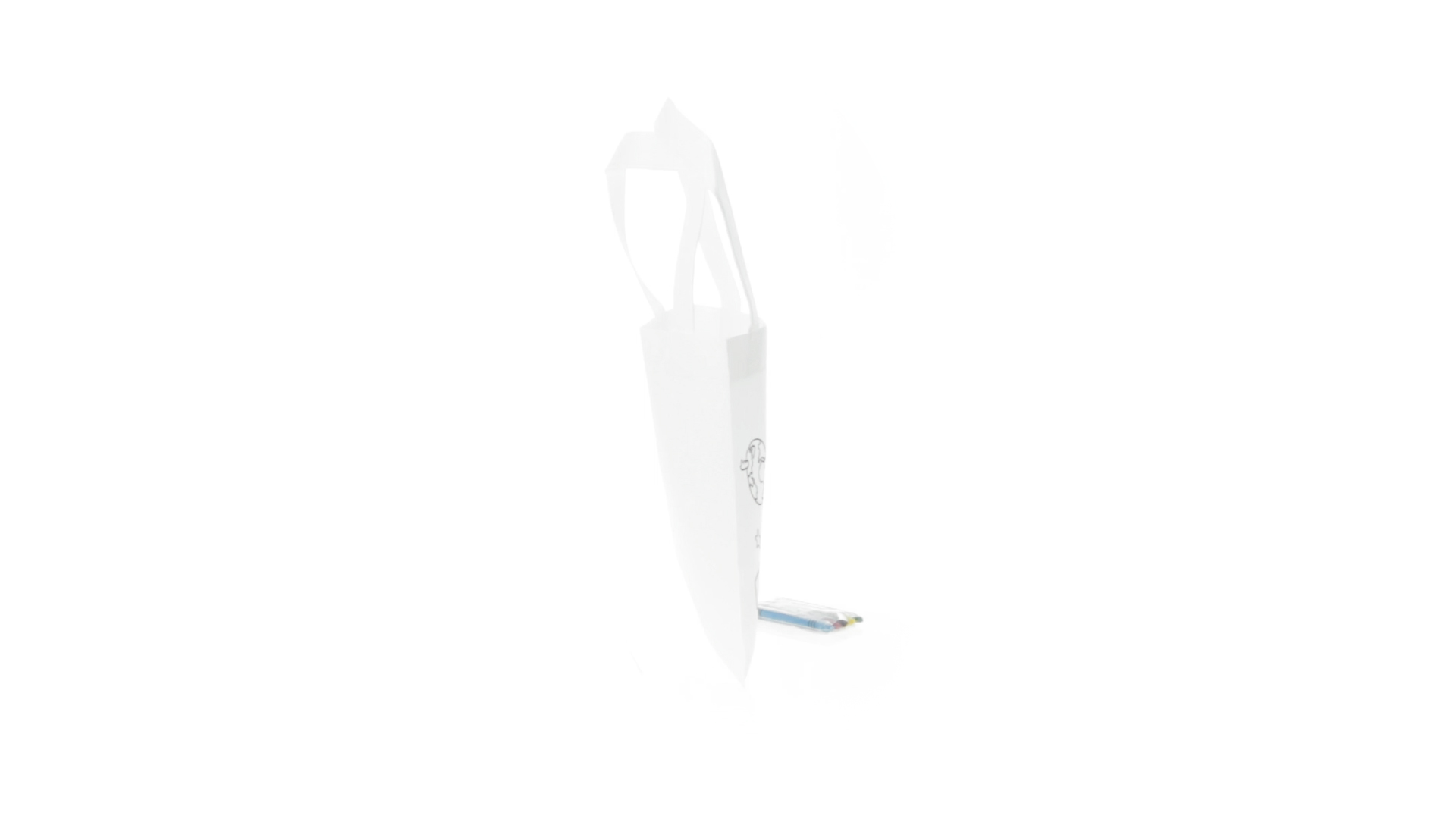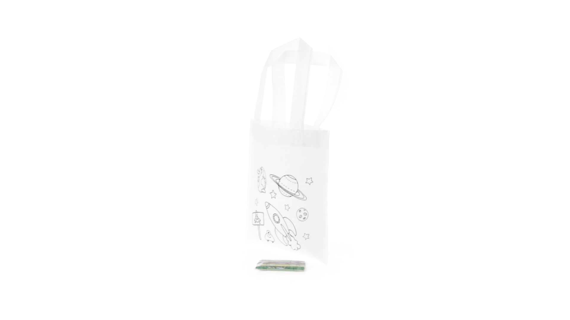 Non-Woven-Tasche aus Faservlies in Weiss. Speziell entwickelt für das Bemalen mit Wachsmalstiften. Enthält 5 zylinderförmige Wachsmalstifte in verschiedenen Farben. Mit 33 cm langen Henkeln und hitzeversiegeltem Finish.