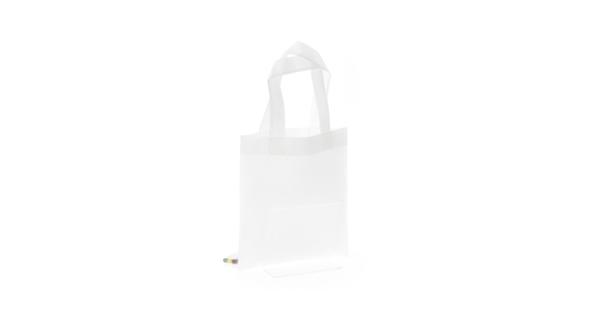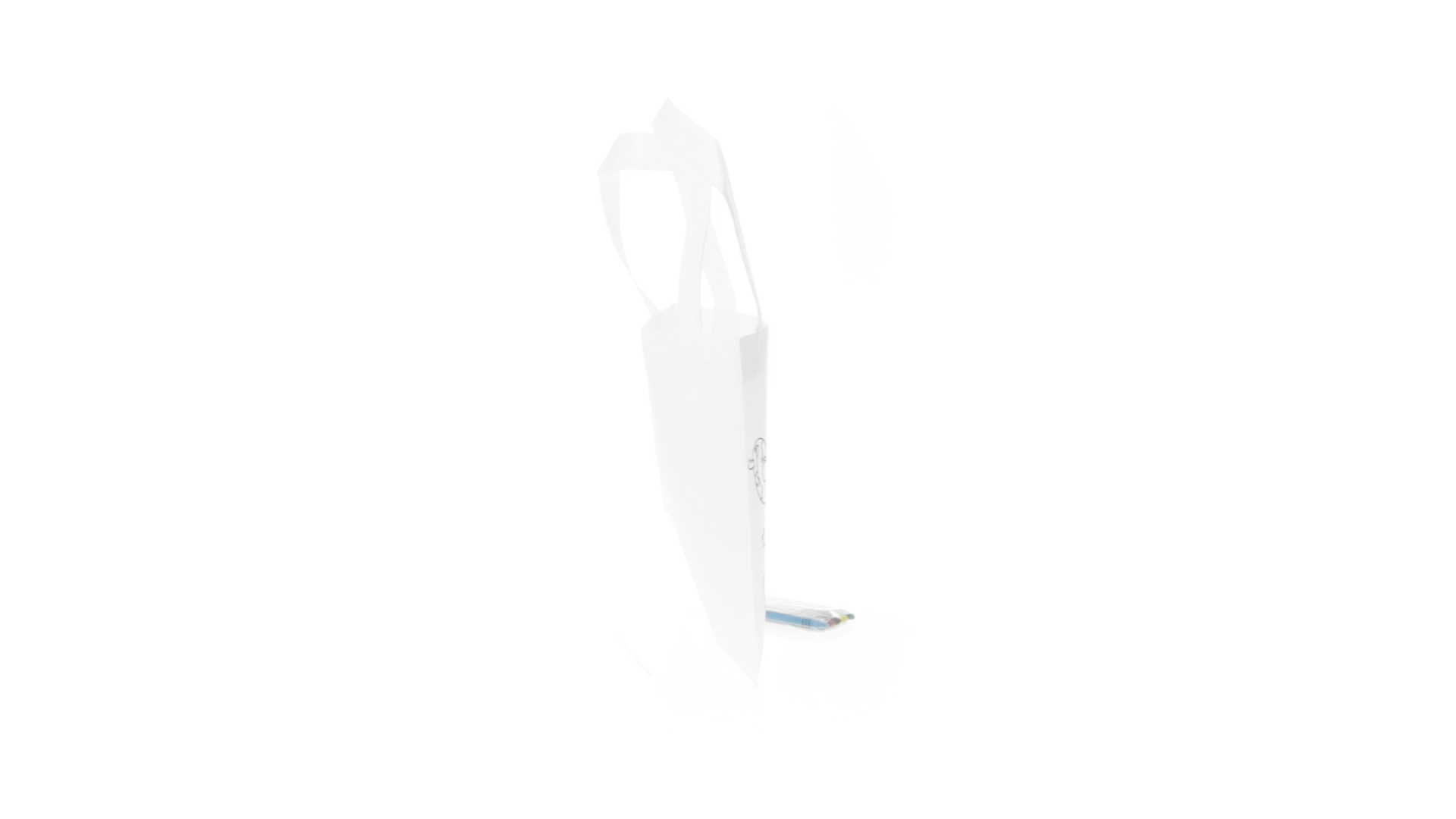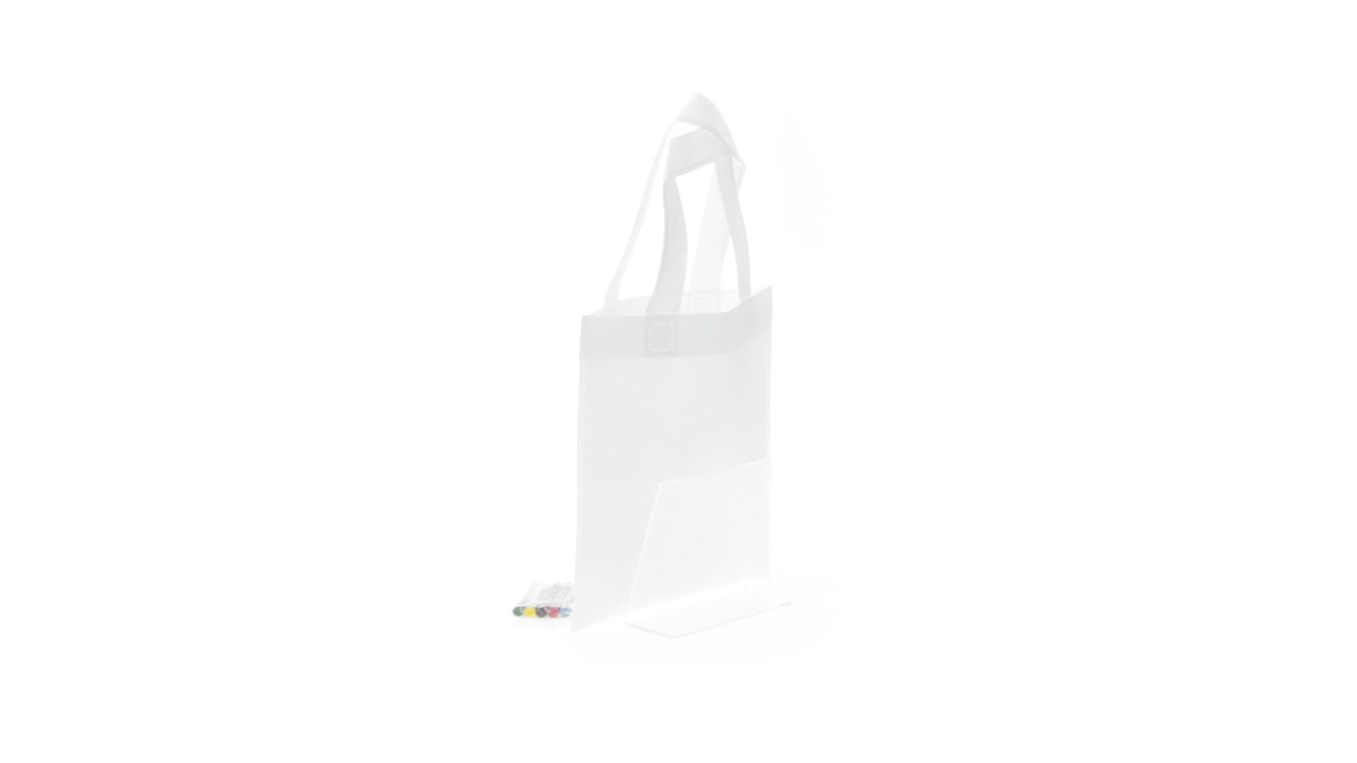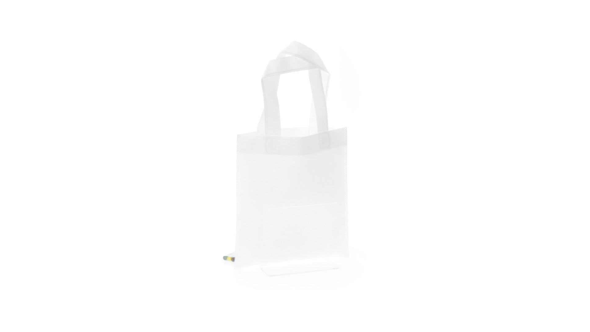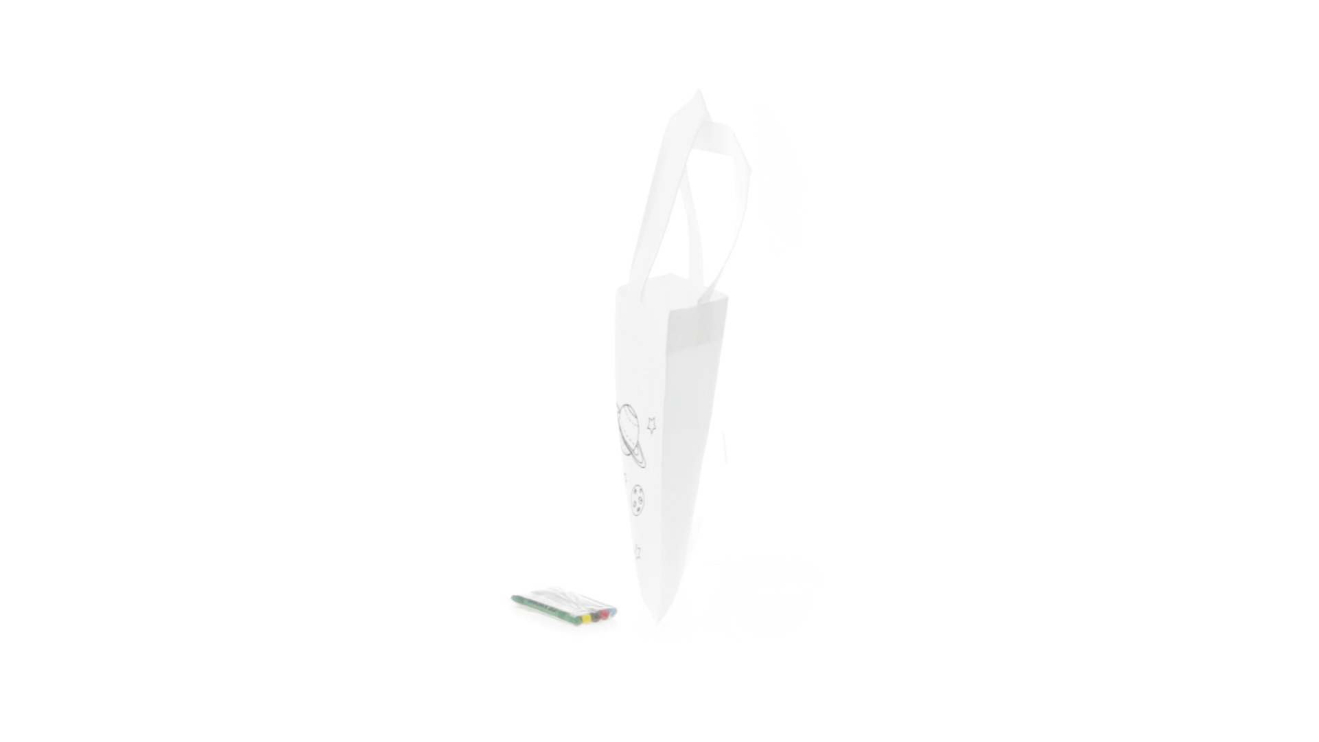 Non-Woven-Tasche aus Faservlies in Weiss. Speziell entwickelt für das Bemalen mit Wachsmalstiften. Enthält 5 zylinderförmige Wachsmalstifte in verschiedenen Farben. Mit 33 cm langen Henkeln und hitzeversiegeltem Finish.