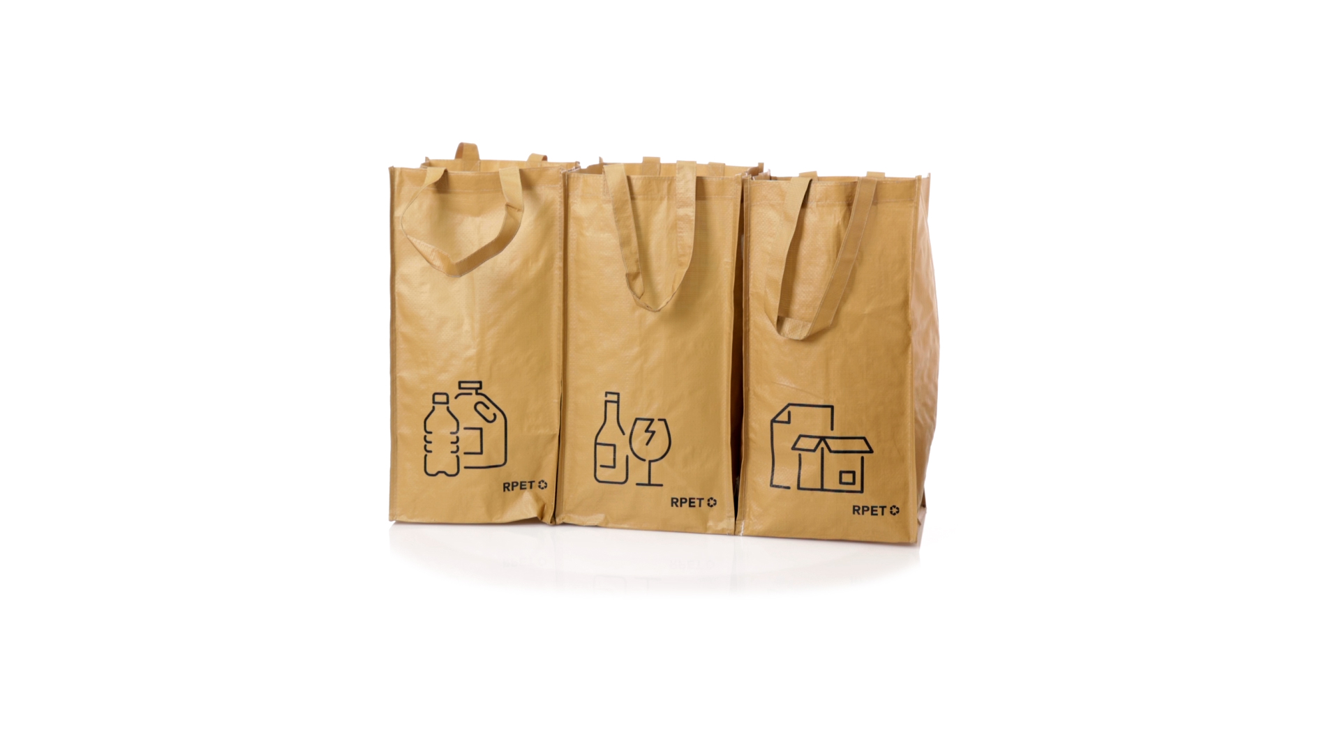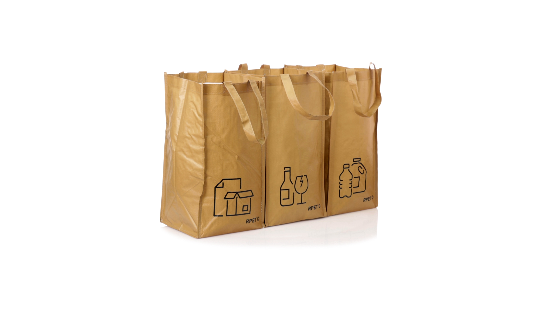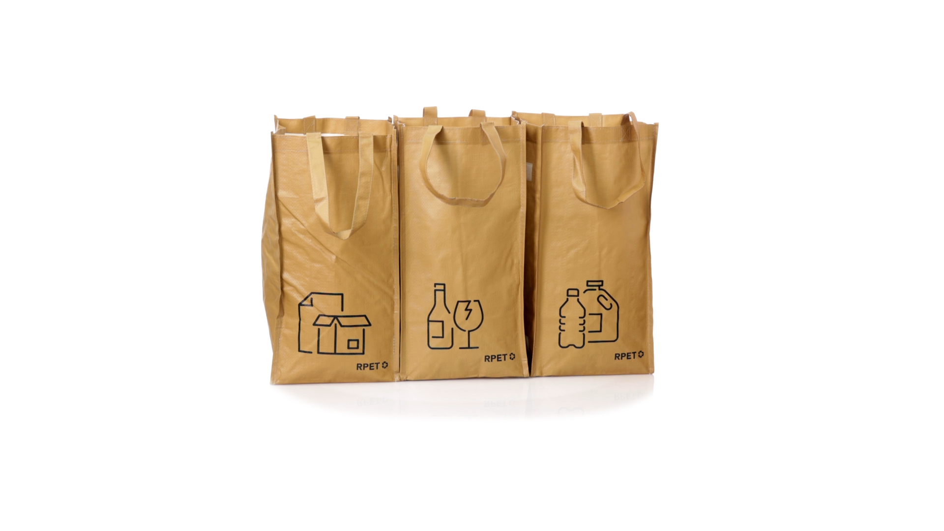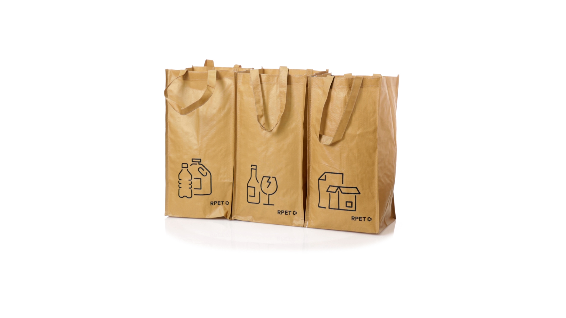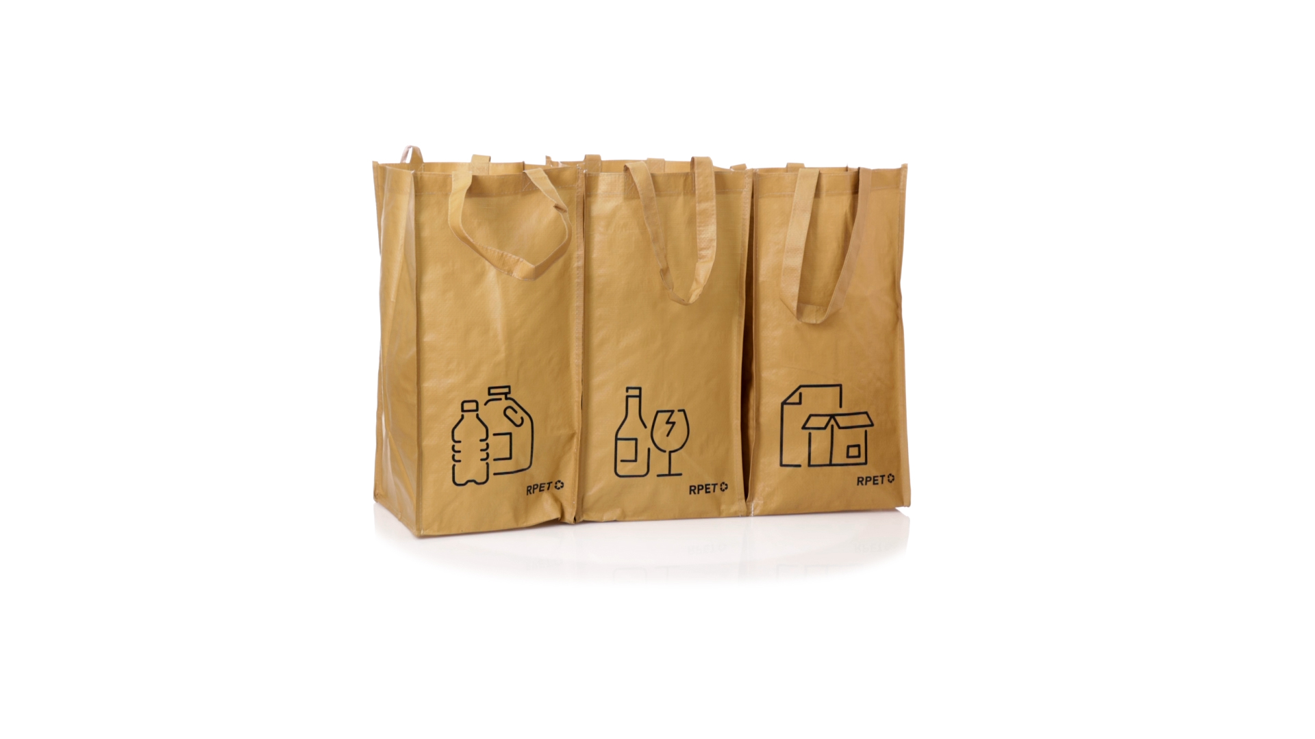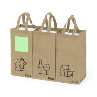 Set mit 3 Recycling-Taschen. Hergestellt aus robustem, mit RPET laminiertem Polyester, das aus recyceltem Kunststoff hergestellt wird, um die Wiederverwendung von Kunststoffabfällen zu fördern und die Nachhaltigkeit unseres Planeten zu unterstützen. Enthält 3 Taschen mit den Massen 23x45x23 cm, die durch Klettverschlüsse an den Seiten miteinander verbunden sind. Mit verstärkten Griffen und Angabe der Abfallarten: Kunststoff und Verpackung, Glas und Papier. RPET-Etikett auf dem Boden jedes Beutels.