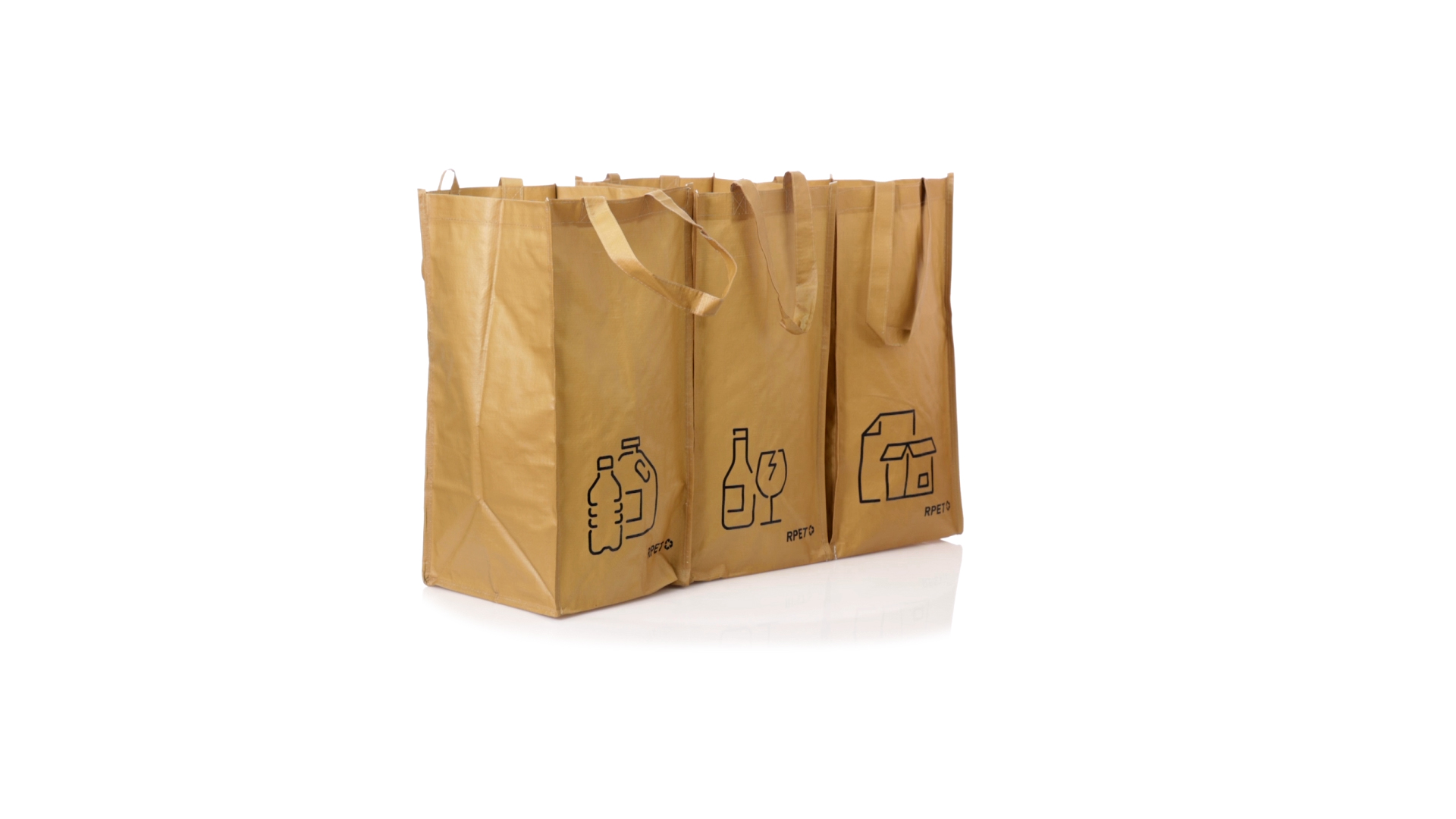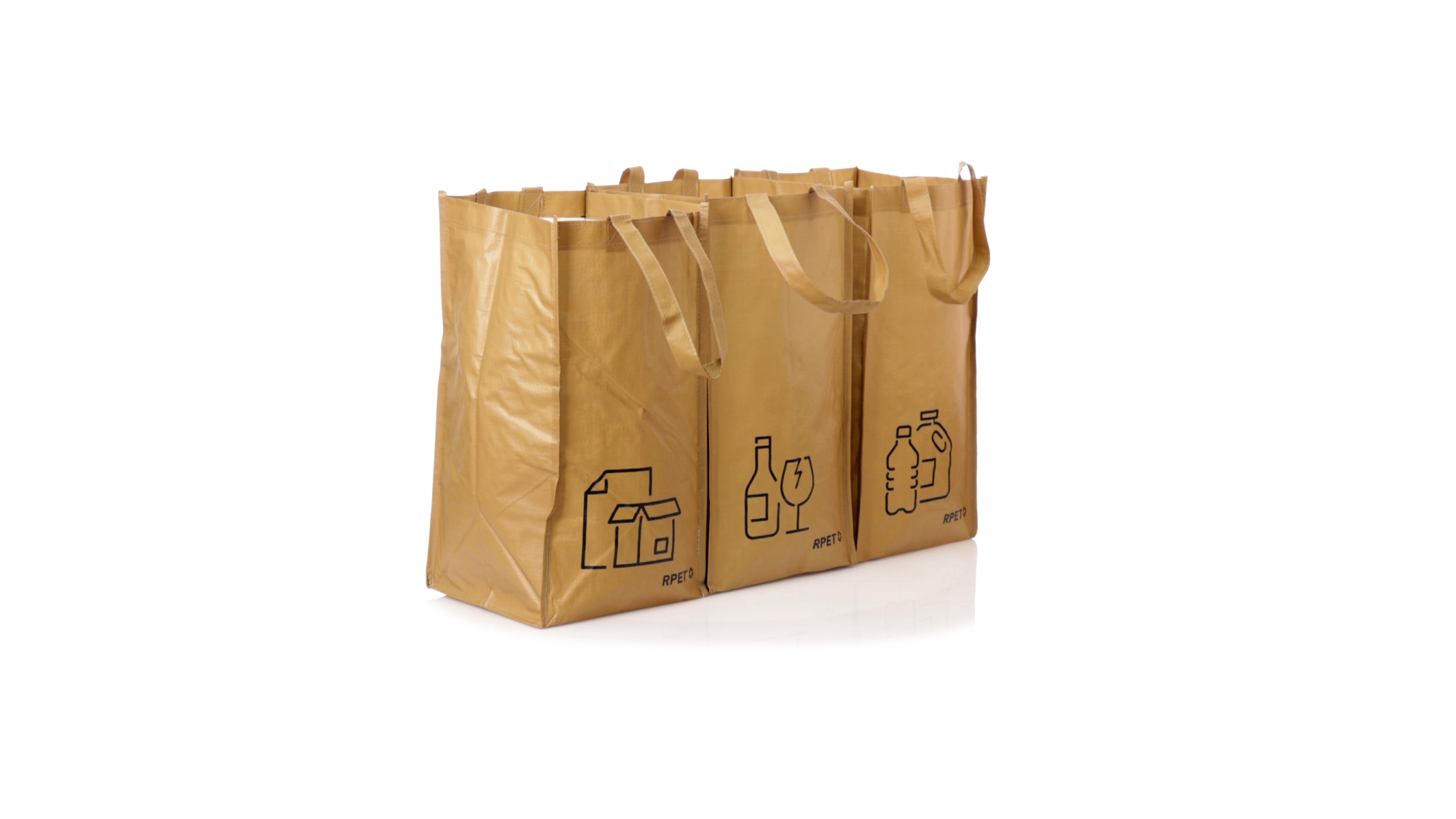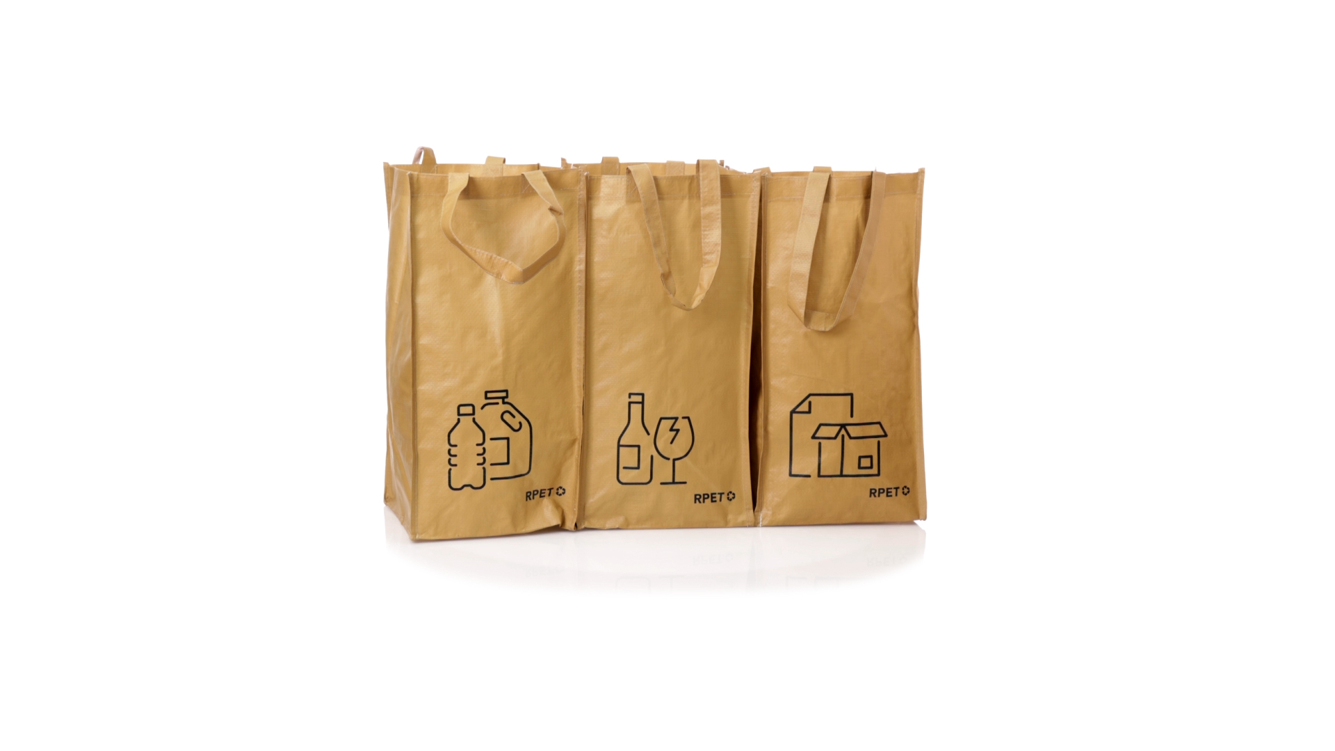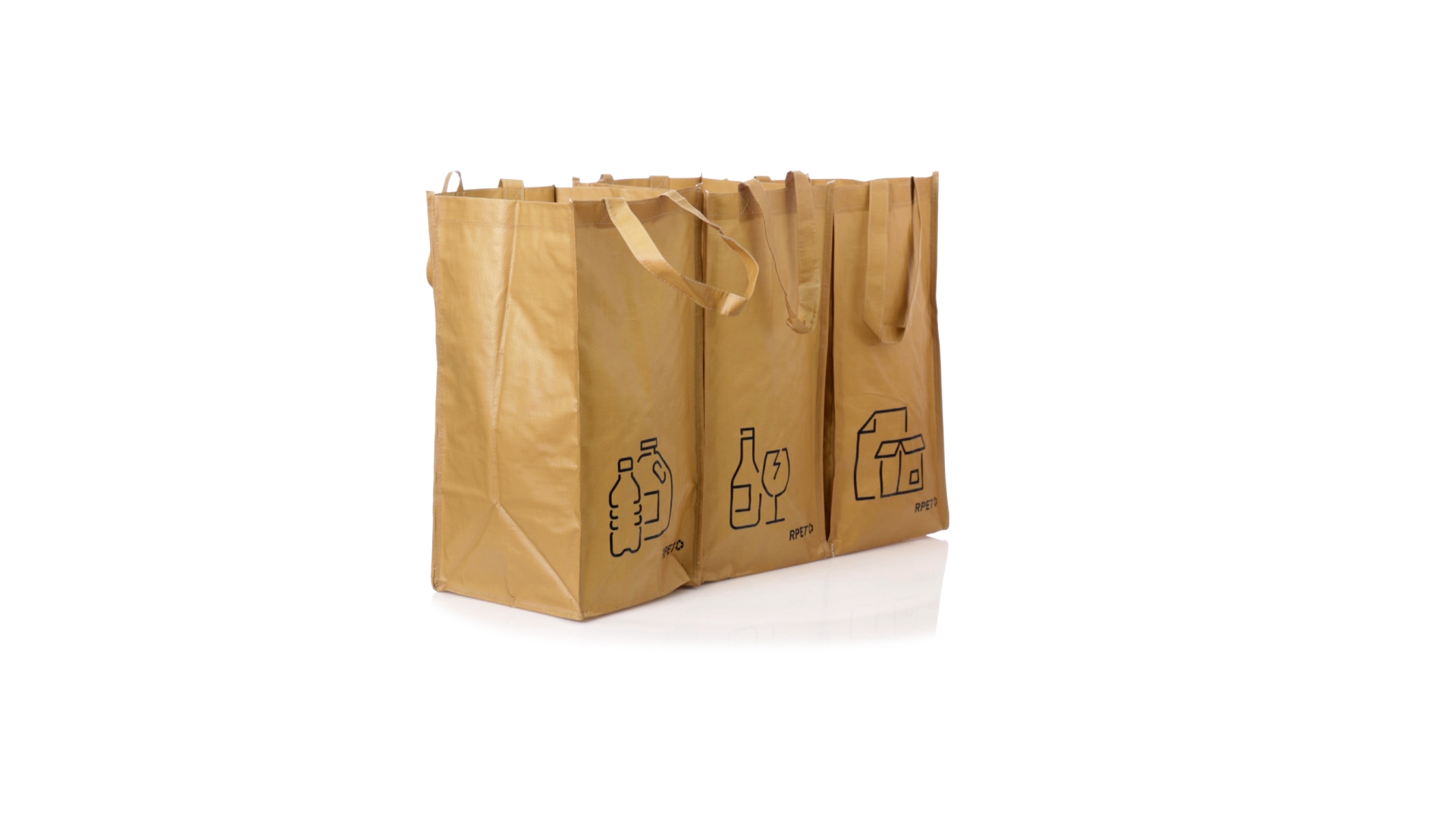 Set mit 3 Recycling-Taschen. Hergestellt aus robustem, mit RPET laminiertem Polyester, das aus recyceltem Kunststoff hergestellt wird, um die Wiederverwendung von Kunststoffabfällen zu fördern und die Nachhaltigkeit unseres Planeten zu unterstützen. Enthält 3 Taschen mit den Massen 23x45x23 cm, die durch Klettverschlüsse an den Seiten miteinander verbunden sind. Mit verstärkten Griffen und Angabe der Abfallarten: Kunststoff und Verpackung, Glas und Papier. RPET-Etikett auf dem Boden jedes Beutels.
