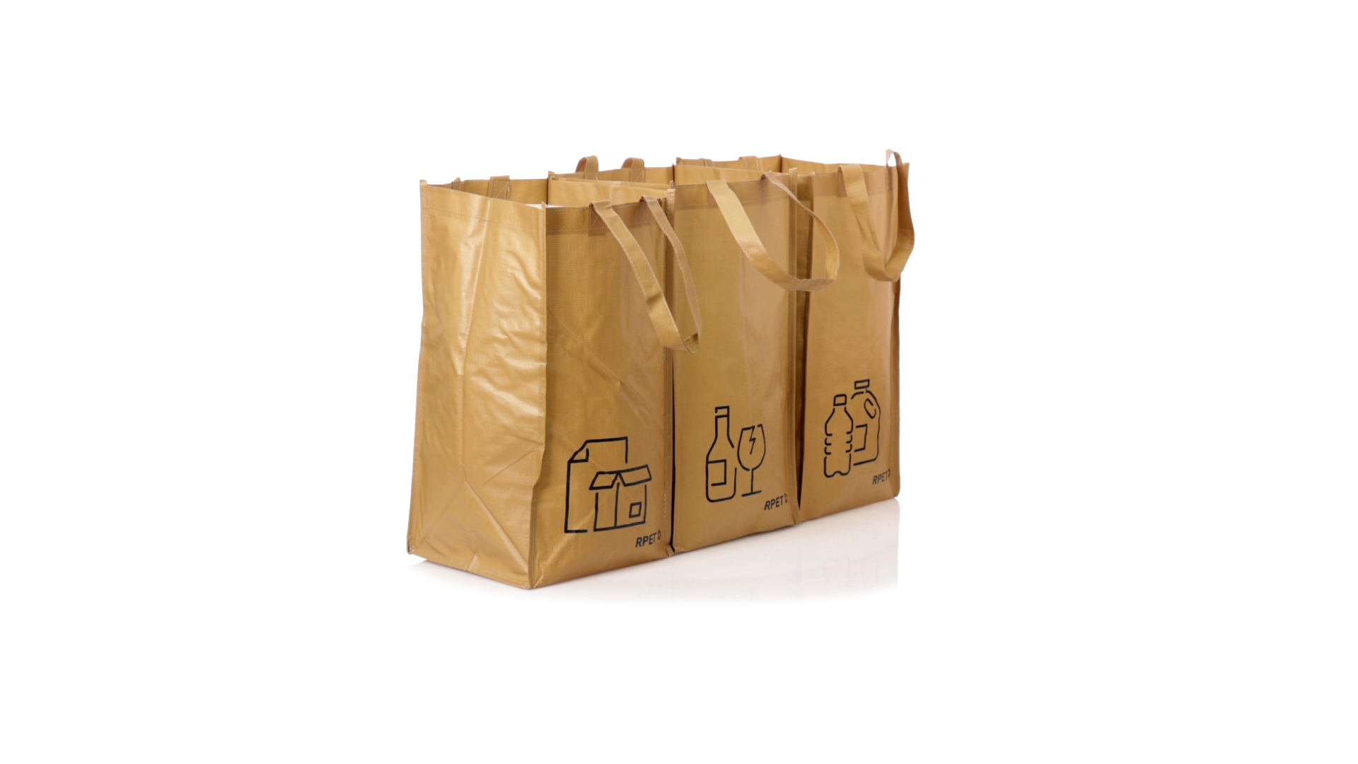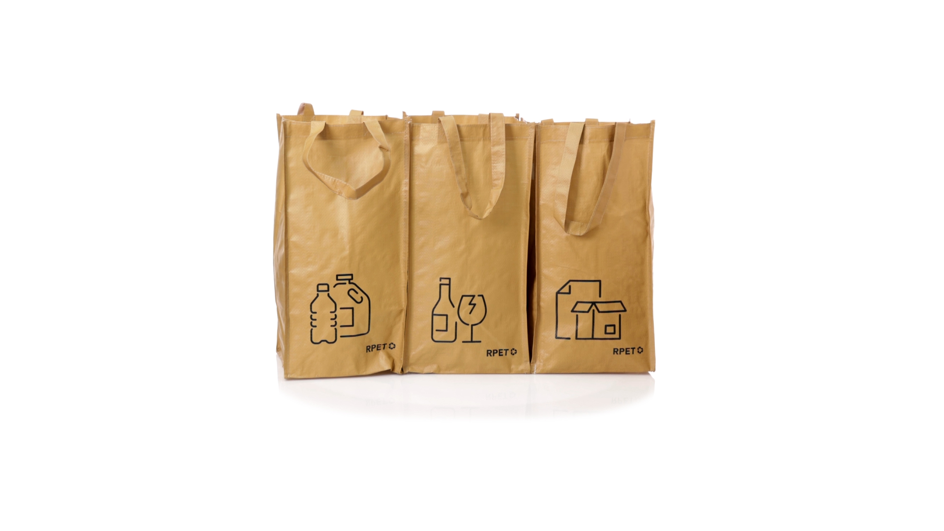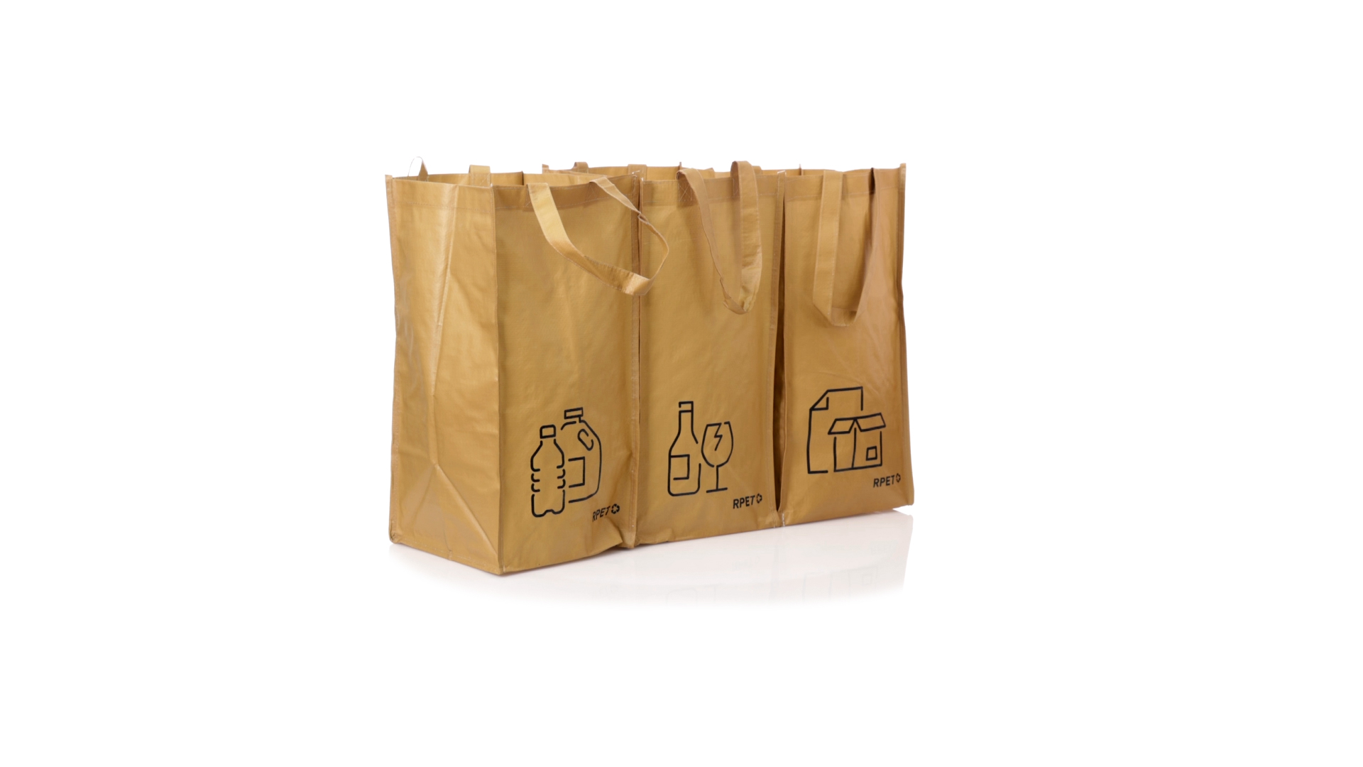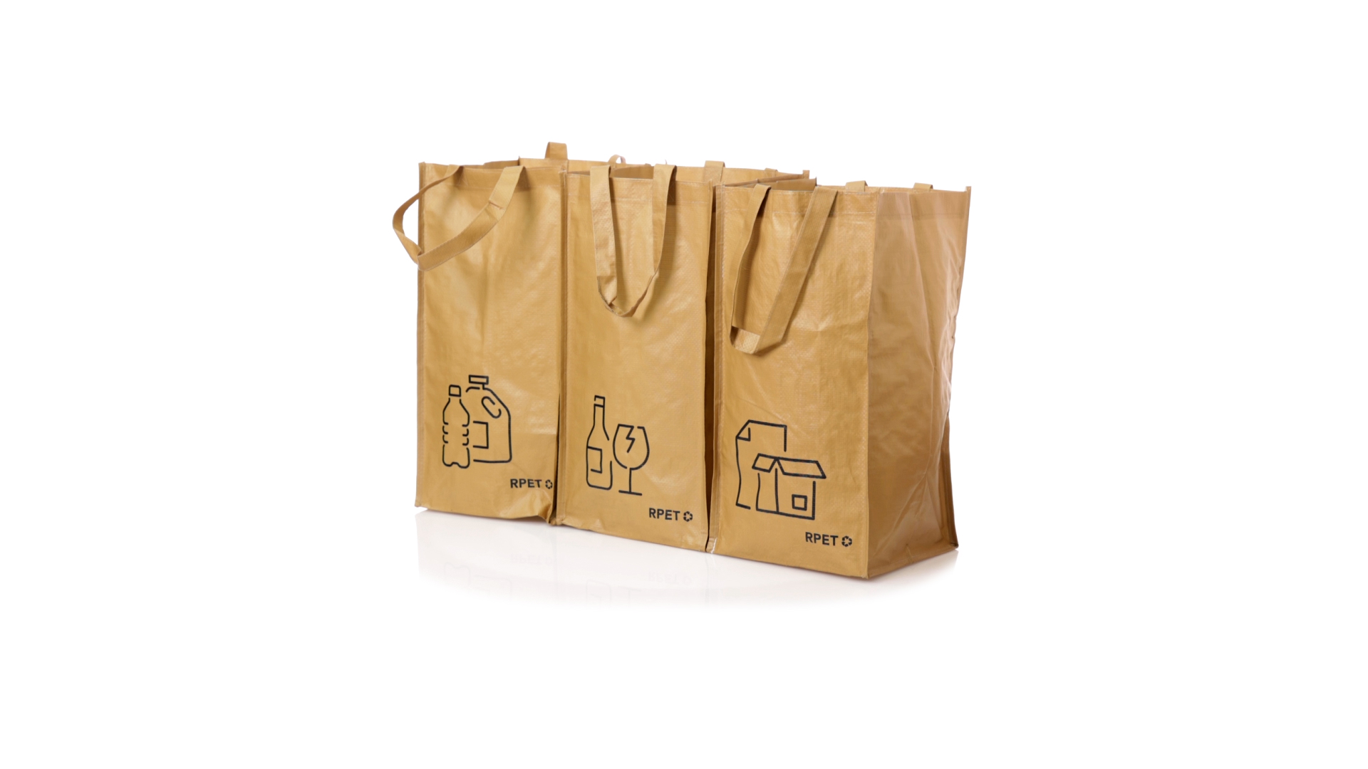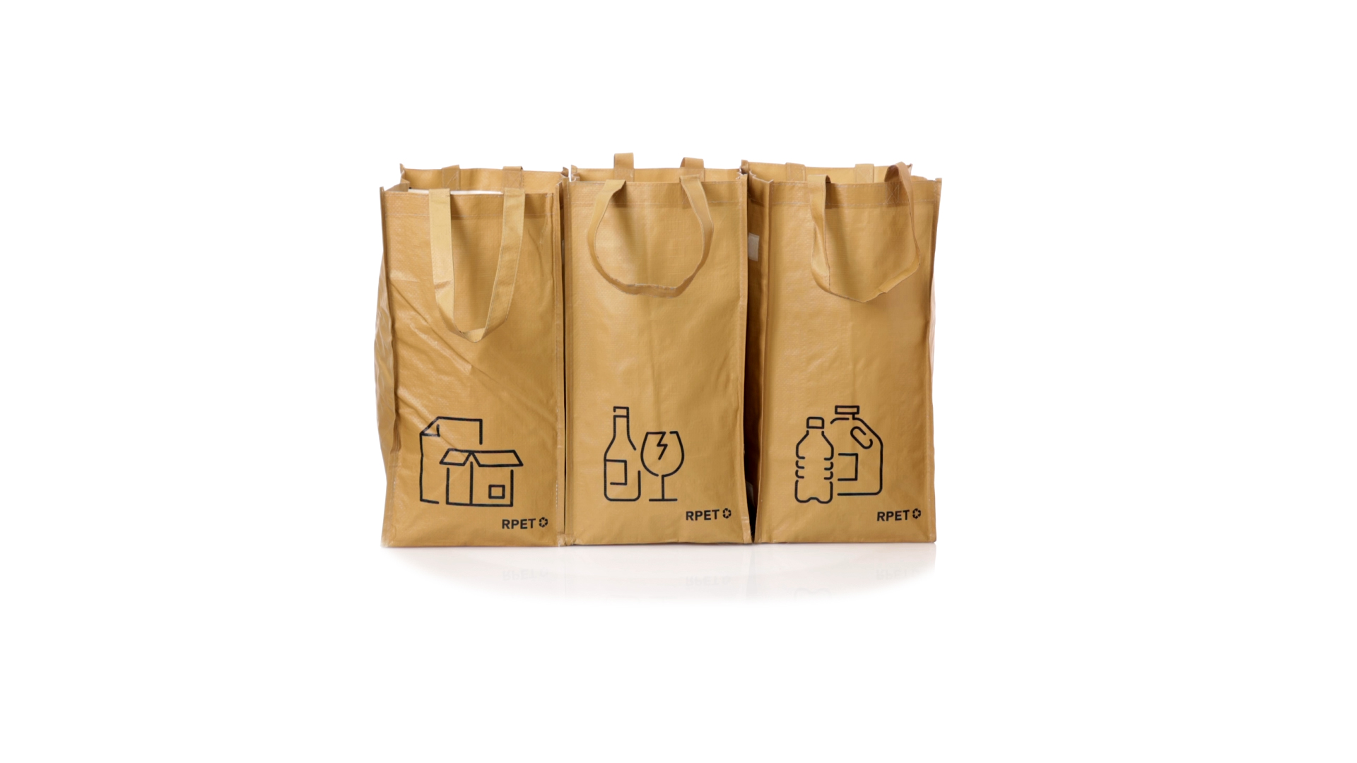 Set mit 3 Recycling-Taschen. Hergestellt aus robustem, mit RPET laminiertem Polyester, das aus recyceltem Kunststoff hergestellt wird, um die Wiederverwendung von Kunststoffabfällen zu fördern und die Nachhaltigkeit unseres Planeten zu unterstützen. Enthält 3 Taschen mit den Massen 23x45x23 cm, die durch Klettverschlüsse an den Seiten miteinander verbunden sind. Mit verstärkten Griffen und Angabe der Abfallarten: Kunststoff und Verpackung, Glas und Papier. RPET-Etikett auf dem Boden jedes Beutels.