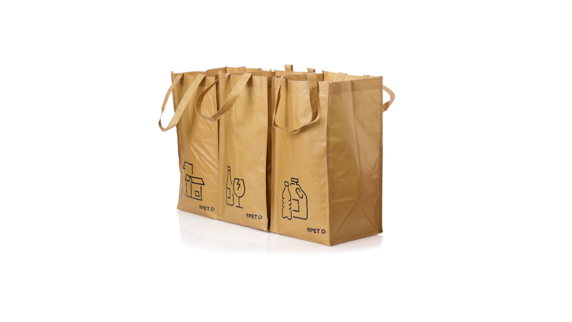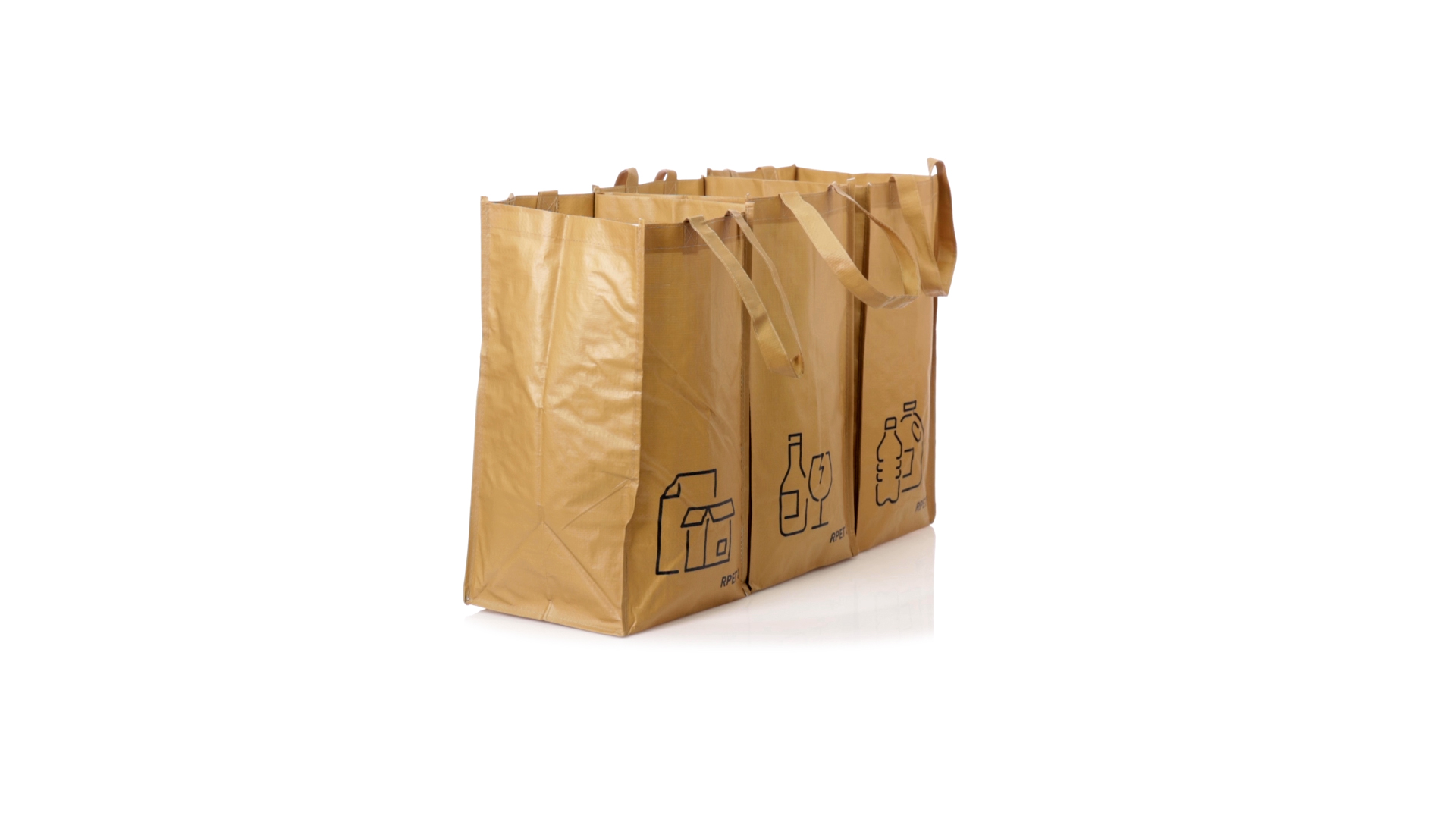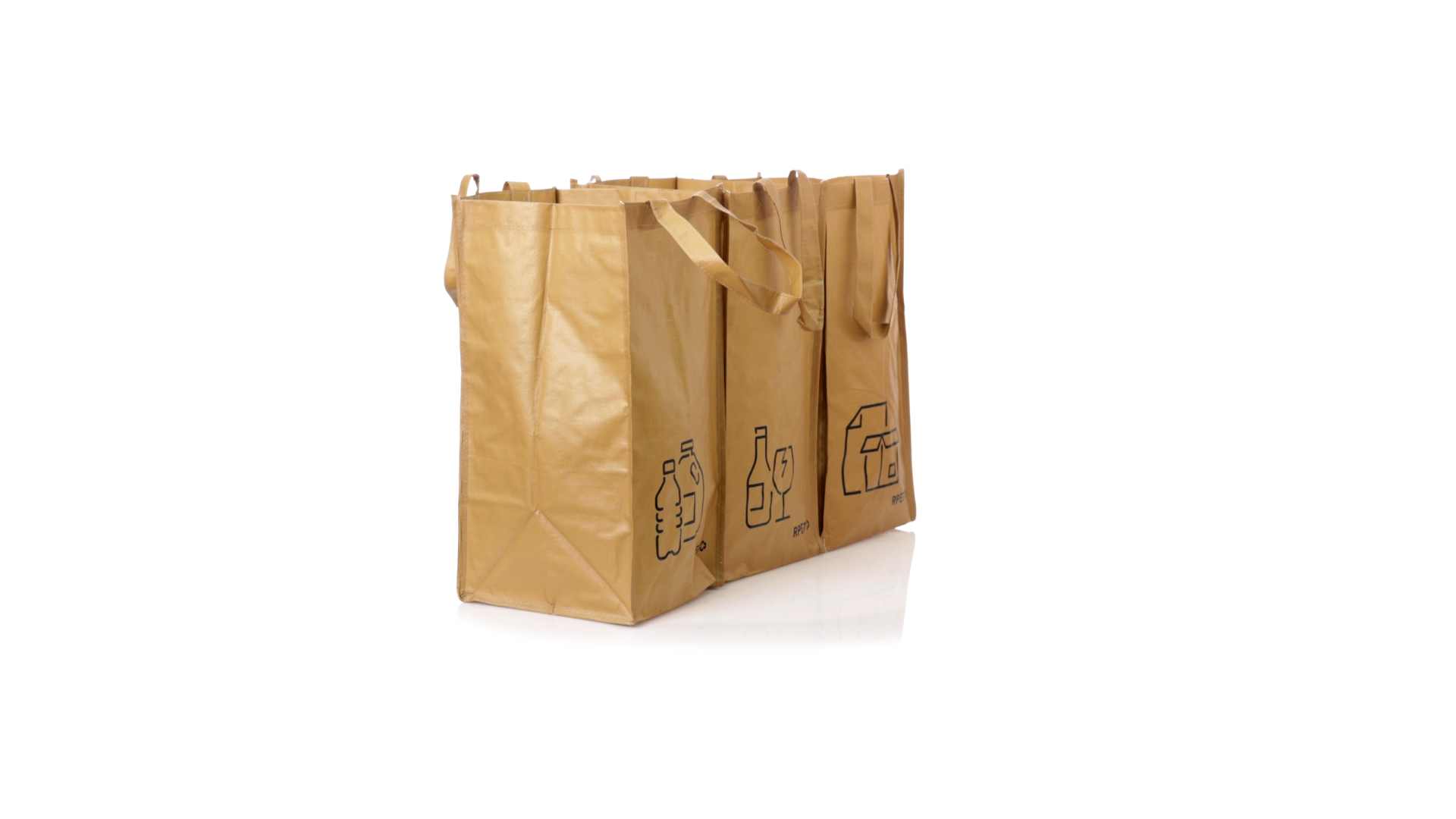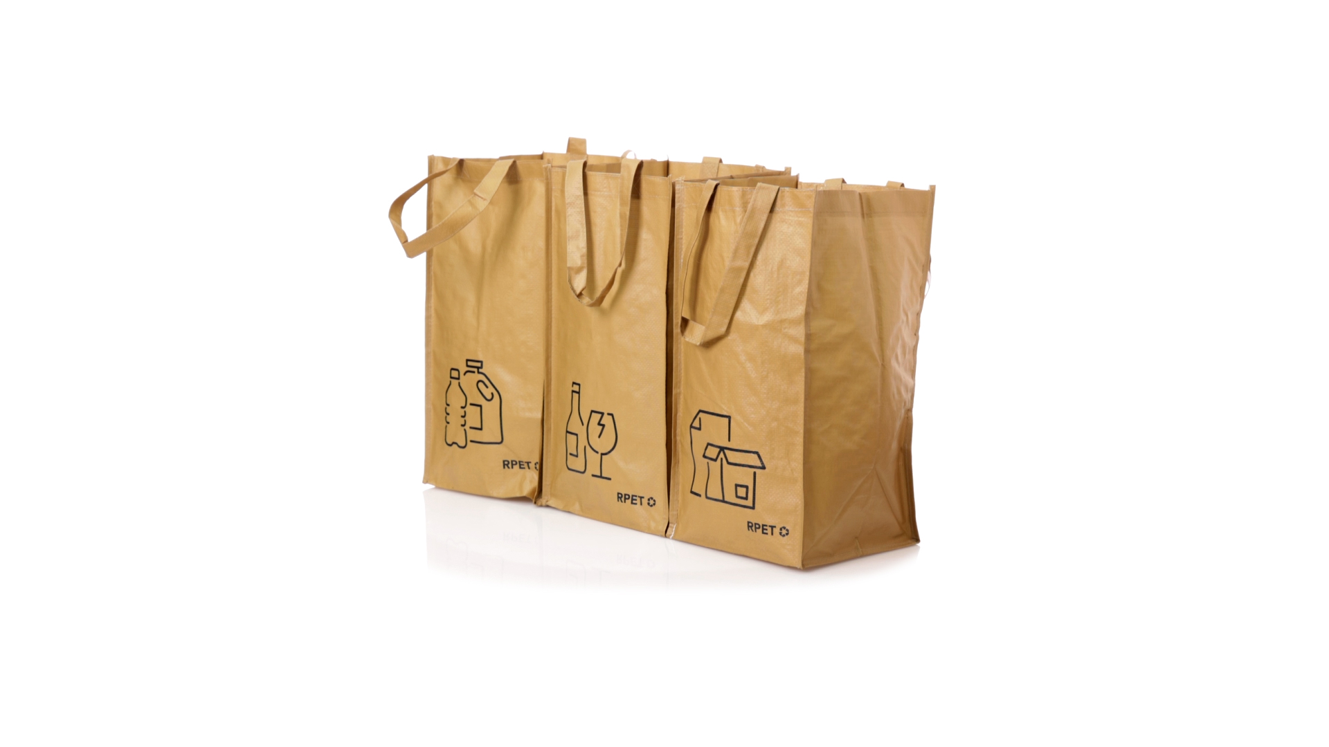 Set mit 3 Recycling-Taschen. Hergestellt aus robustem, mit RPET laminiertem Polyester, das aus recyceltem Kunststoff hergestellt wird, um die Wiederverwendung von Kunststoffabfällen zu fördern und die Nachhaltigkeit unseres Planeten zu unterstützen. Enthält 3 Taschen mit den Massen 23x45x23 cm, die durch Klettverschlüsse an den Seiten miteinander verbunden sind. Mit verstärkten Griffen und Angabe der Abfallarten: Kunststoff und Verpackung, Glas und Papier. RPET-Etikett auf dem Boden jedes Beutels.