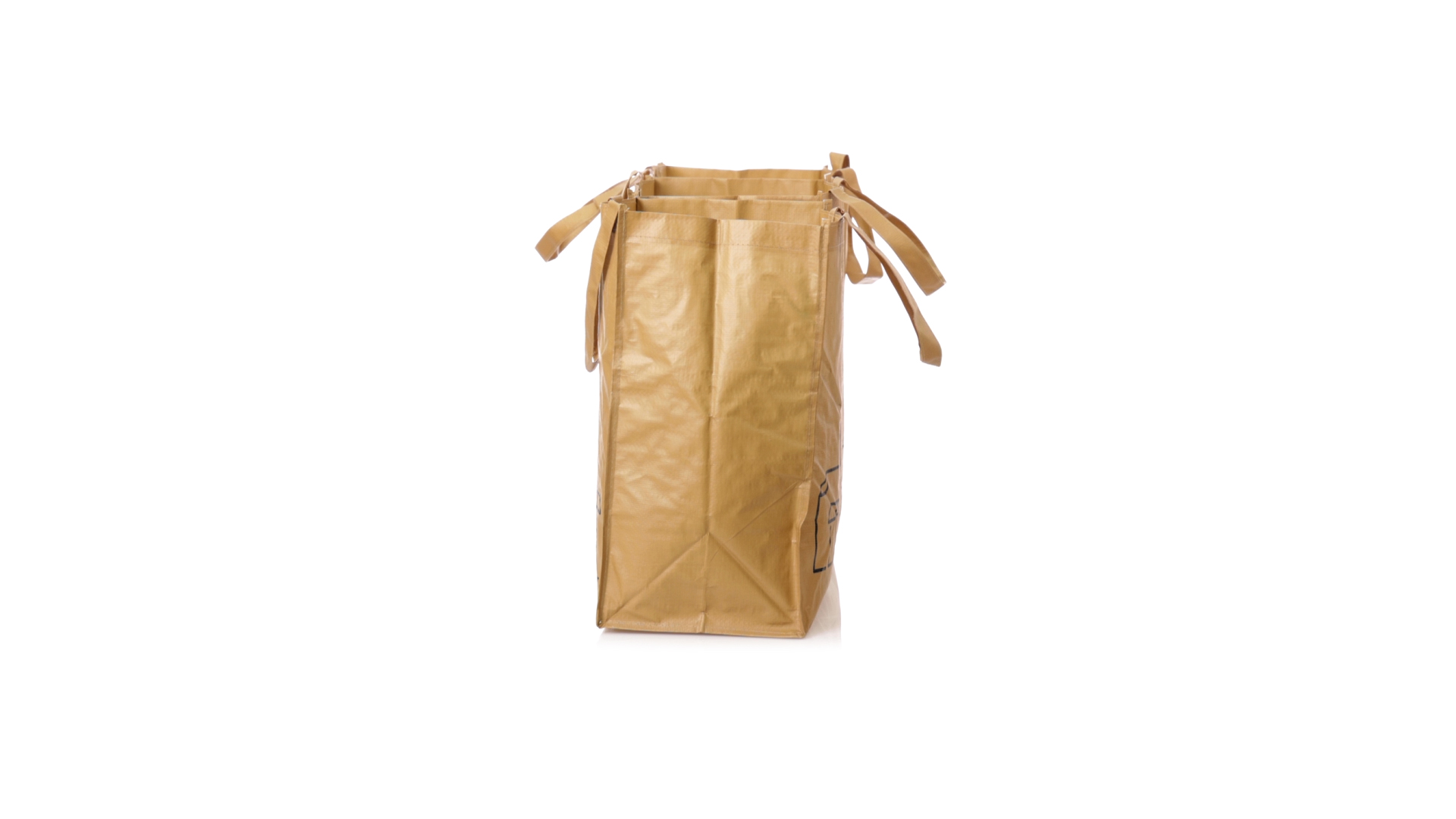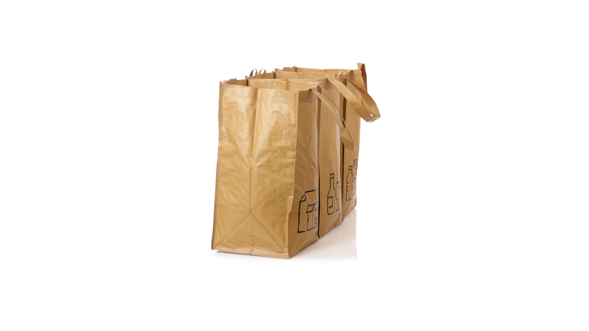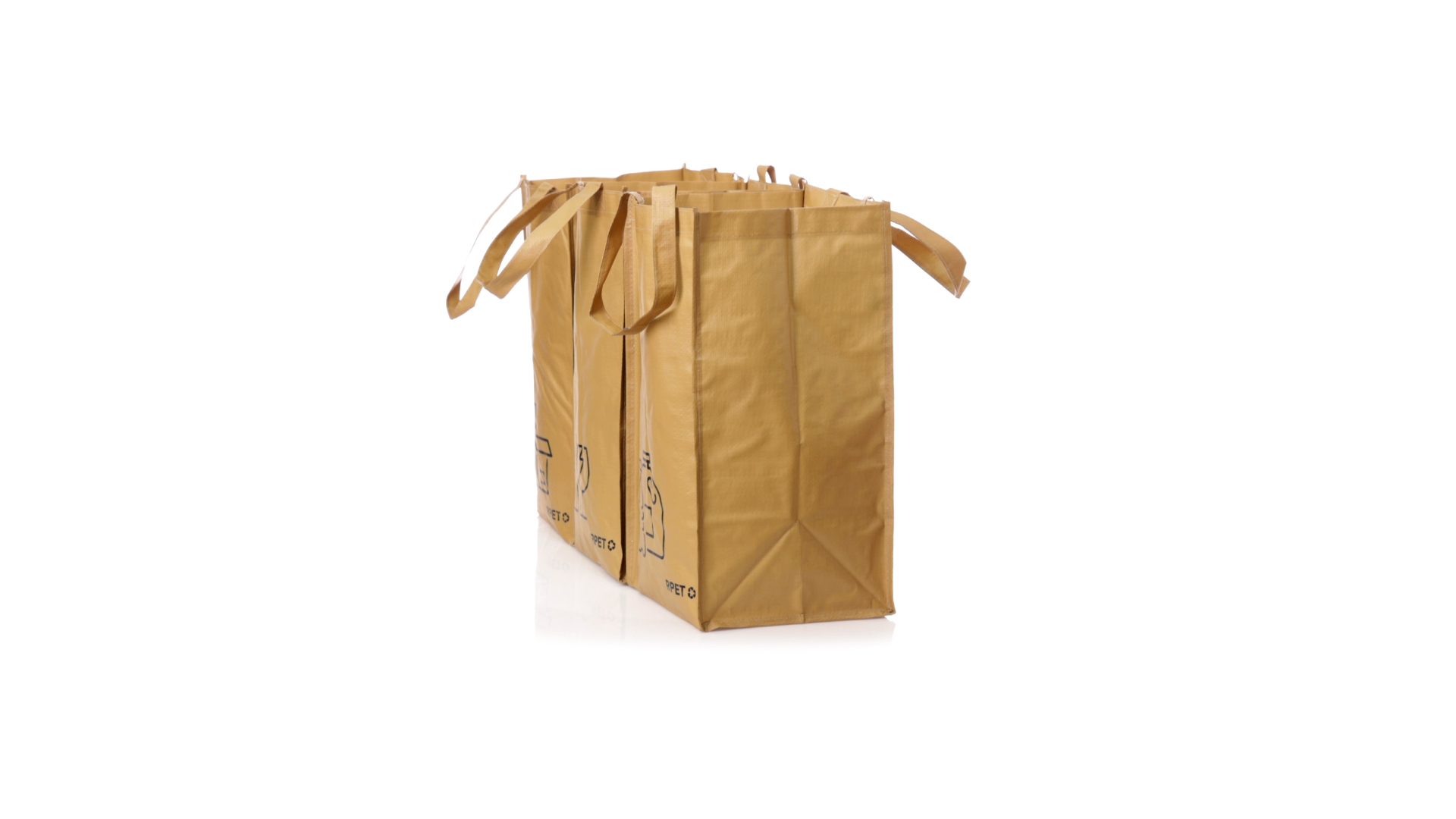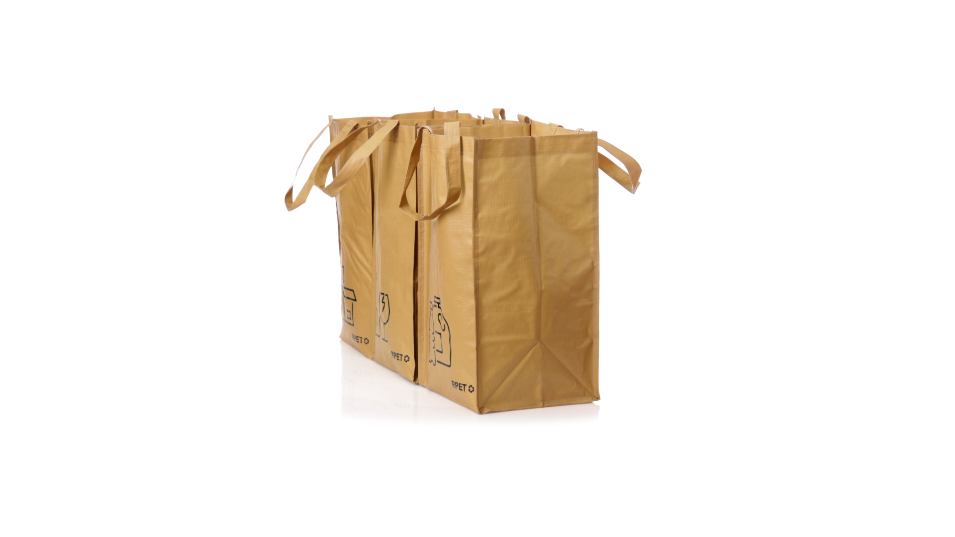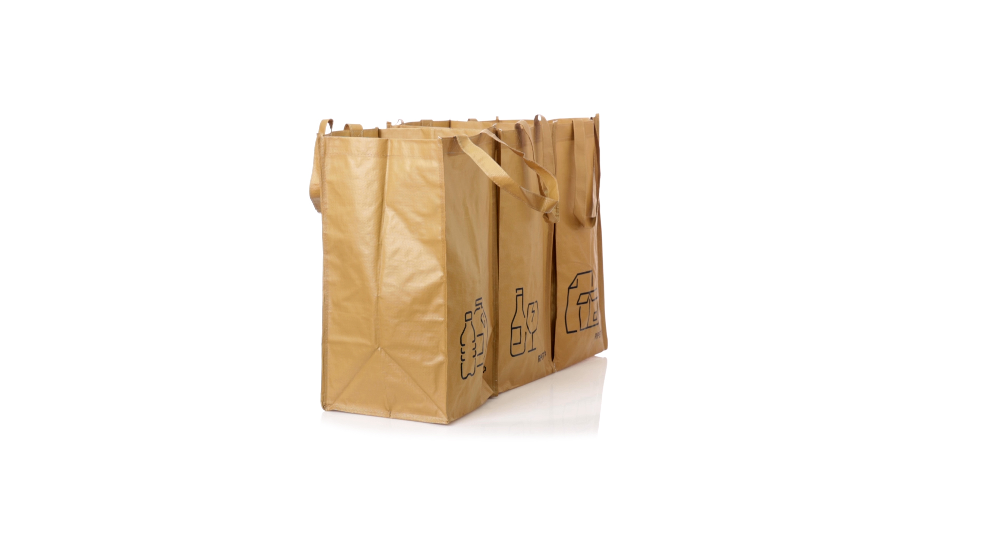Set mit 3 Recycling-Taschen. Hergestellt aus robustem, mit RPET laminiertem Polyester, das aus recyceltem Kunststoff hergestellt wird, um die Wiederverwendung von Kunststoffabfällen zu fördern und die Nachhaltigkeit unseres Planeten zu unterstützen. Enthält 3 Taschen mit den Massen 23x45x23 cm, die durch Klettverschlüsse an den Seiten miteinander verbunden sind. Mit verstärkten Griffen und Angabe der Abfallarten: Kunststoff und Verpackung, Glas und Papier. RPET-Etikett auf dem Boden jedes Beutels.