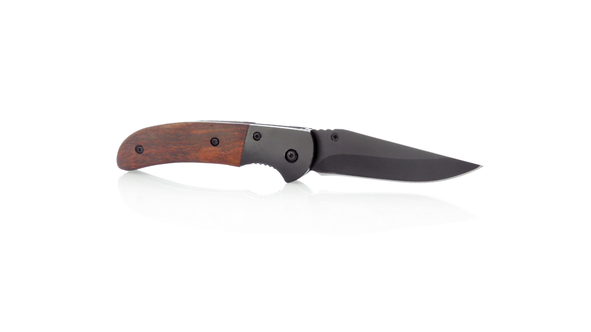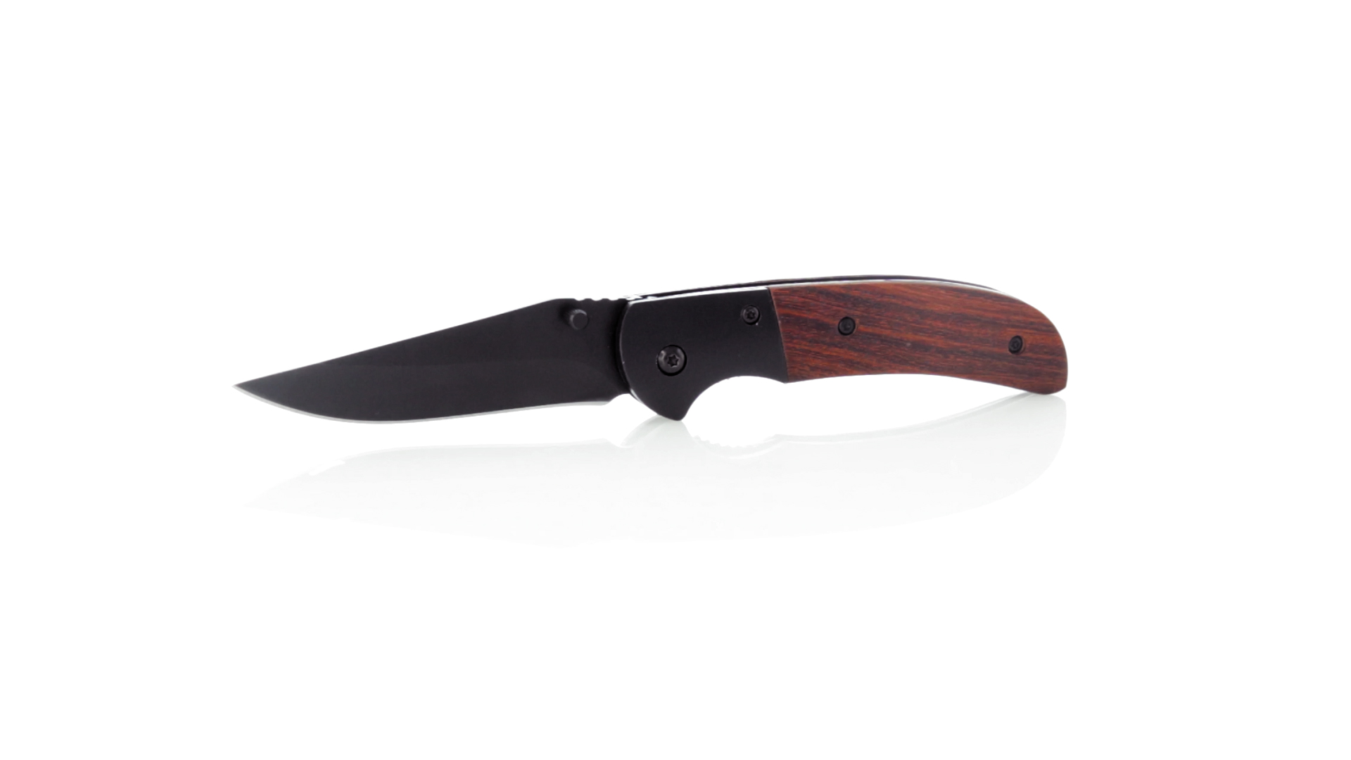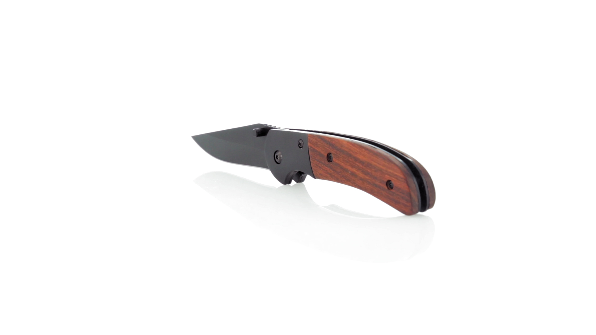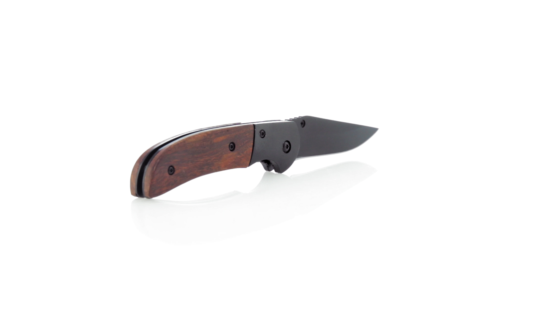Hochwertiges Taschenmesser mit schwarzer Klinge aus Edelstahl und Griff aus Naturholz mit Sicherheitsverschluss. Präsentiert in einer individuellen Box.