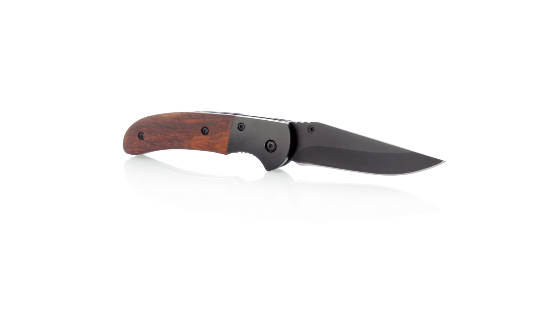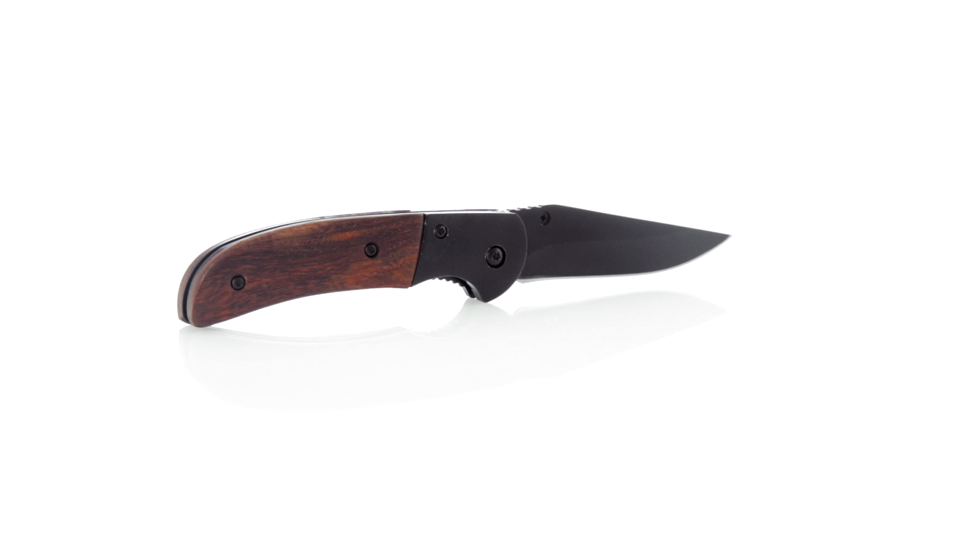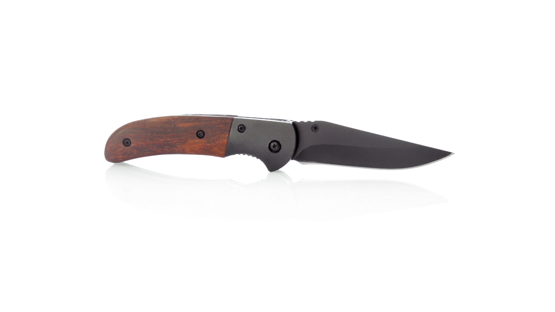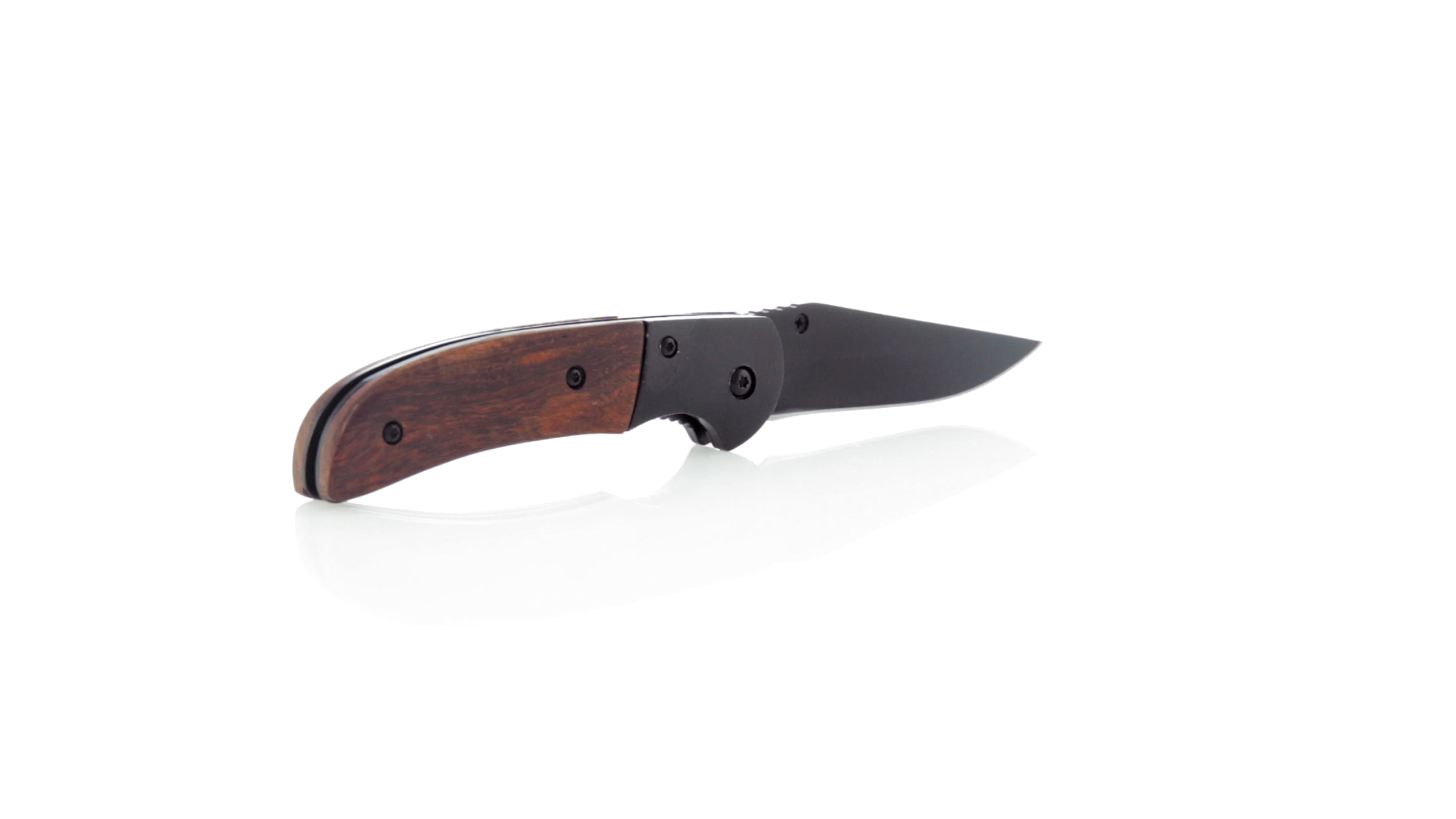 Hochwertiges Taschenmesser mit schwarzer Klinge aus Edelstahl und Griff aus Naturholz mit Sicherheitsverschluss. Präsentiert in einer individuellen Box.
