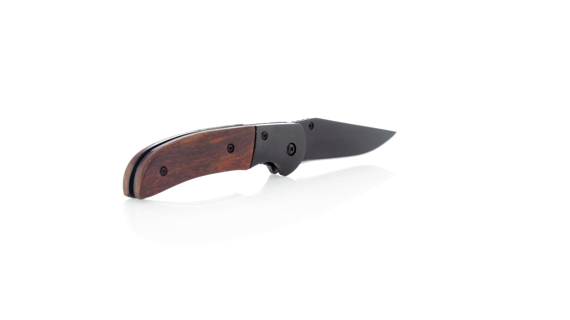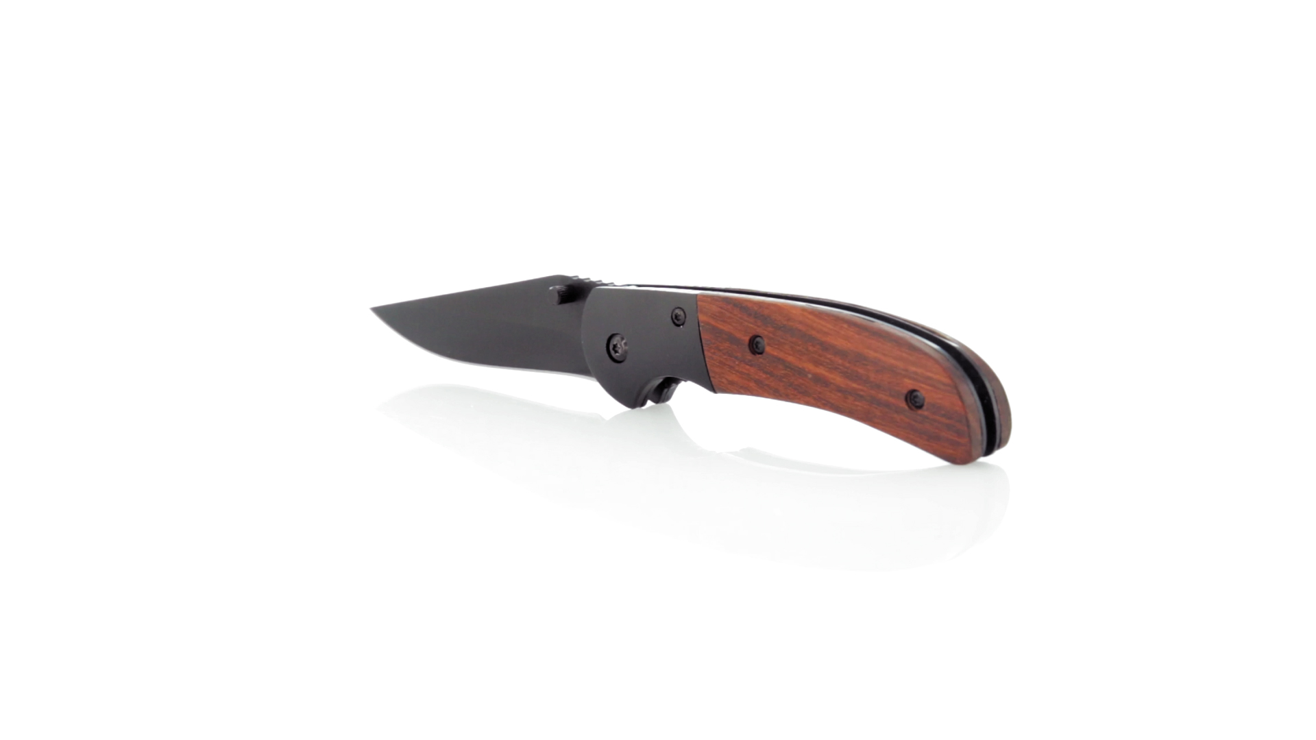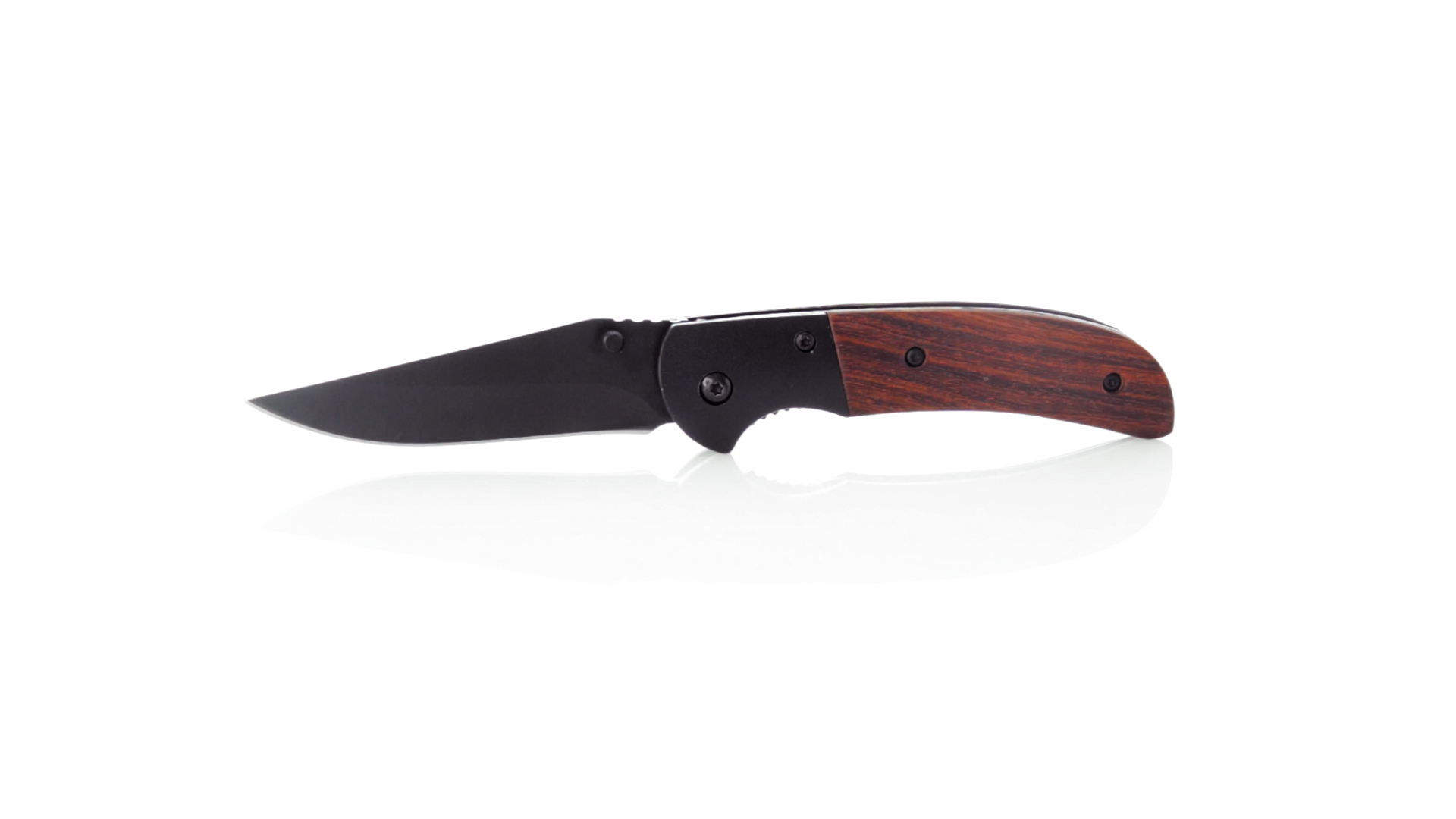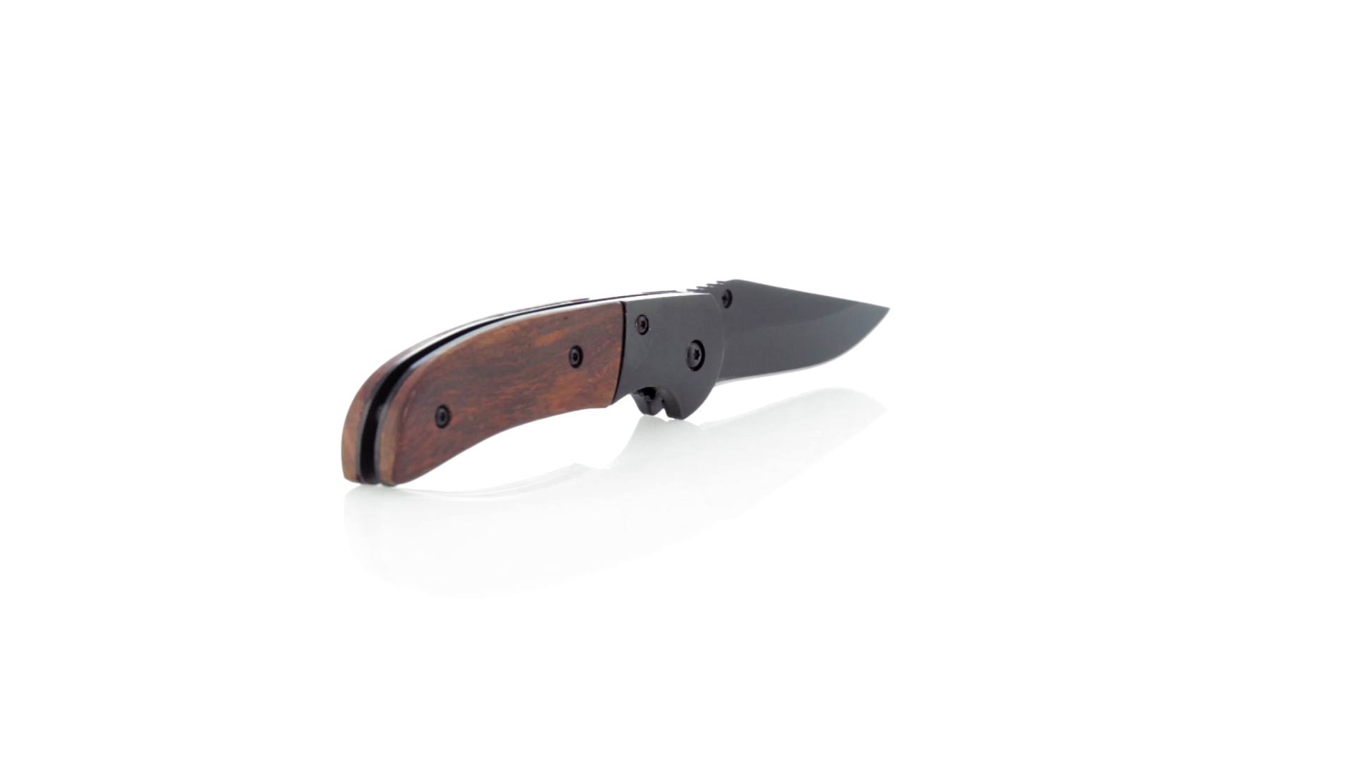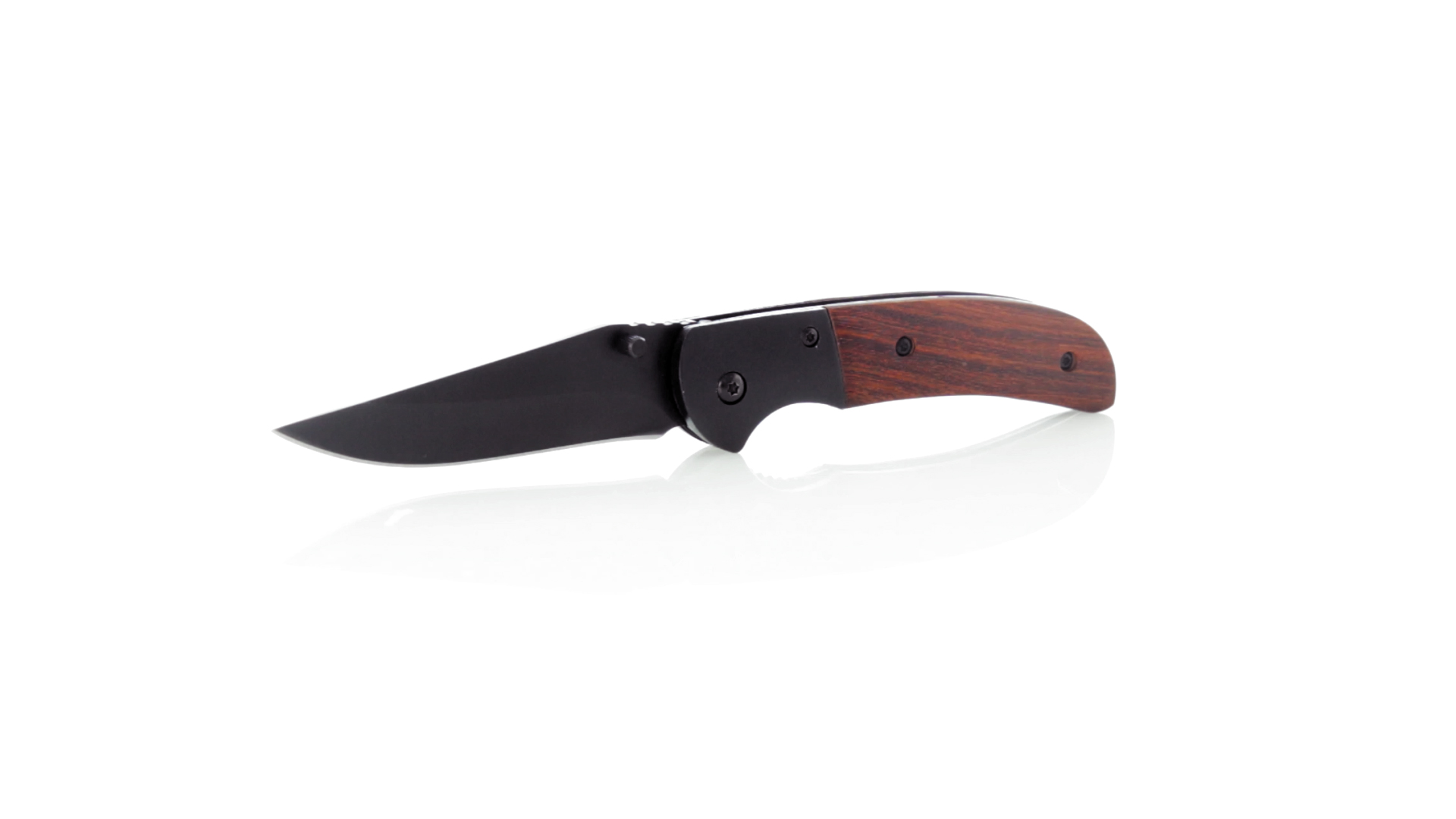 Hochwertiges Taschenmesser mit schwarzer Klinge aus Edelstahl und Griff aus Naturholz mit Sicherheitsverschluss. Präsentiert in einer individuellen Box.