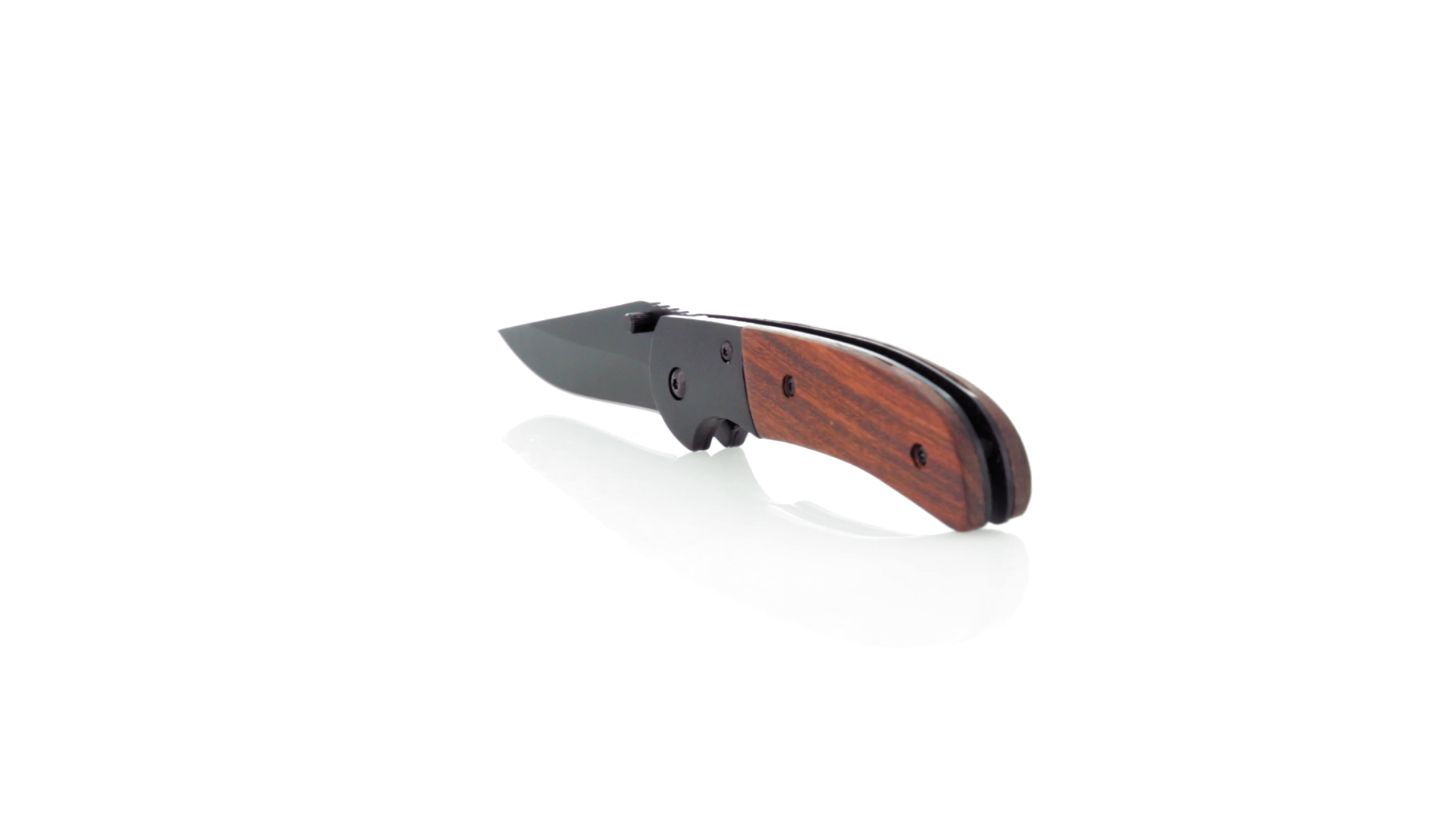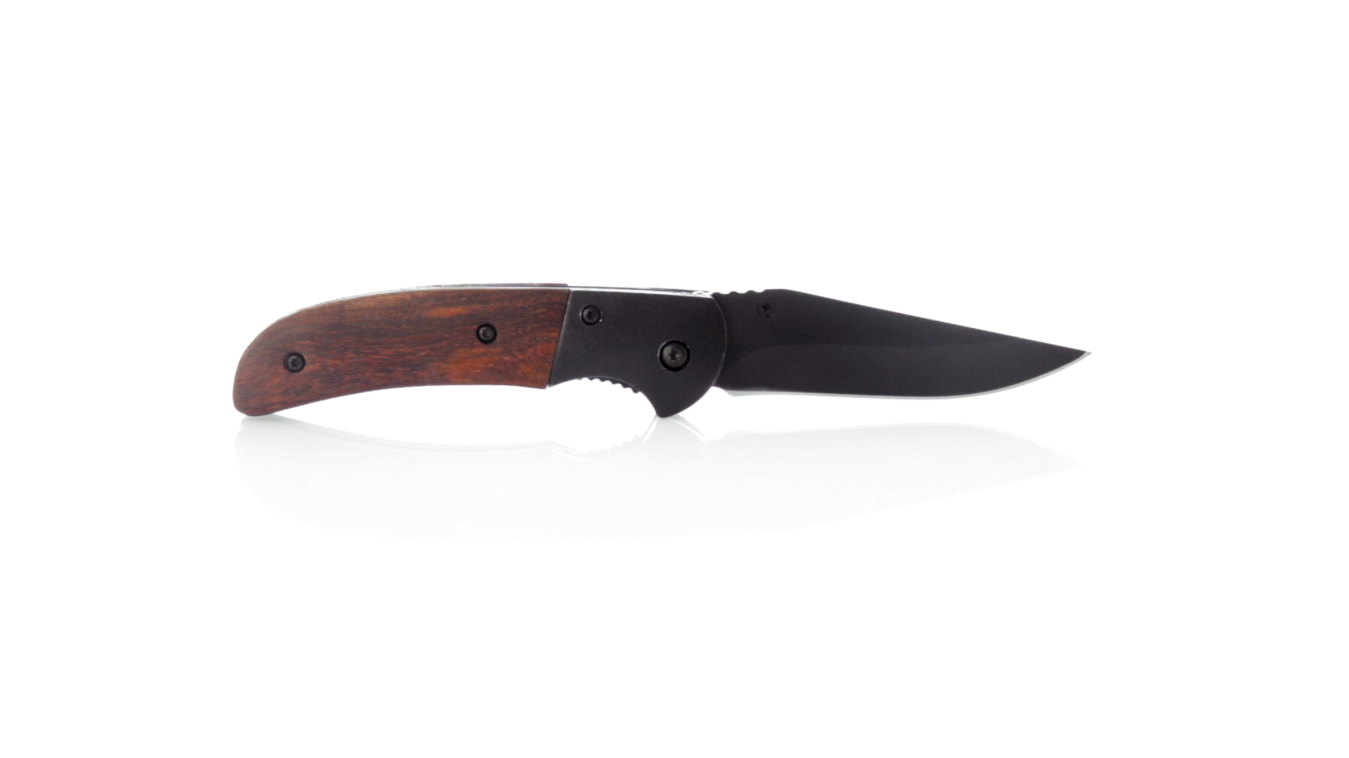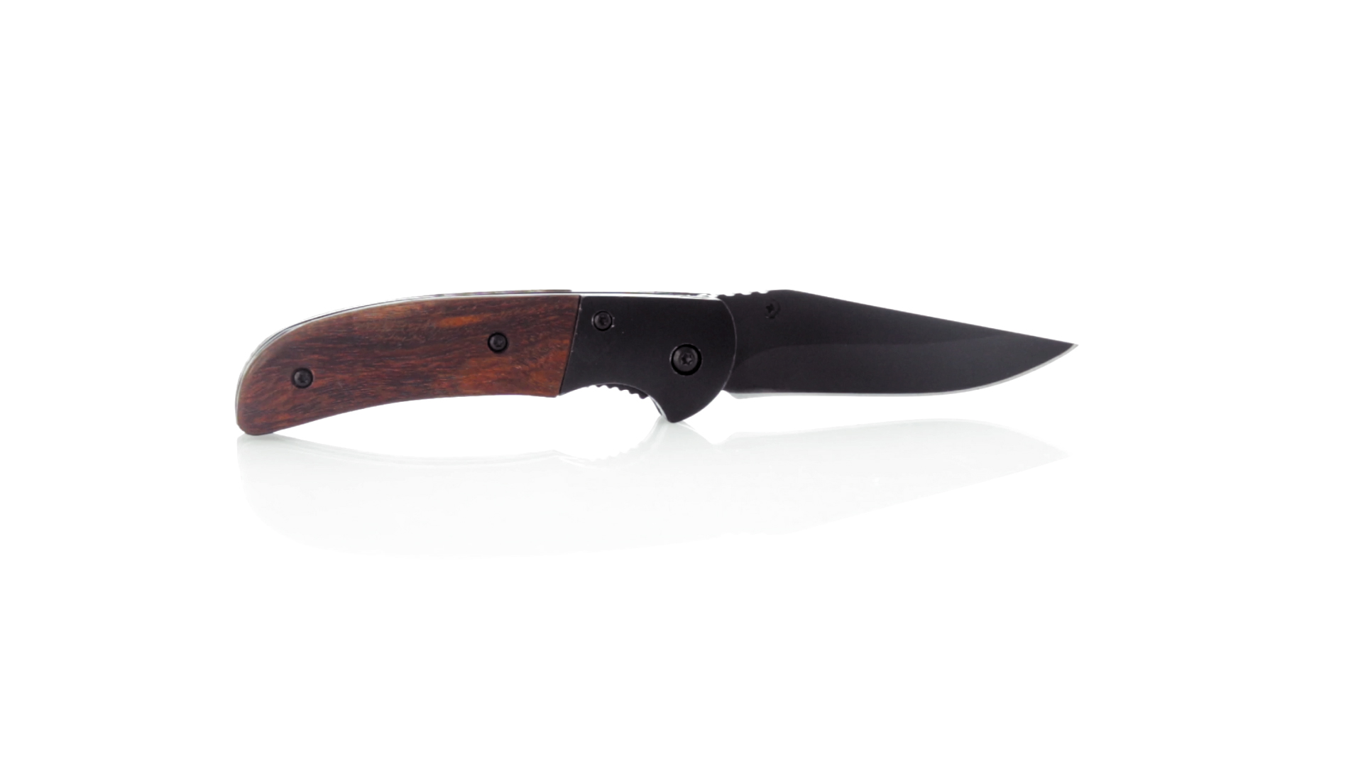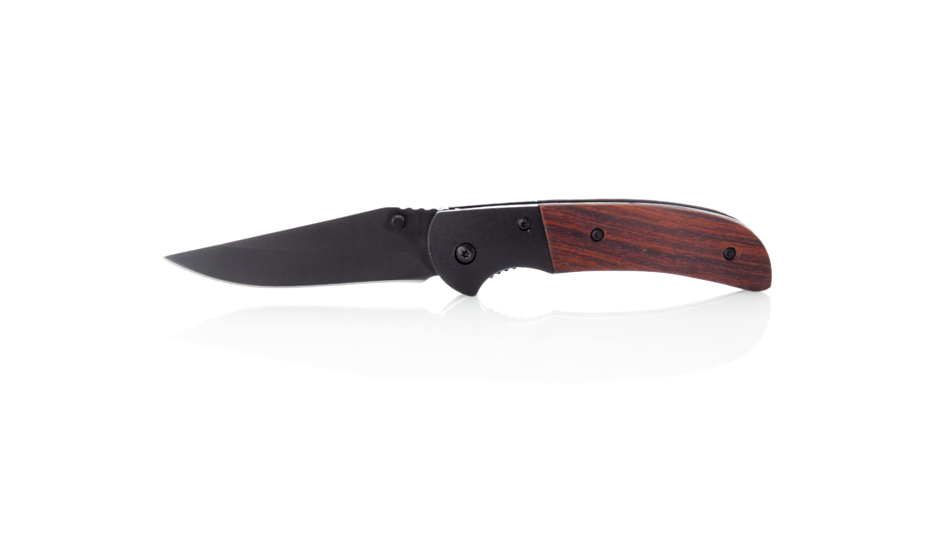 Hochwertiges Taschenmesser mit schwarzer Klinge aus Edelstahl und Griff aus Naturholz mit Sicherheitsverschluss. Präsentiert in einer individuellen Box.
