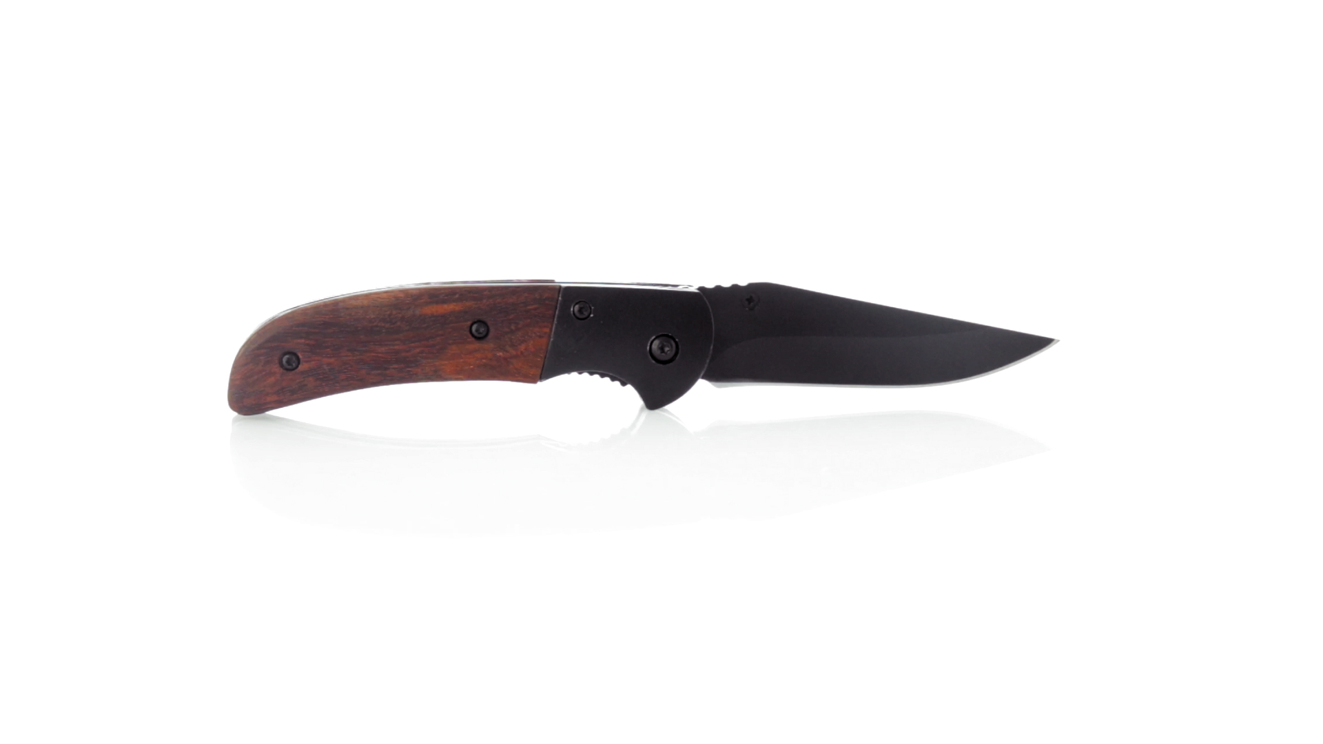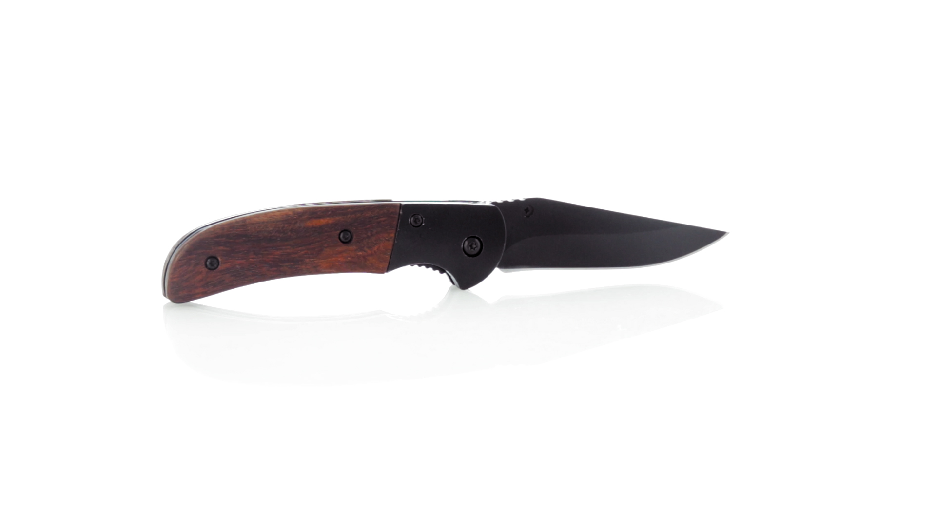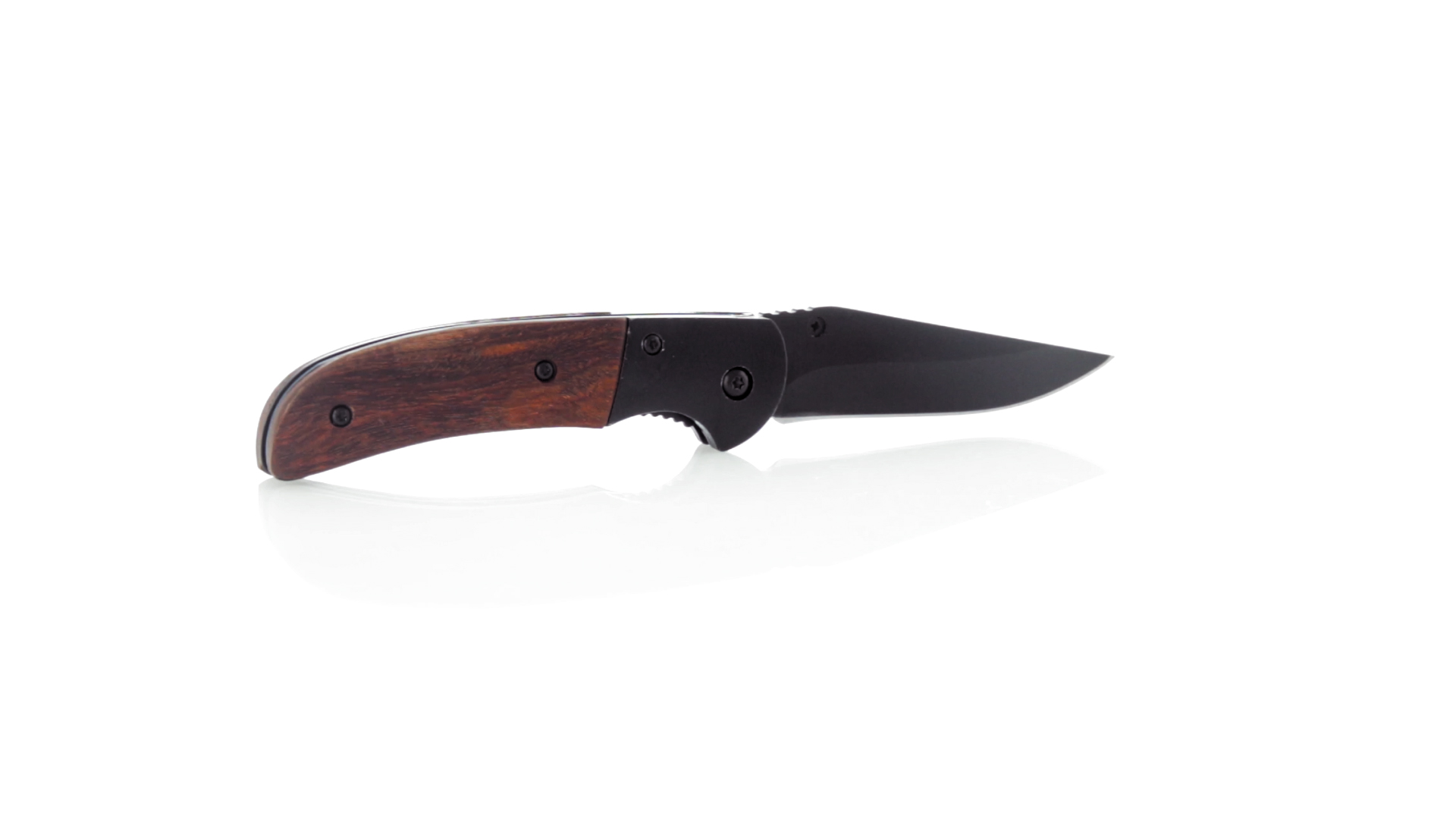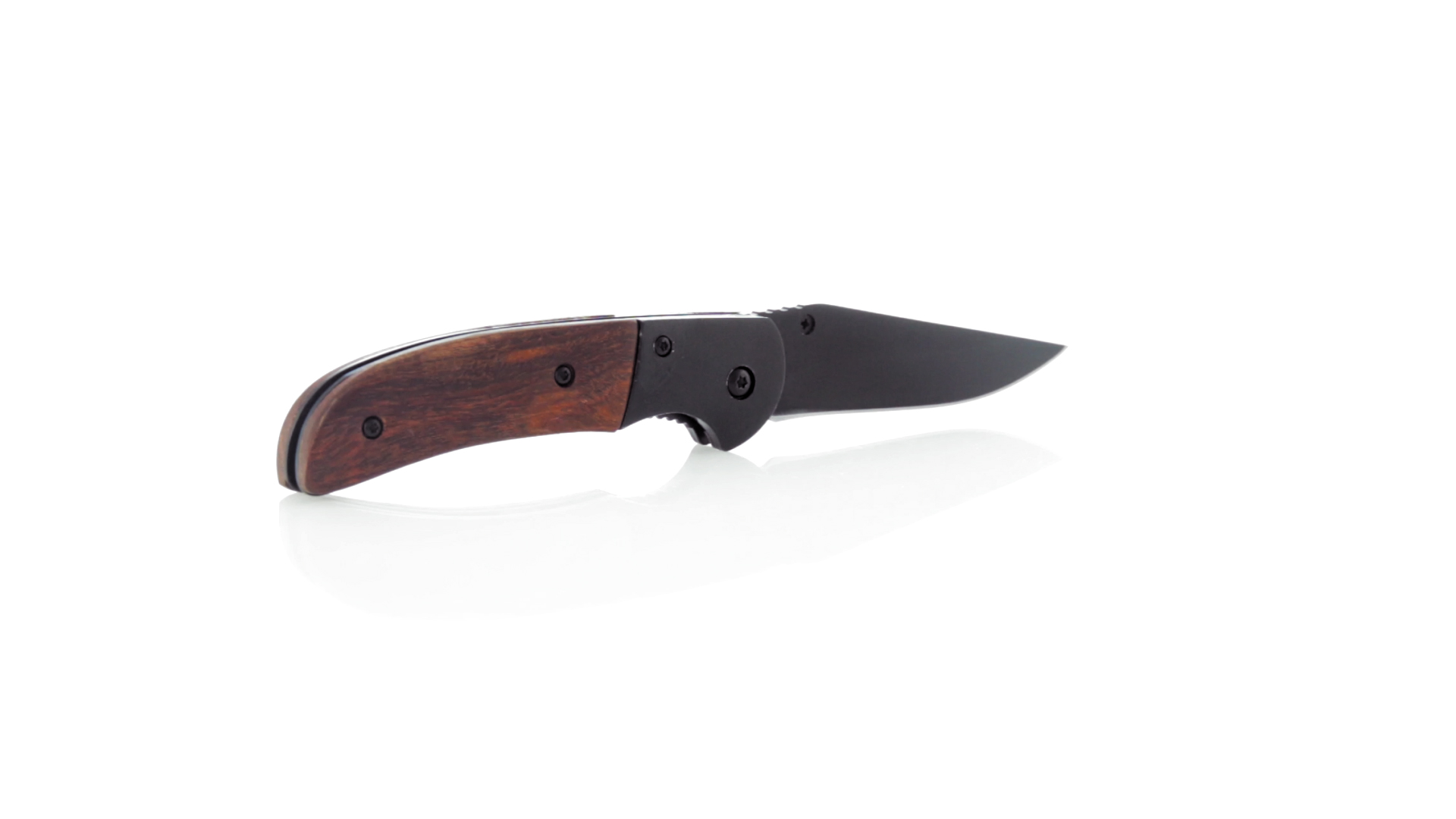 Hochwertiges Taschenmesser mit schwarzer Klinge aus Edelstahl und Griff aus Naturholz mit Sicherheitsverschluss. Präsentiert in einer individuellen Box.