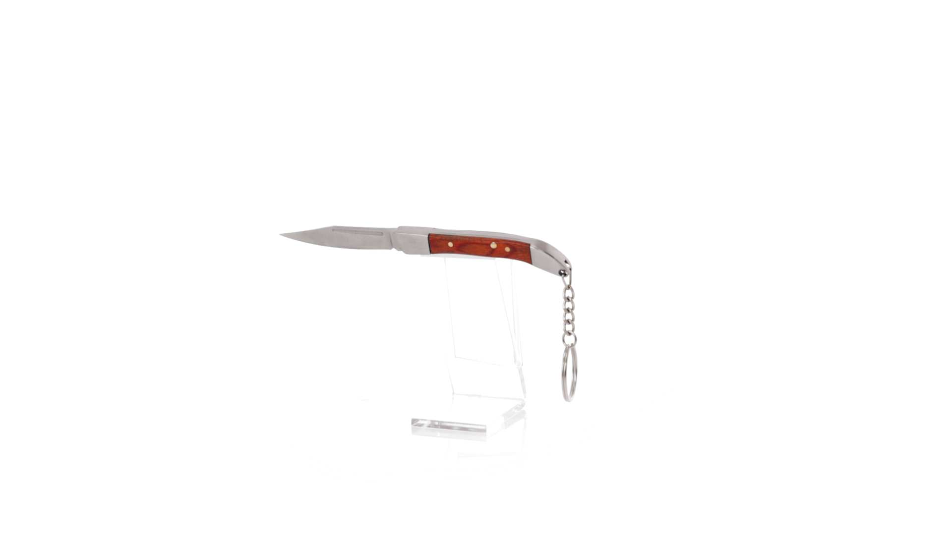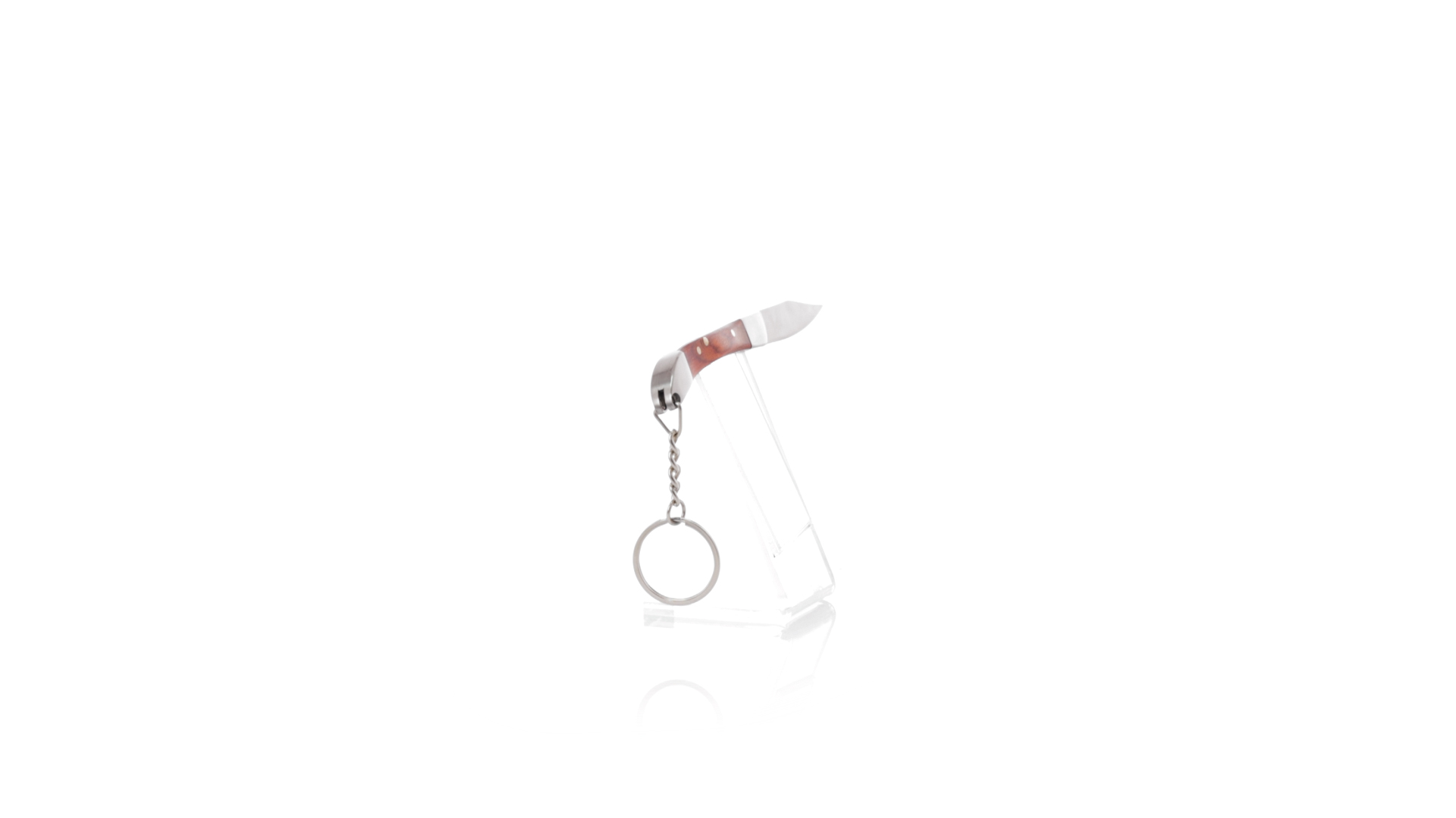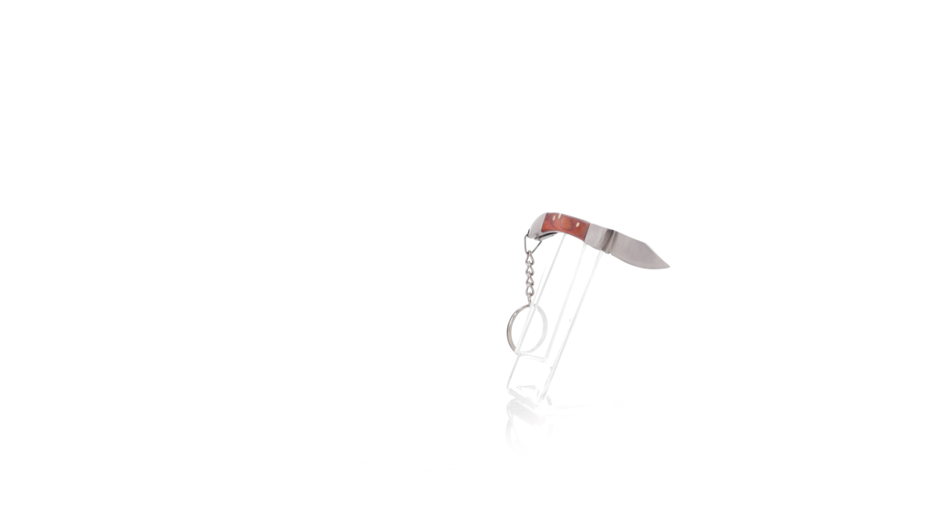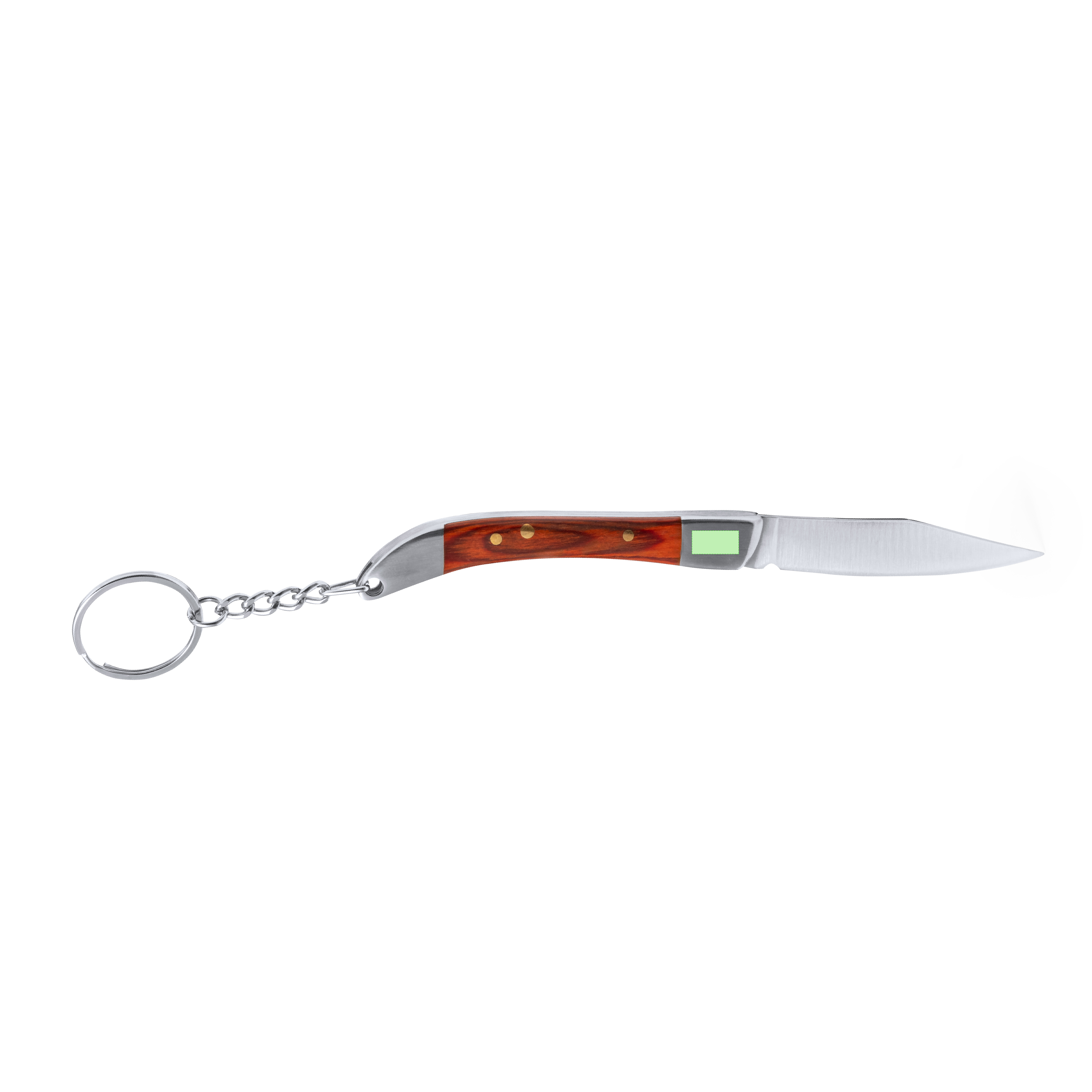 Praktischer Messerschlüsselanhänger mit Edelstahlklinge und widerstandsfähigem Metallgriff mit Details aus Naturholz. Präsentiert in einer individuellen Kraft-Designbox.