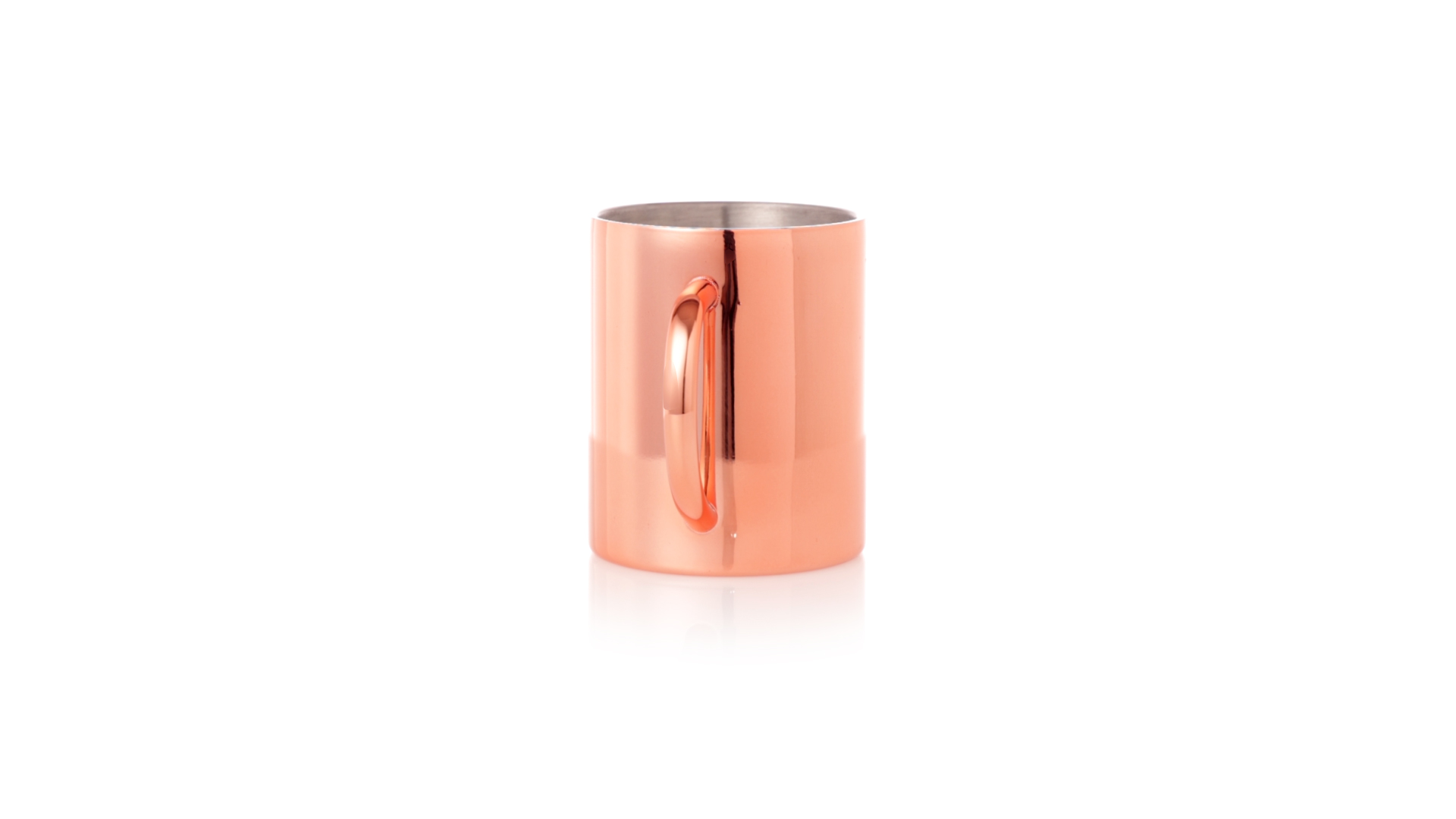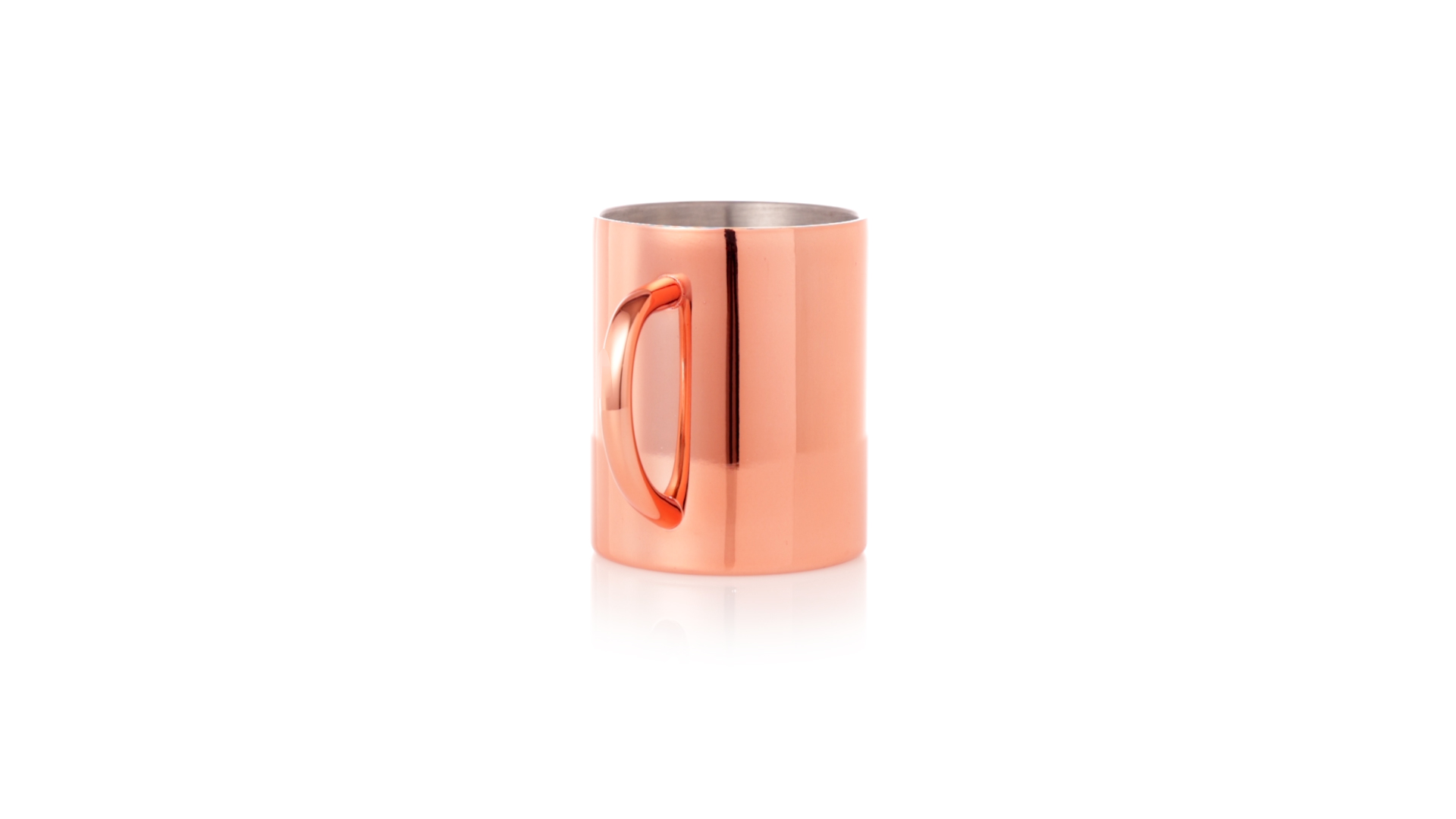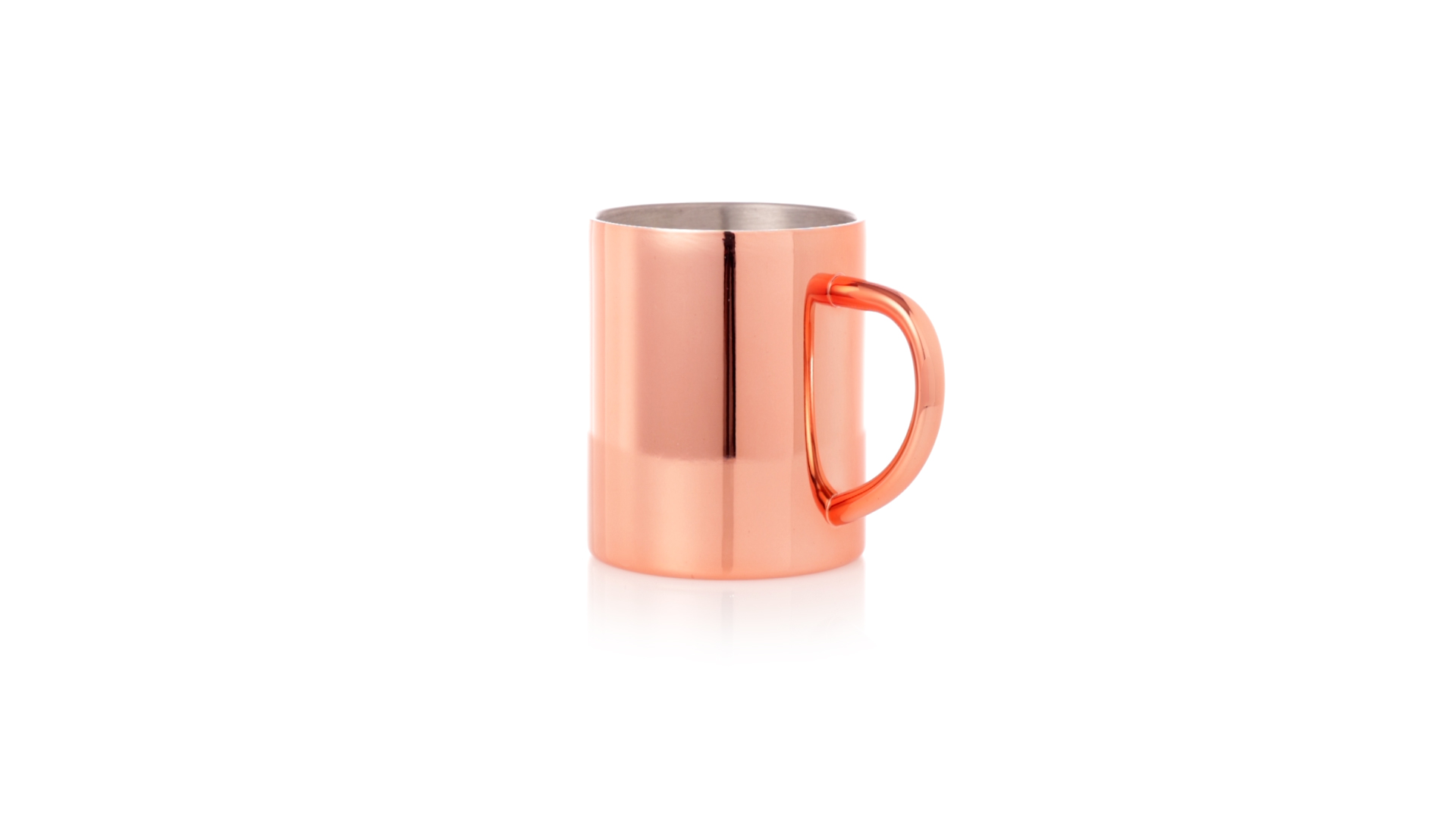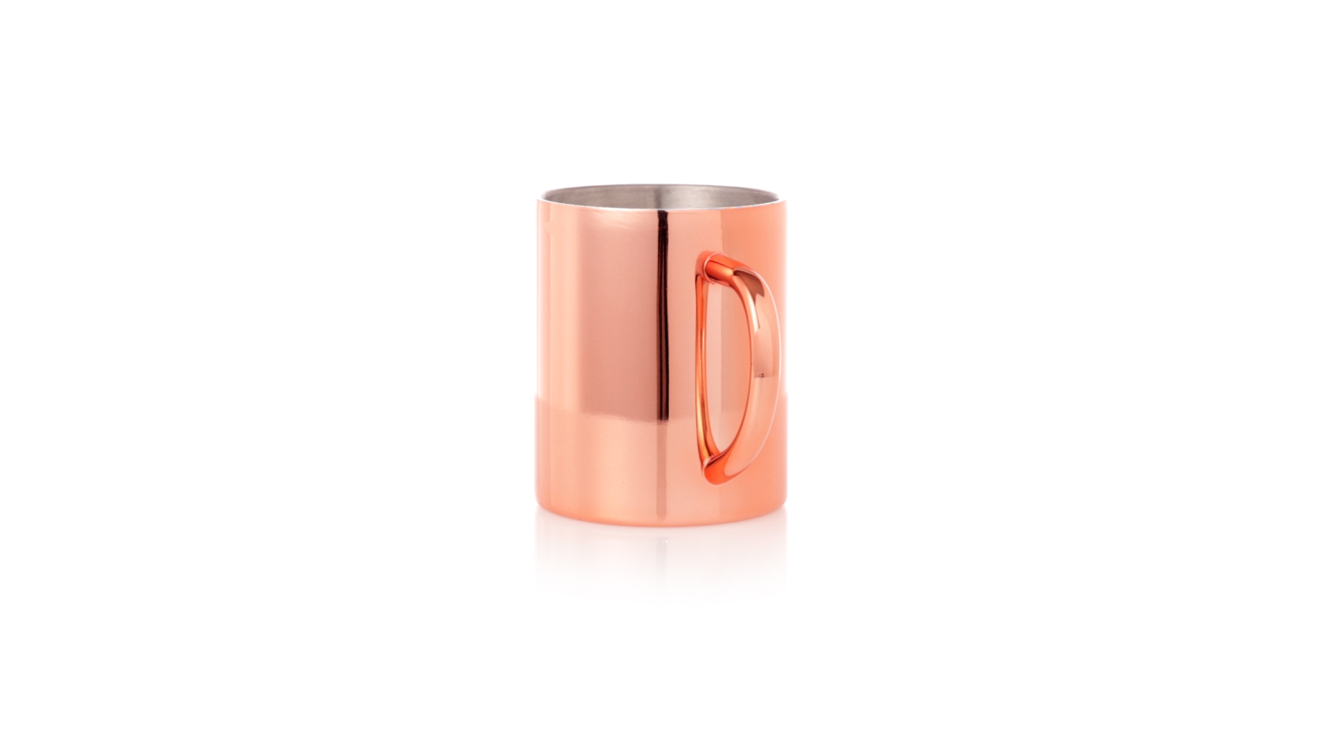Becher mit 280 ml Fassungsvermögen aus doppelwandigem Edelstahl mit galvanisierter Kupferbeschichtung auf der Aussenseite. Innovatives Design mit glänzender Oberfläche. Präsentiert in einer exklusiven, individuellen schwarzen Designbox.