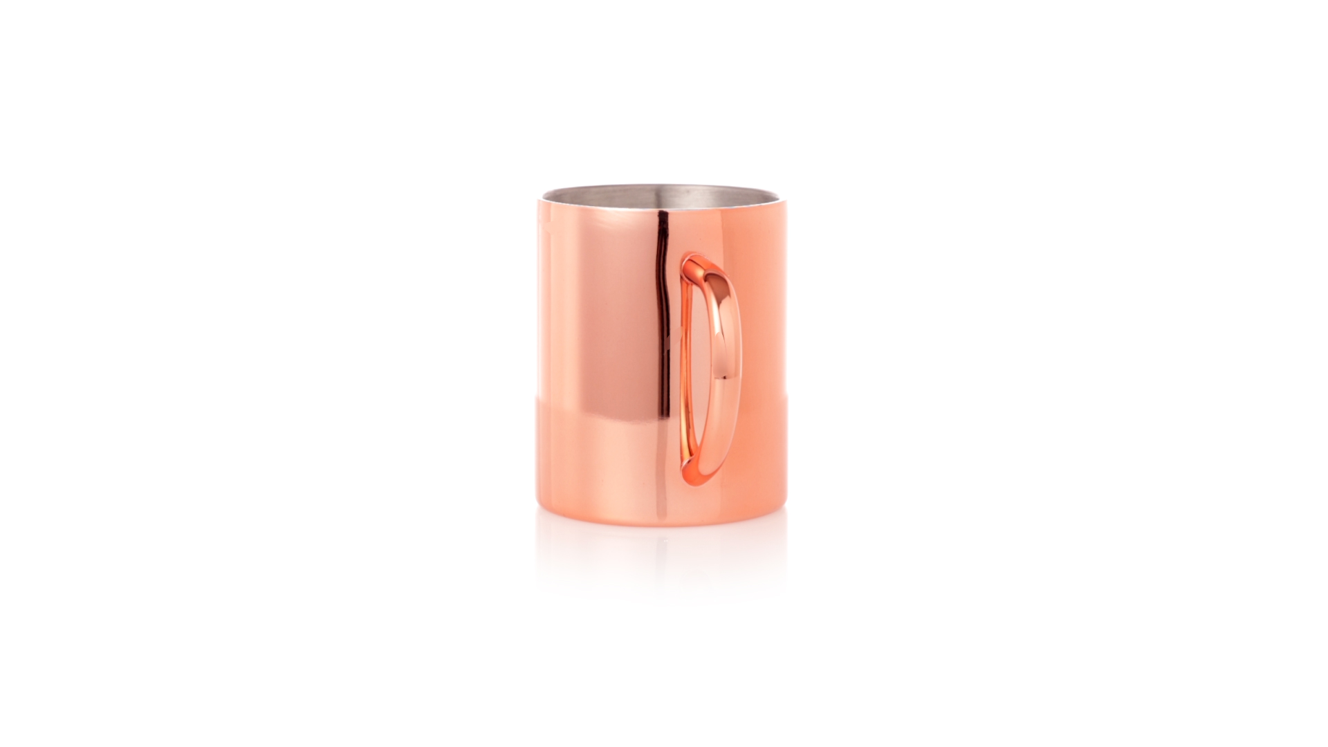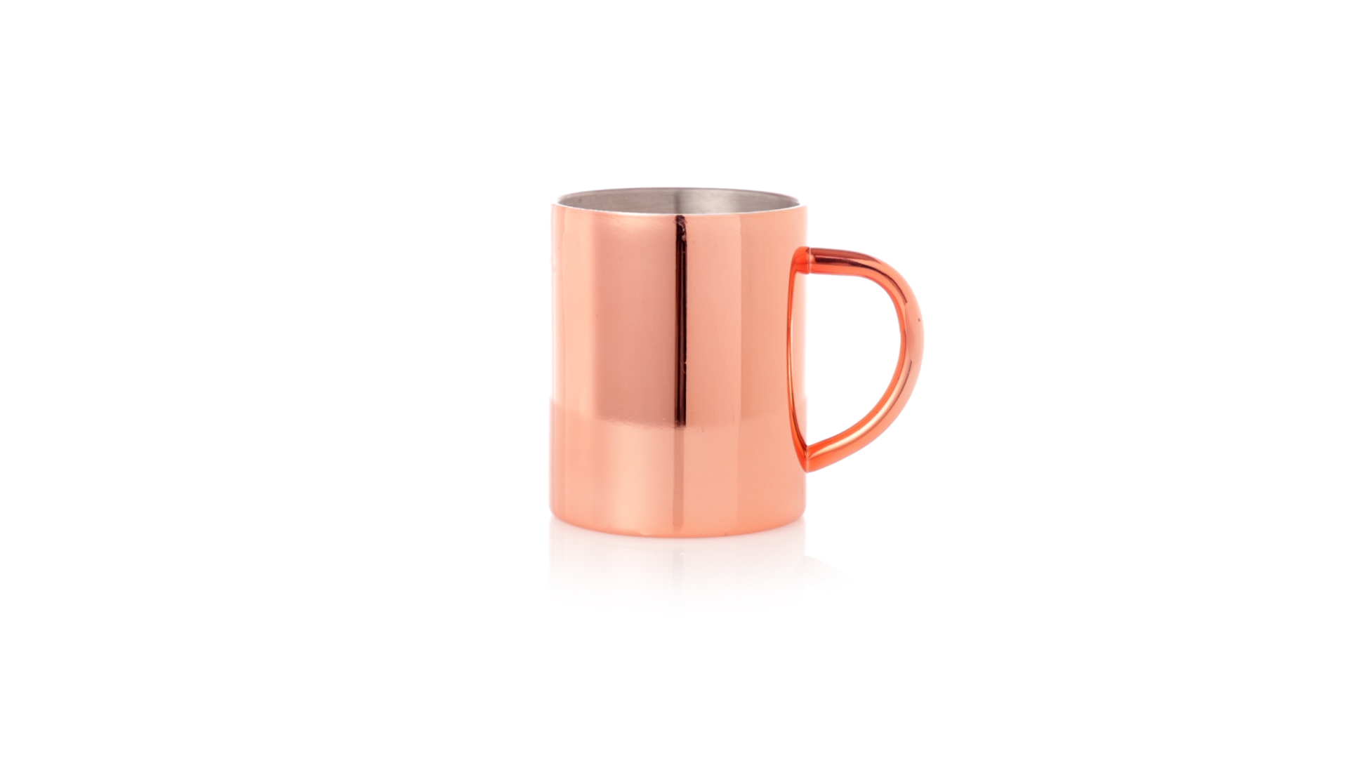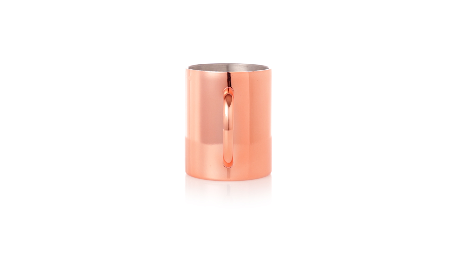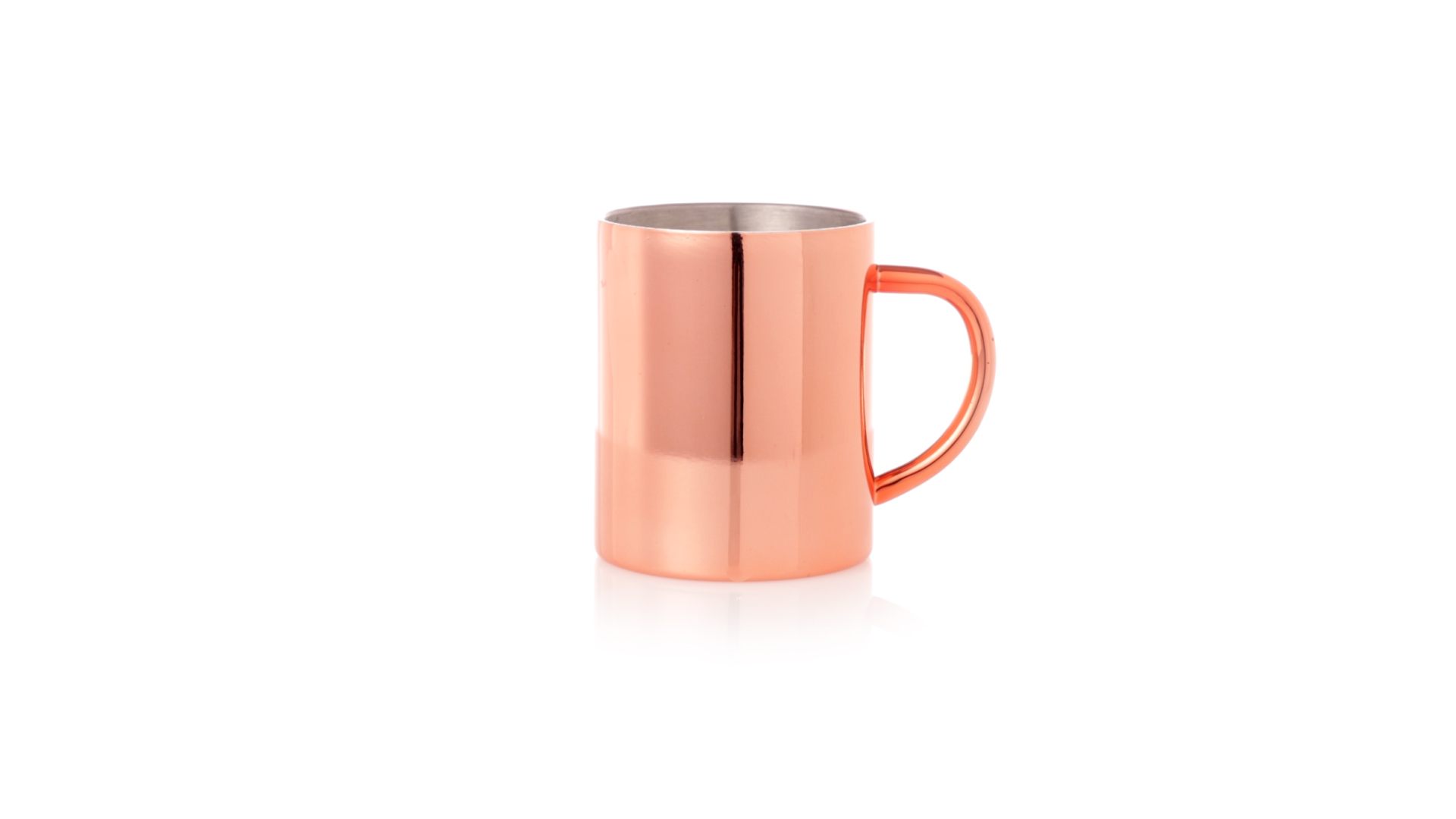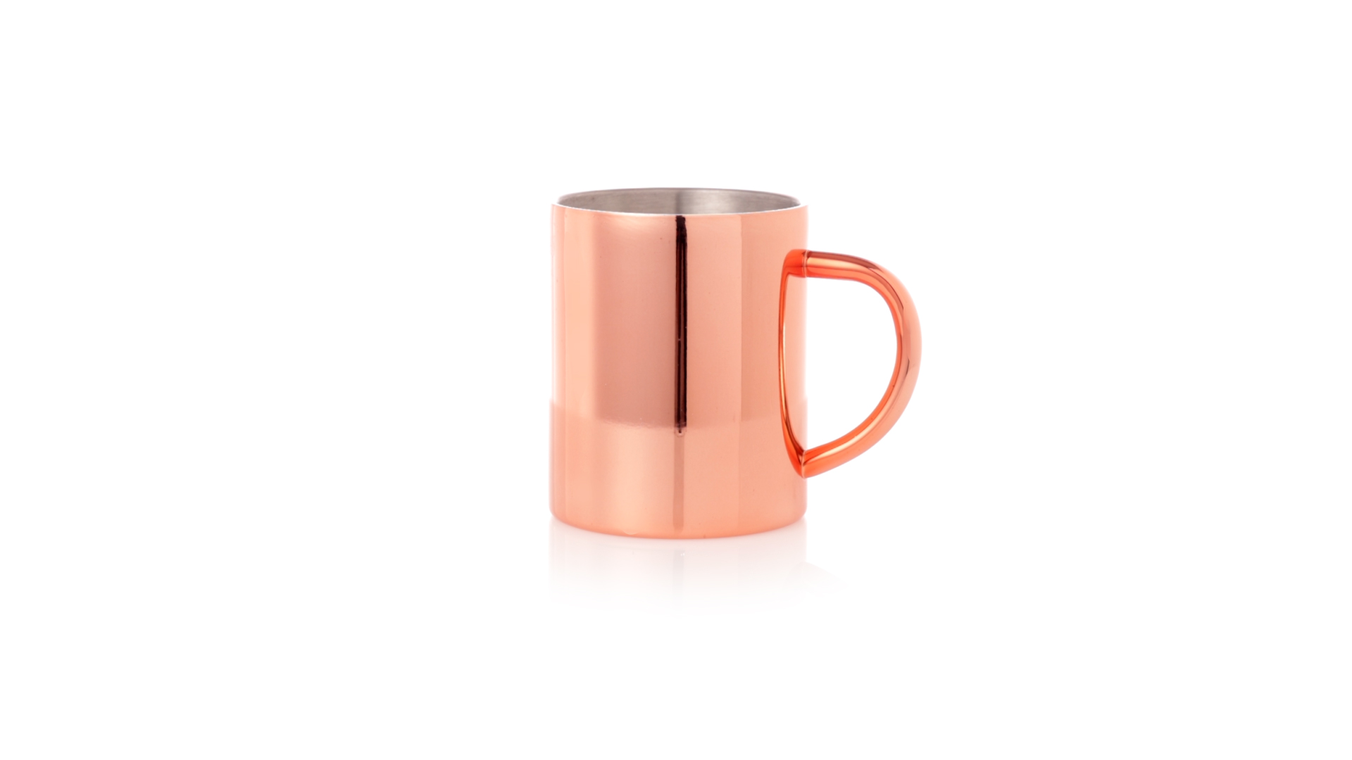 Becher mit 280 ml Fassungsvermögen aus doppelwandigem Edelstahl mit galvanisierter Kupferbeschichtung auf der Aussenseite. Innovatives Design mit glänzender Oberfläche. Präsentiert in einer exklusiven, individuellen schwarzen Designbox.