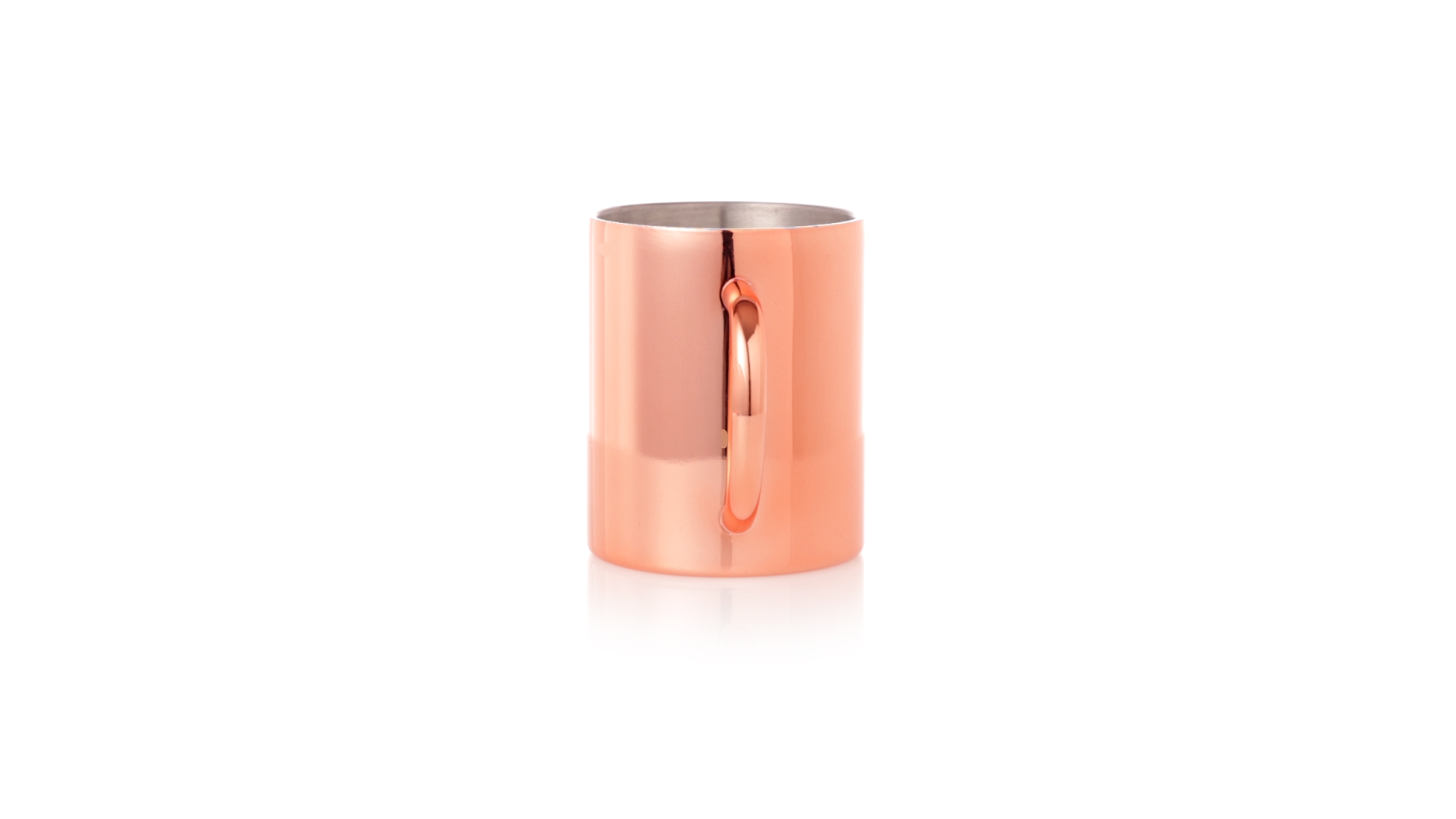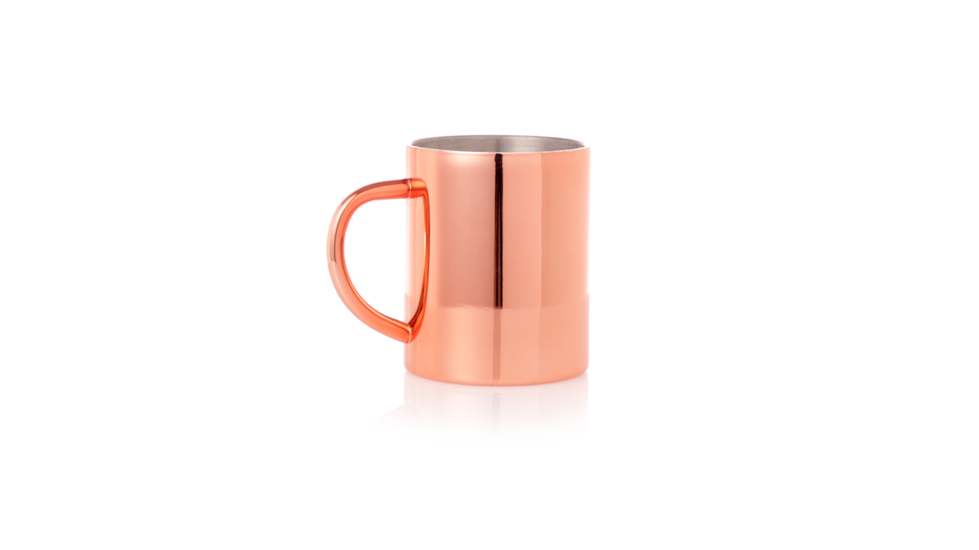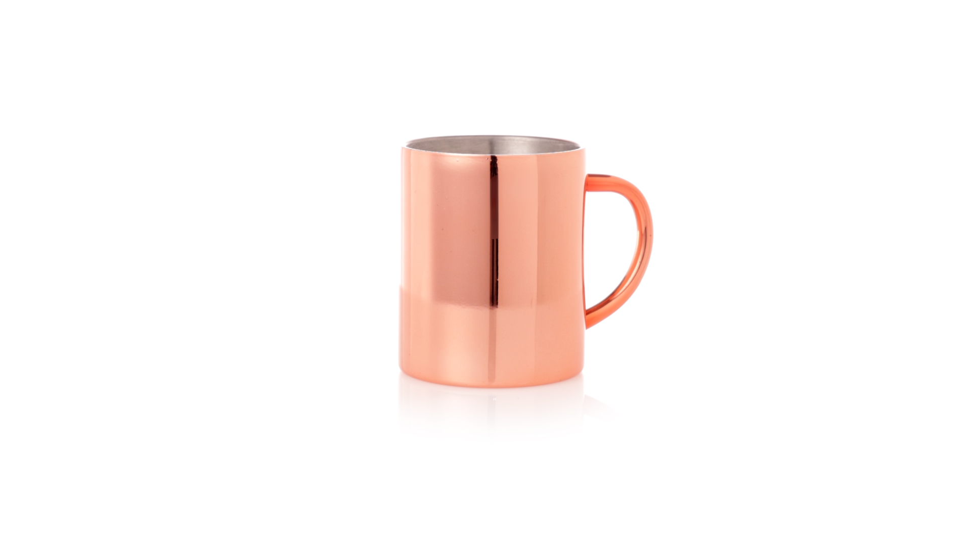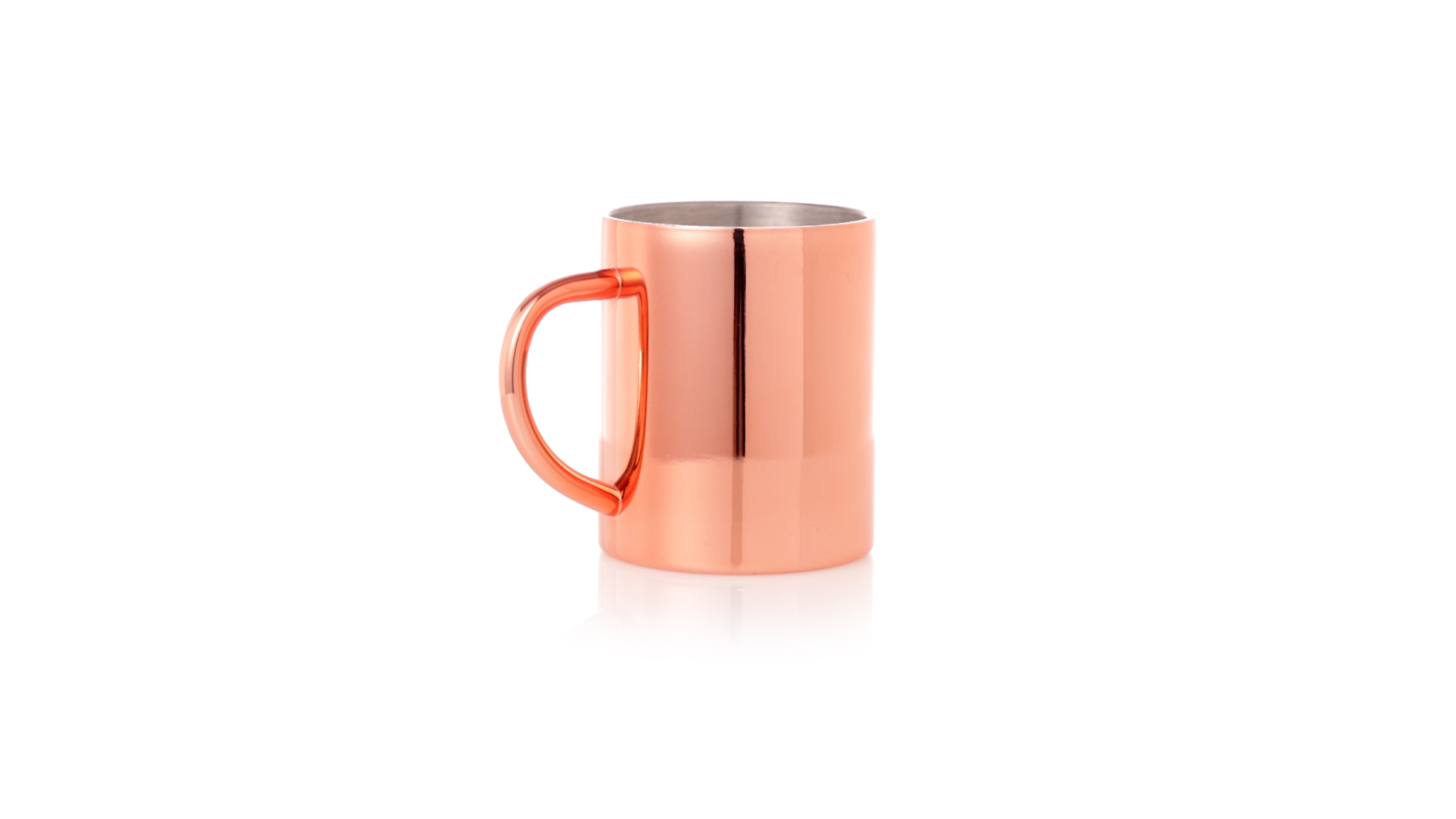 Becher mit 280 ml Fassungsvermögen aus doppelwandigem Edelstahl mit galvanisierter Kupferbeschichtung auf der Aussenseite. Innovatives Design mit glänzender Oberfläche. Präsentiert in einer exklusiven, individuellen schwarzen Designbox.