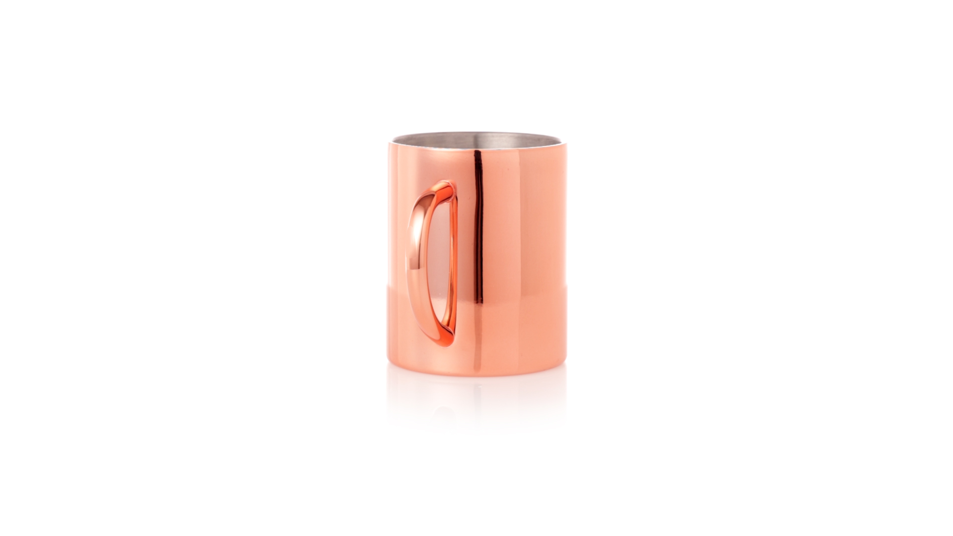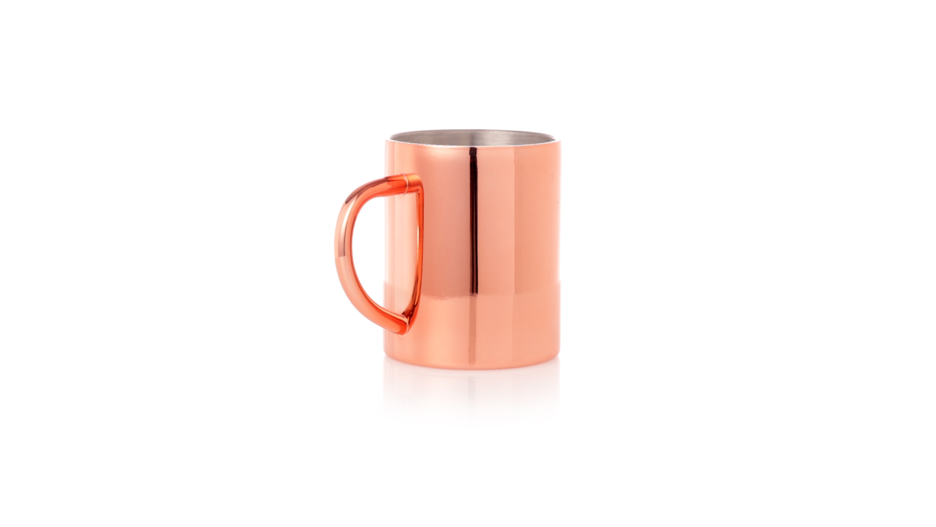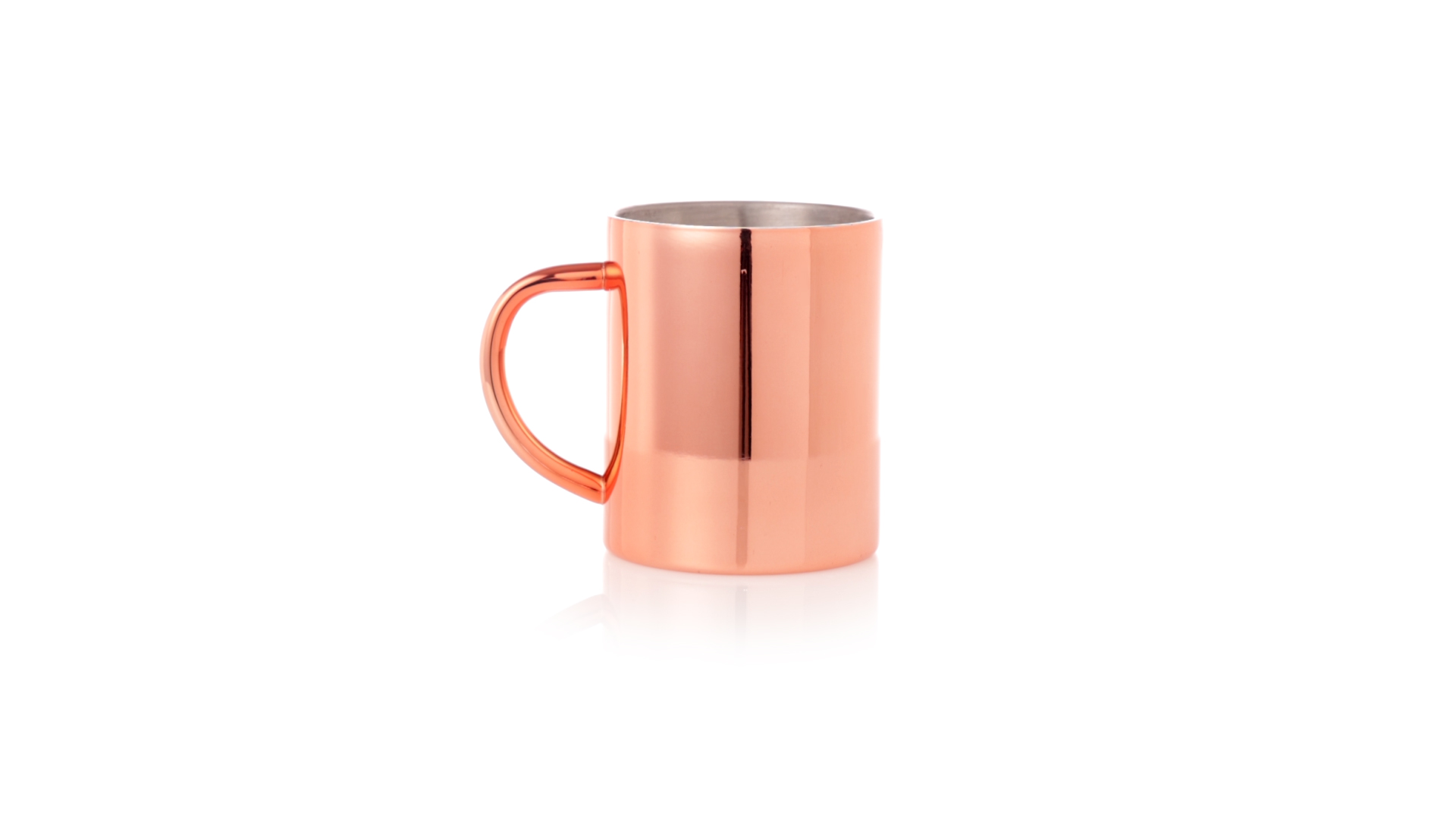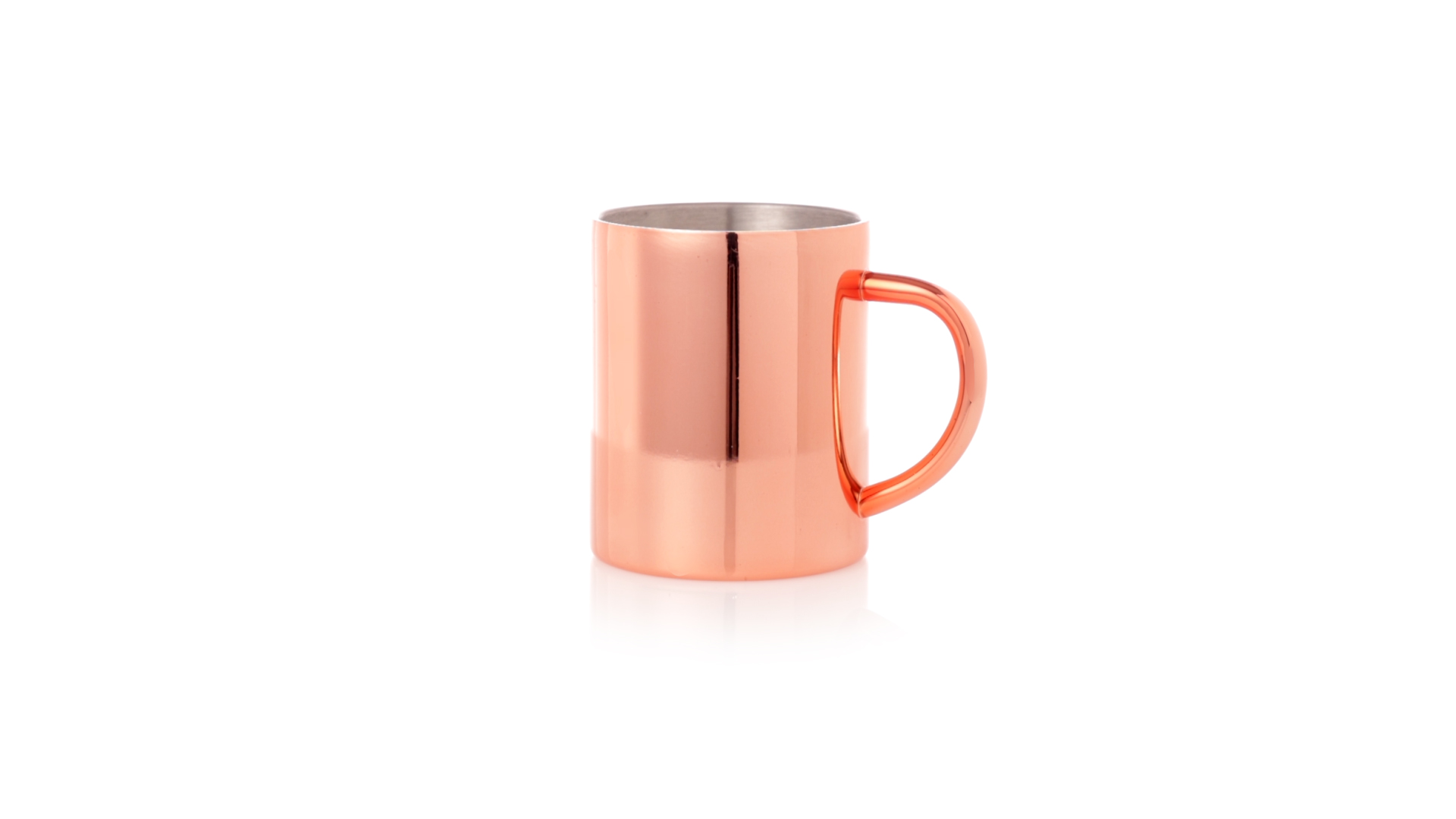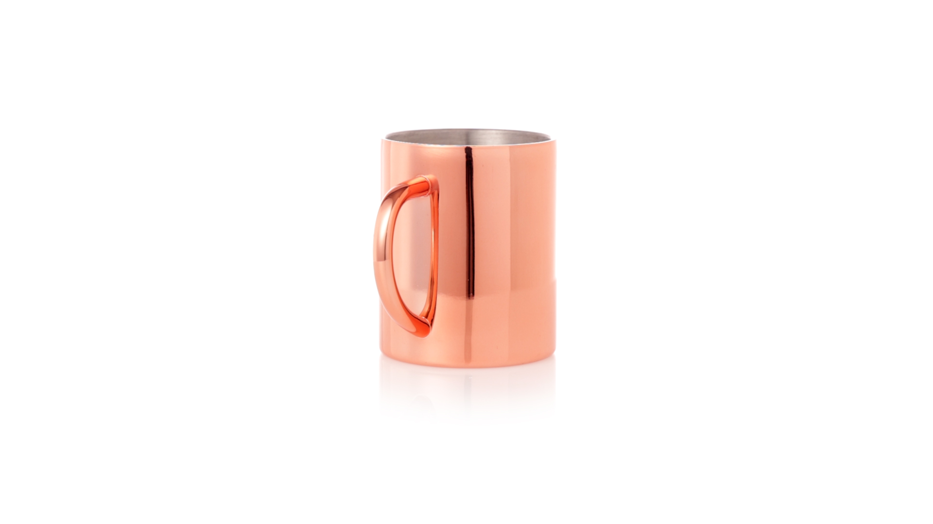 Becher mit 280 ml Fassungsvermögen aus doppelwandigem Edelstahl mit galvanisierter Kupferbeschichtung auf der Aussenseite. Innovatives Design mit glänzender Oberfläche. Präsentiert in einer exklusiven, individuellen schwarzen Designbox.