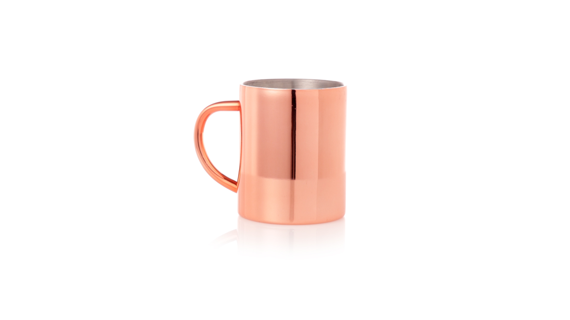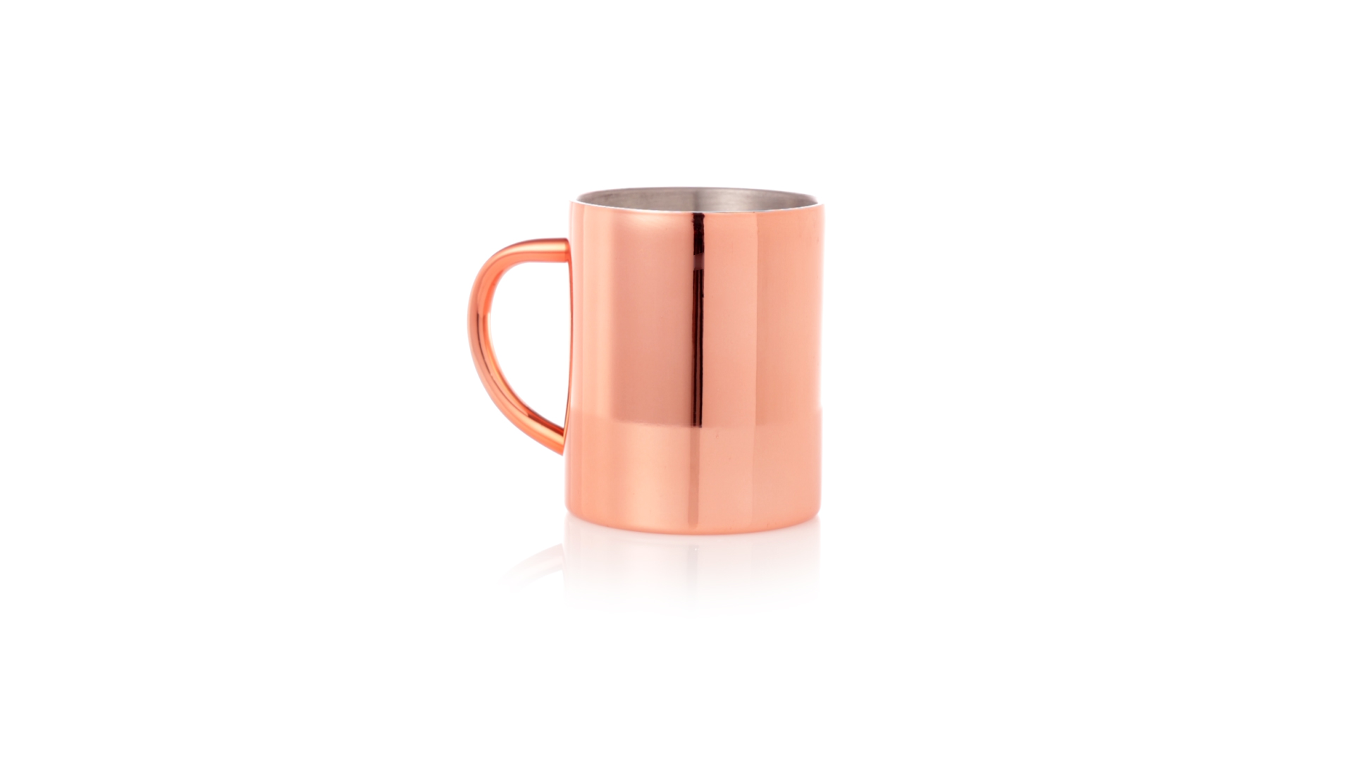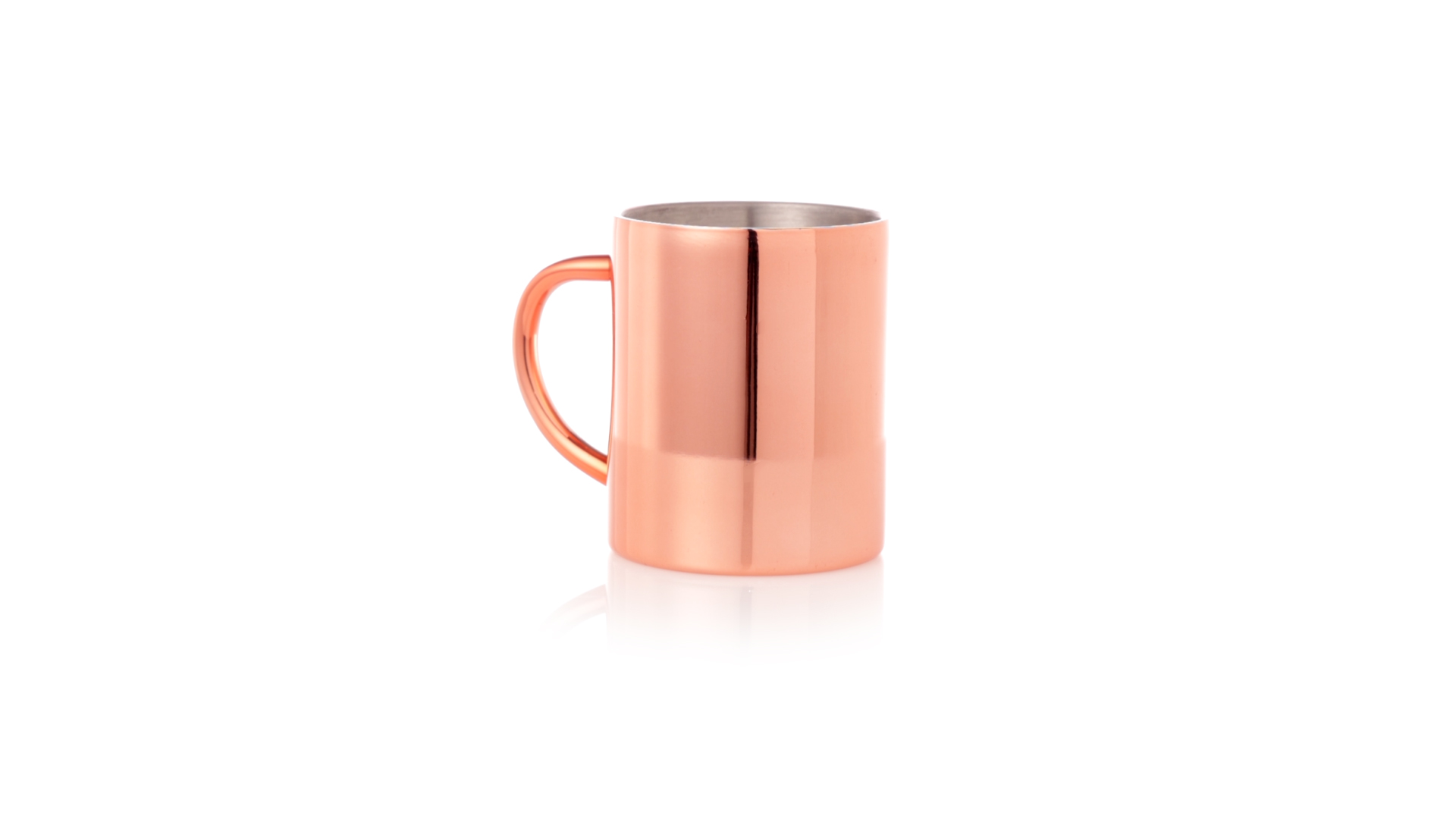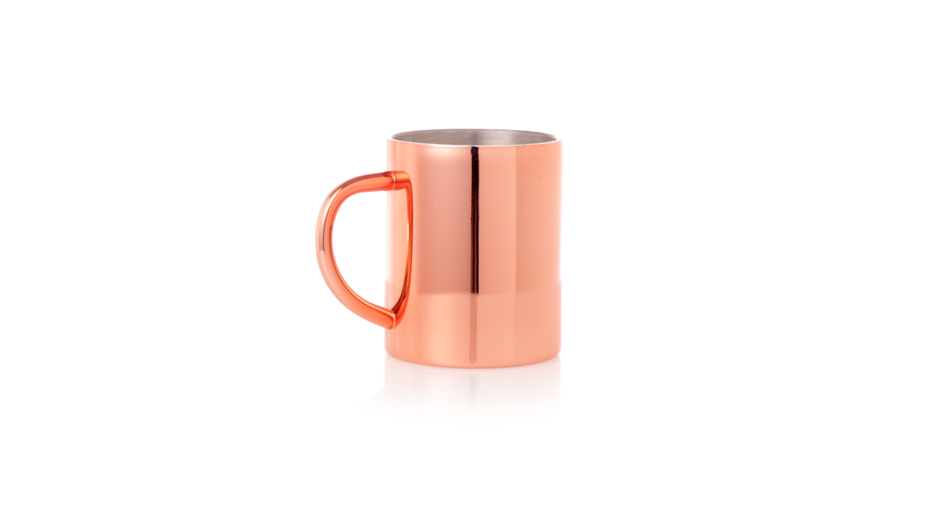 Becher mit 280 ml Fassungsvermögen aus doppelwandigem Edelstahl mit galvanisierter Kupferbeschichtung auf der Aussenseite. Innovatives Design mit glänzender Oberfläche. Präsentiert in einer exklusiven, individuellen schwarzen Designbox.