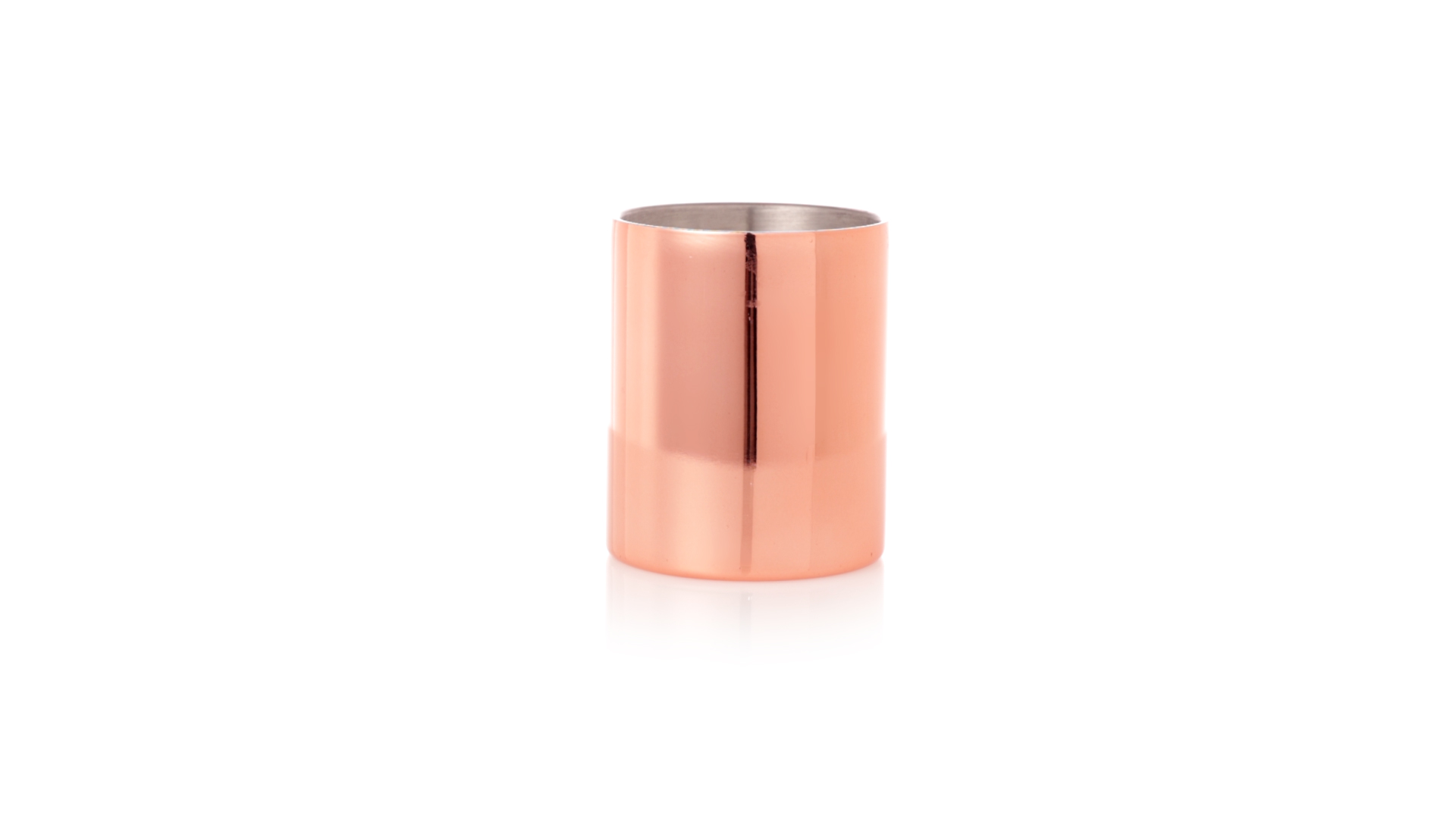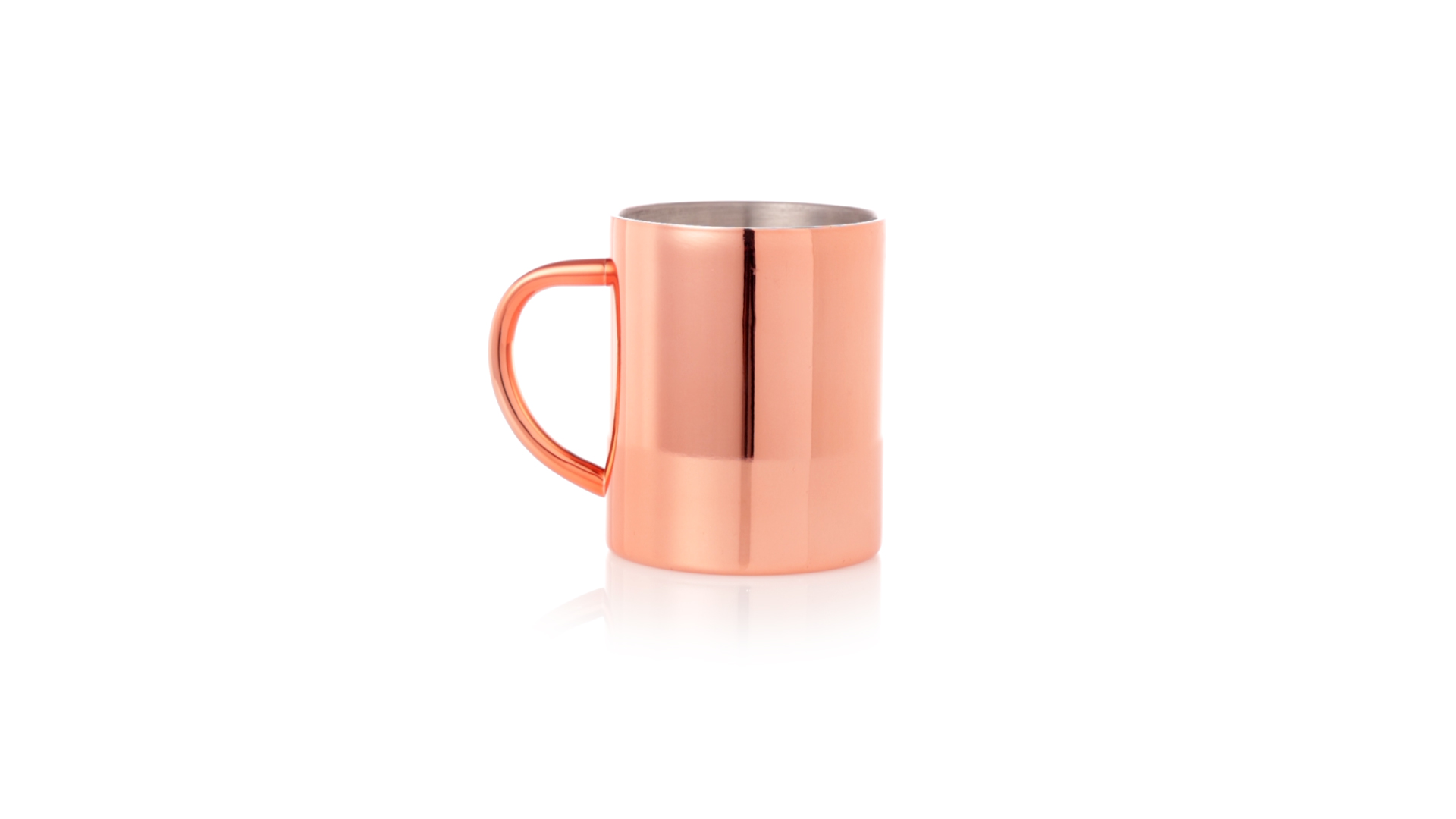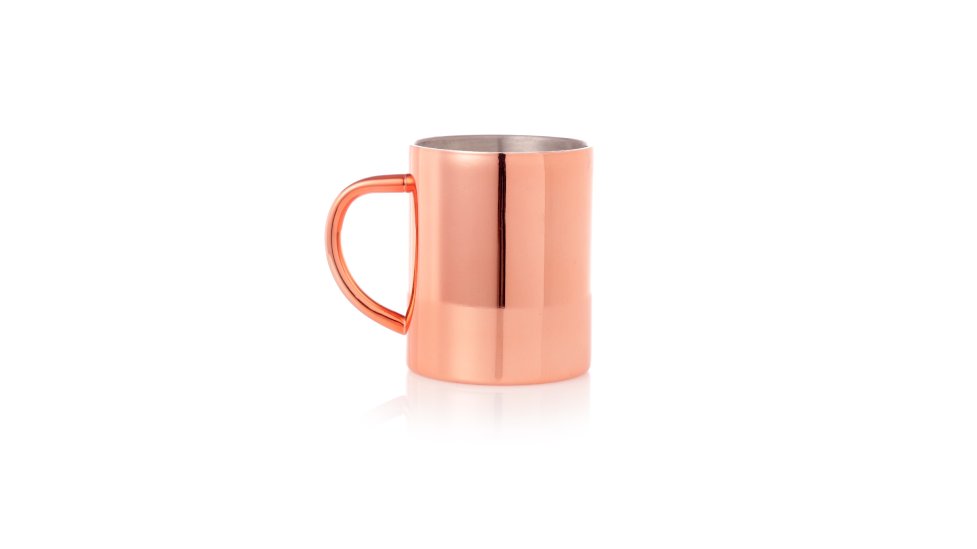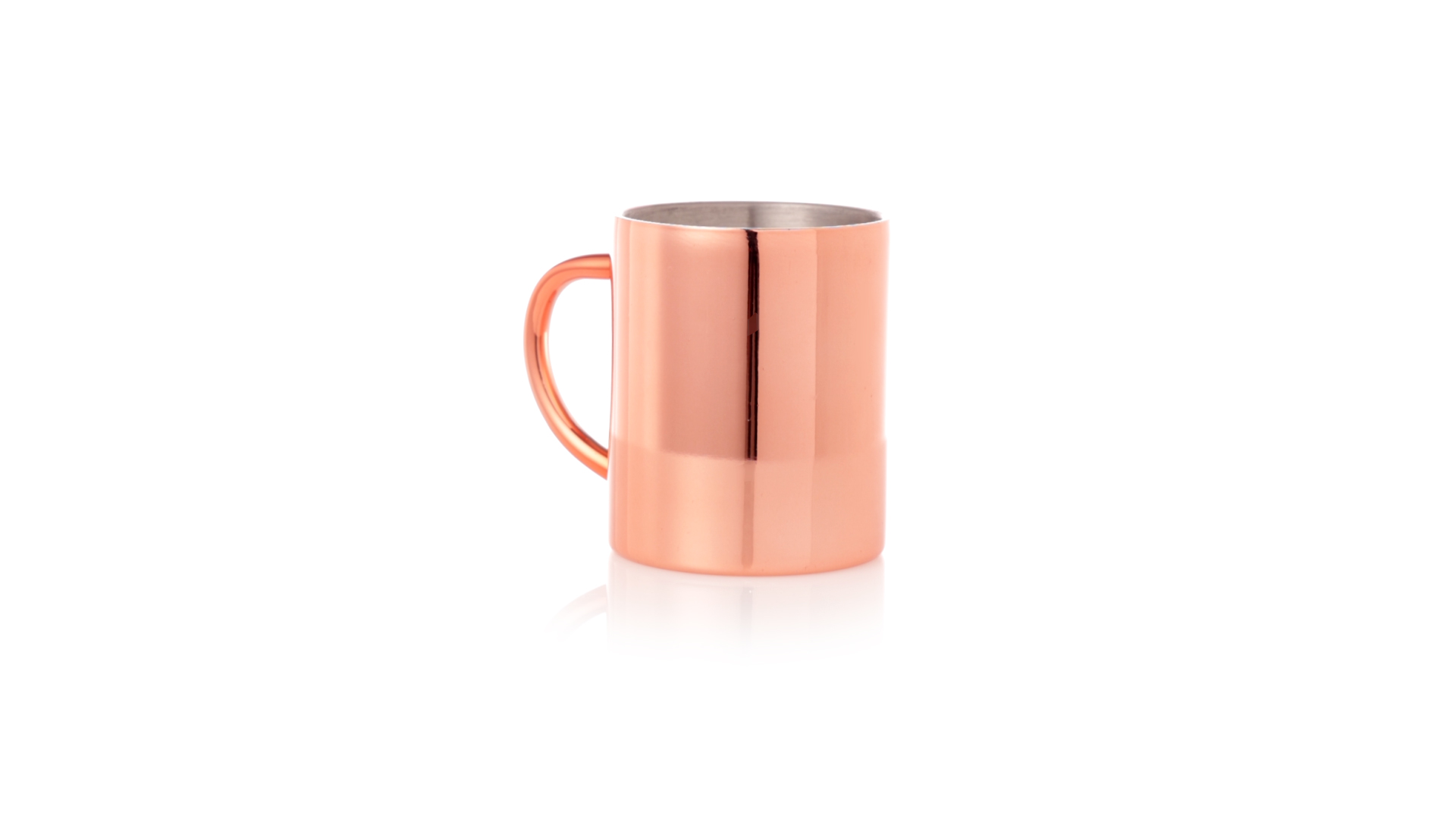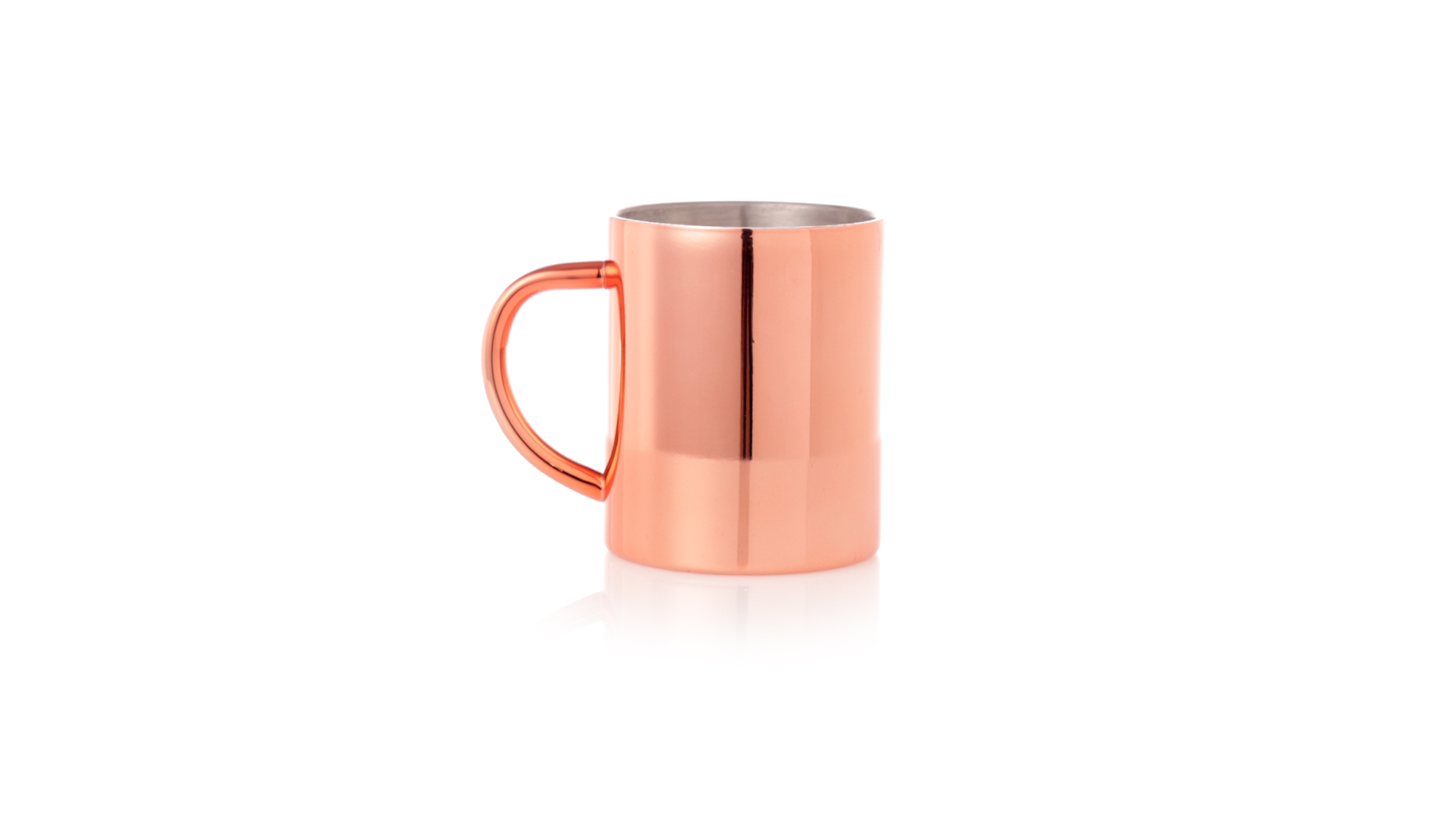 Becher mit 280 ml Fassungsvermögen aus doppelwandigem Edelstahl mit galvanisierter Kupferbeschichtung auf der Aussenseite. Innovatives Design mit glänzender Oberfläche. Präsentiert in einer exklusiven, individuellen schwarzen Designbox.