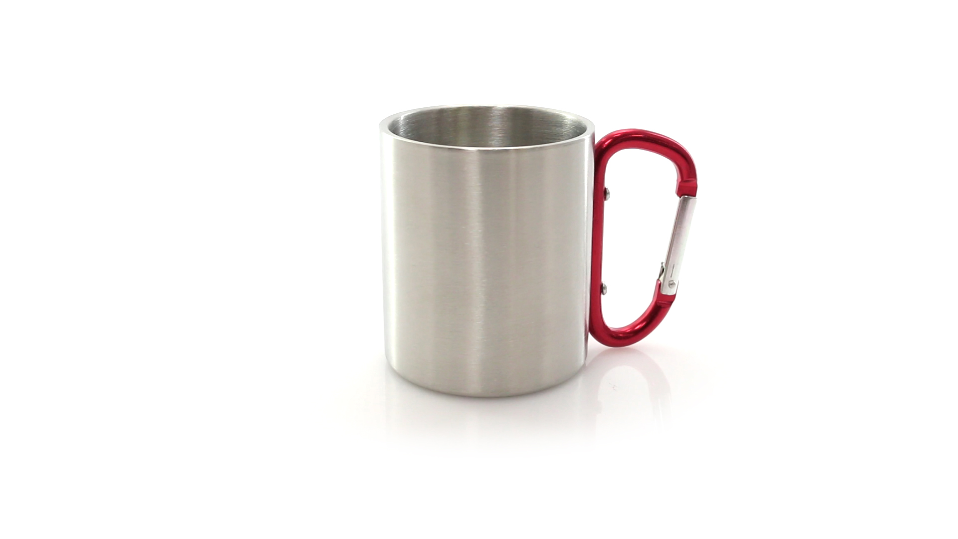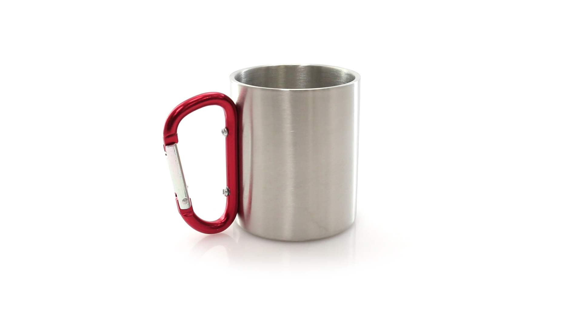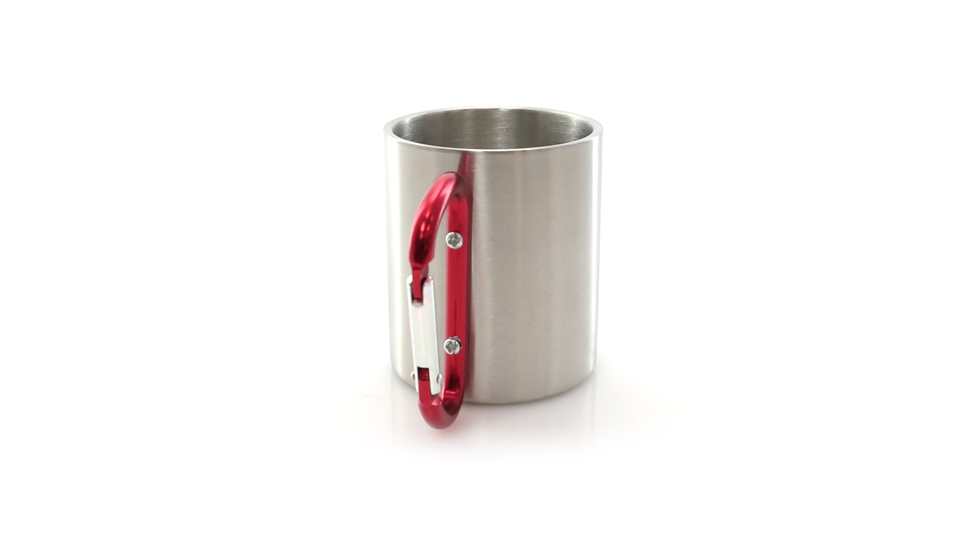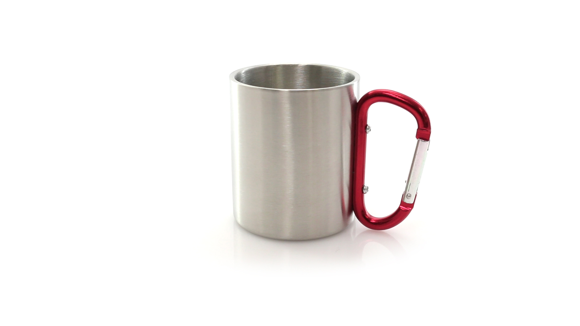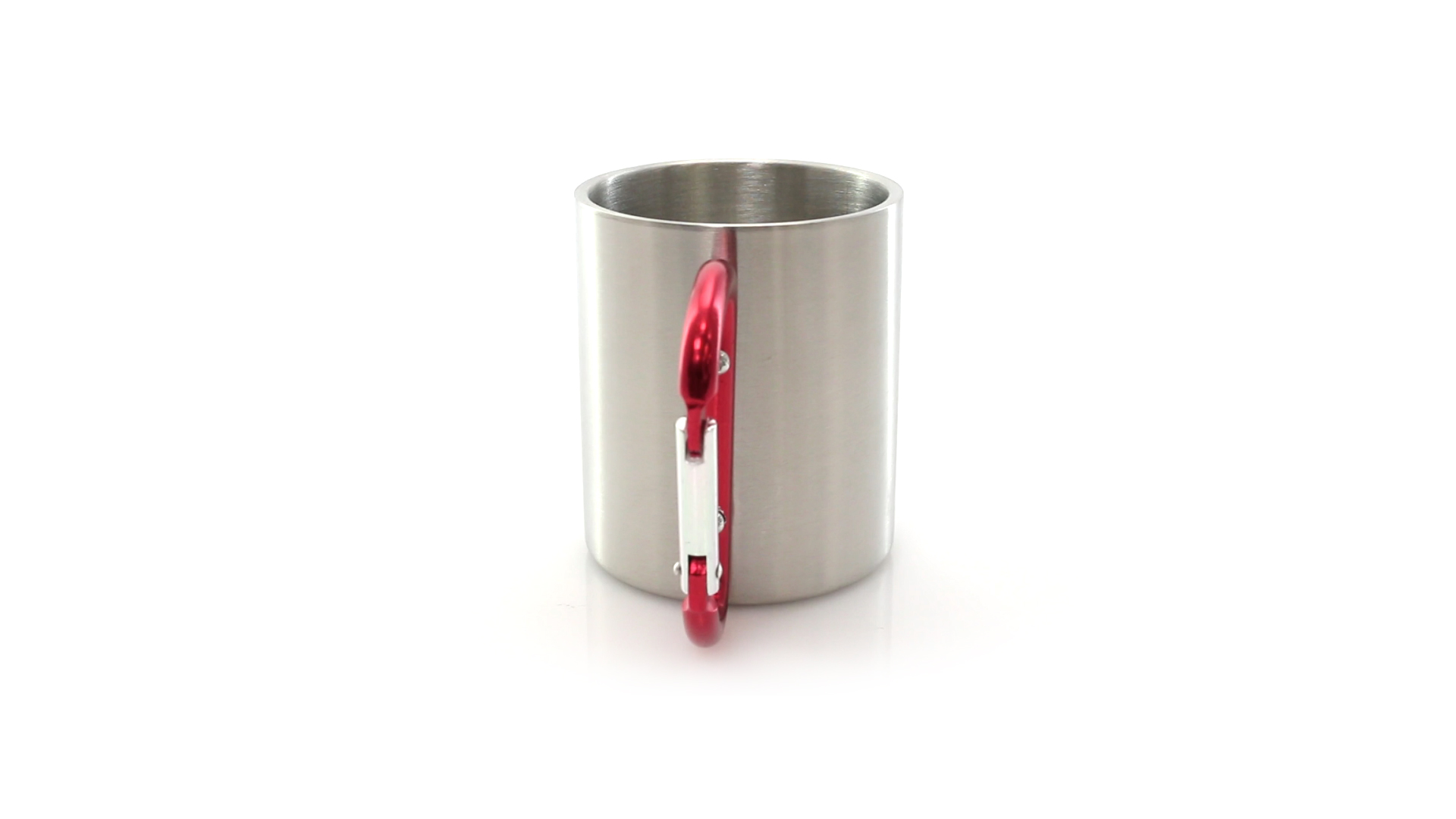 Edelstahlbecher mit 220 ml Fassungsvermögen mit metallisch glänzender Oberfläche und funktionellem Karabinergriff in verschiedenen Farben, der das Tragen erleichtert. Präsentiert in einer Schachtel aus Kraftkarton.