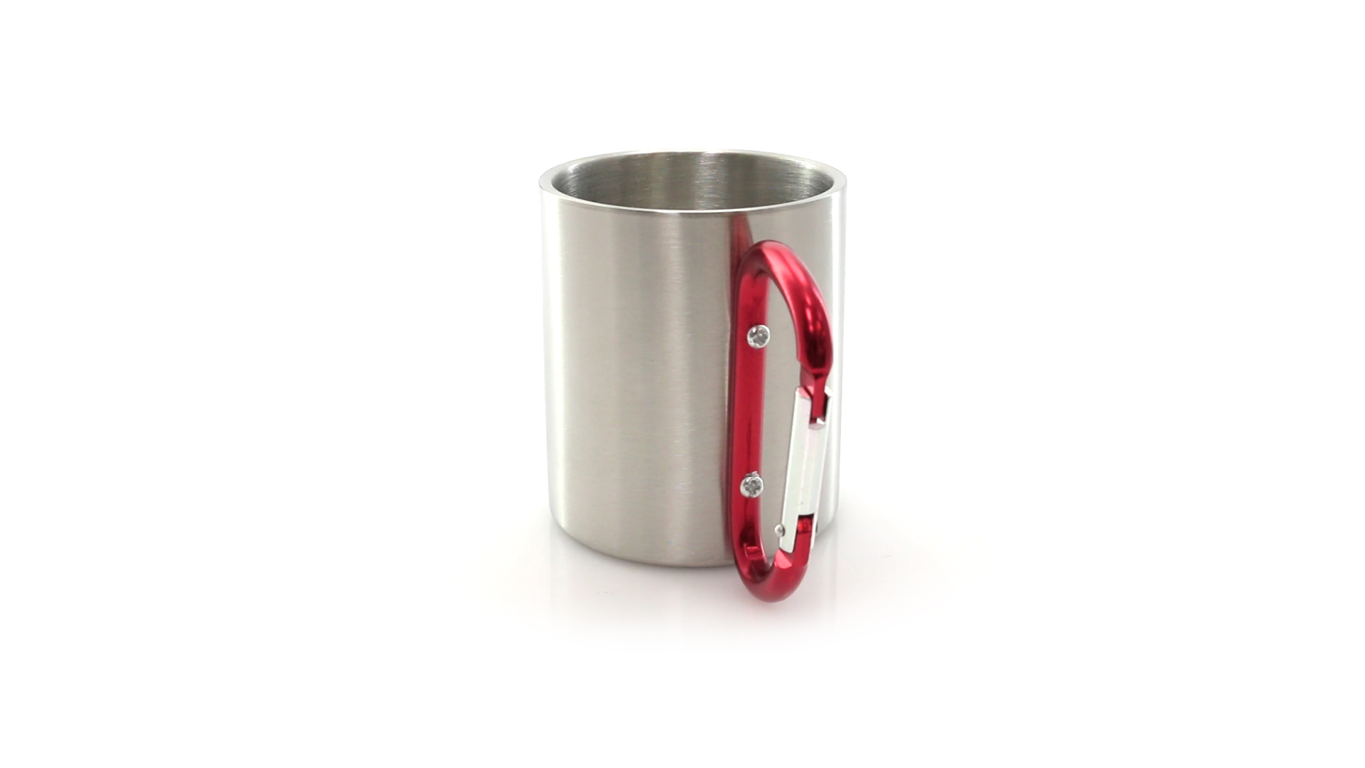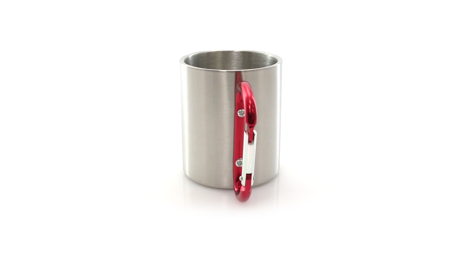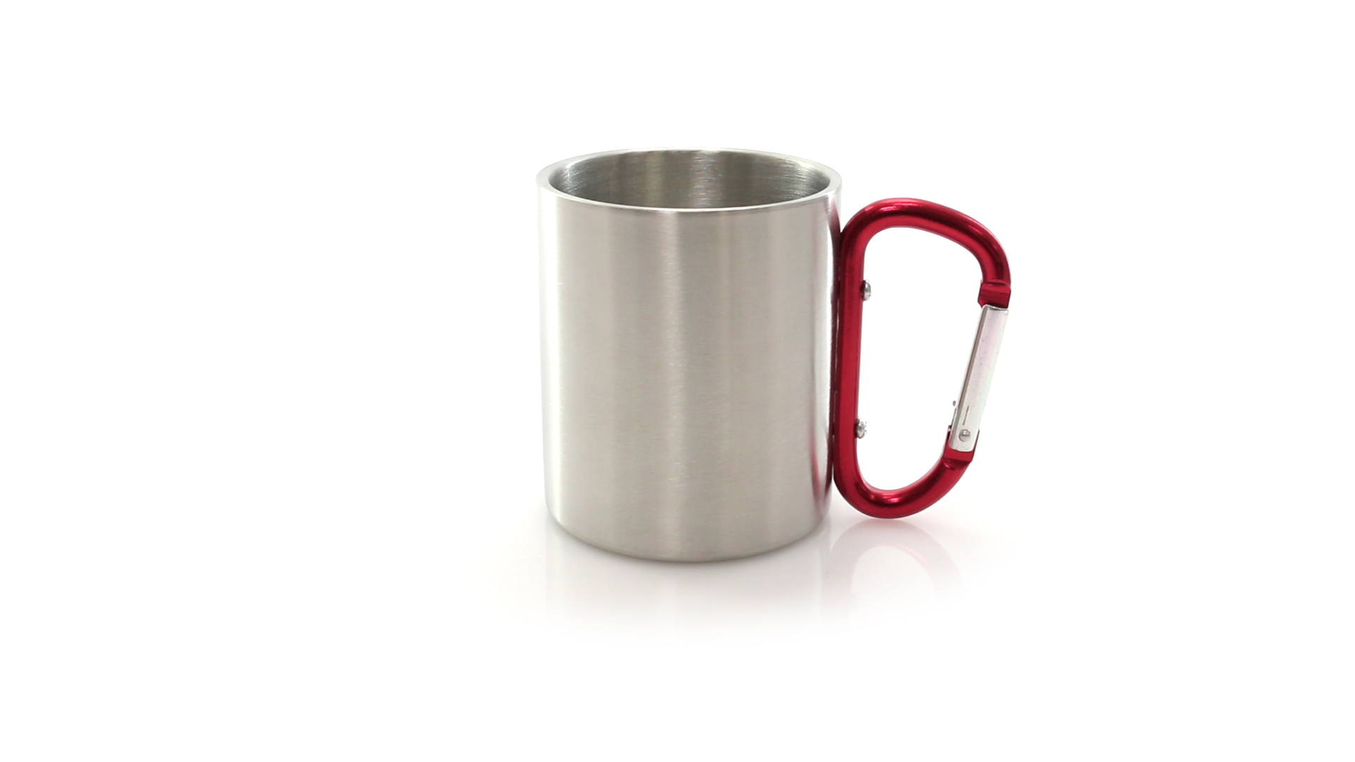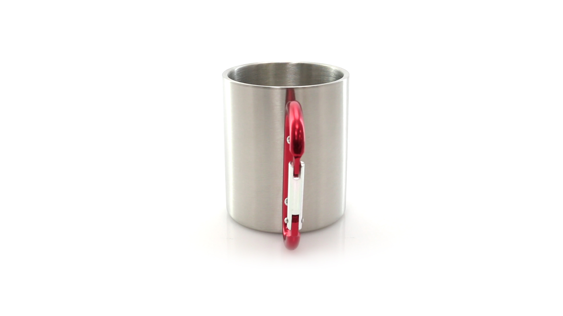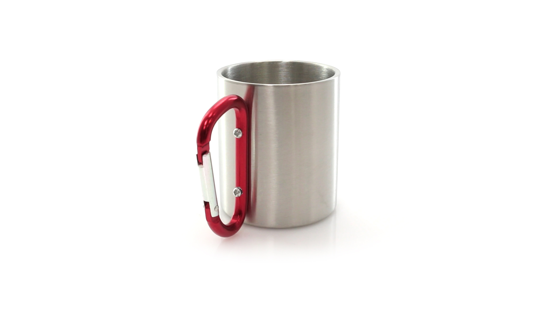 Edelstahlbecher mit 220 ml Fassungsvermögen mit metallisch glänzender Oberfläche und funktionellem Karabinergriff in verschiedenen Farben, der das Tragen erleichtert. Präsentiert in einer Schachtel aus Kraftkarton.