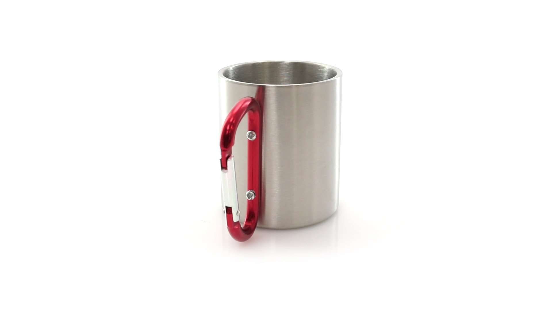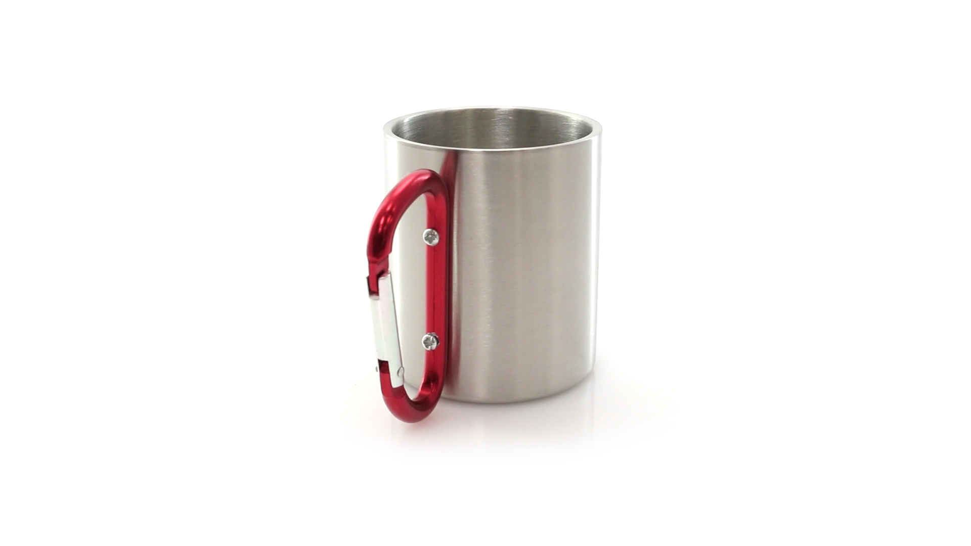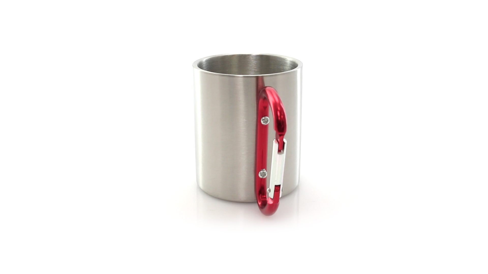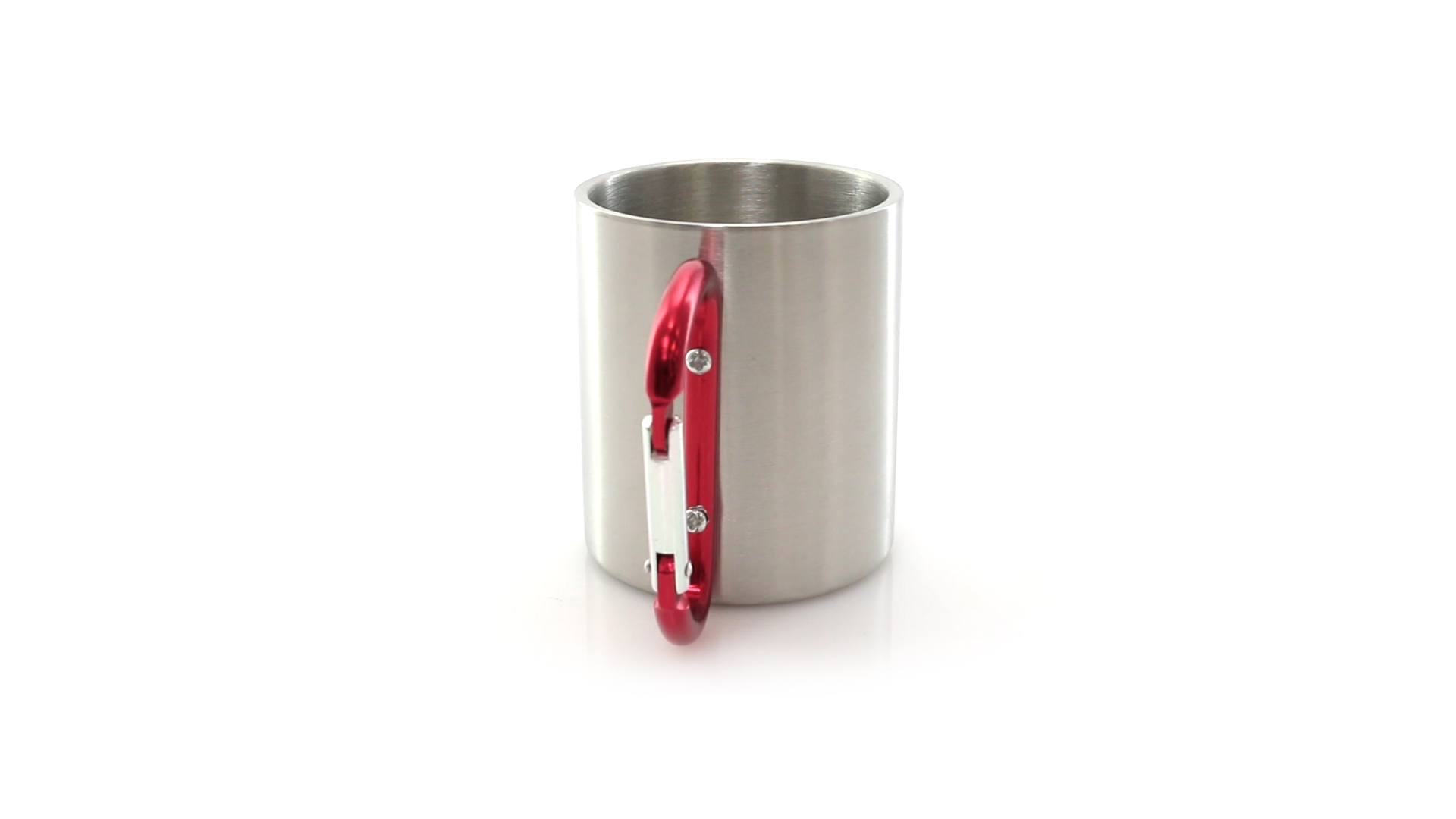 Edelstahlbecher mit 220 ml Fassungsvermögen mit metallisch glänzender Oberfläche und funktionellem Karabinergriff in verschiedenen Farben, der das Tragen erleichtert. Präsentiert in einer Schachtel aus Kraftkarton.
