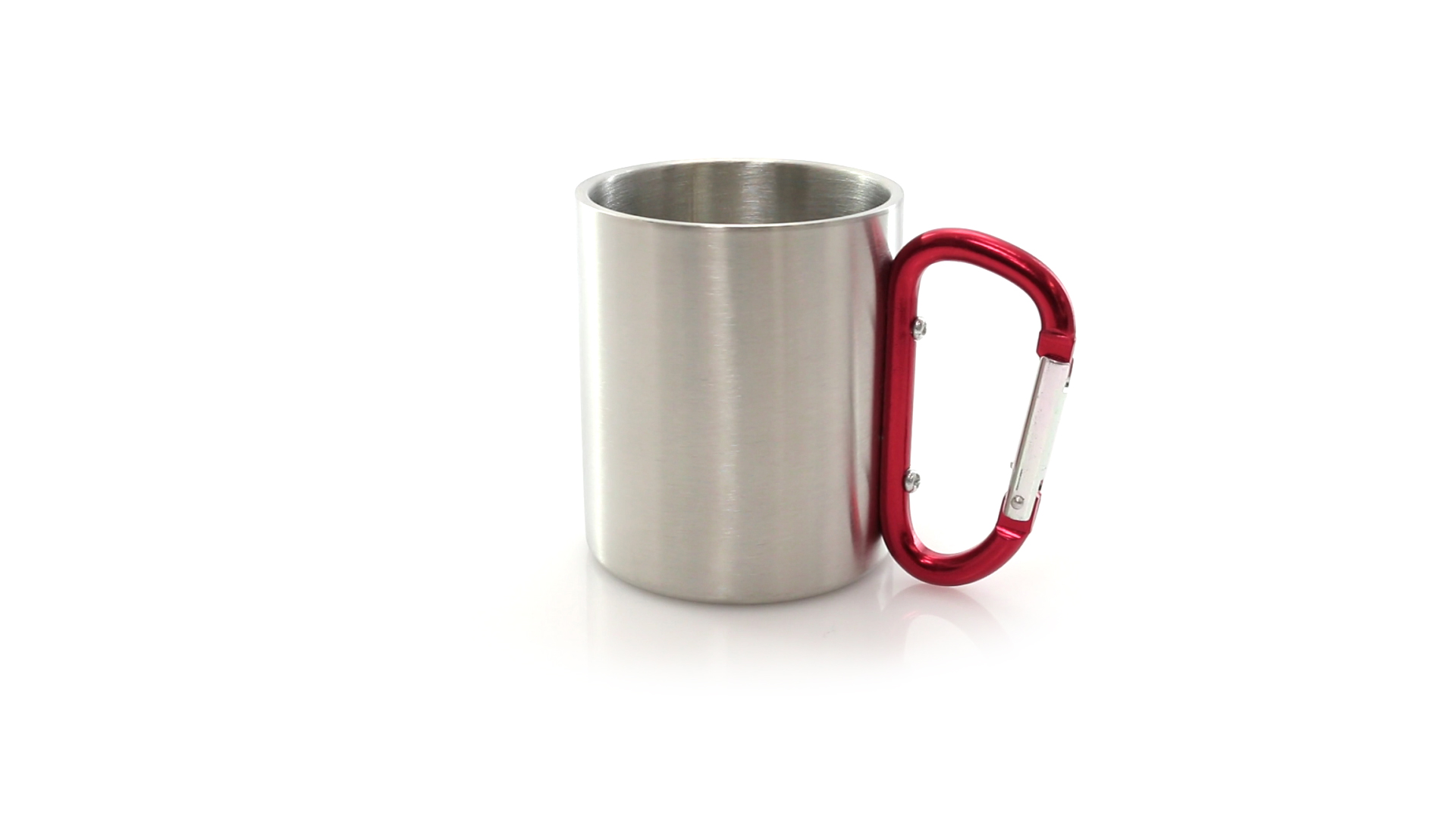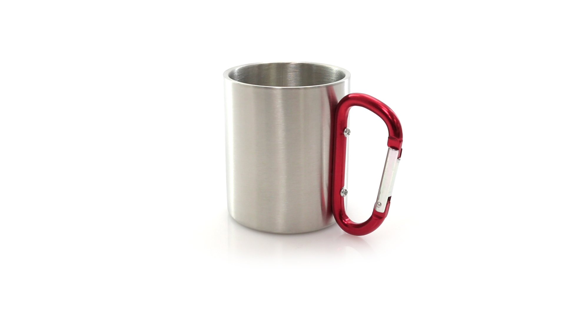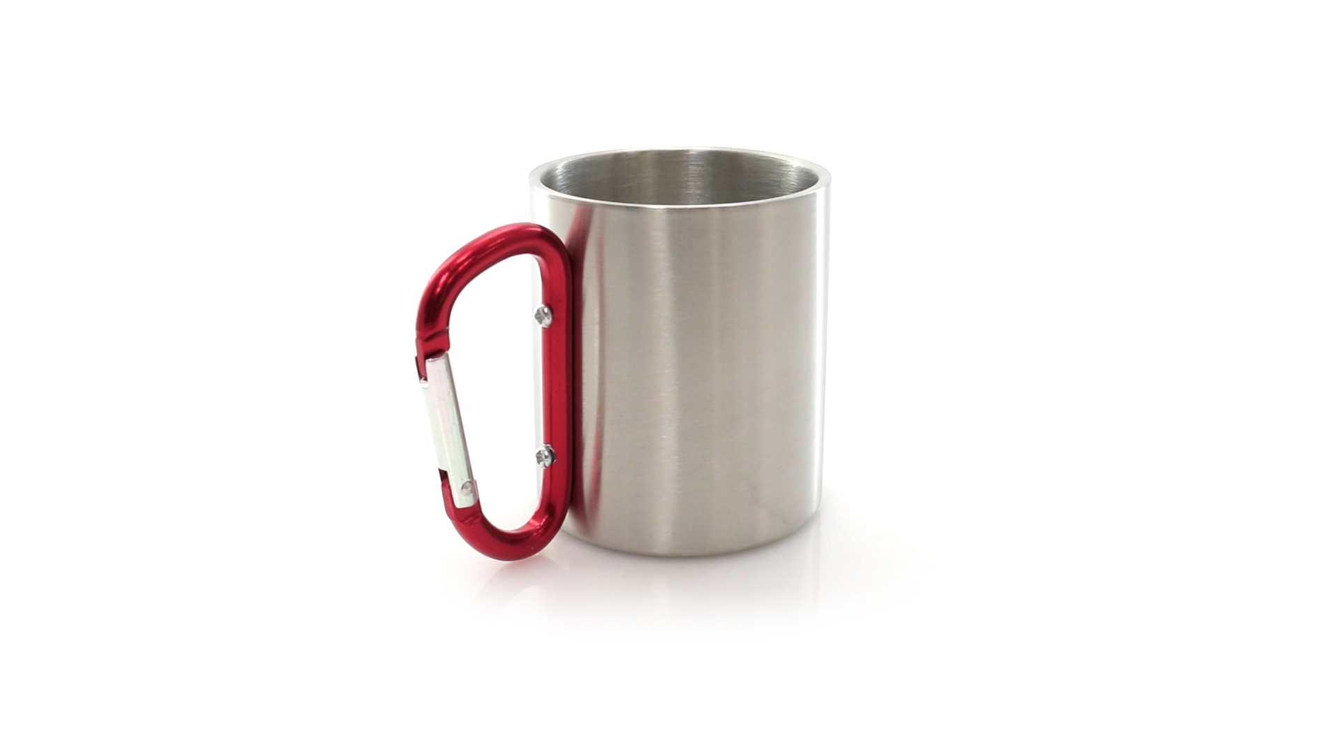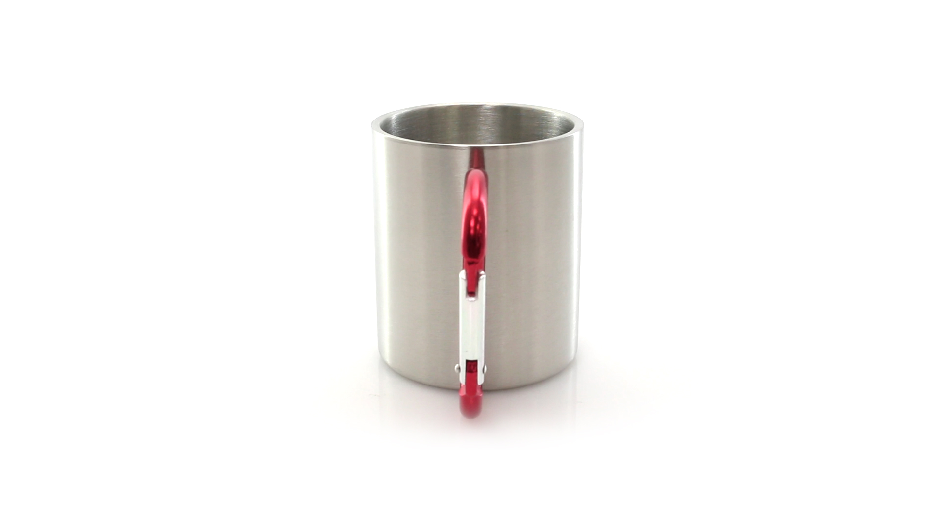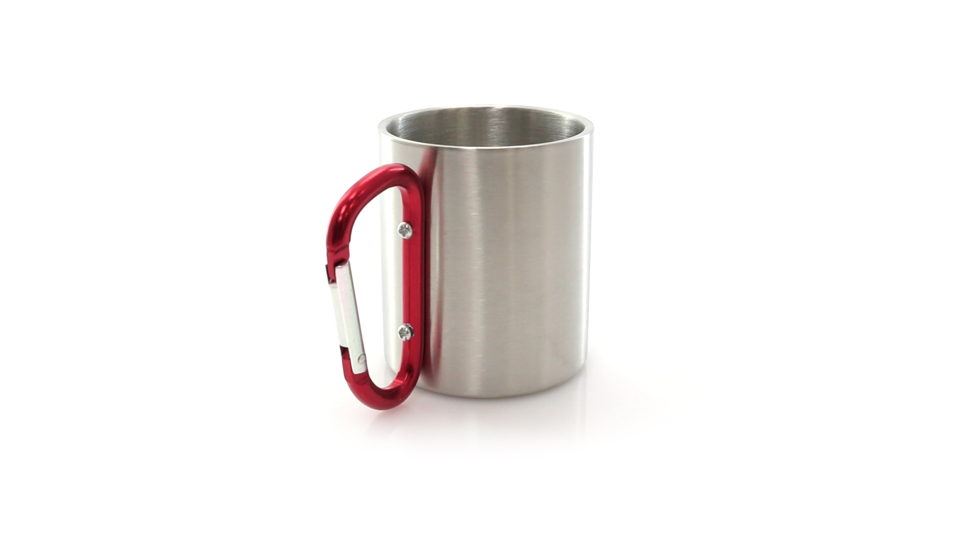 Edelstahlbecher mit 220 ml Fassungsvermögen mit metallisch glänzender Oberfläche und funktionellem Karabinergriff in verschiedenen Farben, der das Tragen erleichtert. Präsentiert in einer Schachtel aus Kraftkarton.