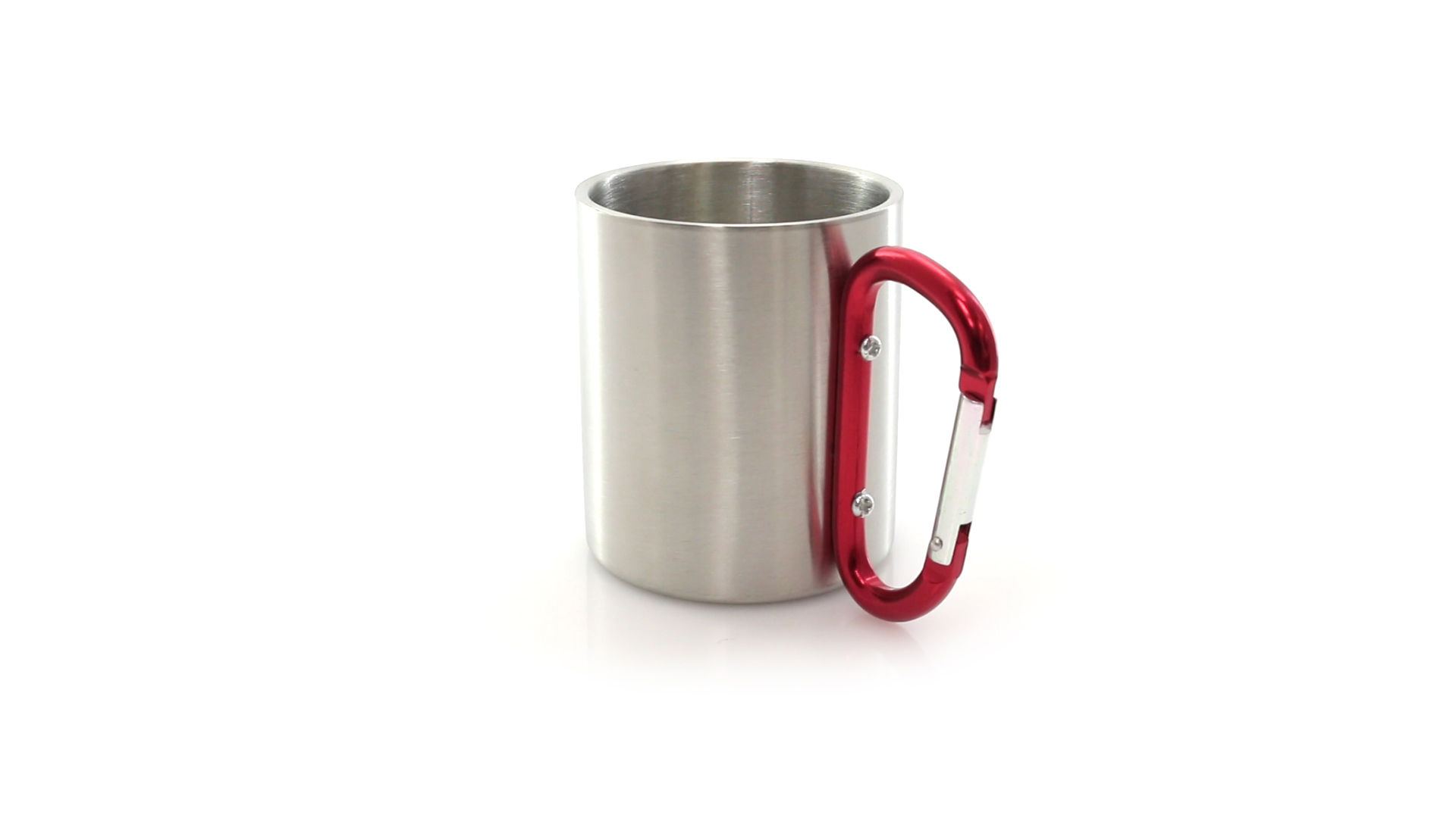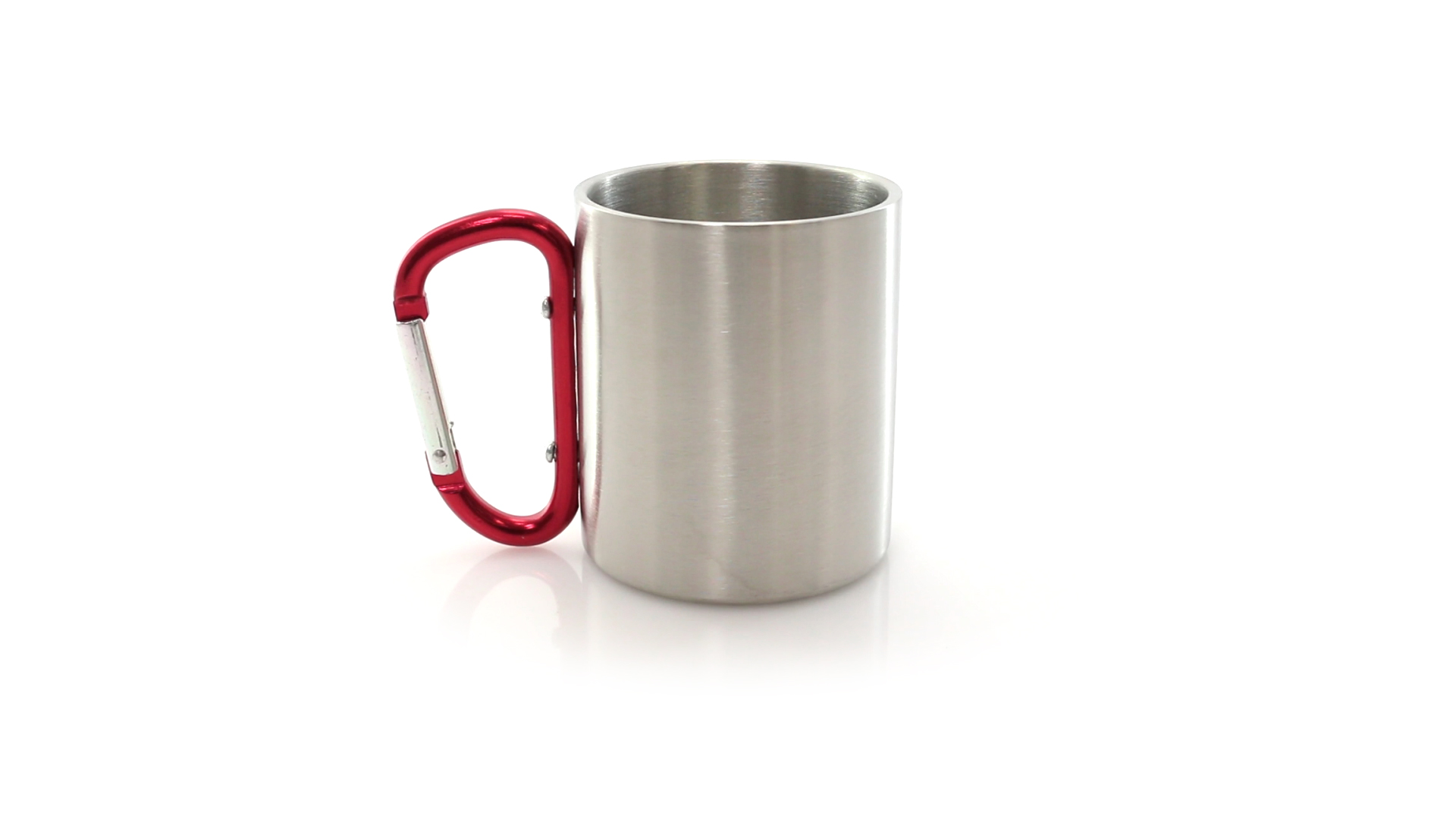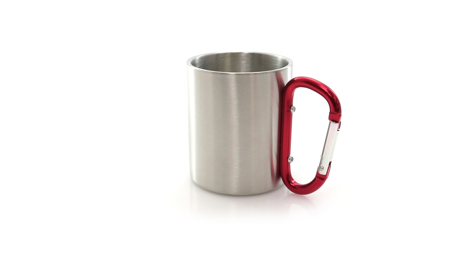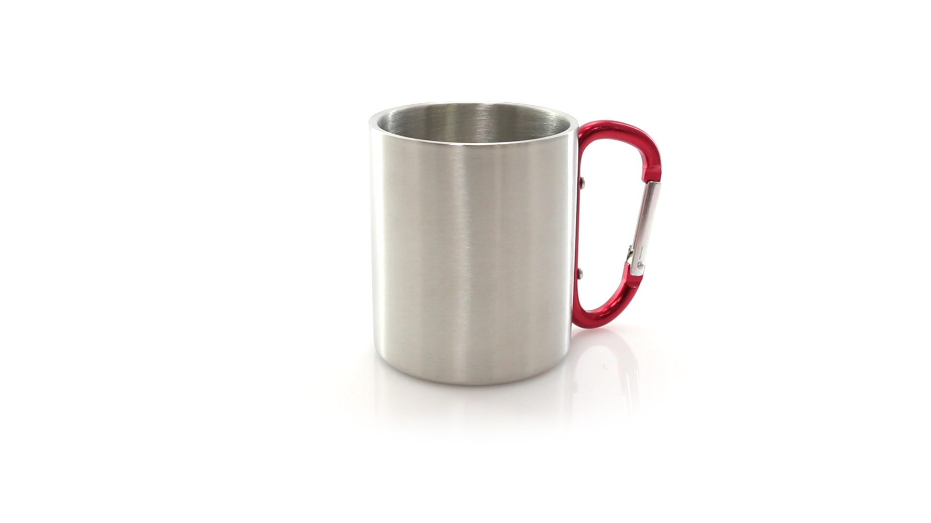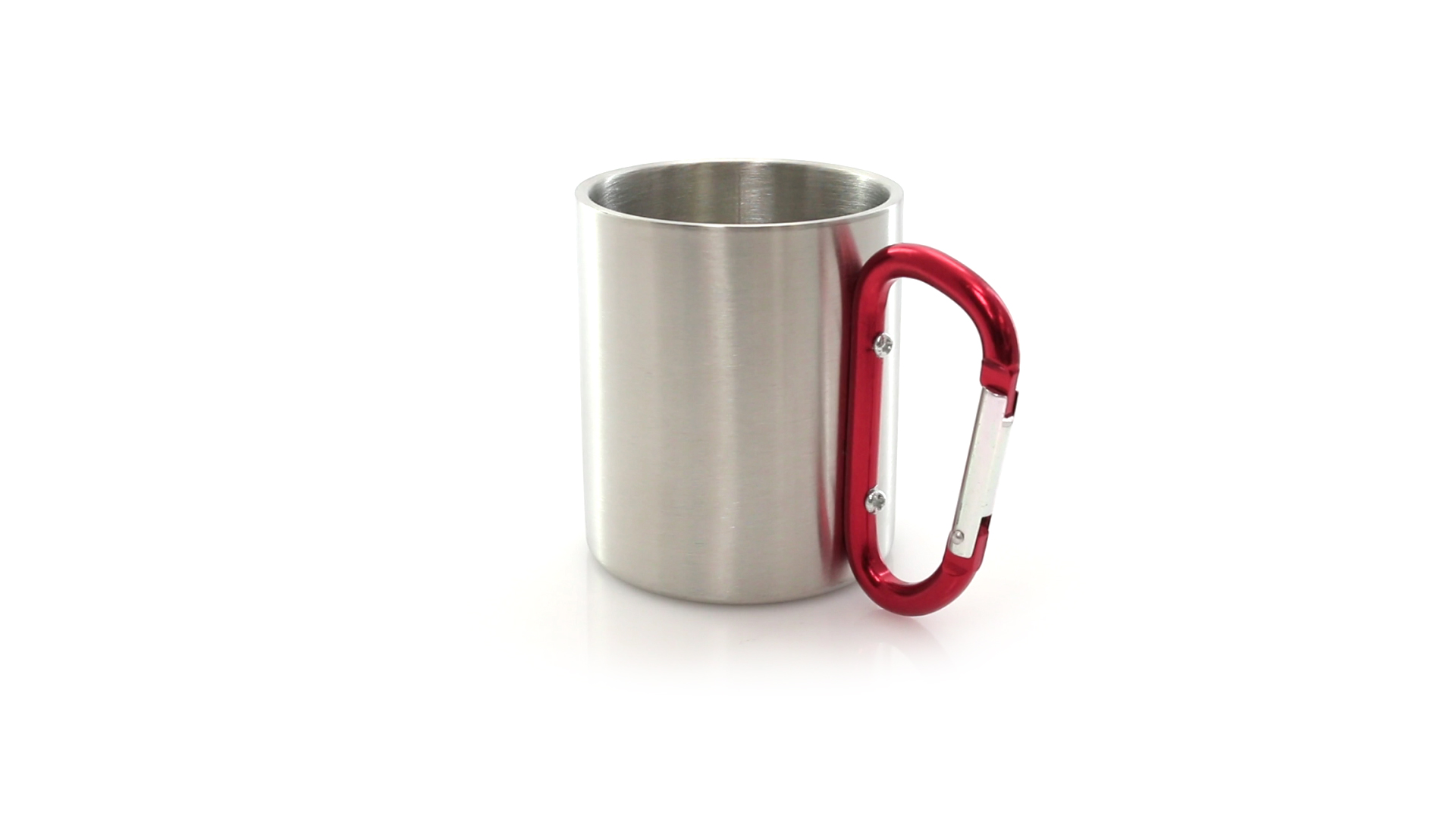 Edelstahlbecher mit 220 ml Fassungsvermögen mit metallisch glänzender Oberfläche und funktionellem Karabinergriff in verschiedenen Farben, der das Tragen erleichtert. Präsentiert in einer Schachtel aus Kraftkarton.