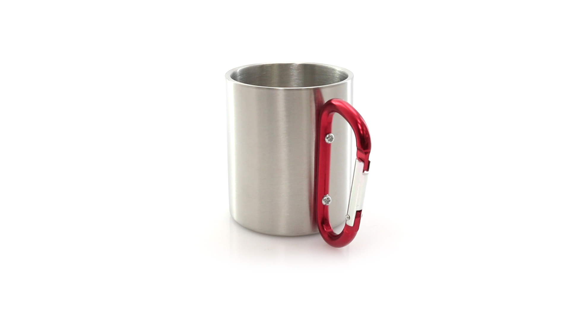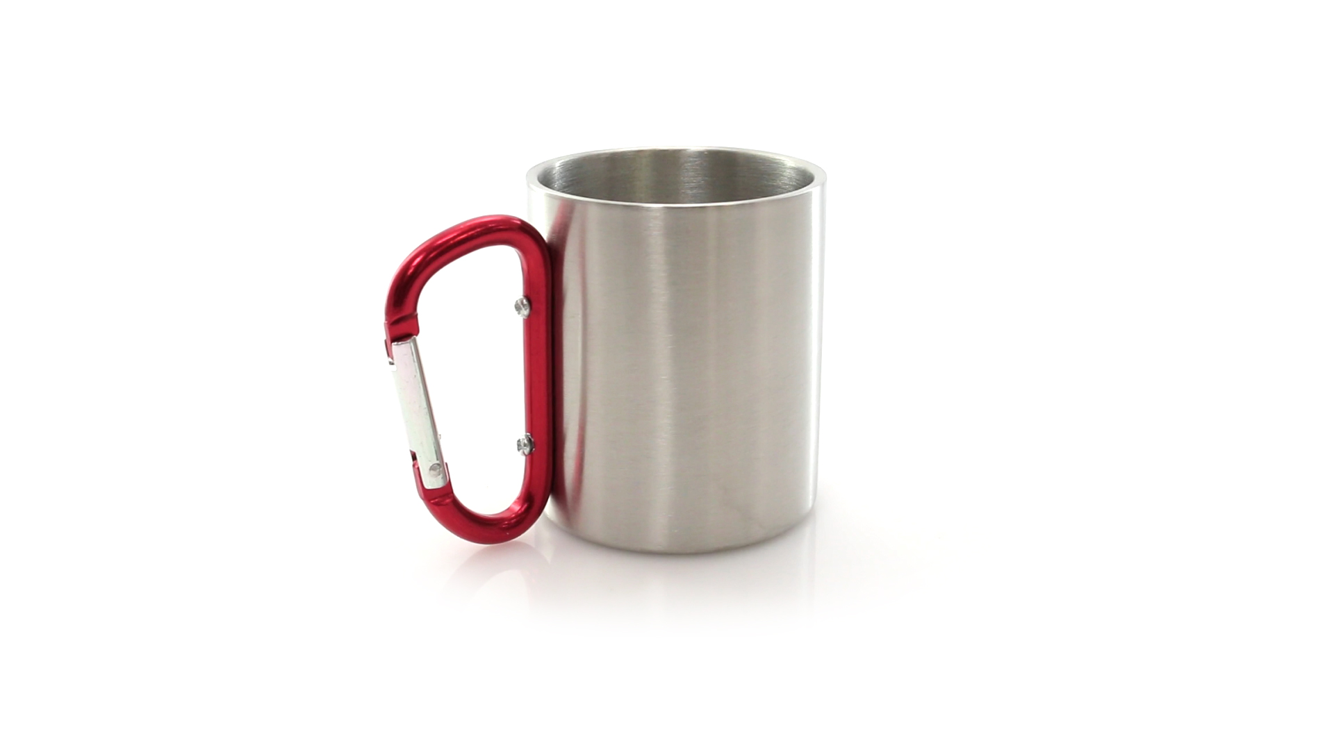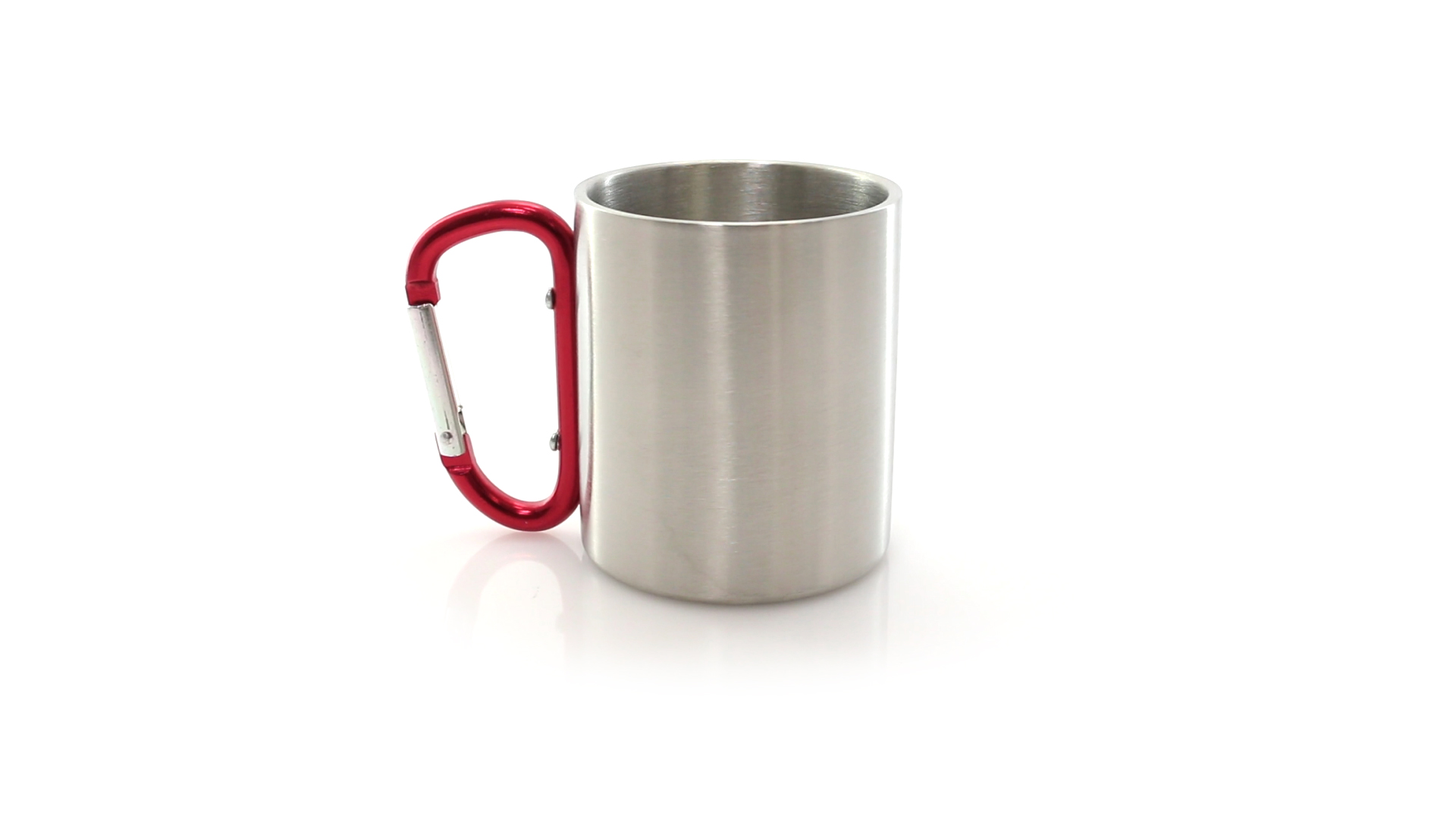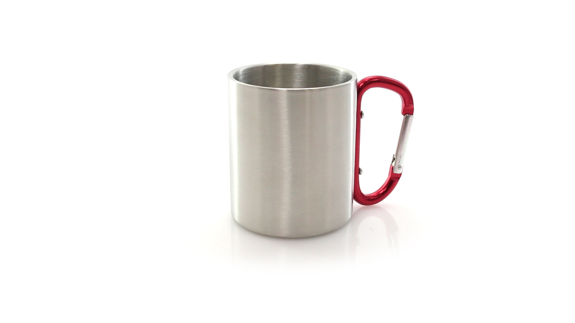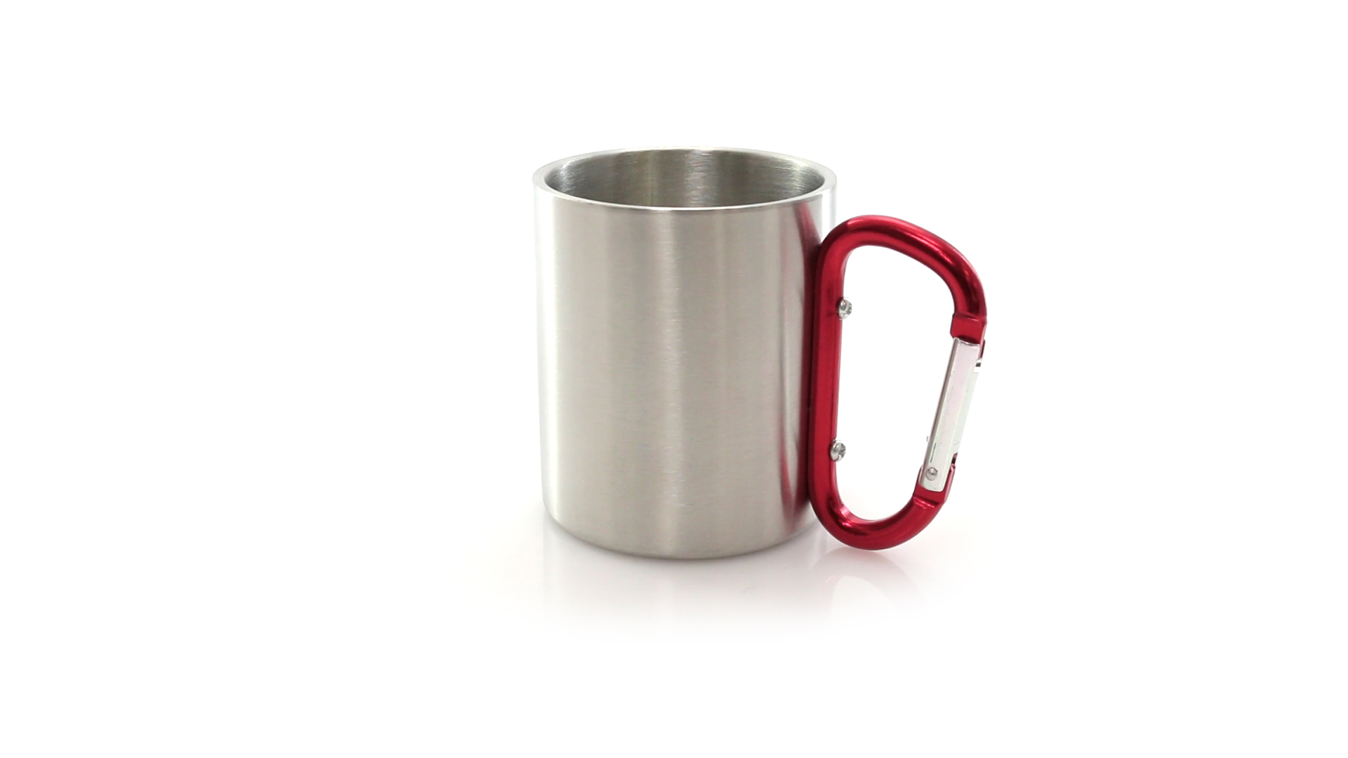Edelstahlbecher mit 220 ml Fassungsvermögen mit metallisch glänzender Oberfläche und funktionellem Karabinergriff in verschiedenen Farben, der das Tragen erleichtert. Präsentiert in einer Schachtel aus Kraftkarton.