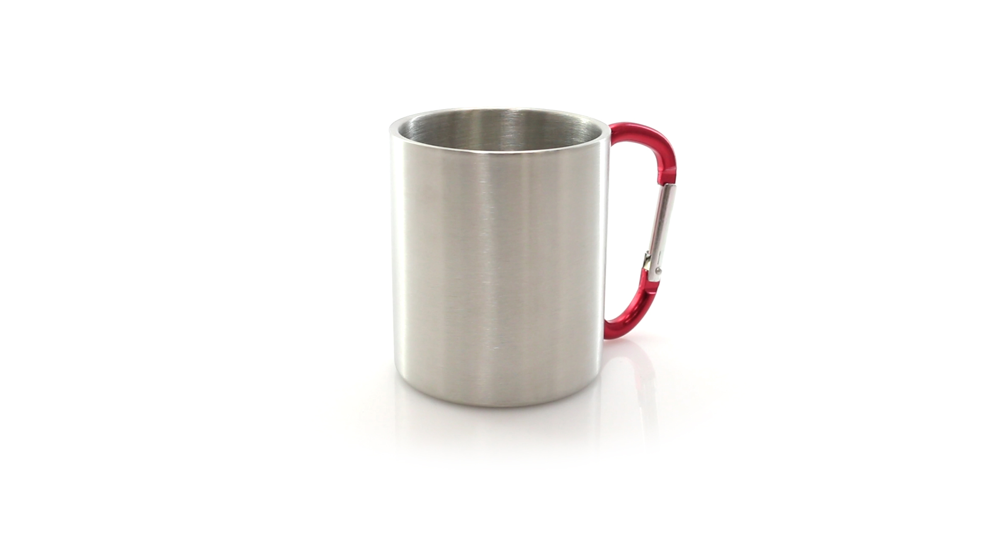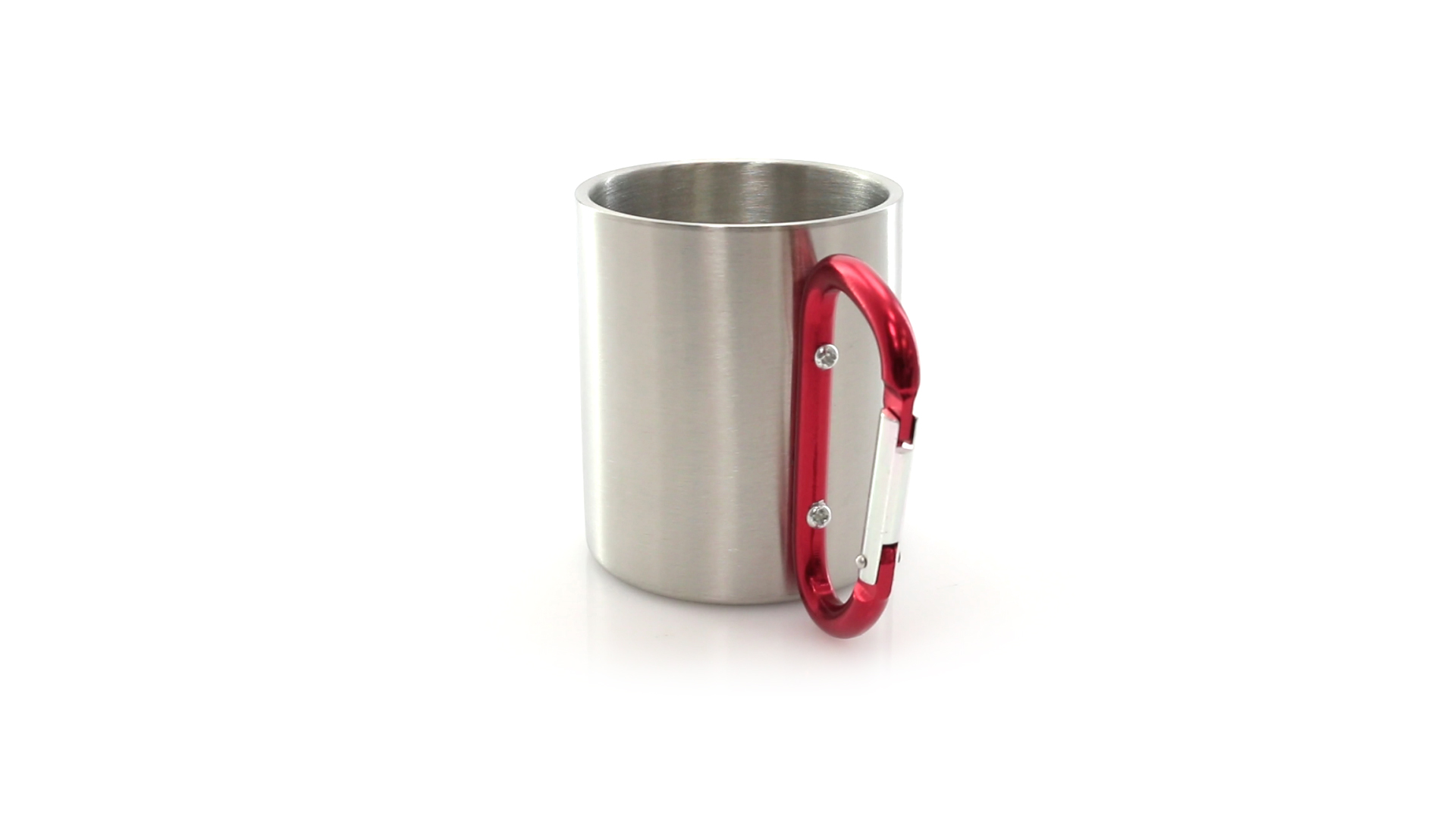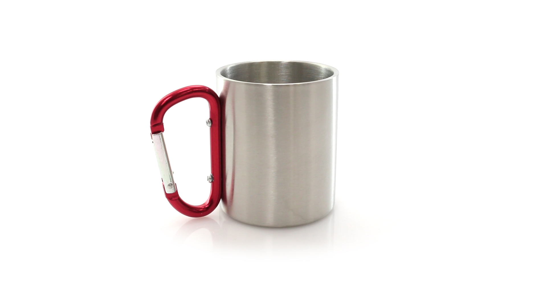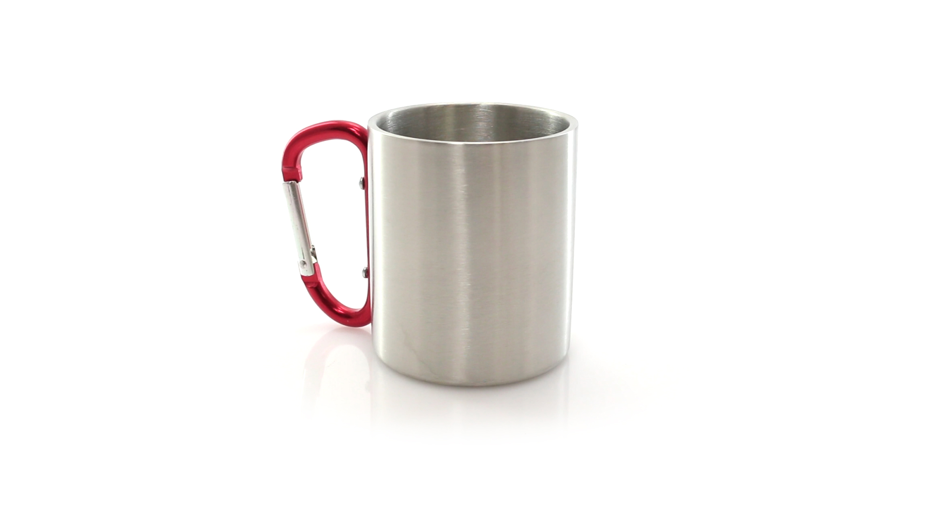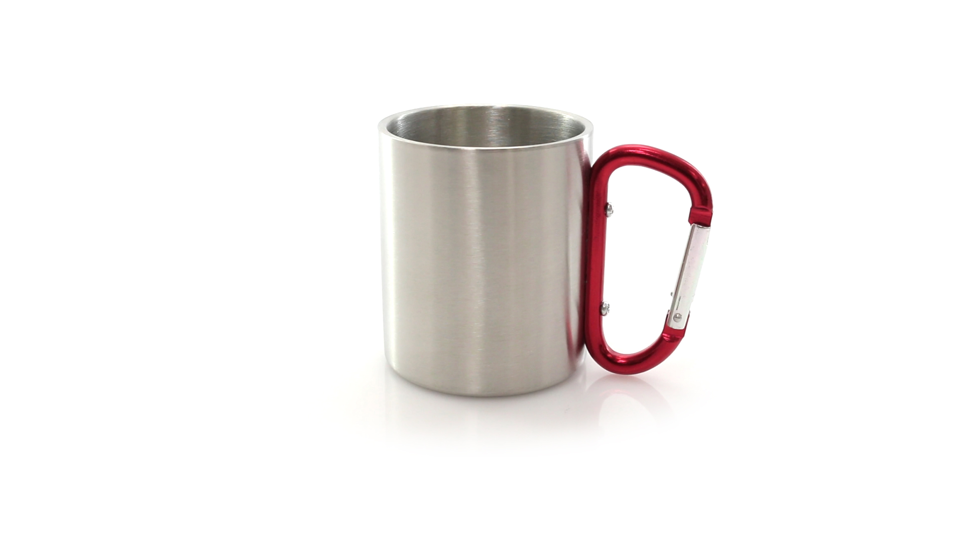 Edelstahlbecher mit 220 ml Fassungsvermögen mit metallisch glänzender Oberfläche und funktionellem Karabinergriff in verschiedenen Farben, der das Tragen erleichtert. Präsentiert in einer Schachtel aus Kraftkarton.