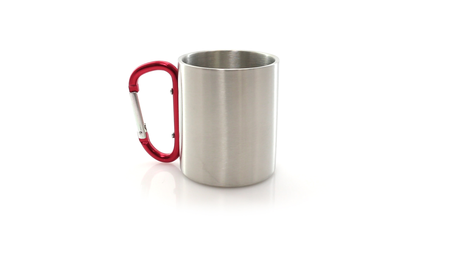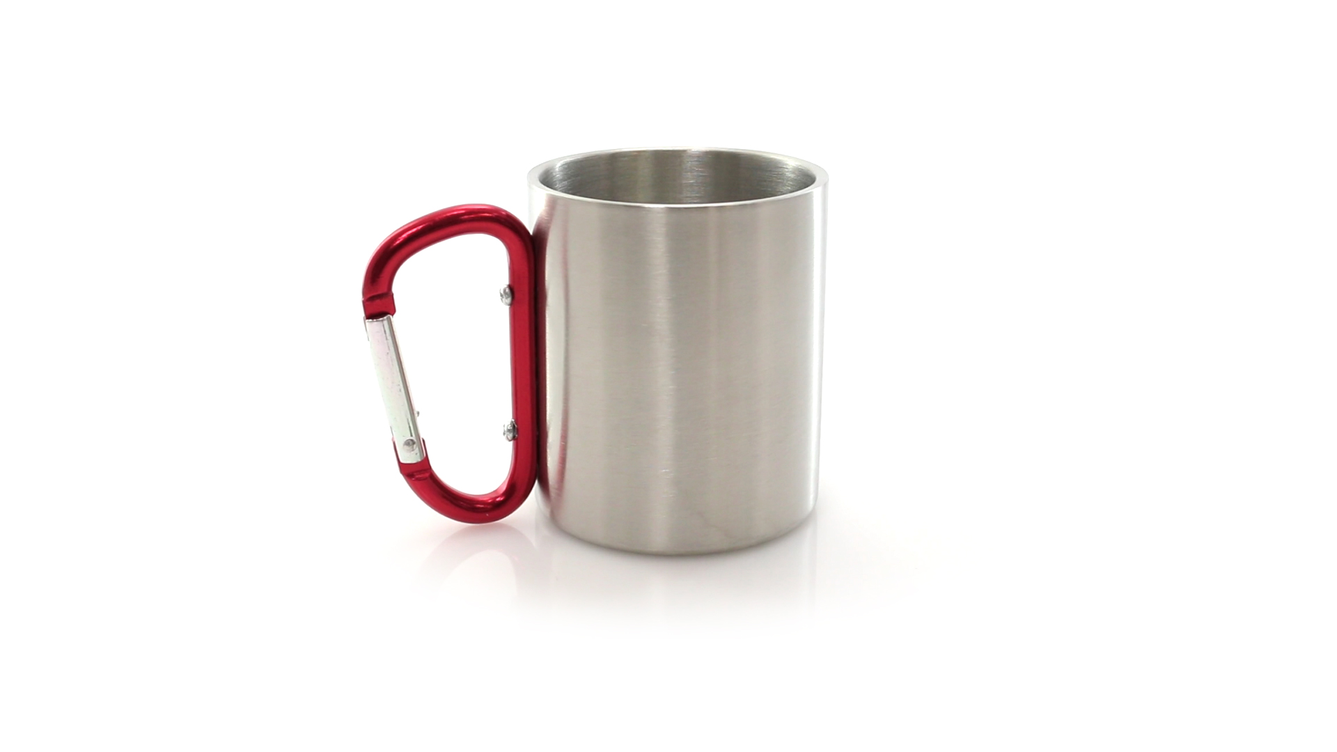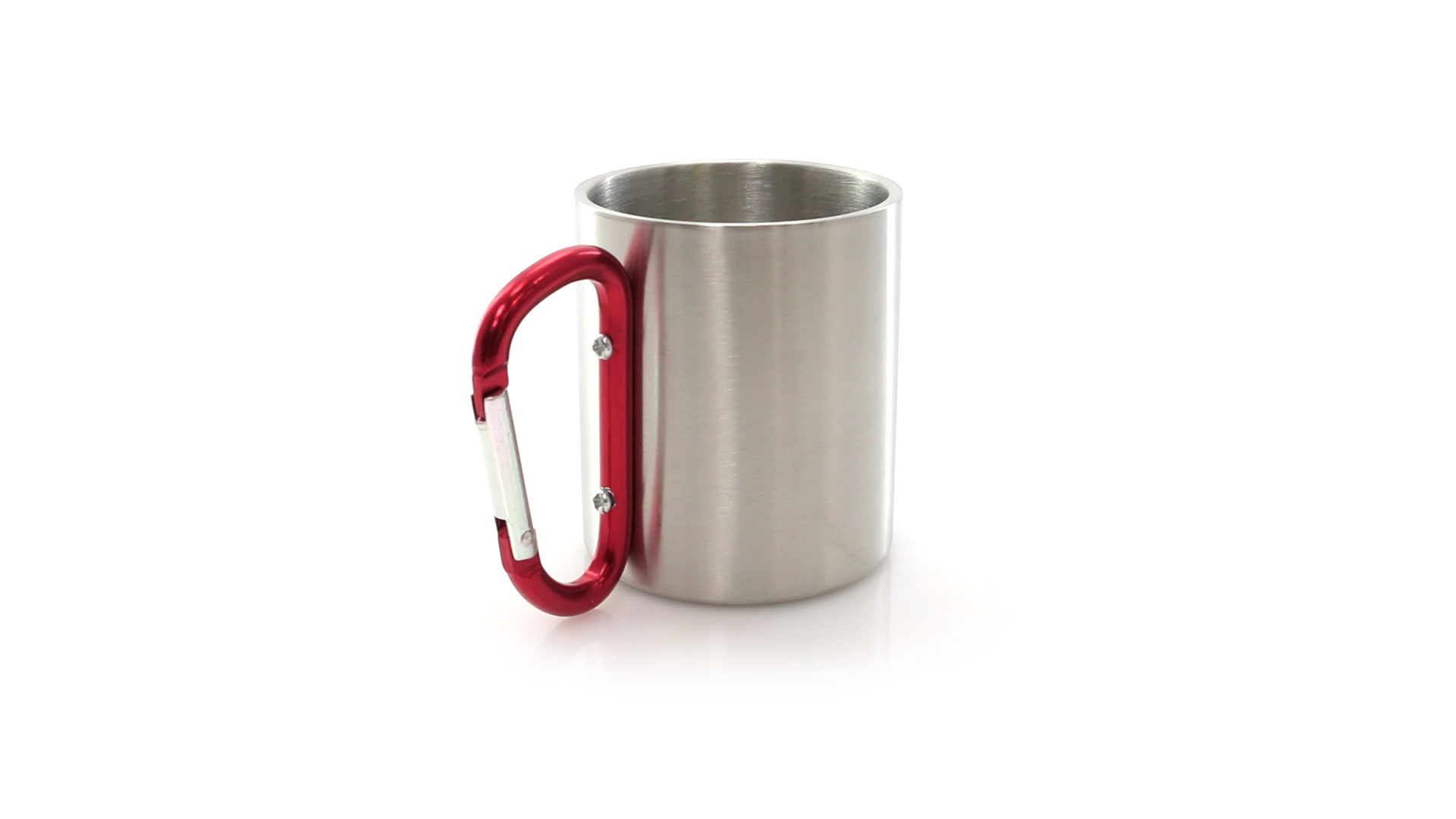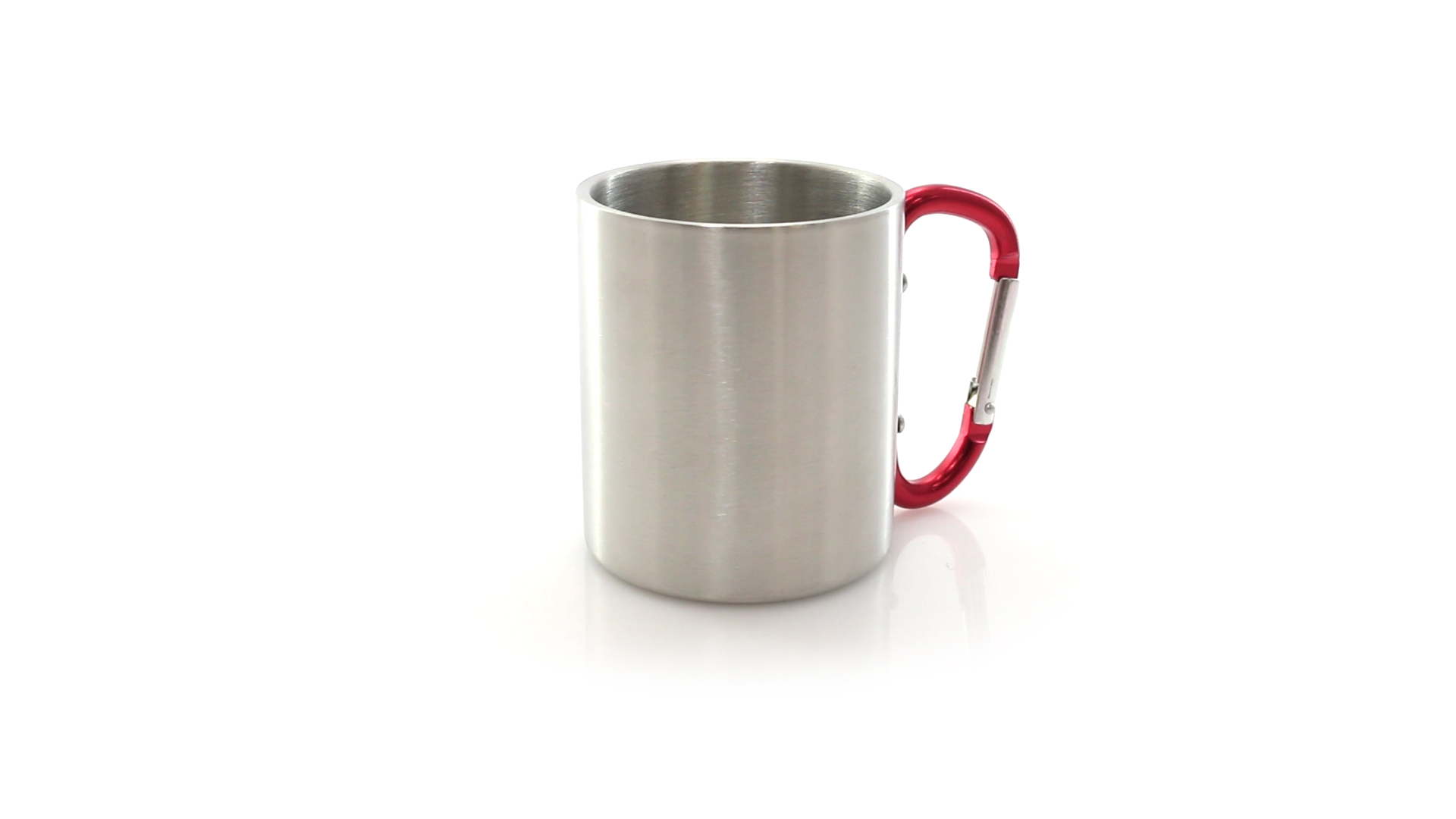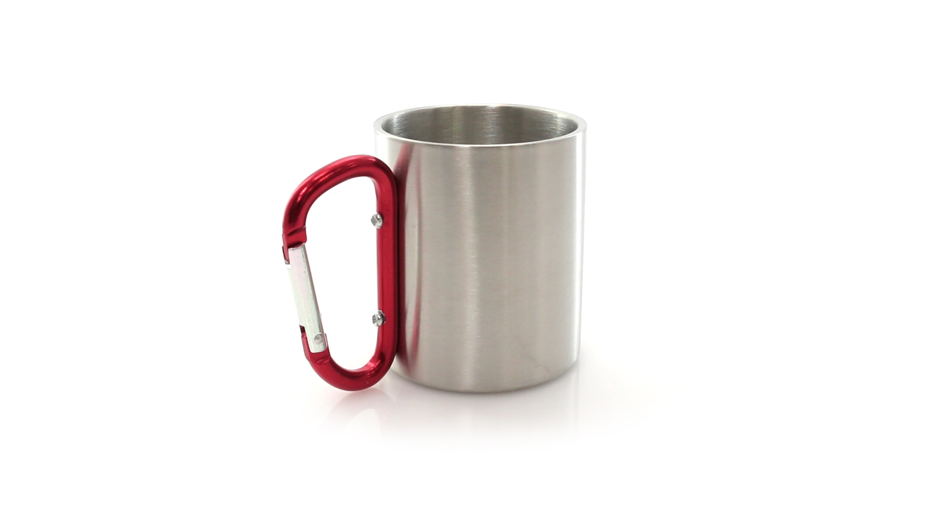 Edelstahlbecher mit 220 ml Fassungsvermögen mit metallisch glänzender Oberfläche und funktionellem Karabinergriff in verschiedenen Farben, der das Tragen erleichtert. Präsentiert in einer Schachtel aus Kraftkarton.