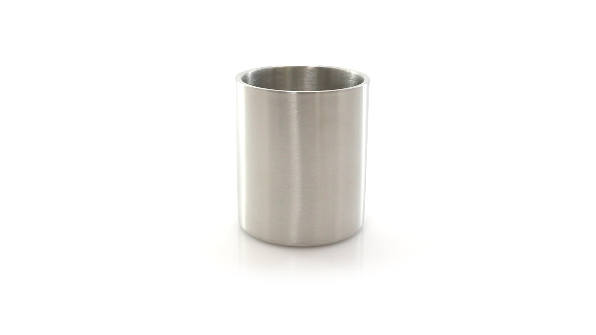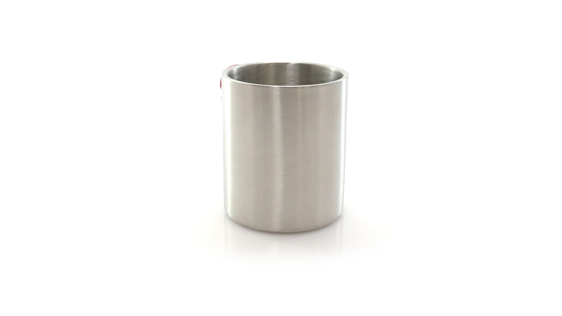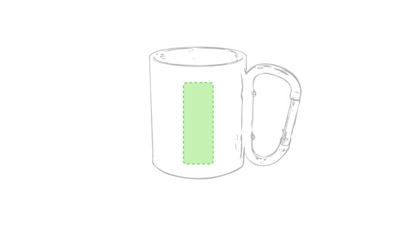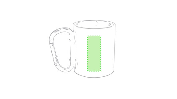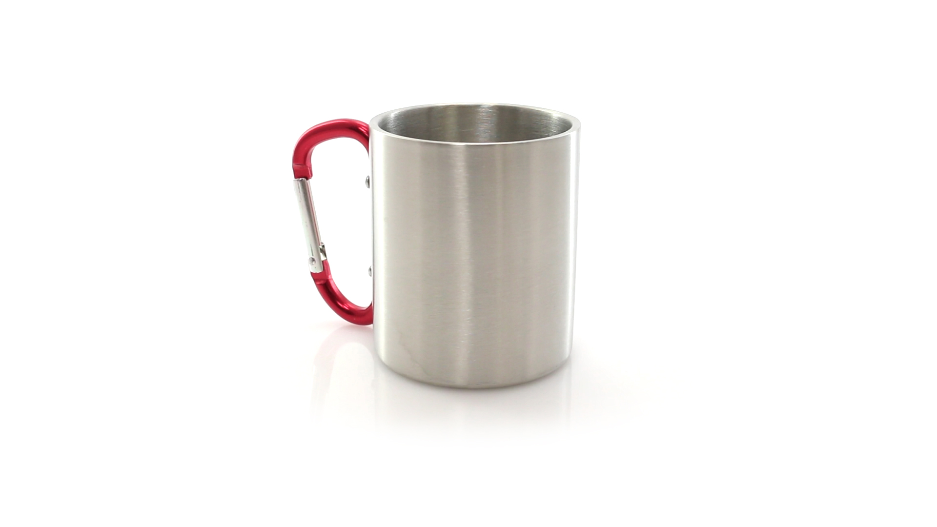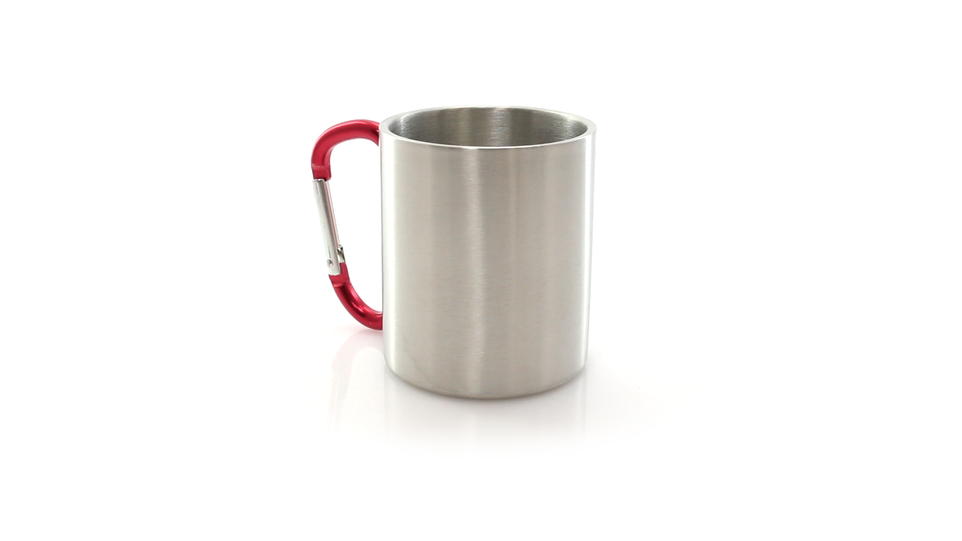 Edelstahlbecher mit 220 ml Fassungsvermögen mit metallisch glänzender Oberfläche und funktionellem Karabinergriff in verschiedenen Farben, der das Tragen erleichtert. Präsentiert in einer Schachtel aus Kraftkarton.