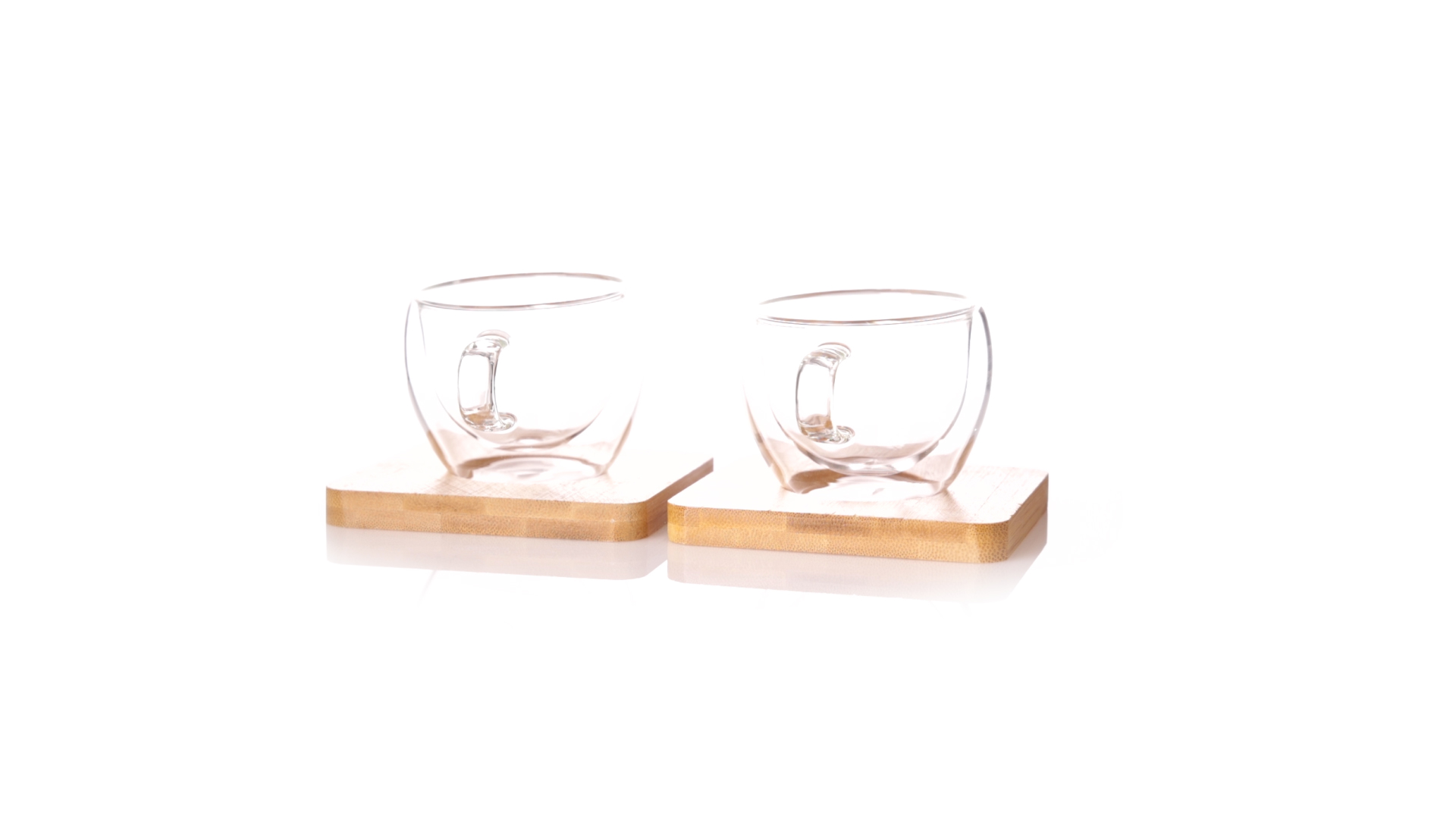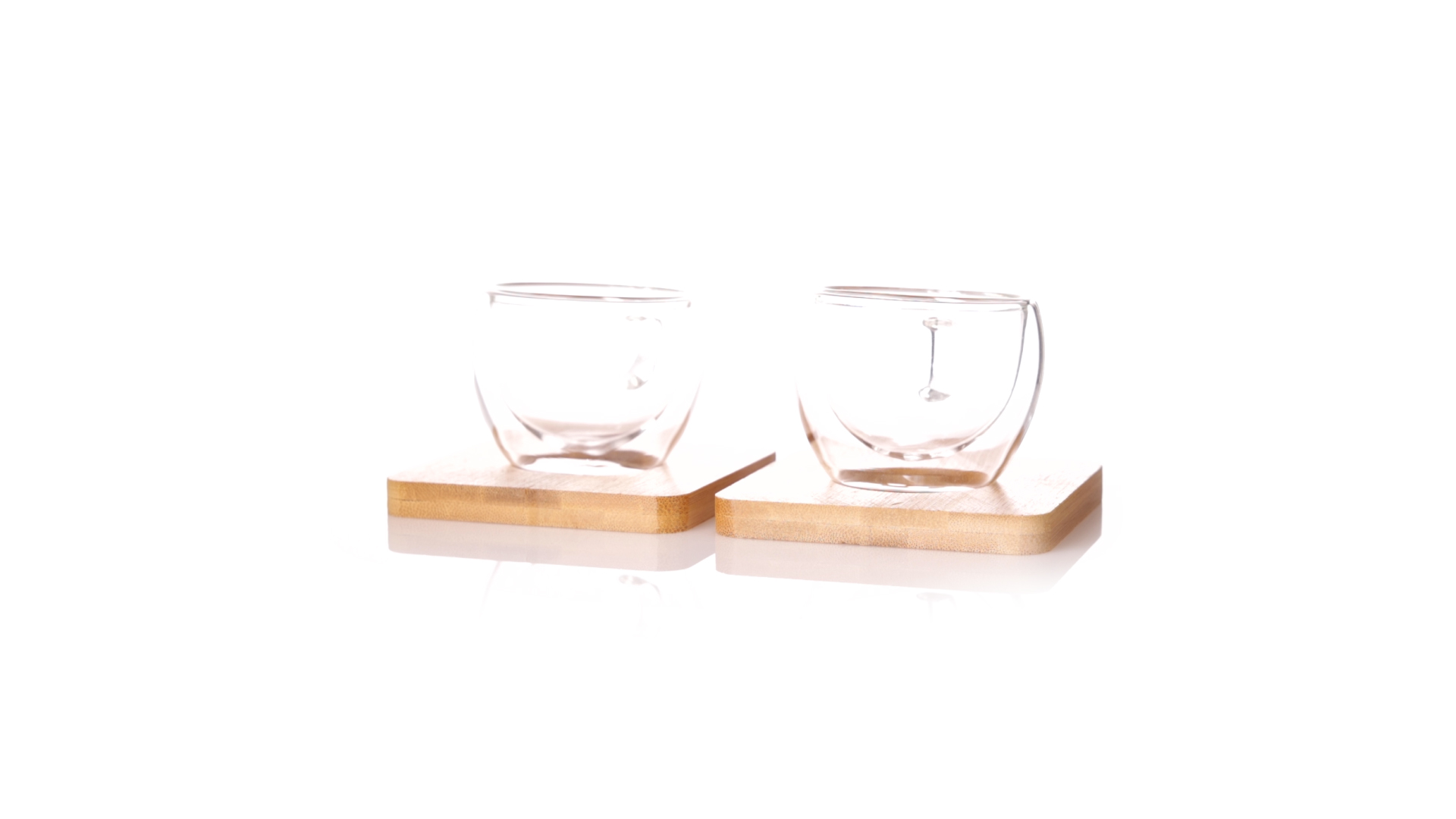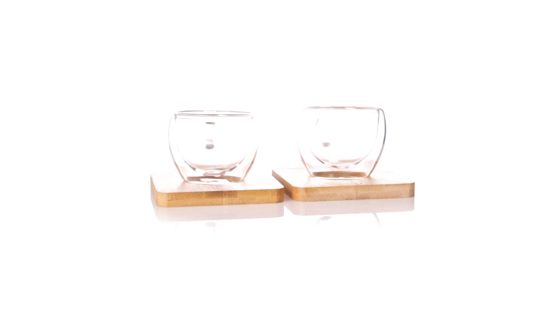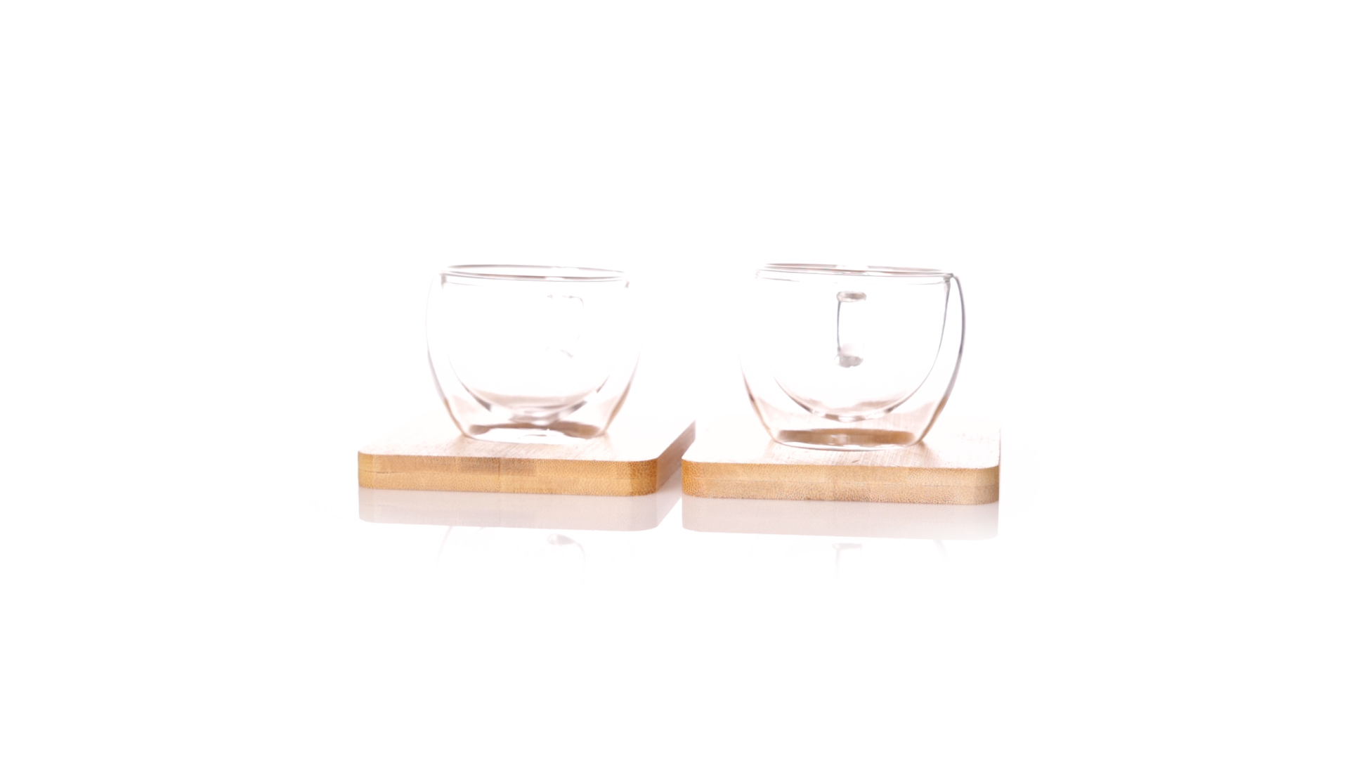 Set aus 2 doppelwandigen Bechern mit einem Fassungsvermögen von 60 ml. Hergestellt aus Borosilikatglas, das eine aussergewöhnliche Festigkeit und Haltbarkeit bietet, seine Lebensdauer verlängert und unzählige Male wiederverwendet werden kann. Inklusive 2 Untersetzer aus Bambus, die mit einer Stanzung im Boden versehen sind, damit sie perfekt auf jede Tasse passen. Das Set wird in einem Design-Etui aus Kraftkarton präsentiert, das für jede Tasse ein eigenes Fach enthält.Gebrauchsanweisung in Englisch und Spanisch erhältlich.