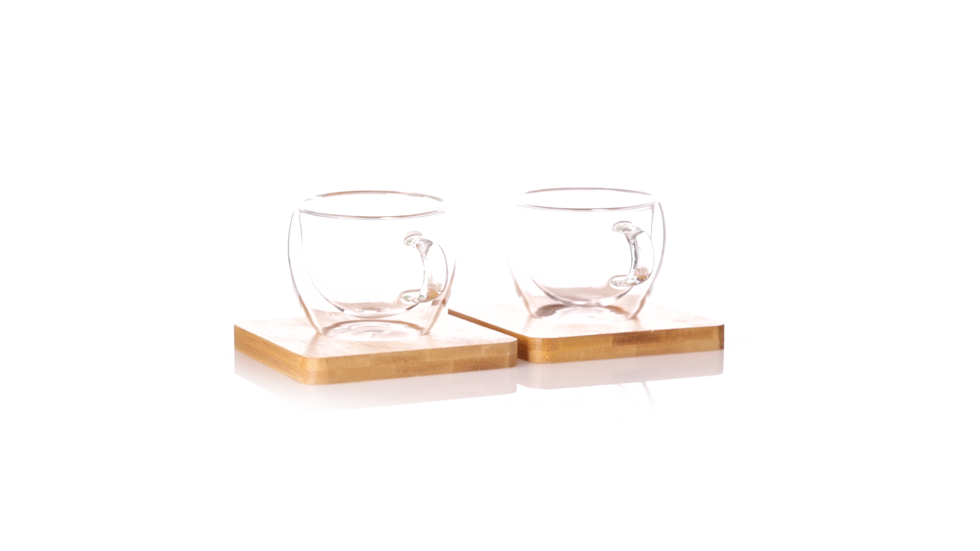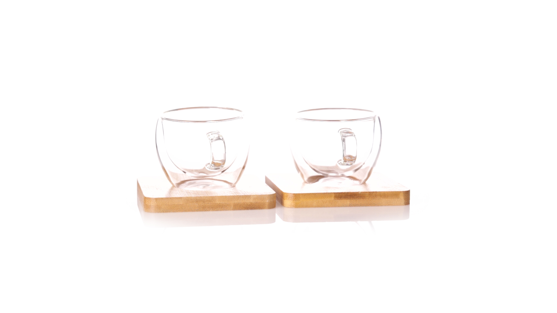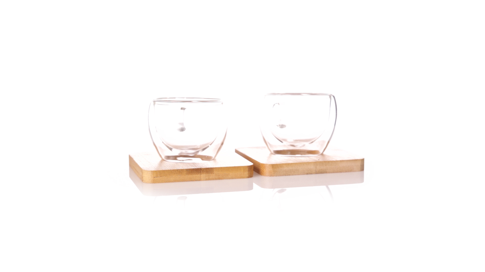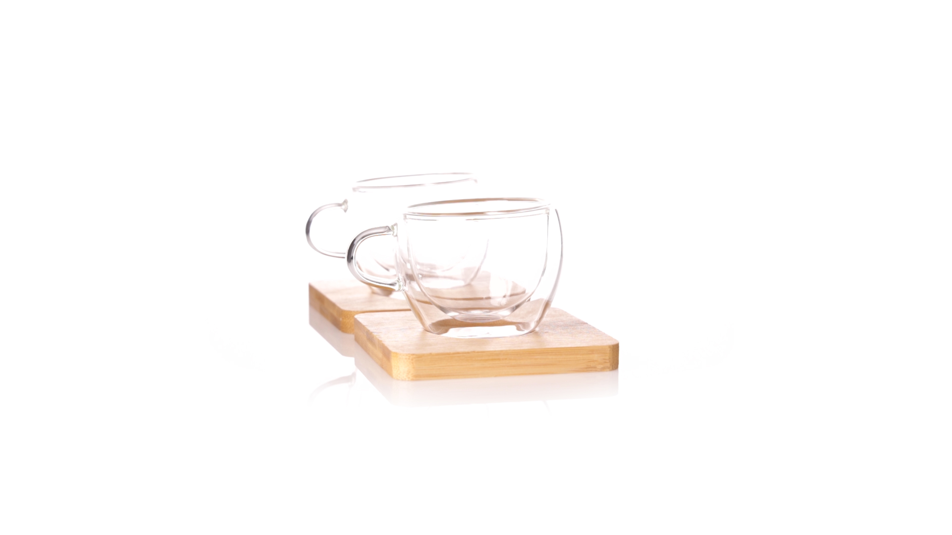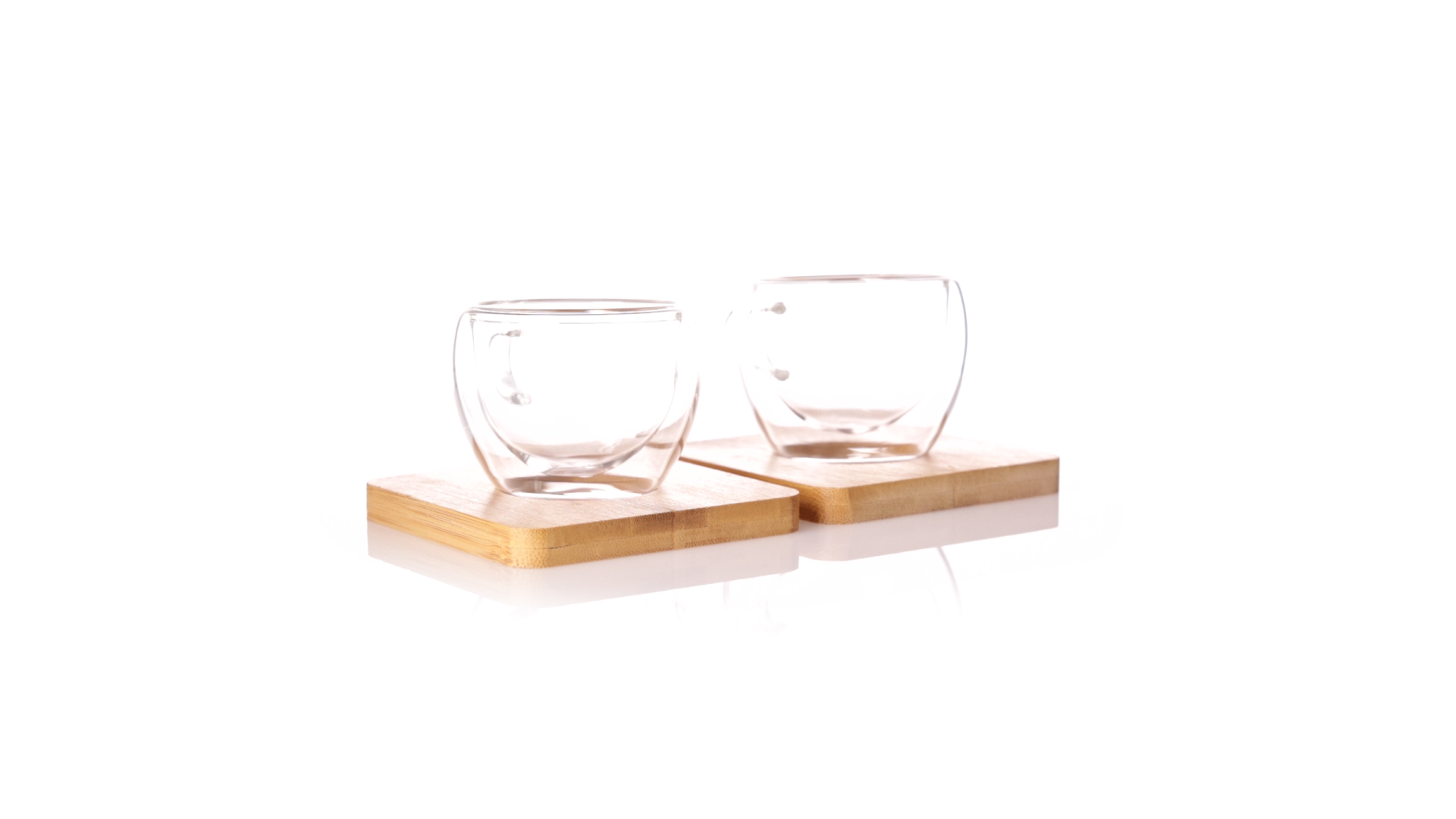 Set aus 2 doppelwandigen Bechern mit einem Fassungsvermögen von 60 ml. Hergestellt aus Borosilikatglas, das eine aussergewöhnliche Festigkeit und Haltbarkeit bietet, seine Lebensdauer verlängert und unzählige Male wiederverwendet werden kann. Inklusive 2 Untersetzer aus Bambus, die mit einer Stanzung im Boden versehen sind, damit sie perfekt auf jede Tasse passen. Das Set wird in einem Design-Etui aus Kraftkarton präsentiert, das für jede Tasse ein eigenes Fach enthält.Gebrauchsanweisung in Englisch und Spanisch erhältlich.