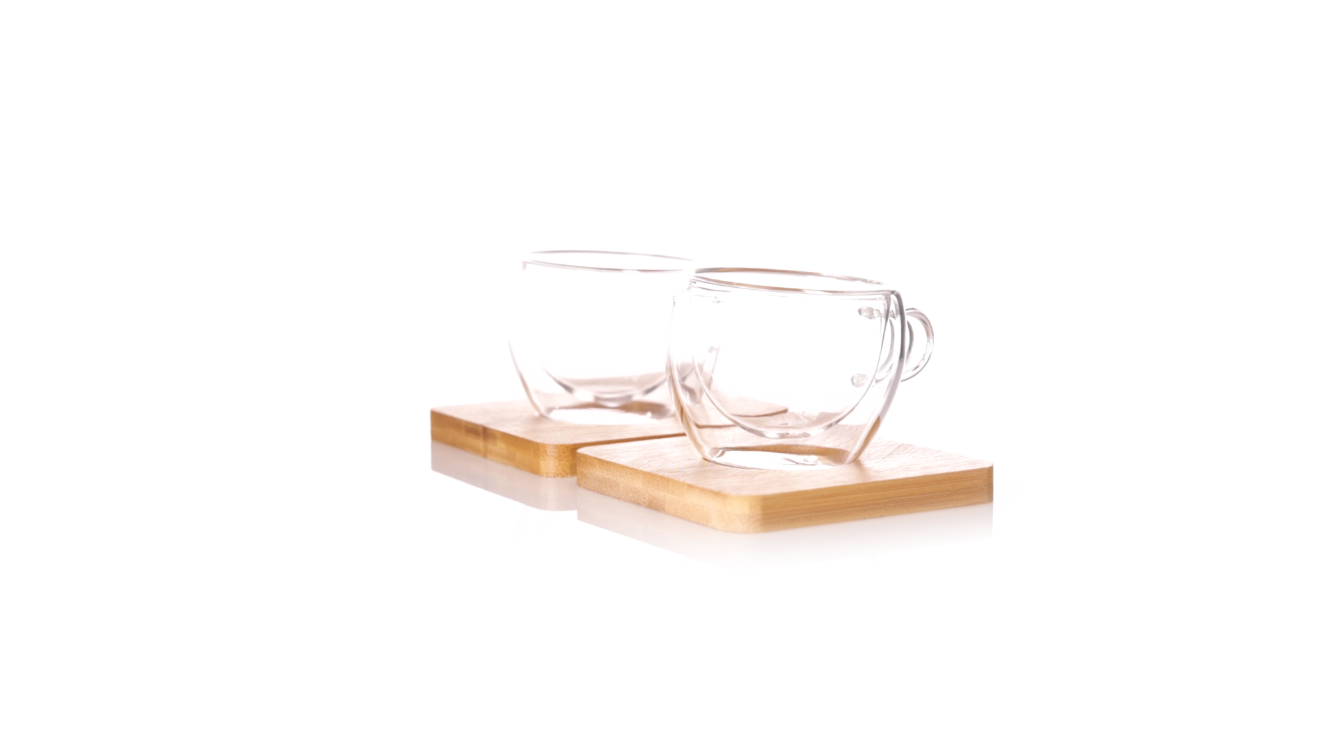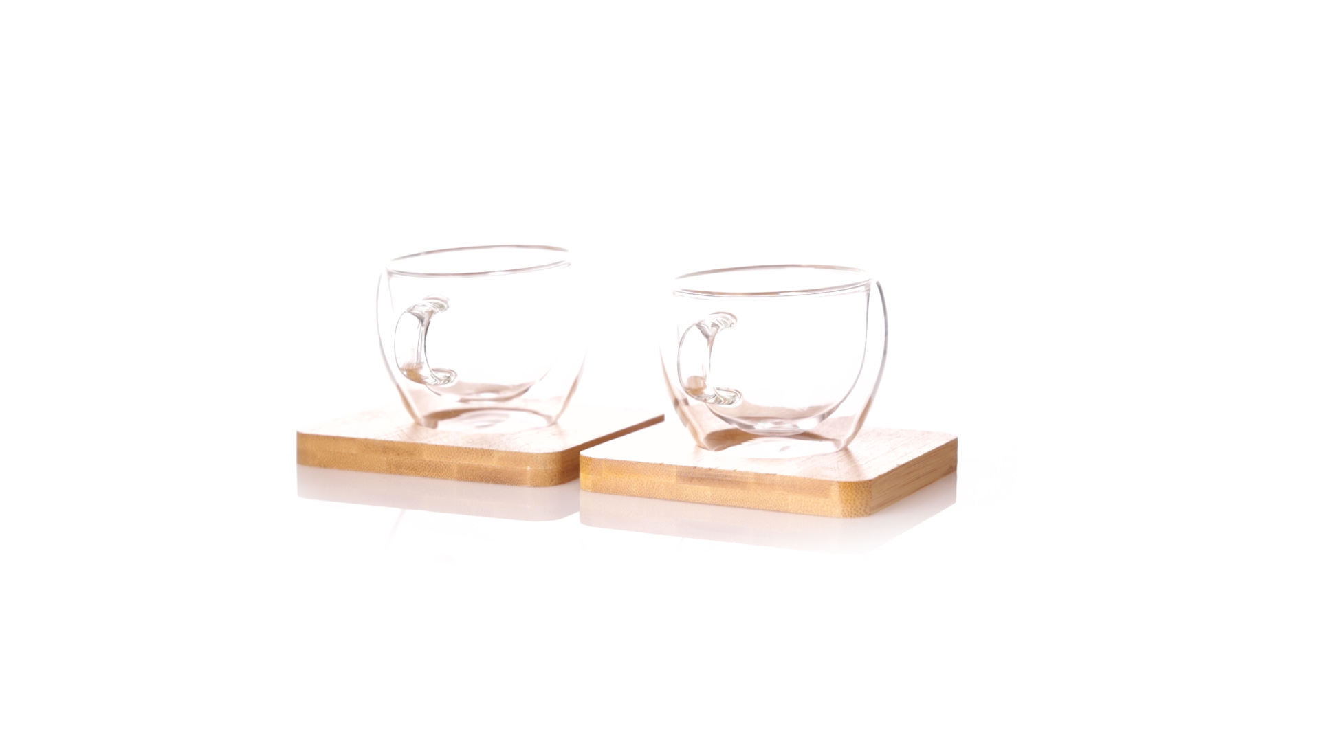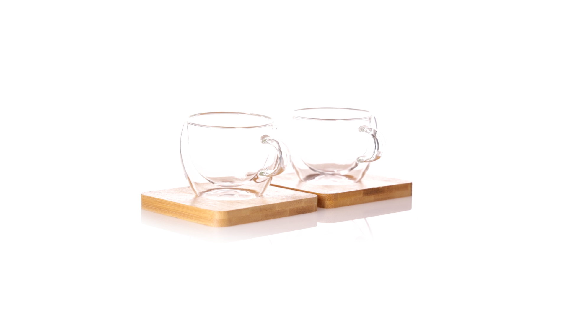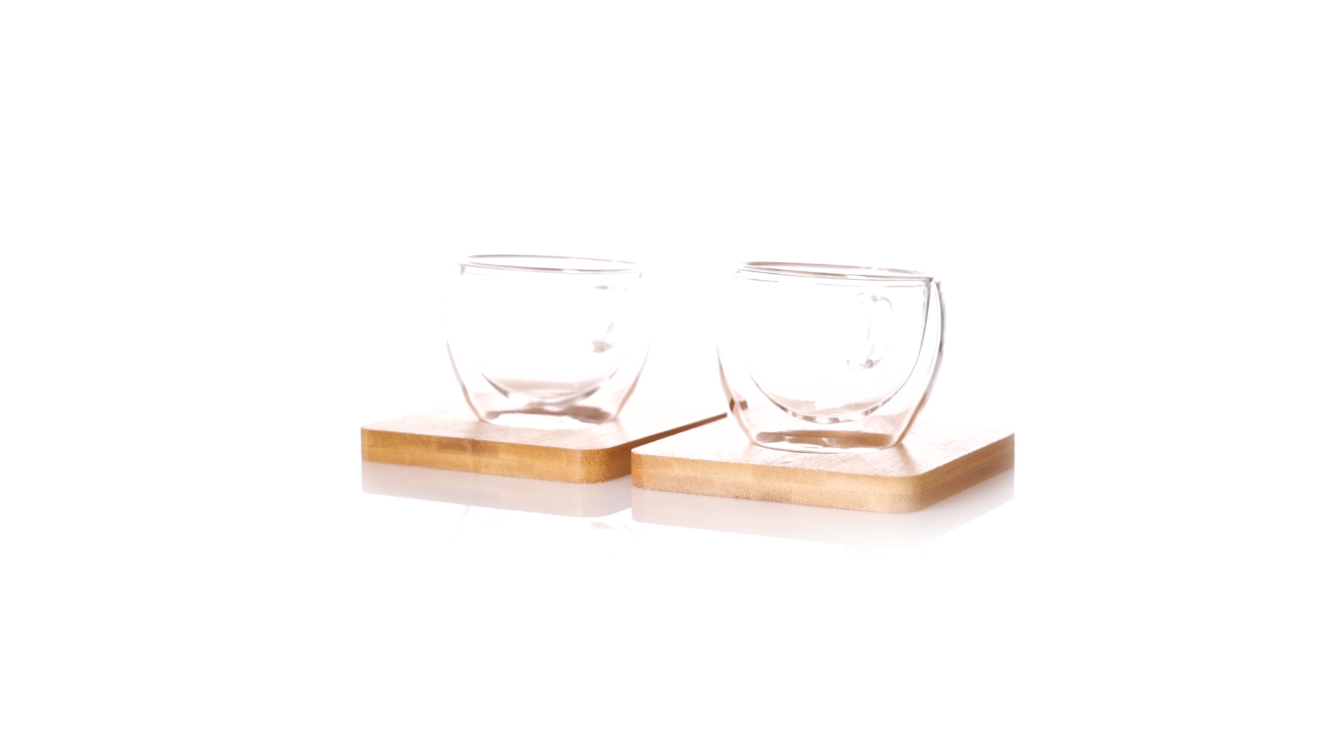 Set aus 2 doppelwandigen Bechern mit einem Fassungsvermögen von 60 ml. Hergestellt aus Borosilikatglas, das eine aussergewöhnliche Festigkeit und Haltbarkeit bietet, seine Lebensdauer verlängert und unzählige Male wiederverwendet werden kann. Inklusive 2 Untersetzer aus Bambus, die mit einer Stanzung im Boden versehen sind, damit sie perfekt auf jede Tasse passen. Das Set wird in einem Design-Etui aus Kraftkarton präsentiert, das für jede Tasse ein eigenes Fach enthält.Gebrauchsanweisung in Englisch und Spanisch erhältlich.