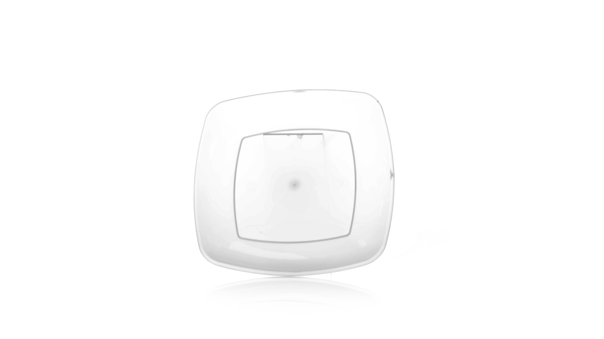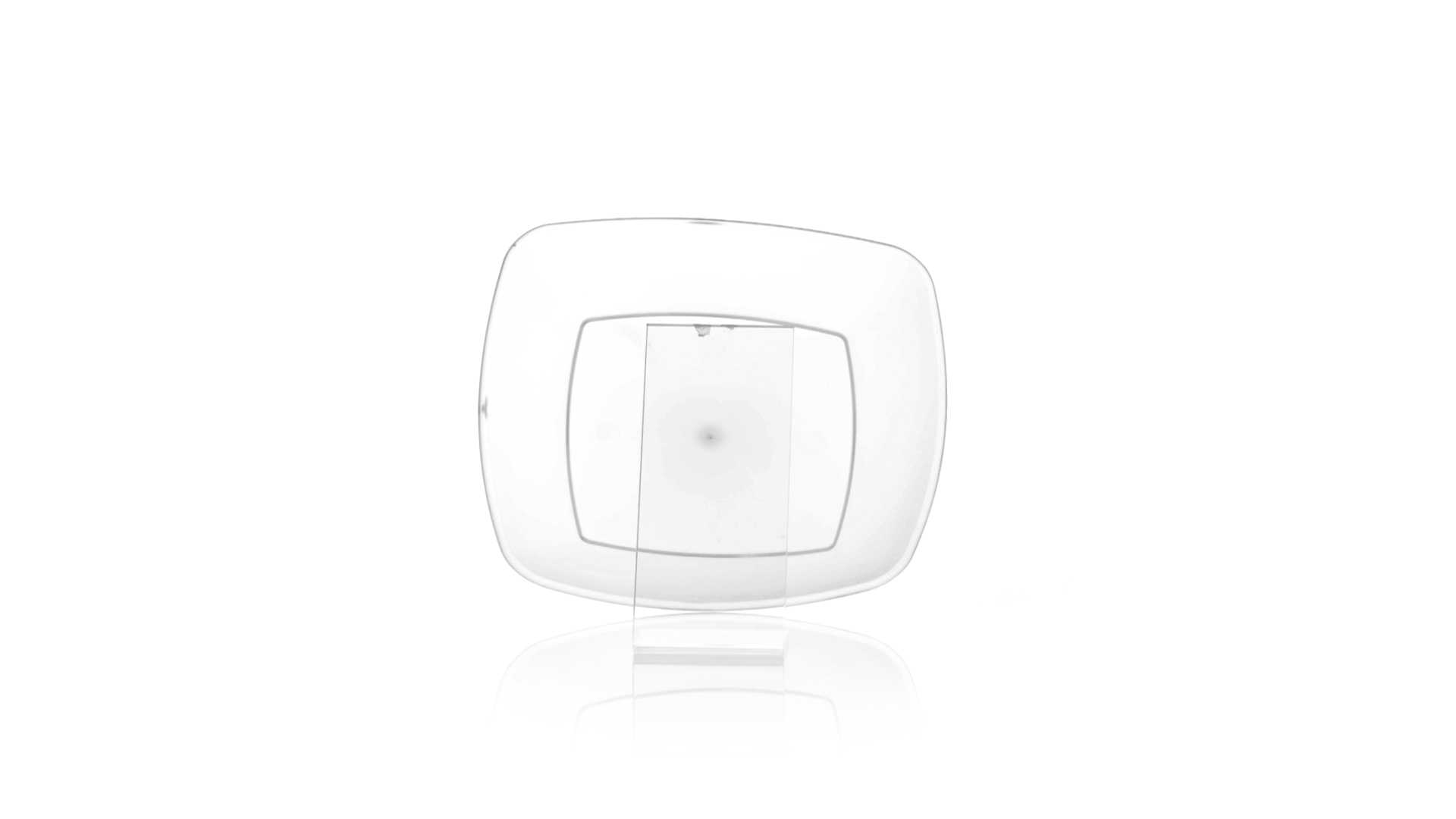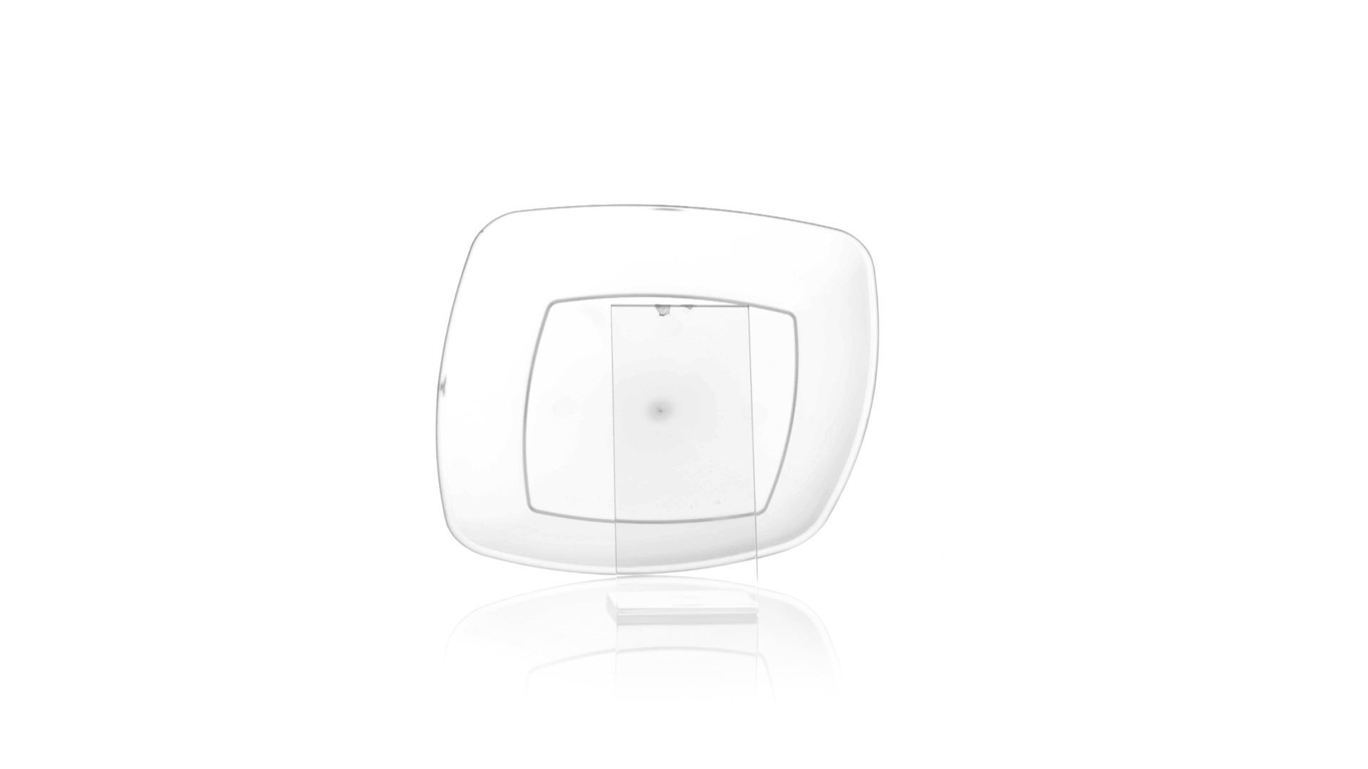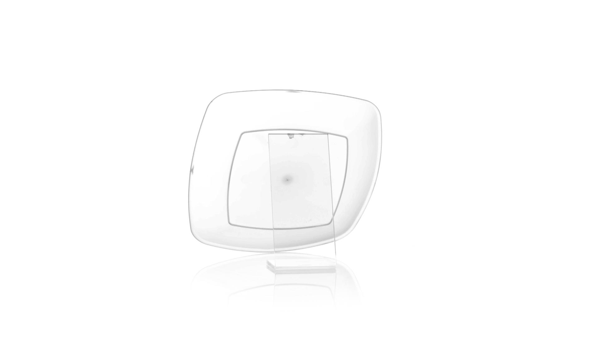 Flache Schale aus starkem und flexiblem PP-Material. Quadratische Form, wiederverwendbar und in durchsichtiger Ausführung.