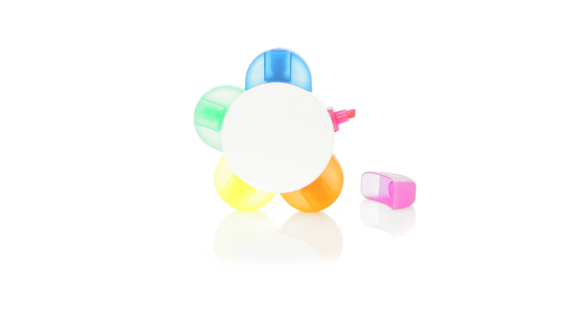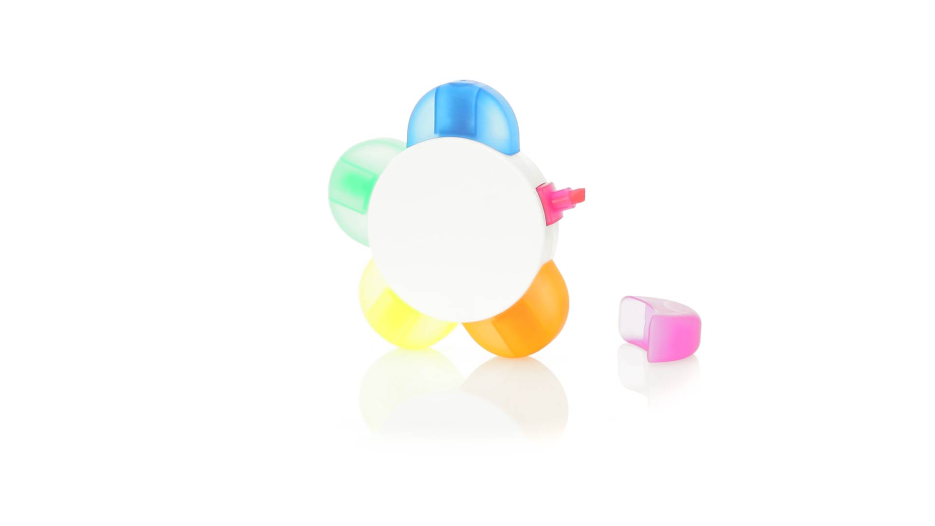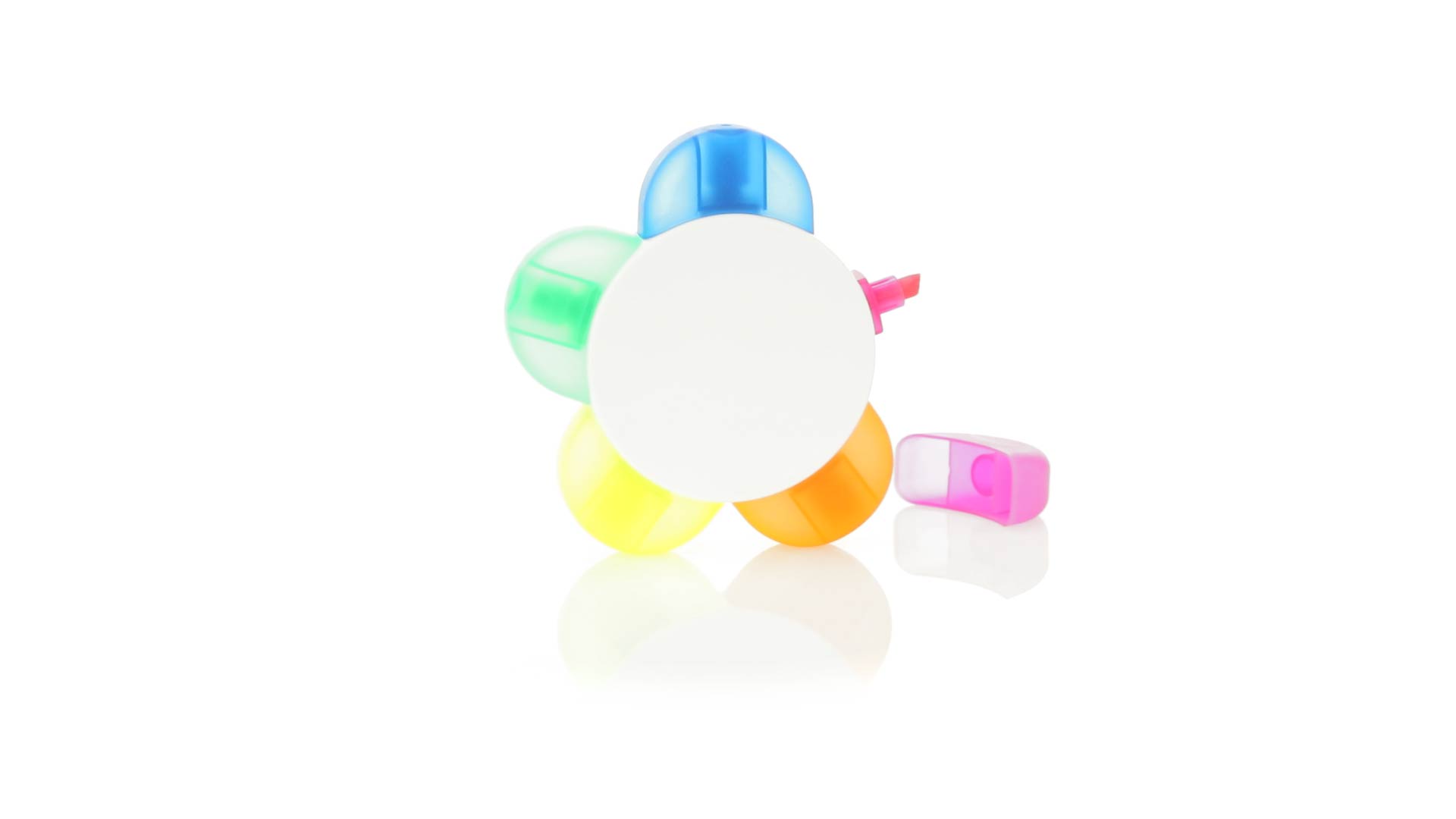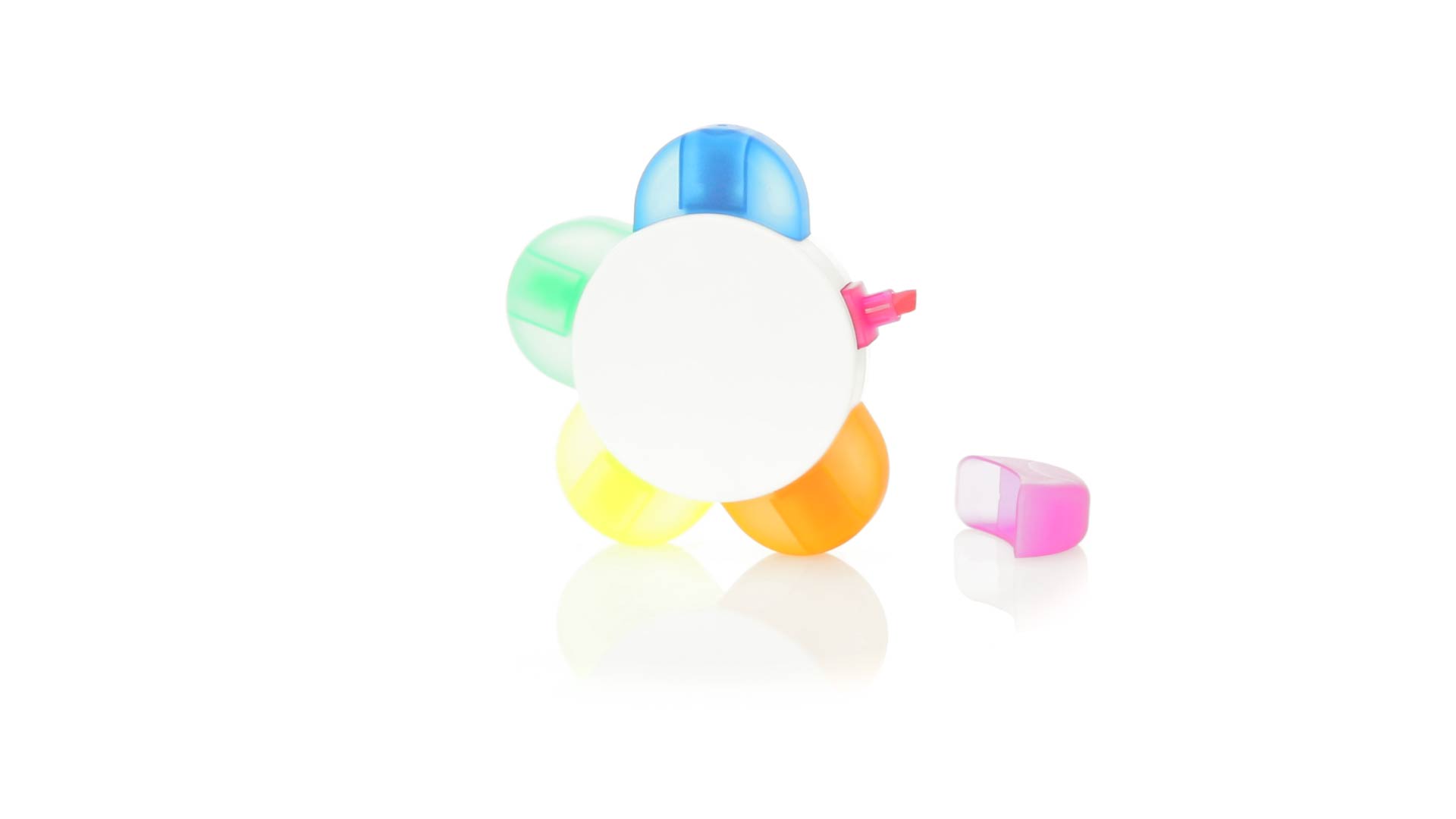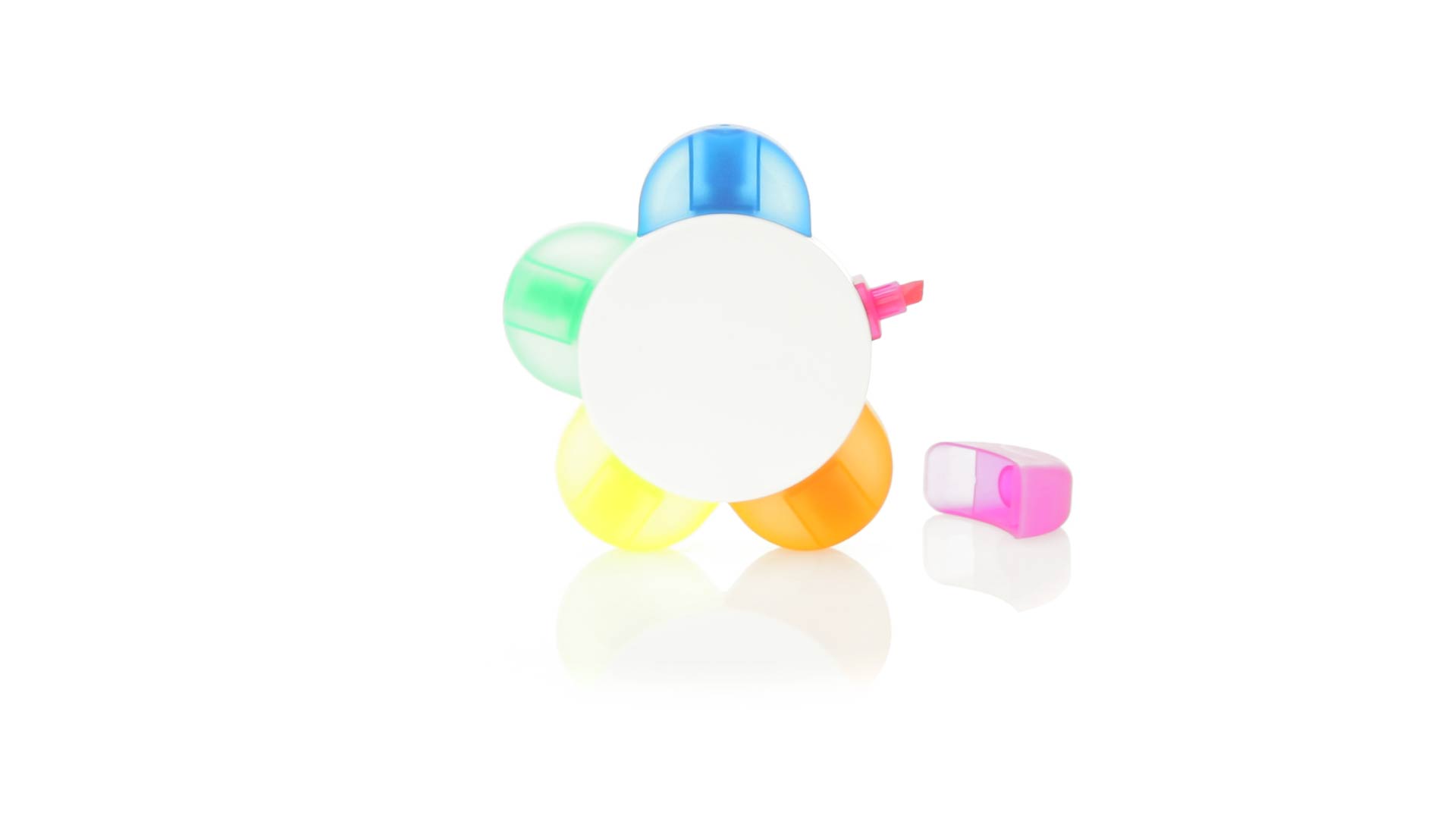 Satz von Markern im auffälligen Blumendesign. Mit grosser Druckfläche und Markern in den Farben Orange, Blau, Grün, Gelb und Pink.