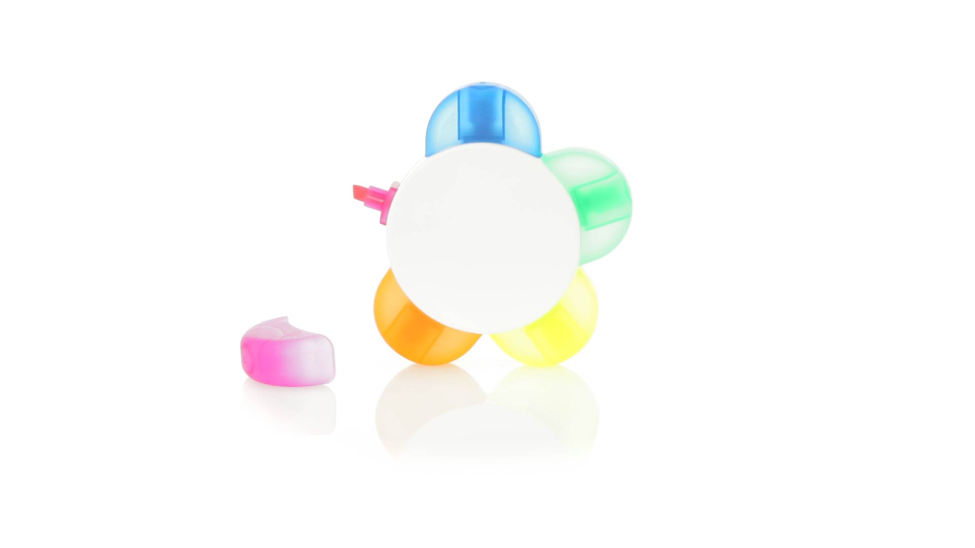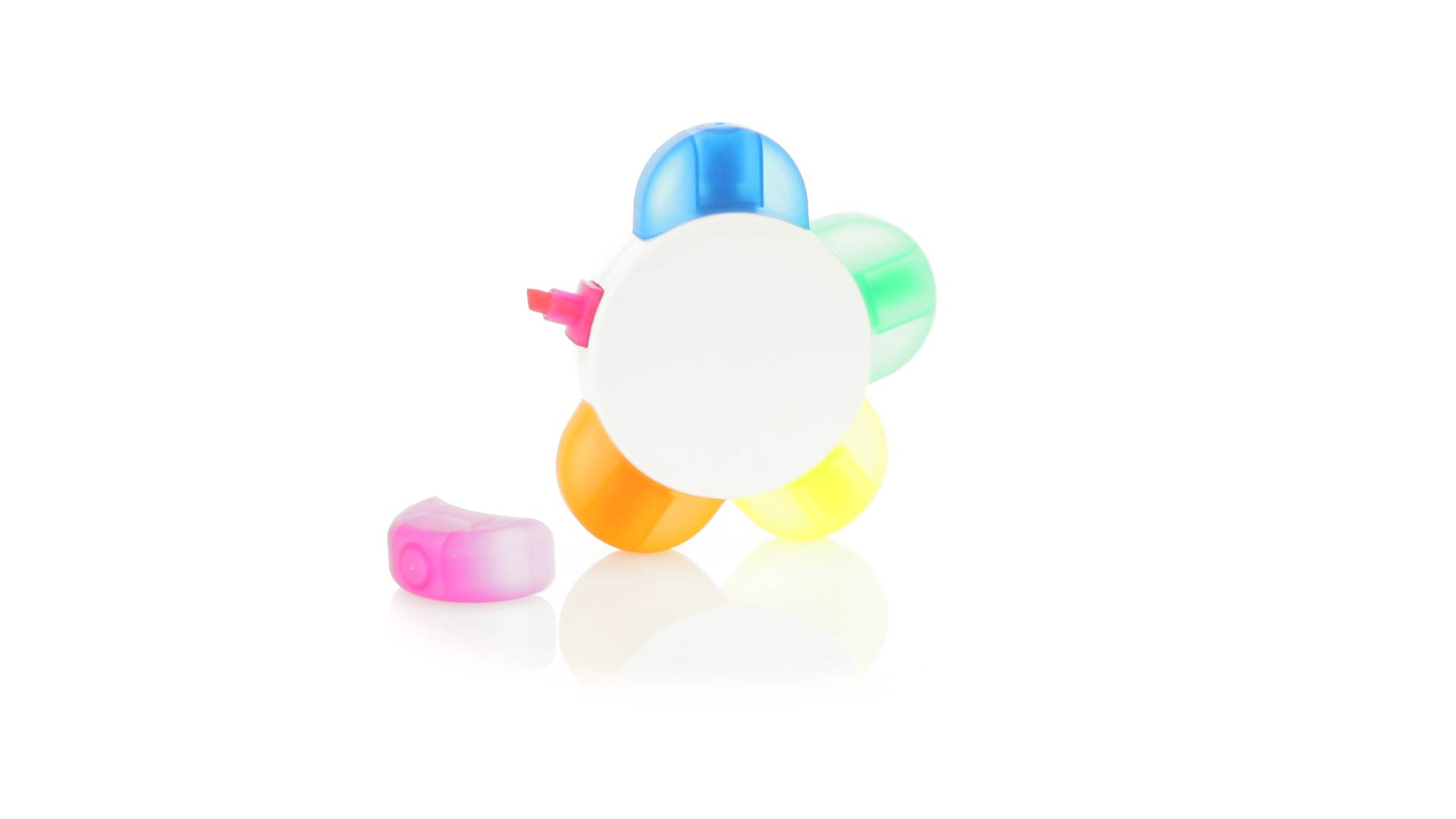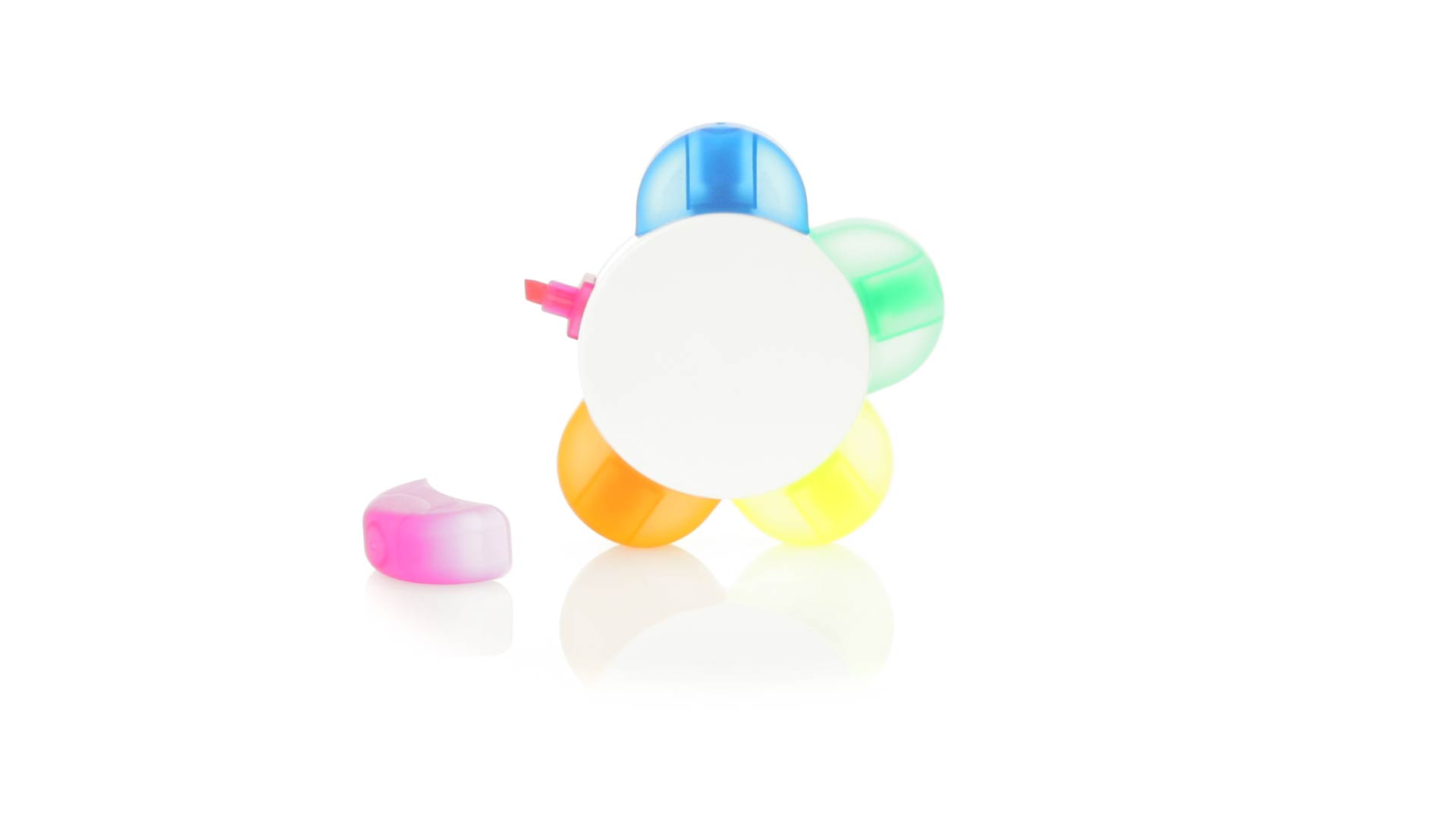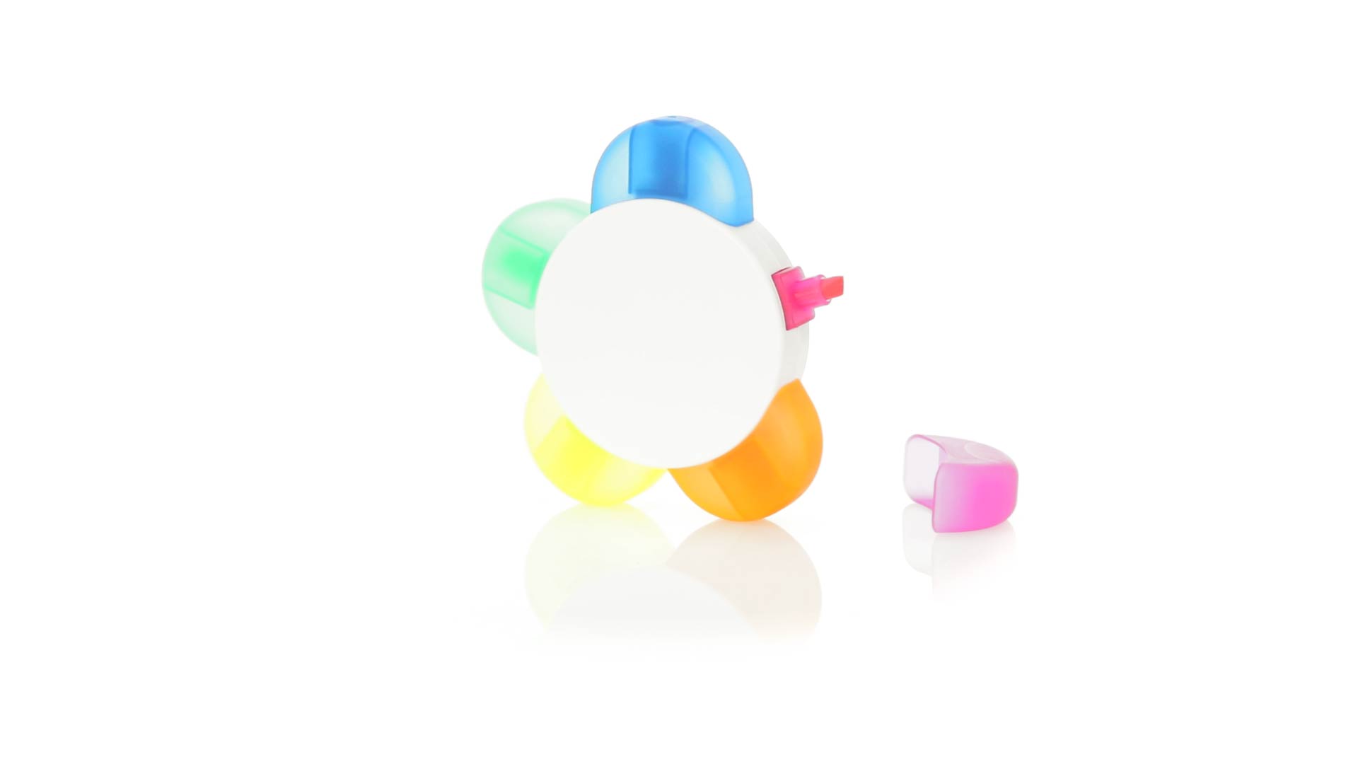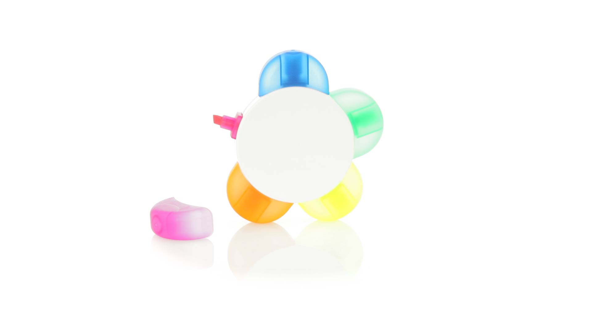 Satz von Markern im auffälligen Blumendesign. Mit grosser Druckfläche und Markern in den Farben Orange, Blau, Grün, Gelb und Pink.