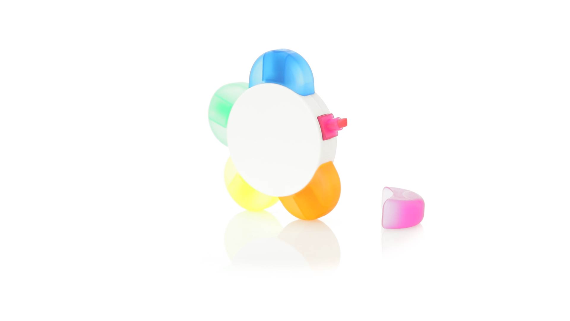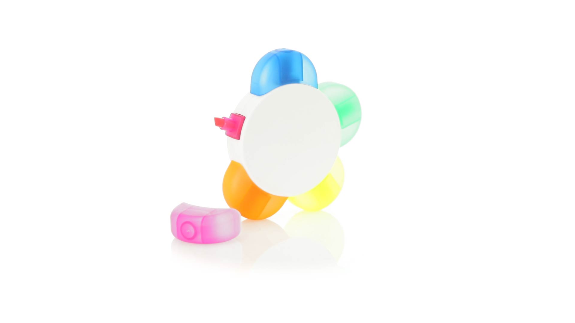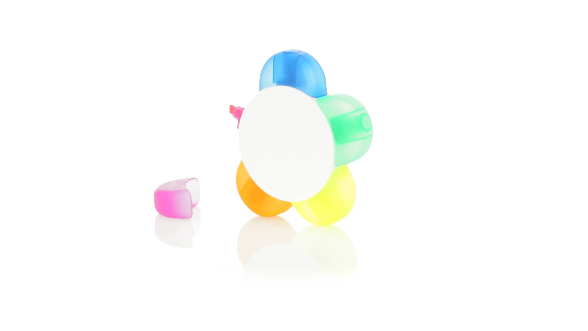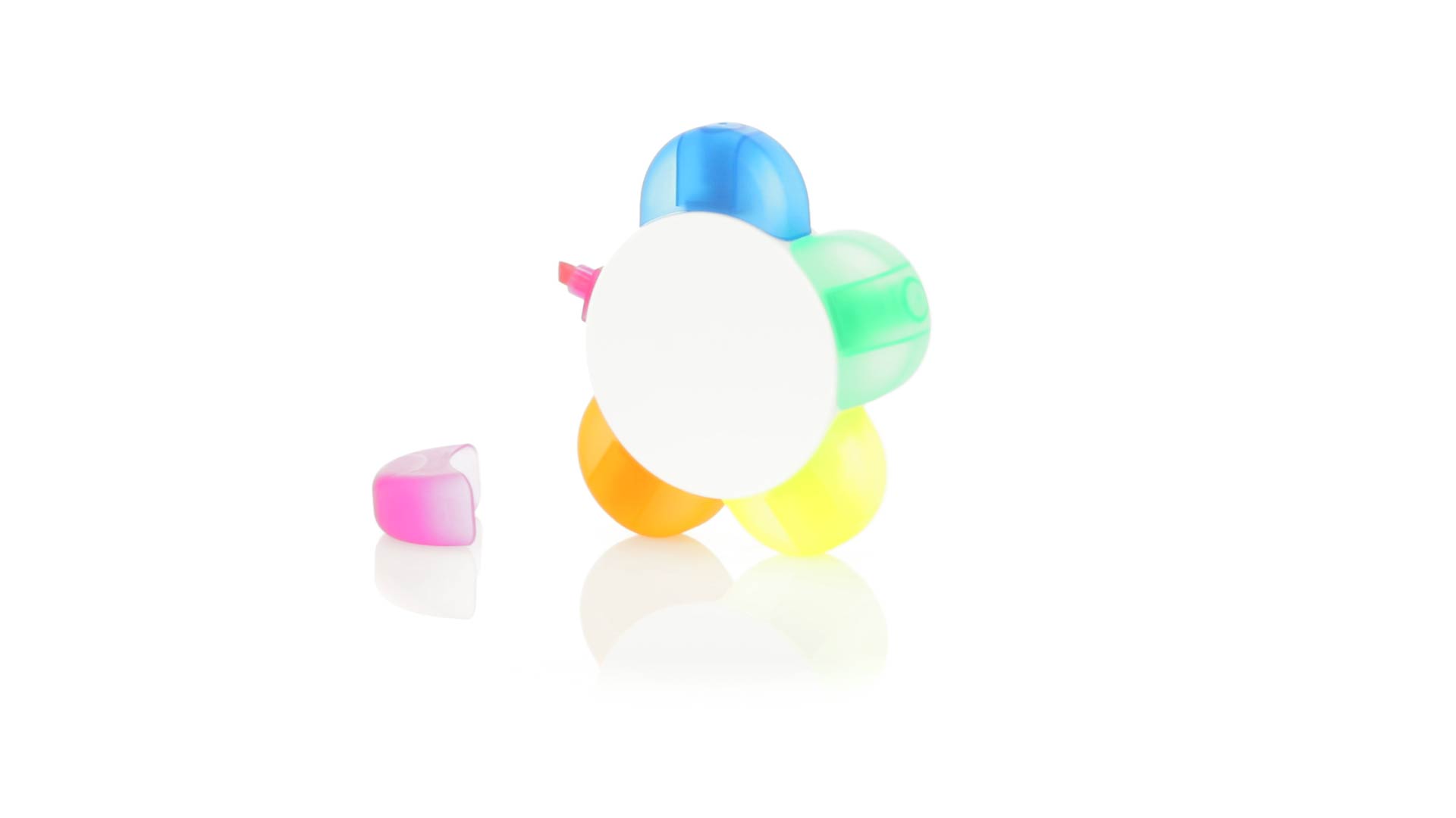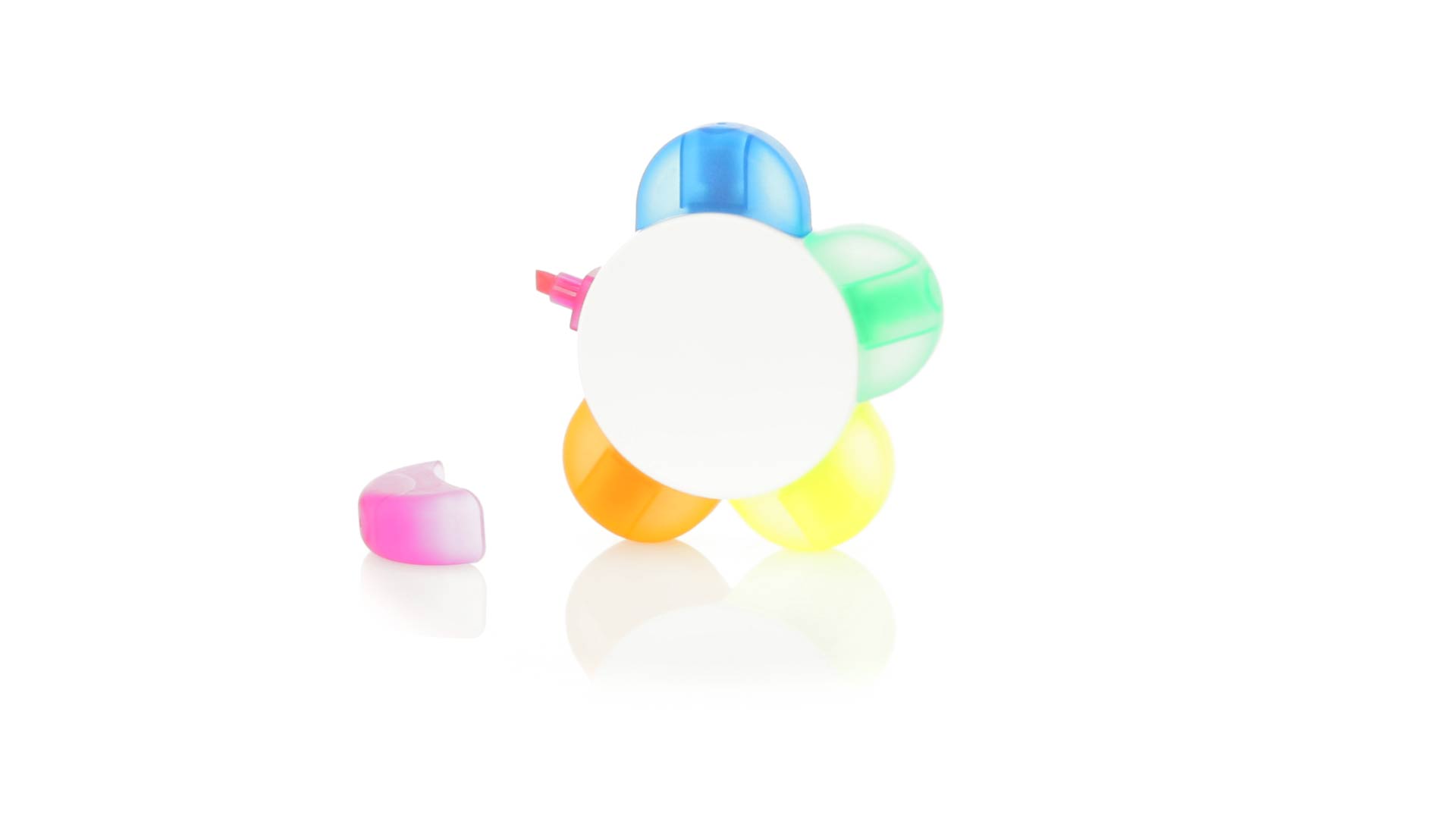 Satz von Markern im auffälligen Blumendesign. Mit grosser Druckfläche und Markern in den Farben Orange, Blau, Grün, Gelb und Pink.