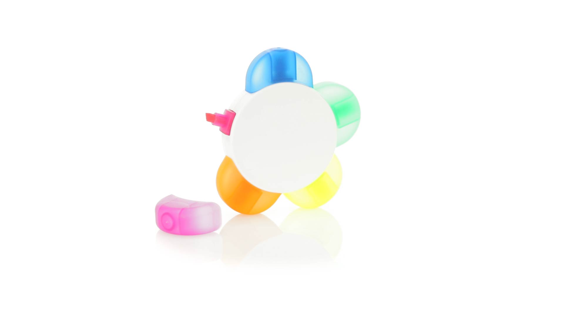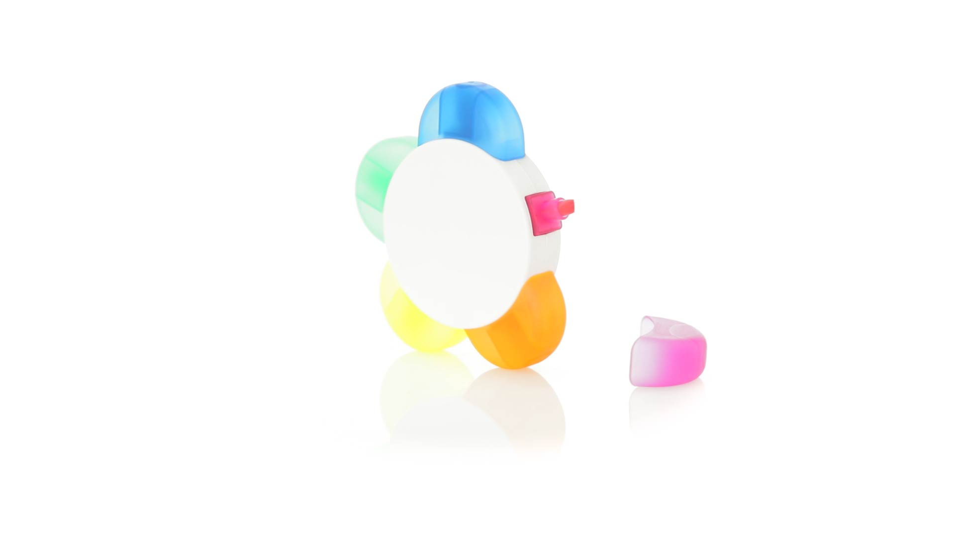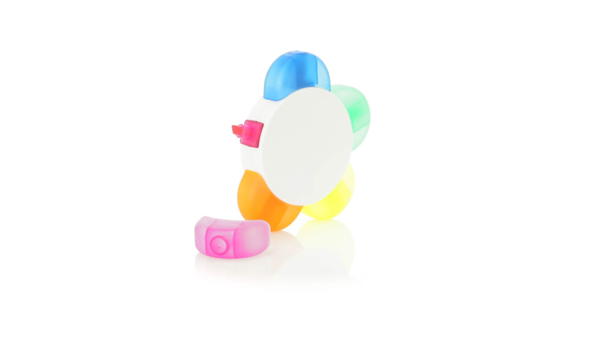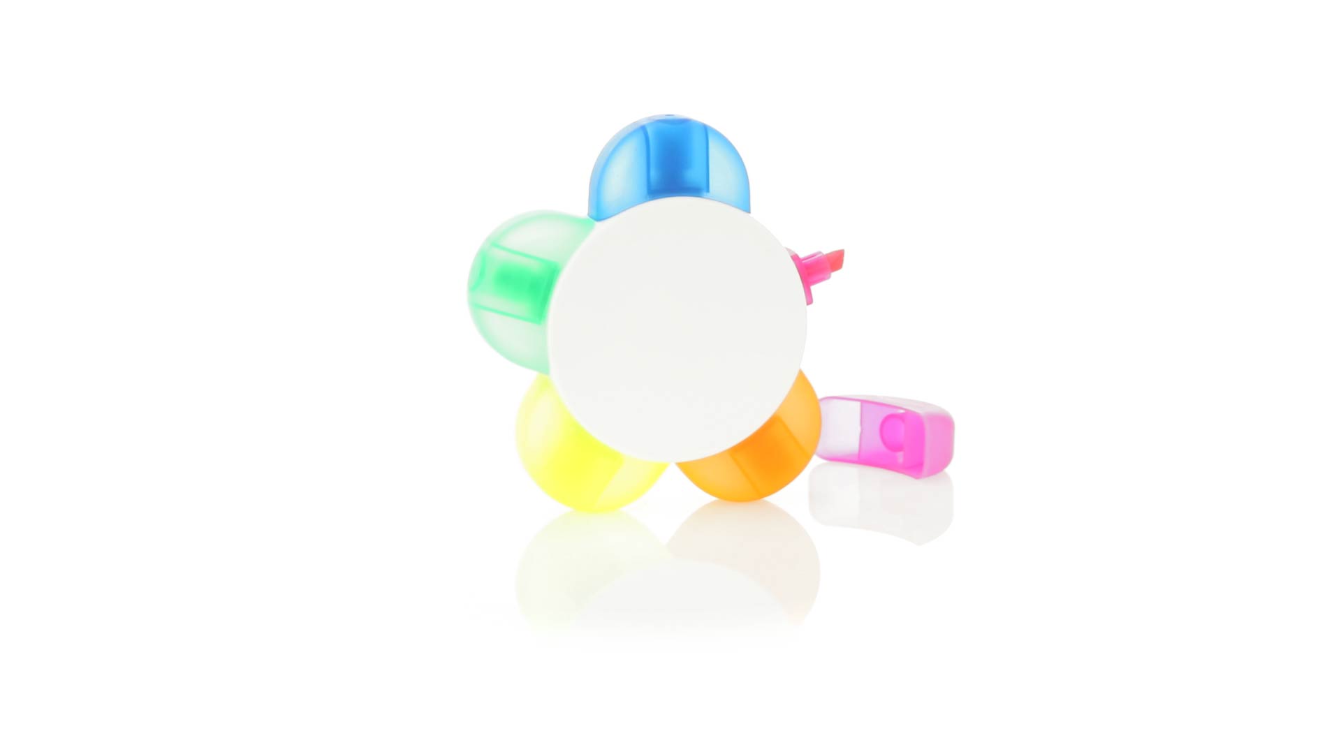 Satz von Markern im auffälligen Blumendesign. Mit grosser Druckfläche und Markern in den Farben Orange, Blau, Grün, Gelb und Pink.