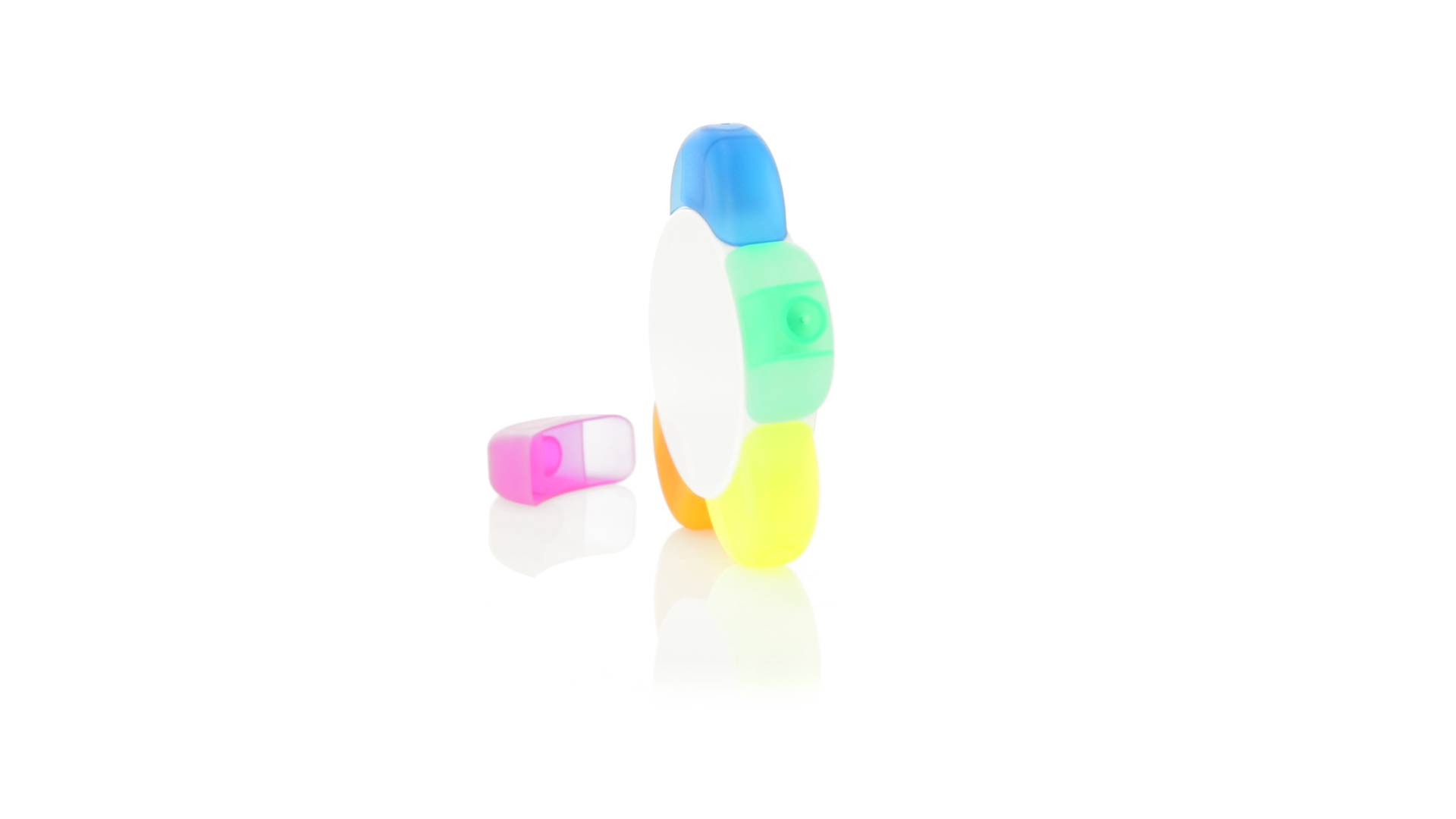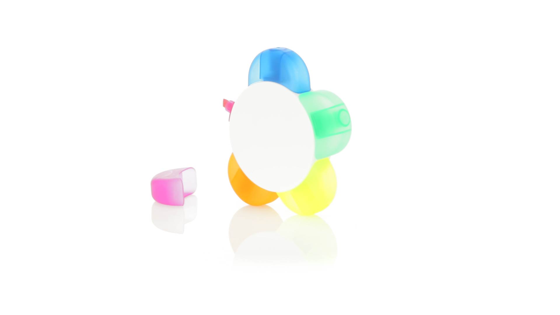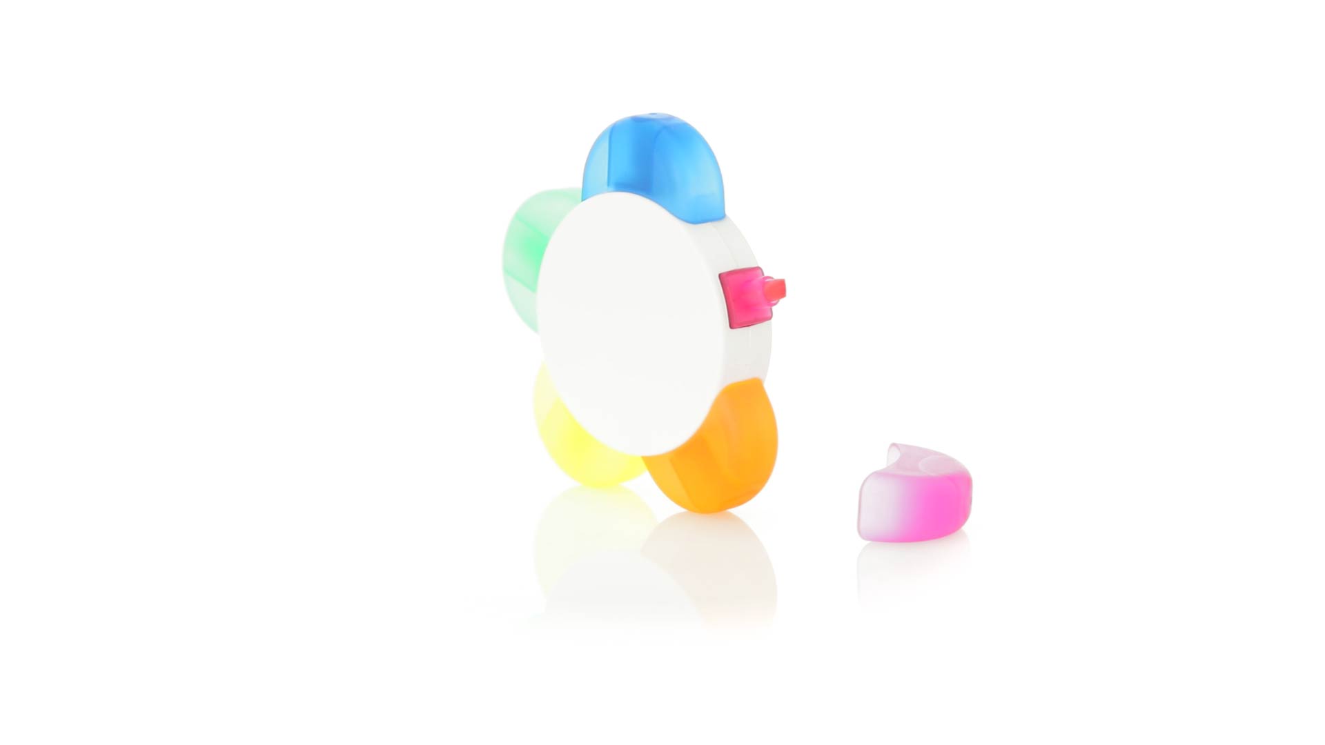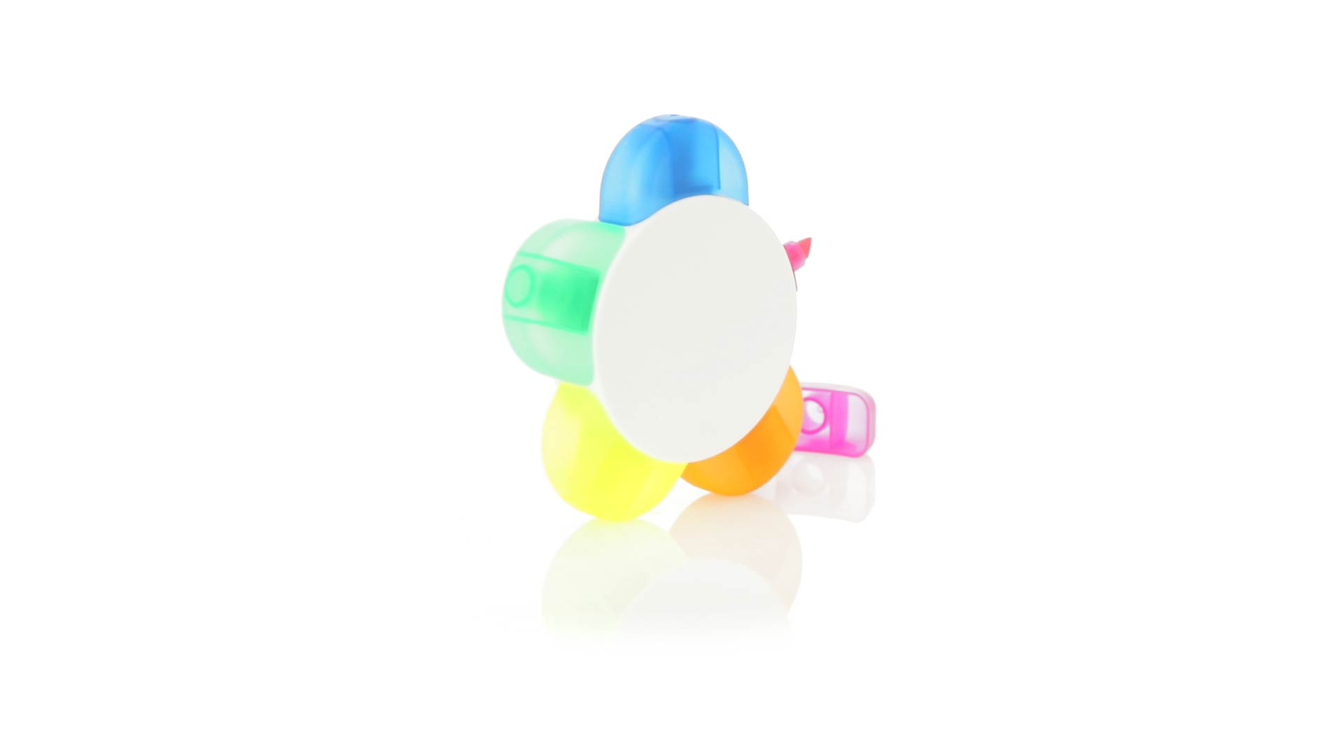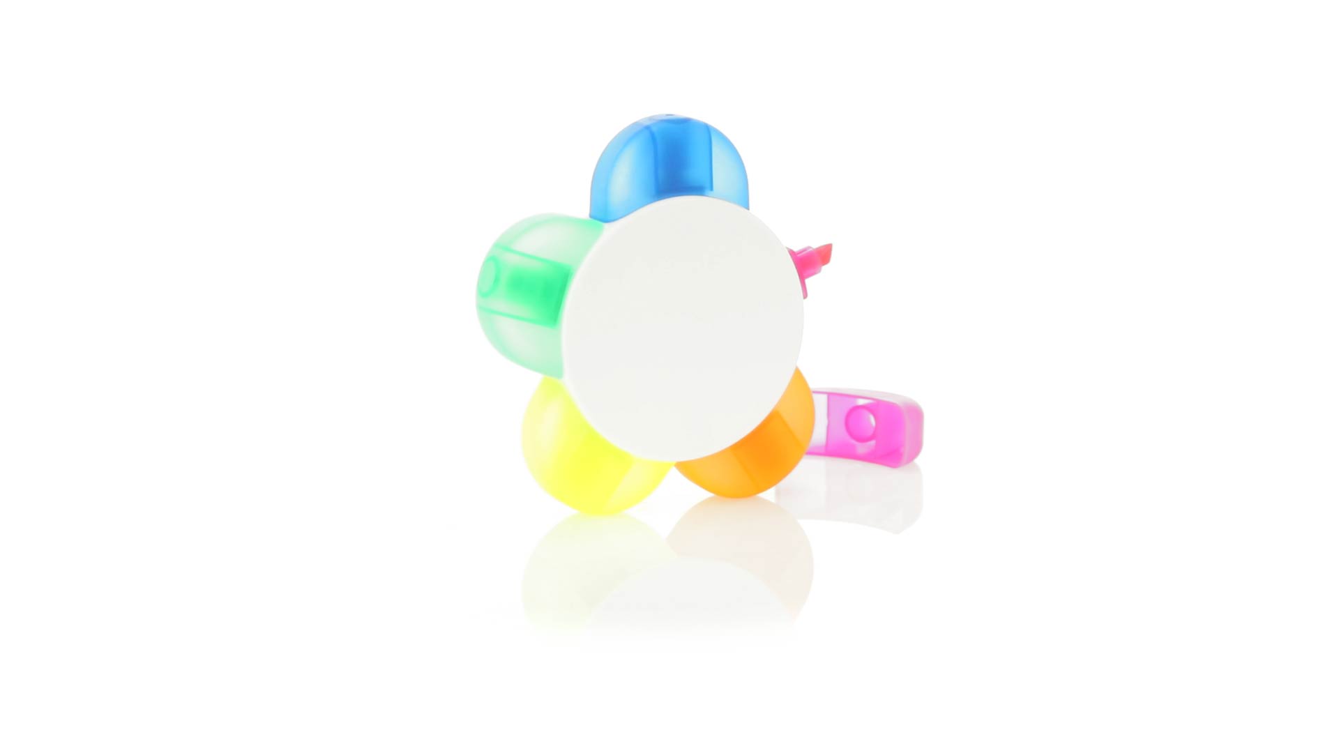 Satz von Markern im auffälligen Blumendesign. Mit grosser Druckfläche und Markern in den Farben Orange, Blau, Grün, Gelb und Pink.