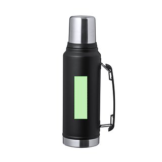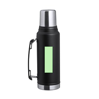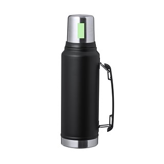 Thermoskanne aus Edelstahl mit einem Fassungsvermögen von 1L. Kombination aus schwarzer Farbe und poliertem Stahl, elegantes Finish und Schraubdeckel mit Tumbler-Funktion und 200ml Fassungsvermögen. Griff an der Seite zum einfachen Tragen und in einer Kraft-Design-Box präsentiert.