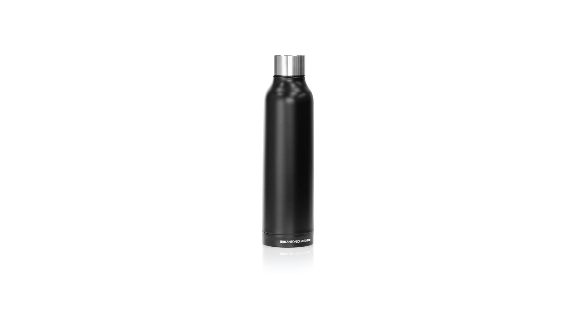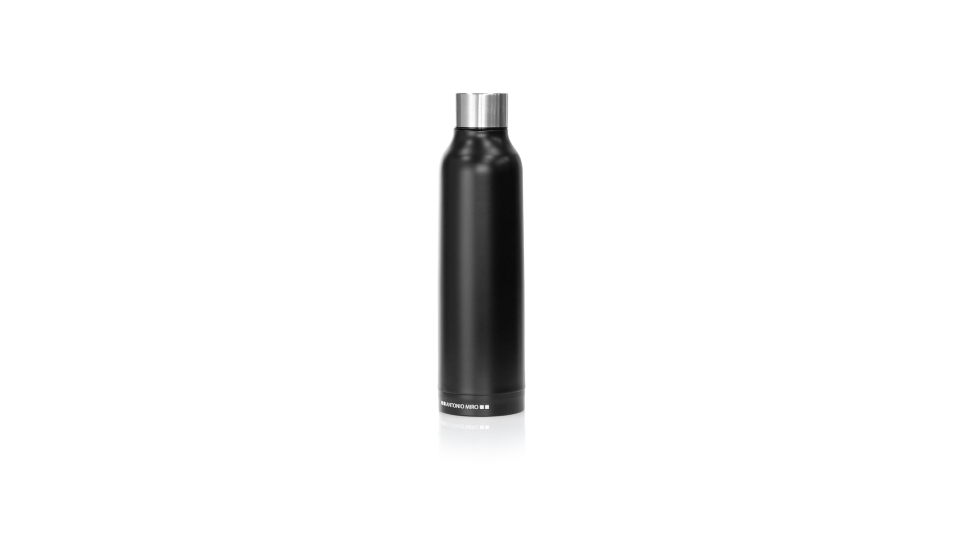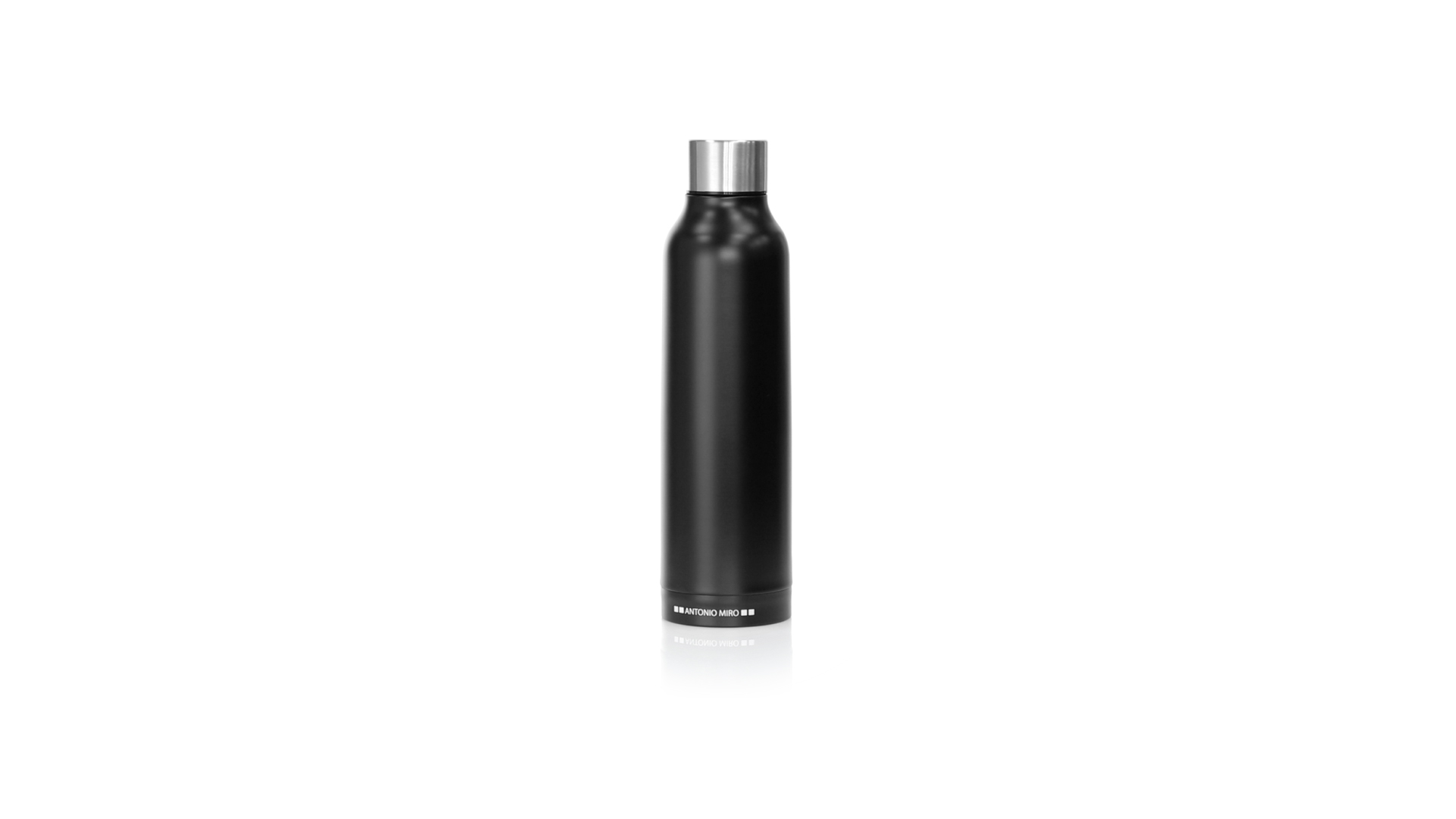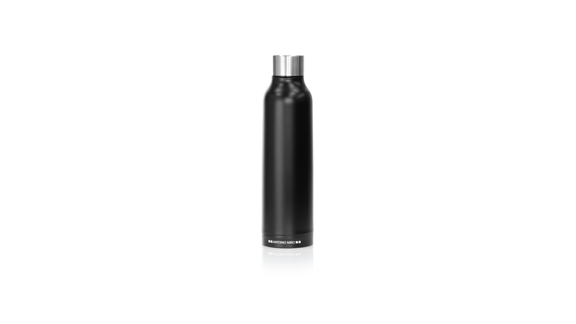 Thermoflasche aus Edelstahl von Antonio Miró. Mit einem Fassungsvermögen von 500 ml und doppelter Wand für eine bessere und dauerhafte Temperaturerhaltung. Mit schlichtem satinschwarzem Finish, Markenlogo am Boden und verchromtem Schraubdeckel. Präsentiert in einer attraktiven Designbox mit Markenlogo.