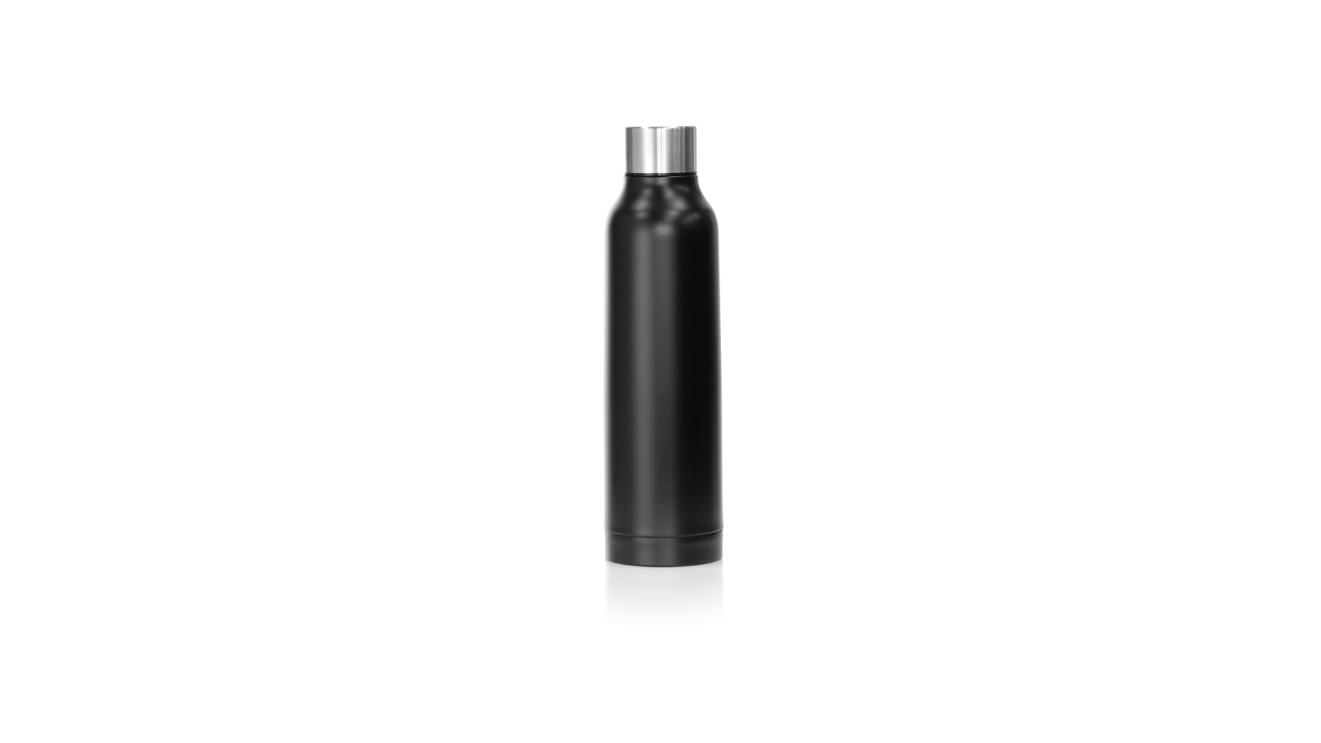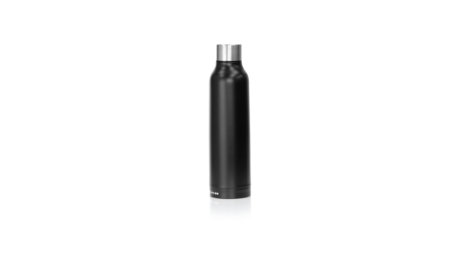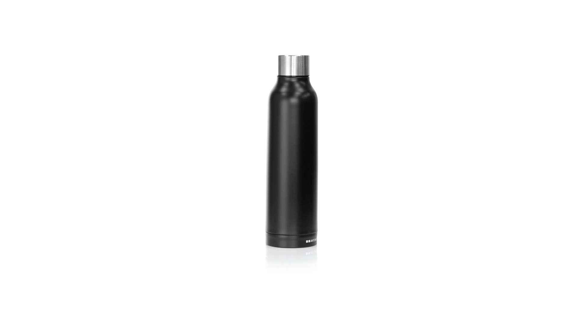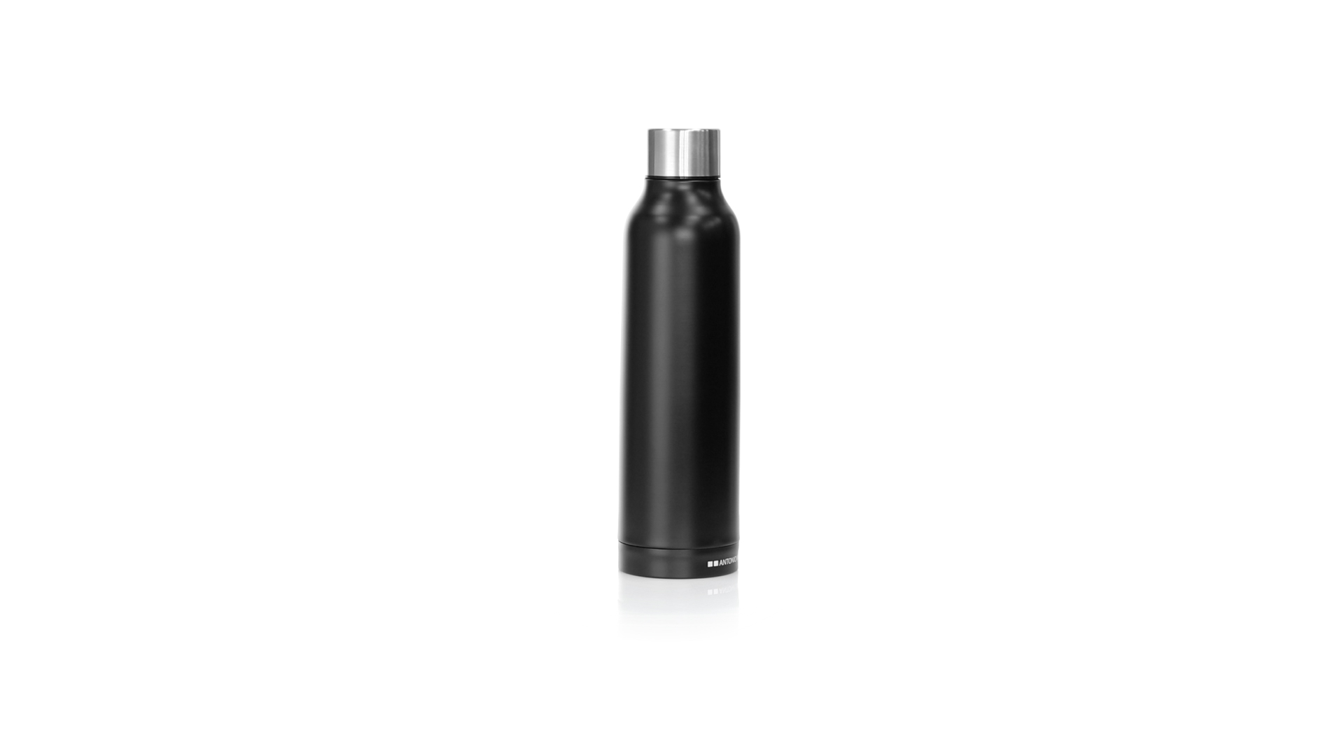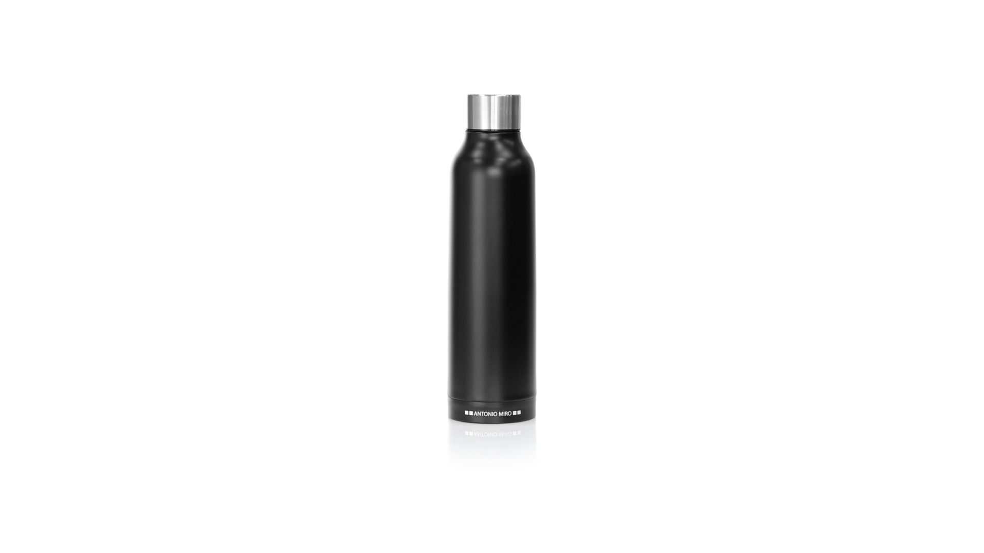 Thermoflasche aus Edelstahl von Antonio Miró. Mit einem Fassungsvermögen von 500 ml und doppelter Wand für eine bessere und dauerhafte Temperaturerhaltung. Mit schlichtem satinschwarzem Finish, Markenlogo am Boden und verchromtem Schraubdeckel. Präsentiert in einer attraktiven Designbox mit Markenlogo.