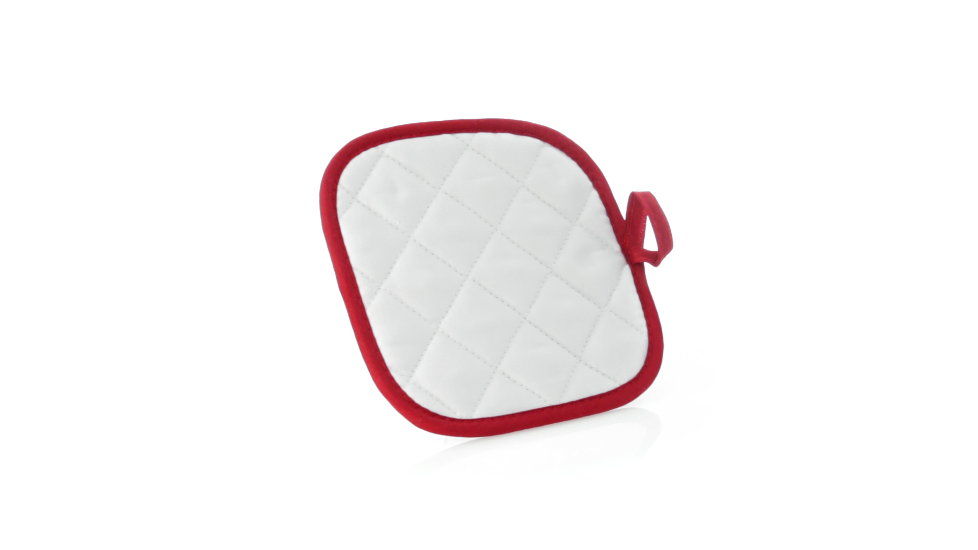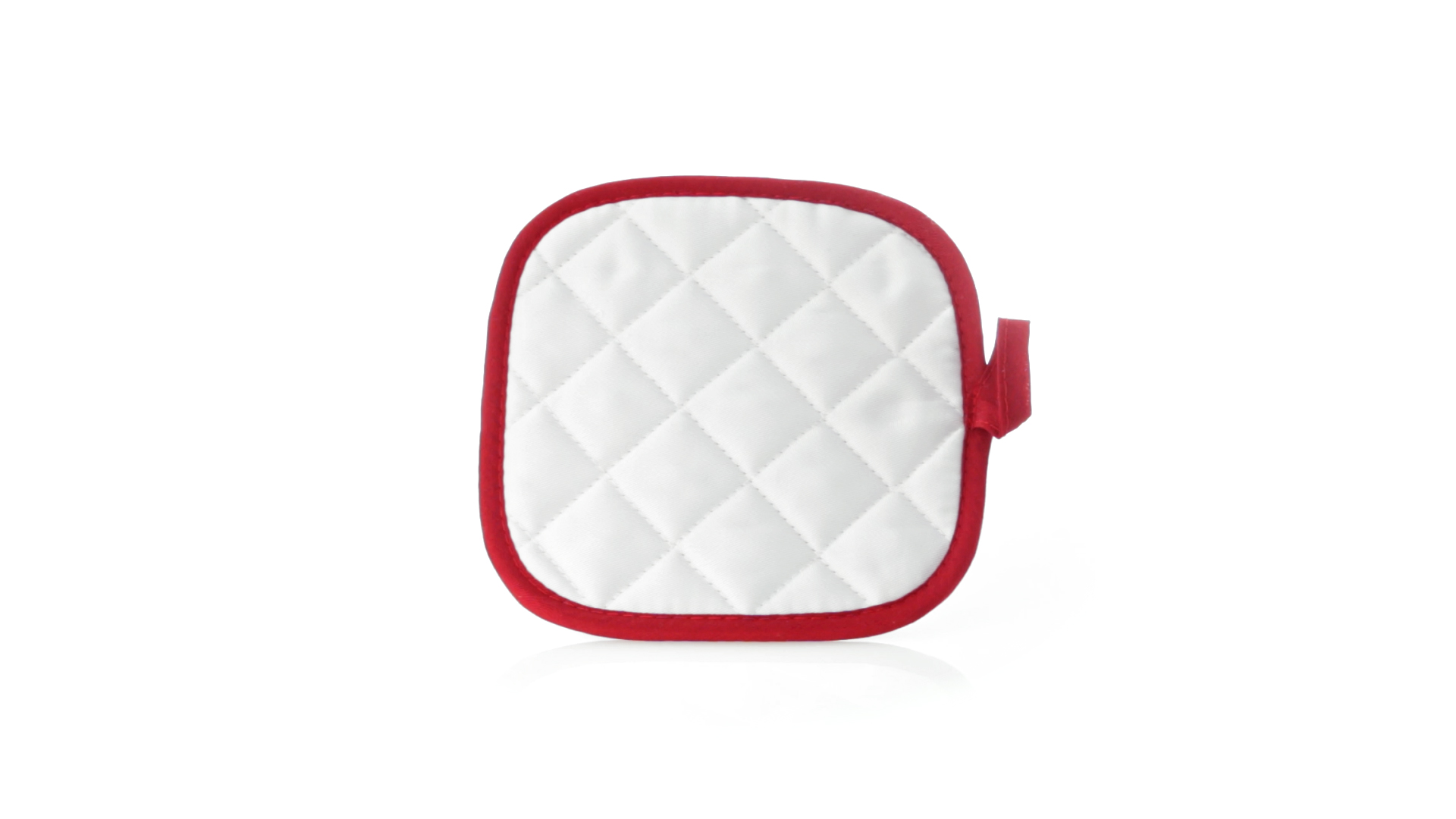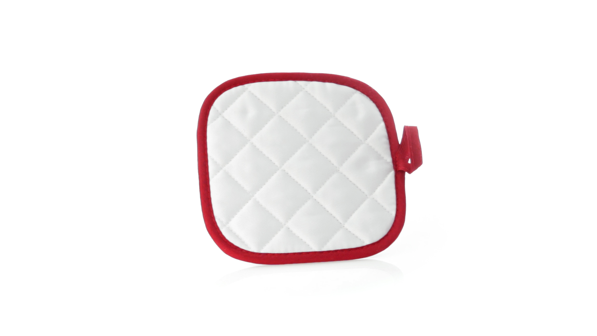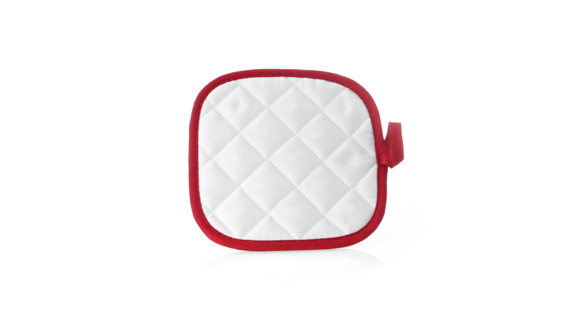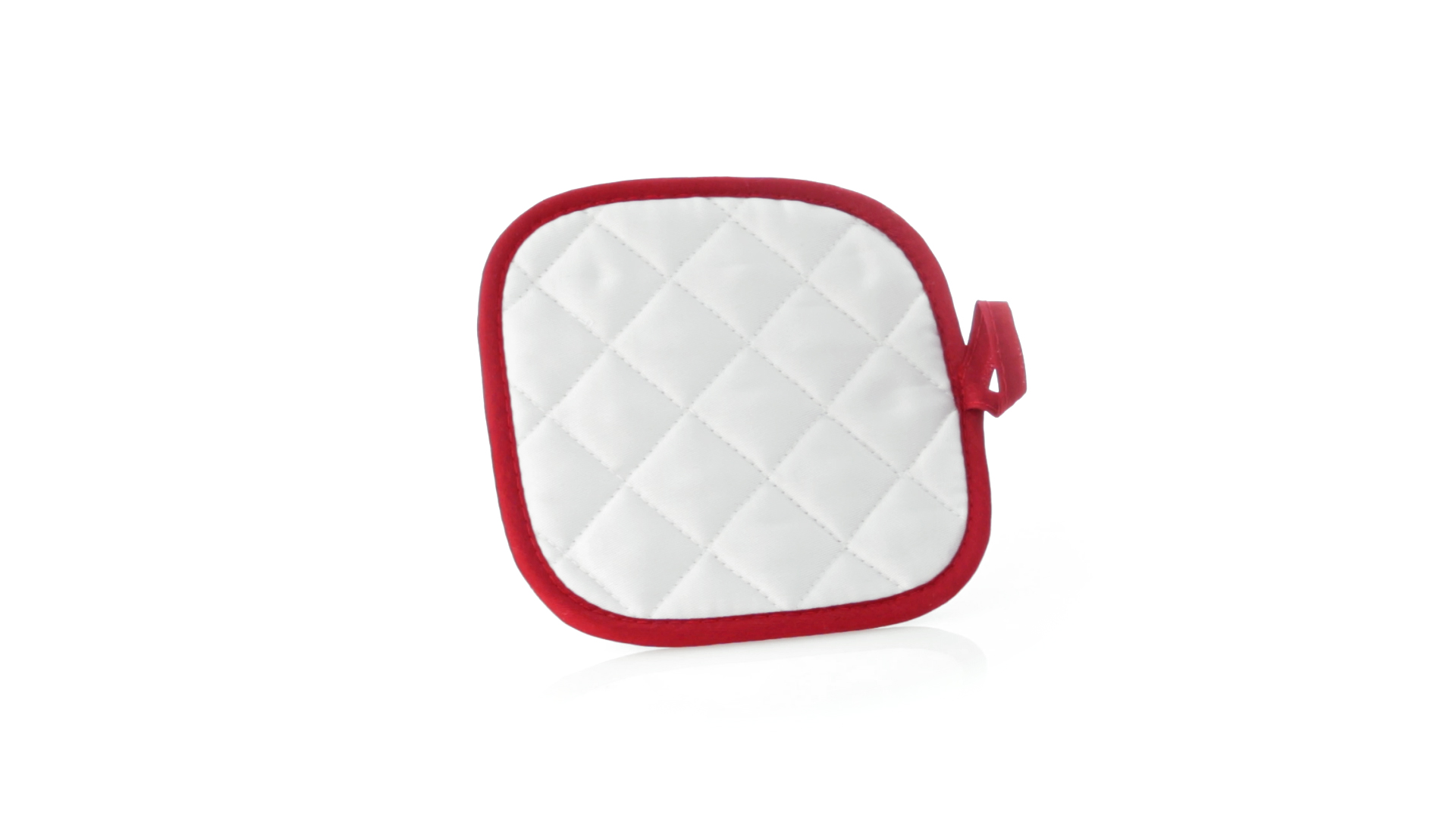 Weicher Topflappen aus 100 % Polyester in Weiss, mit Rändern in kräftigen Farben. Mit Schlaufe zum Aufhängen und einer glatten Seite - speziell für den Sublimationsdruck entwickelt.