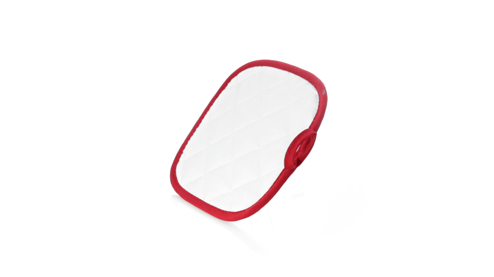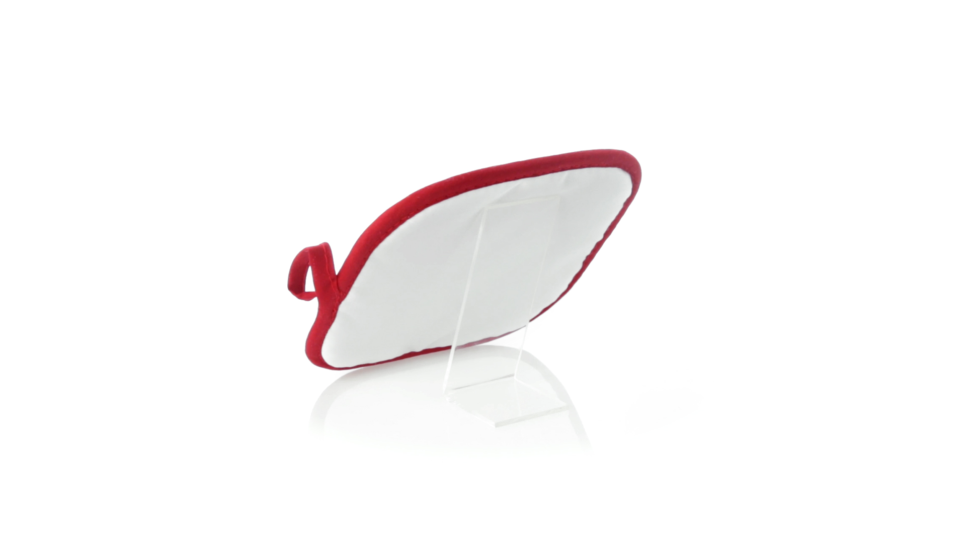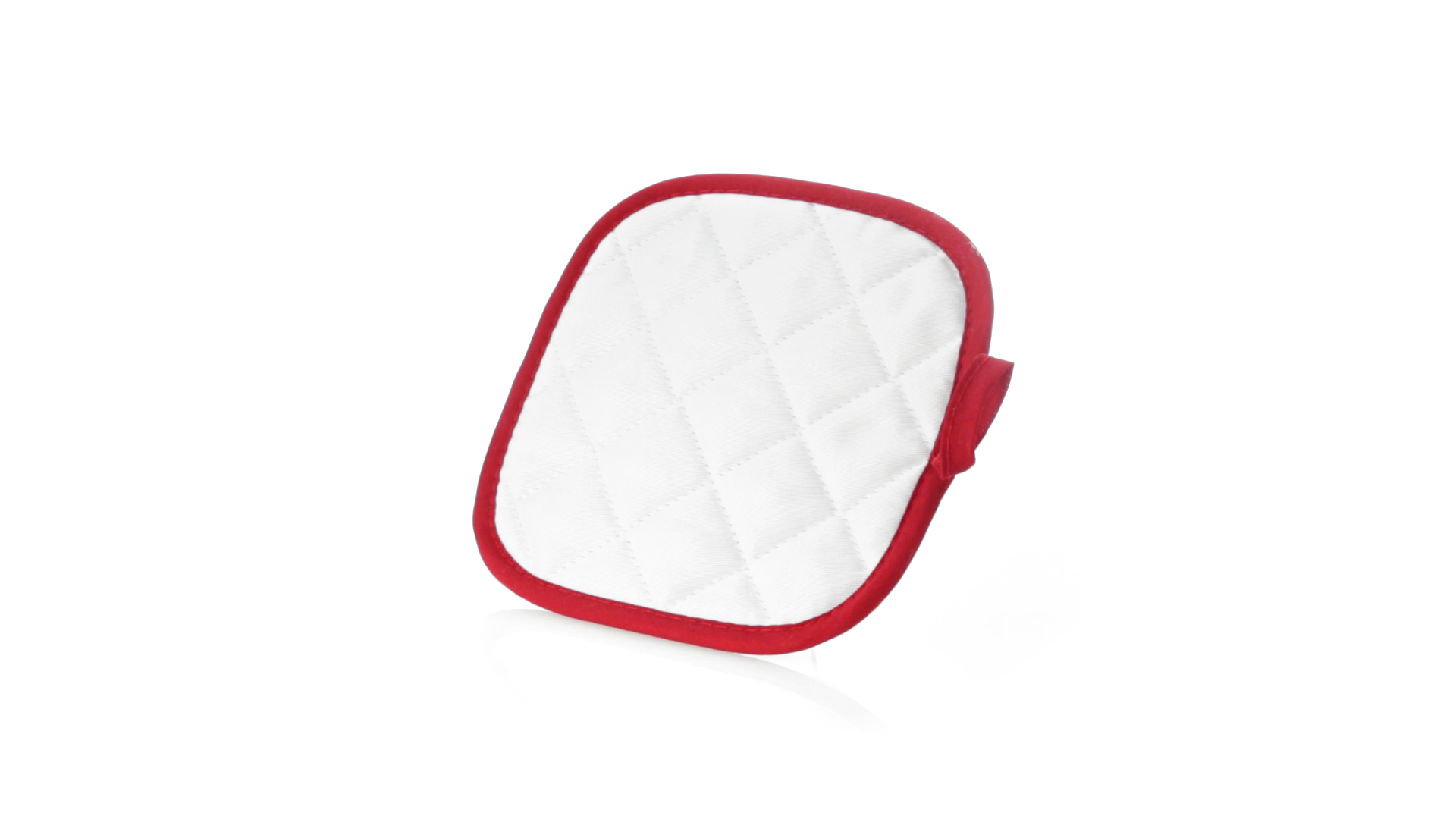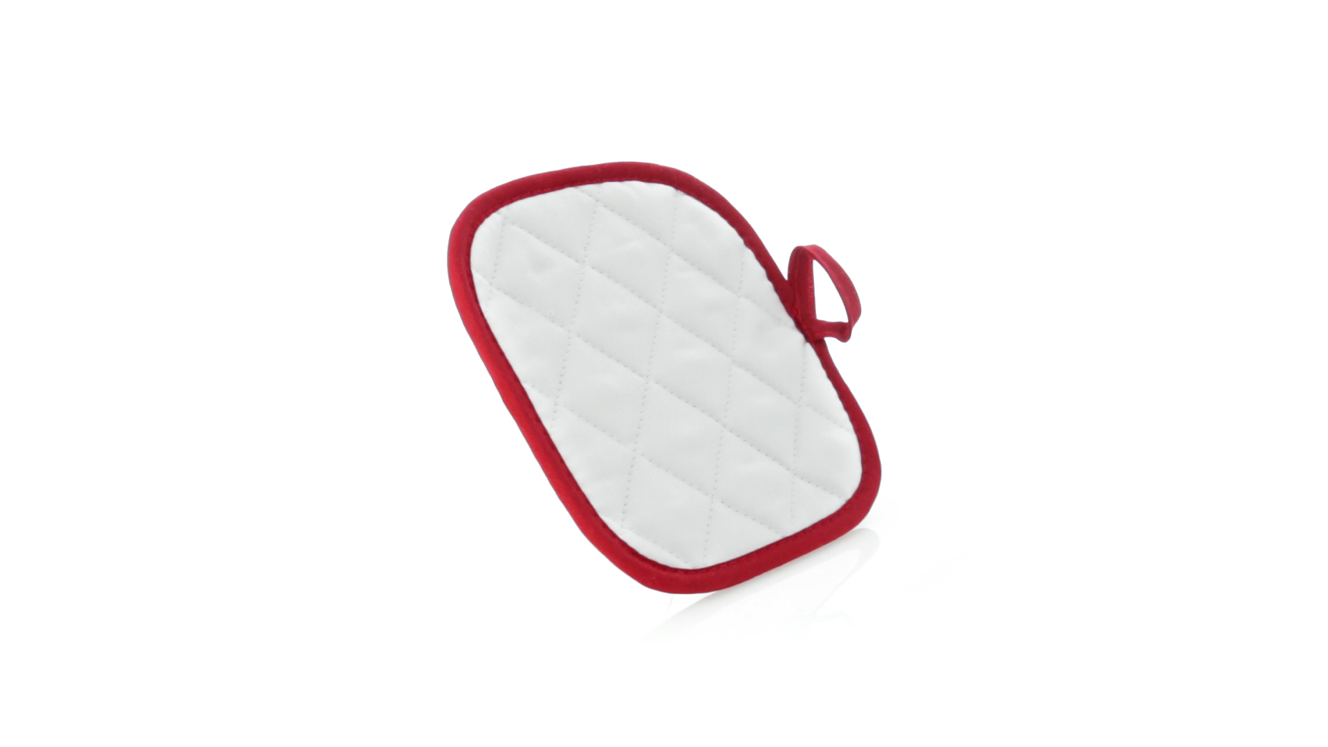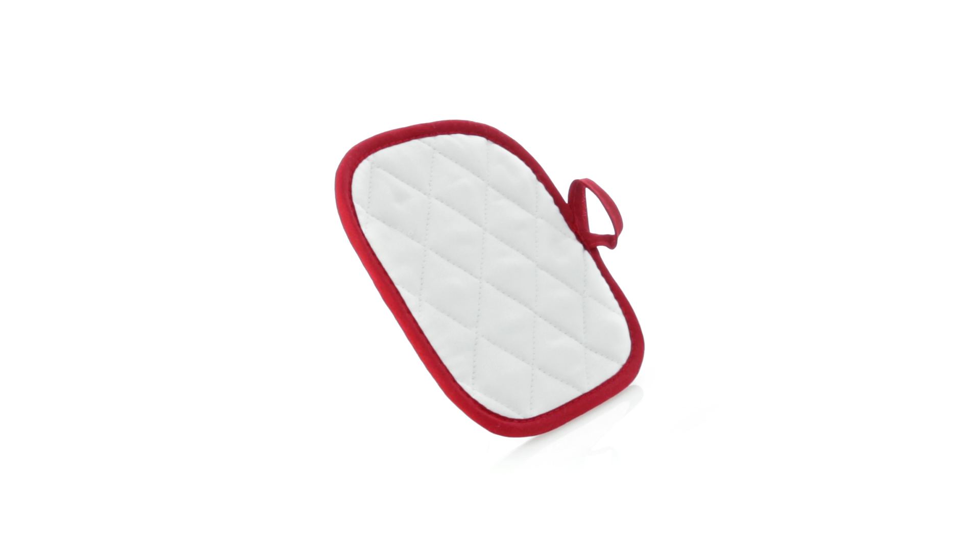 Weicher Topflappen aus 100 % Polyester in Weiss, mit Rändern in kräftigen Farben. Mit Schlaufe zum Aufhängen und einer glatten Seite - speziell für den Sublimationsdruck entwickelt.