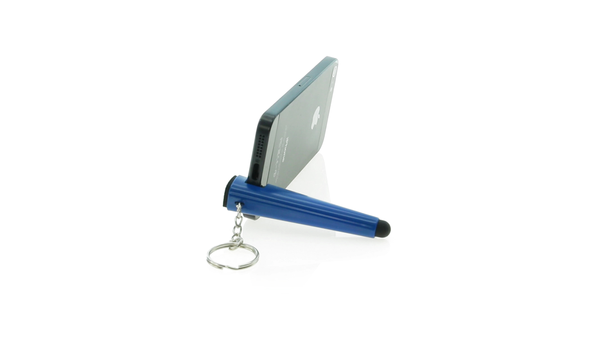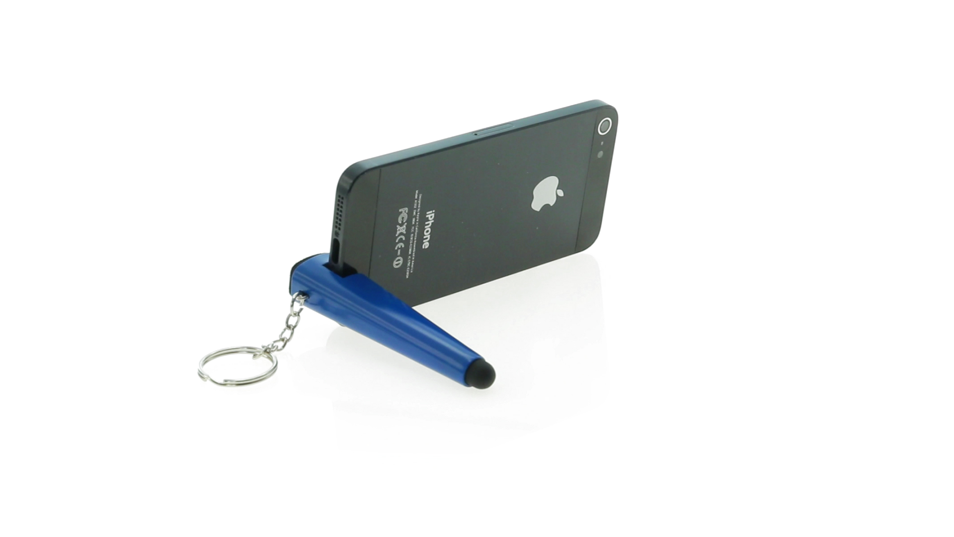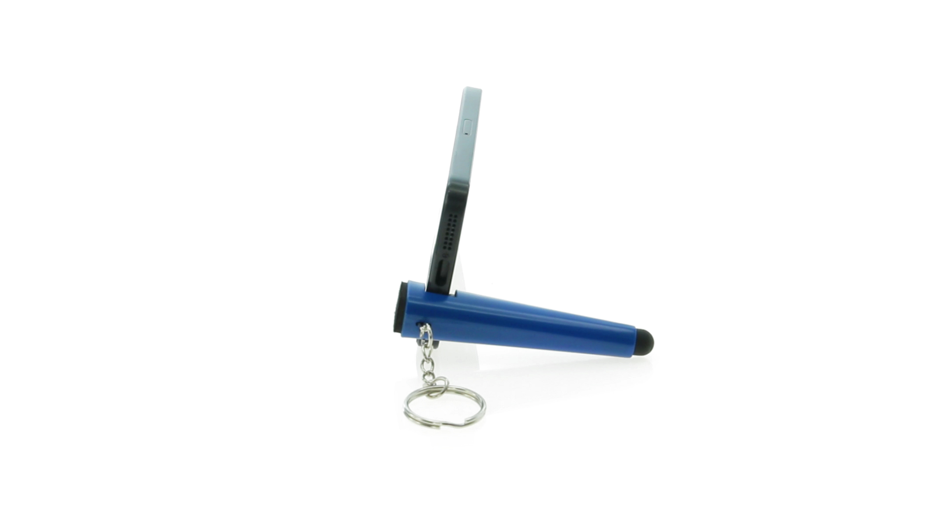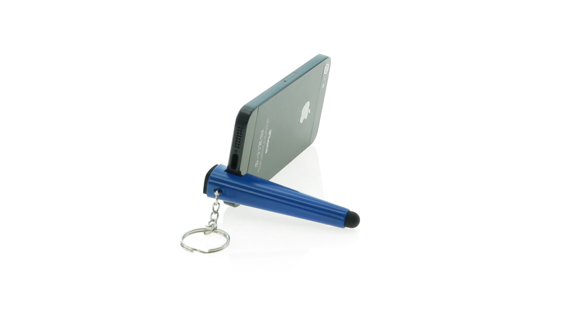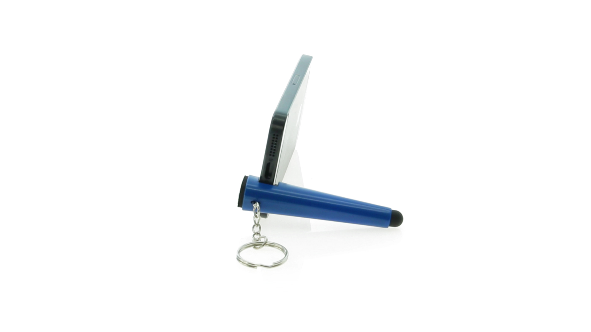 Multifunktions-Schlüsselanhänger mit Smartphone-Ständer und integriertem Stylus. Gehäuse in kräftigen, glänzenden Farben.