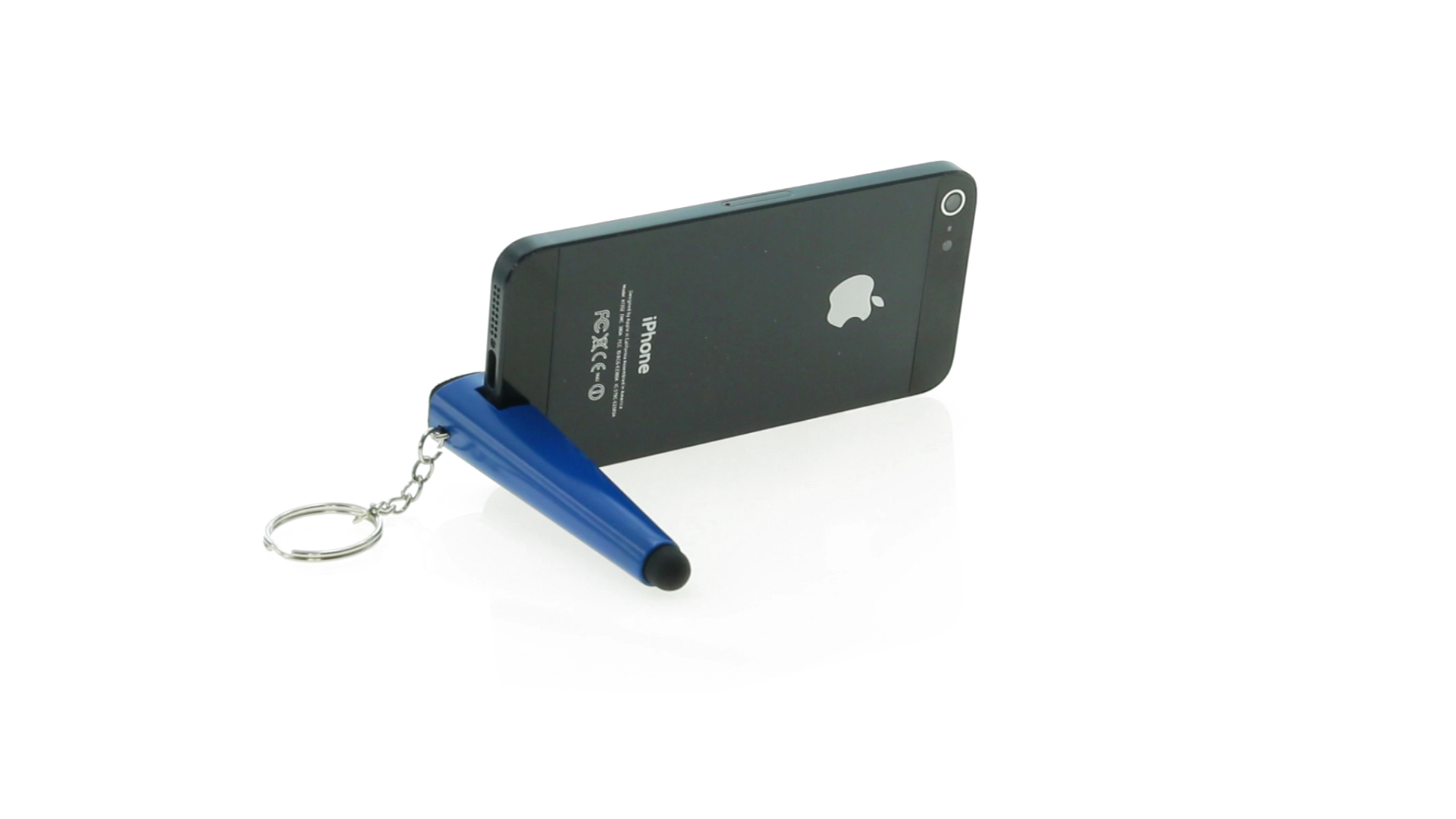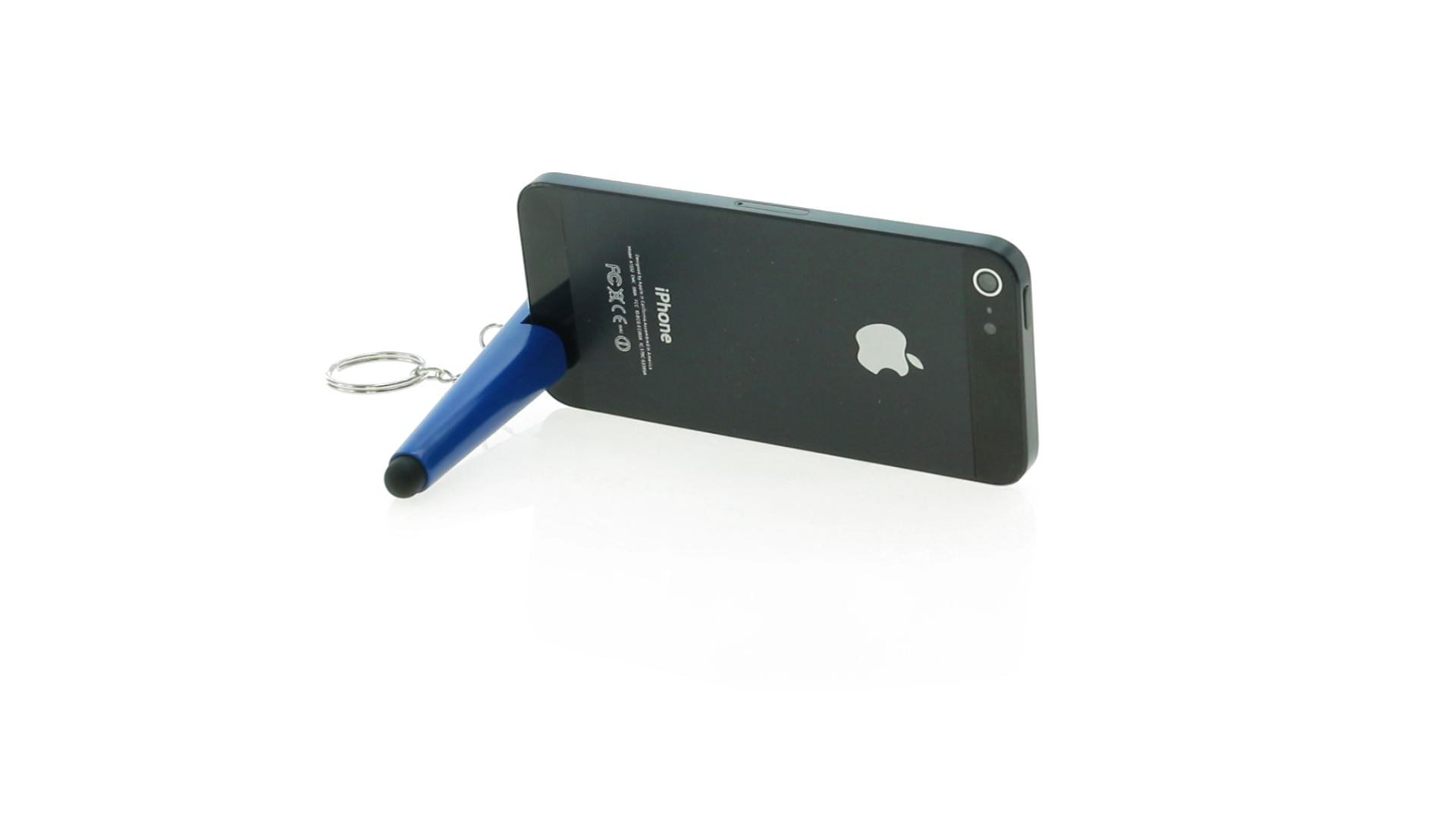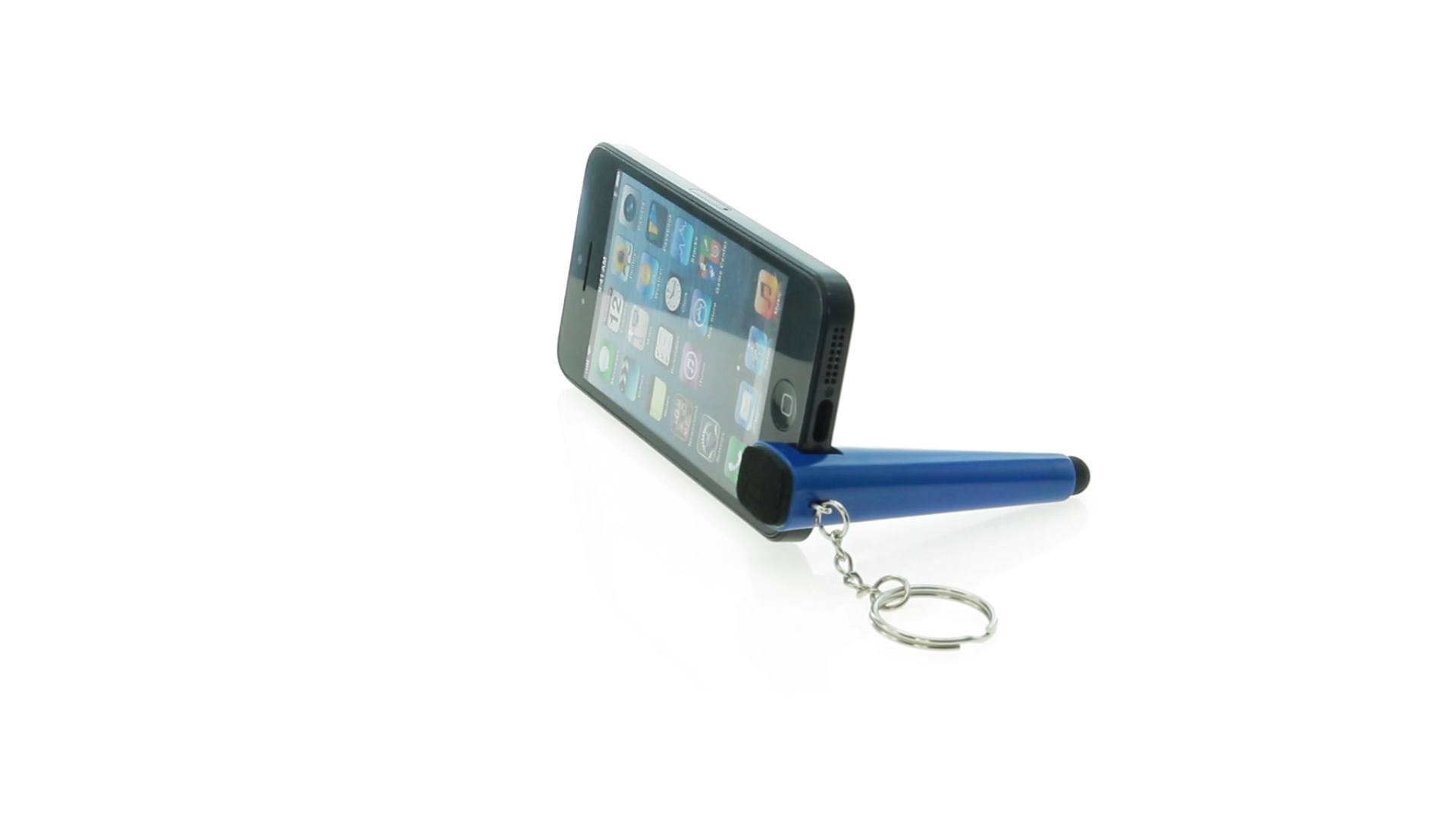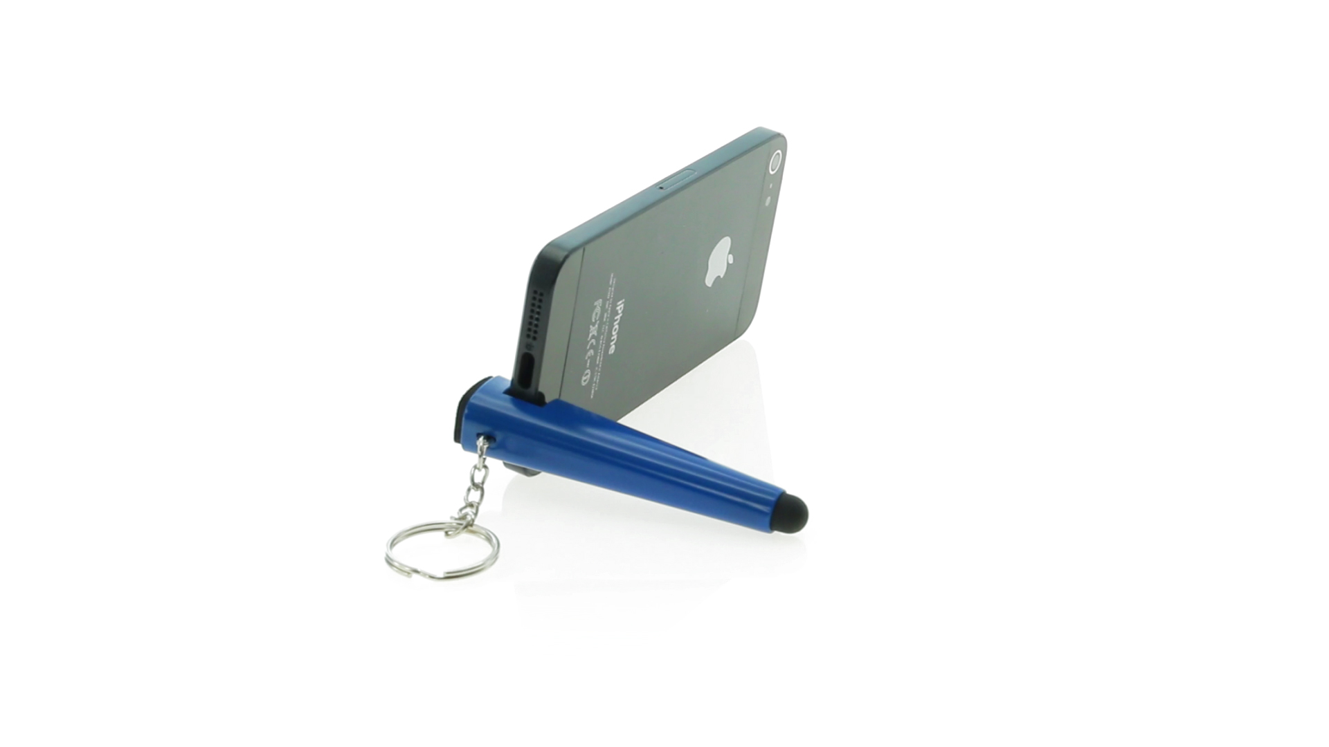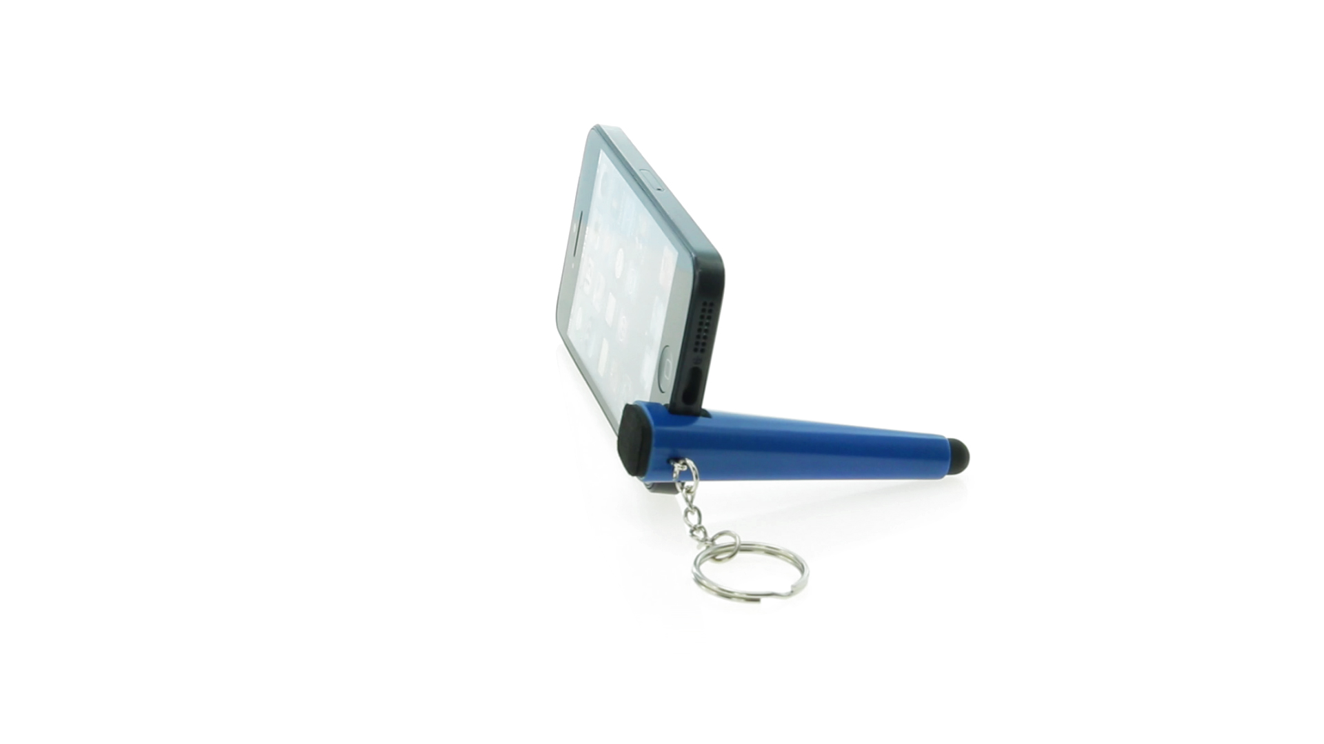Multifunktions-Schlüsselanhänger mit Smartphone-Ständer und integriertem Stylus. Gehäuse in kräftigen, glänzenden Farben.