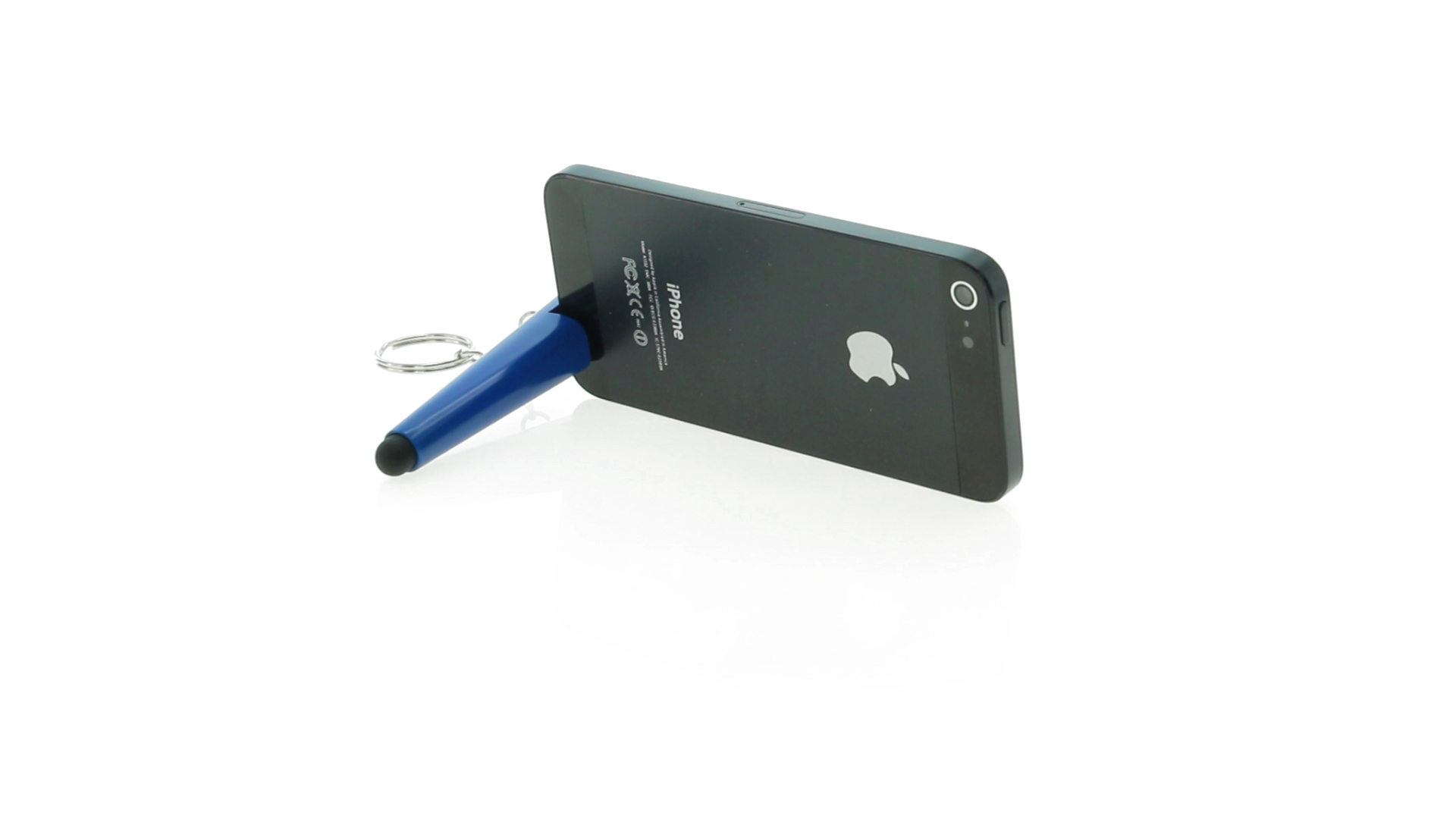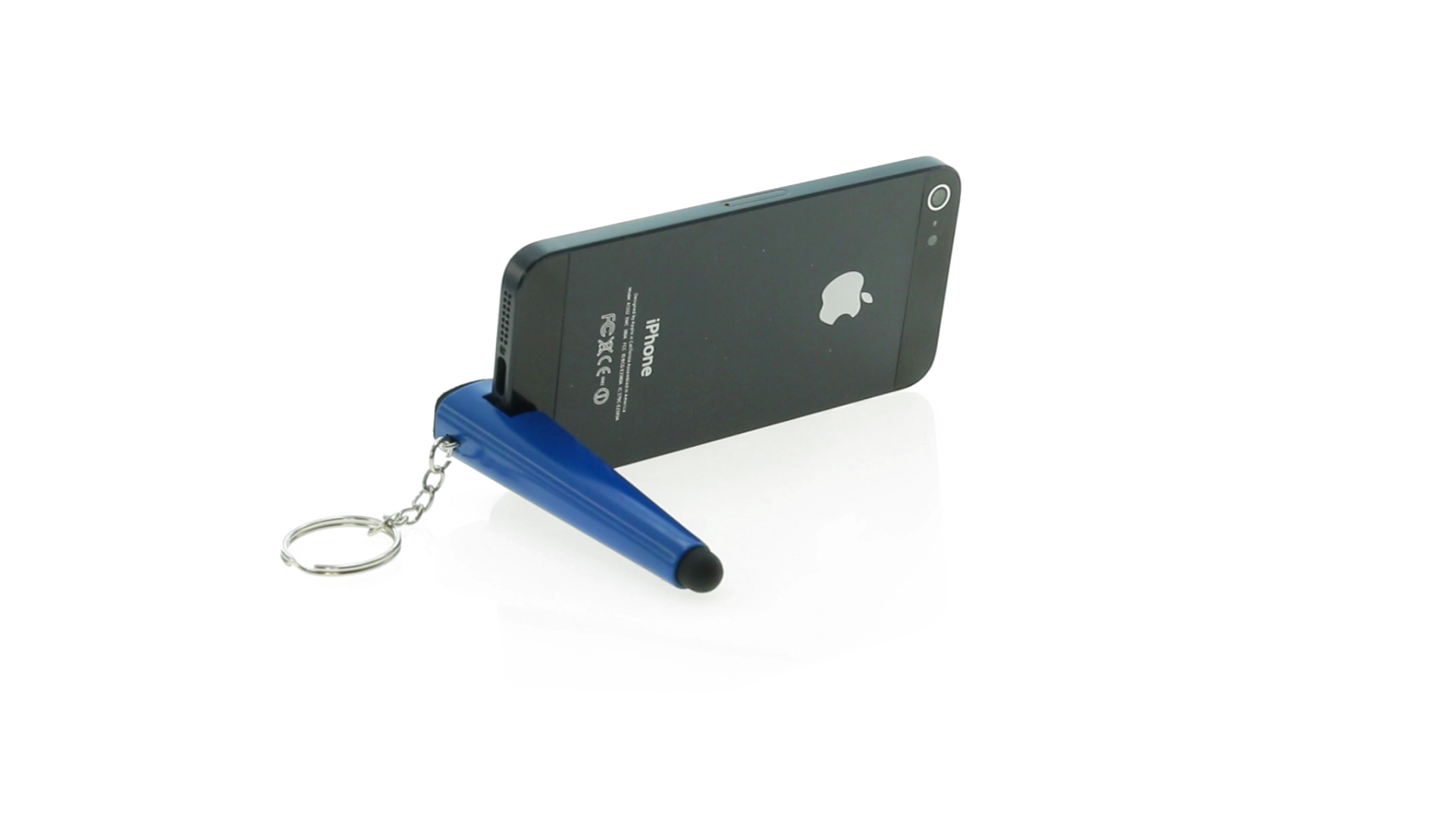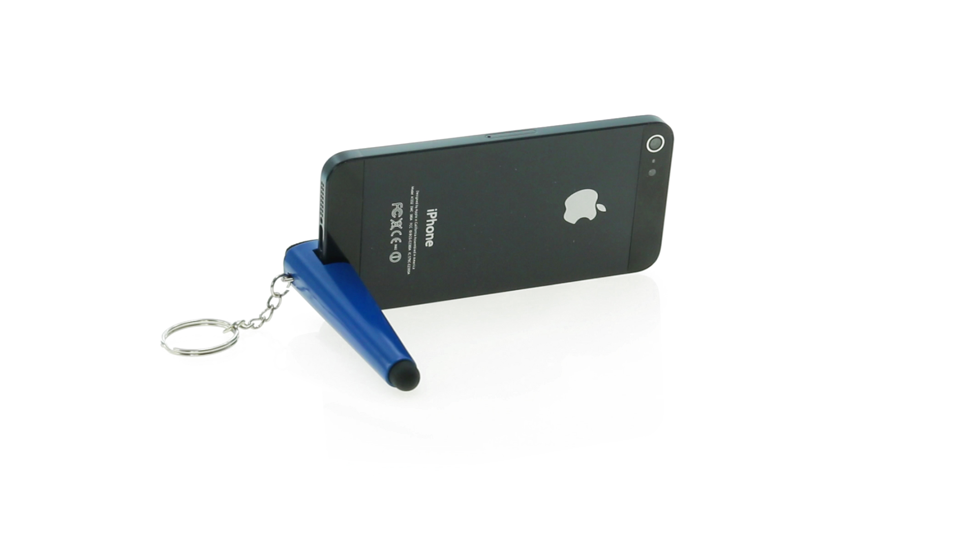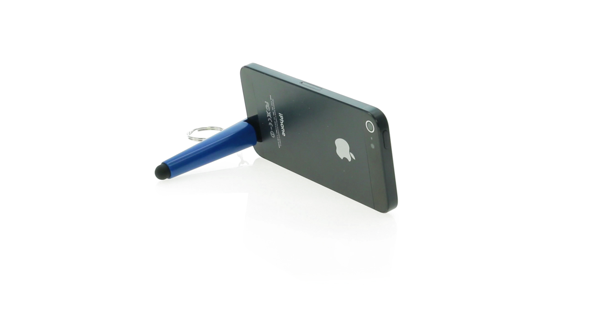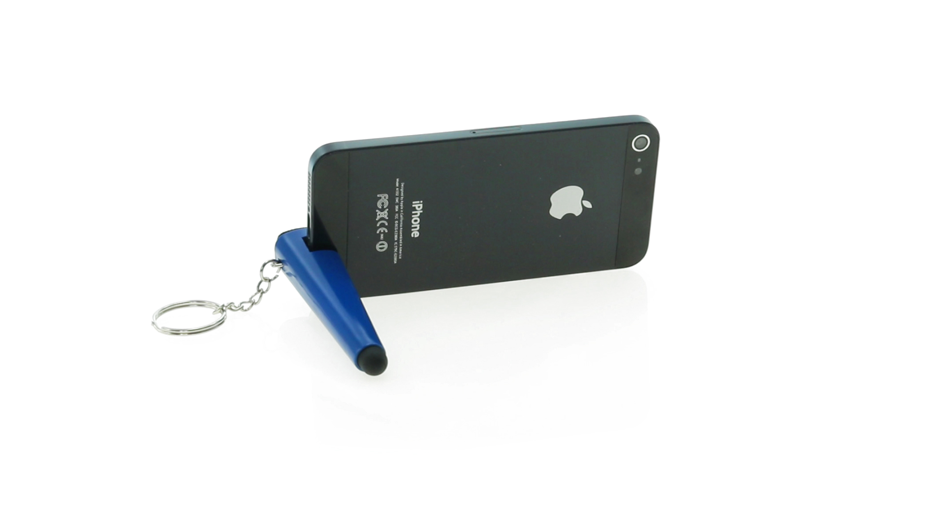 Multifunktions-Schlüsselanhänger mit Smartphone-Ständer und integriertem Stylus. Gehäuse in kräftigen, glänzenden Farben.