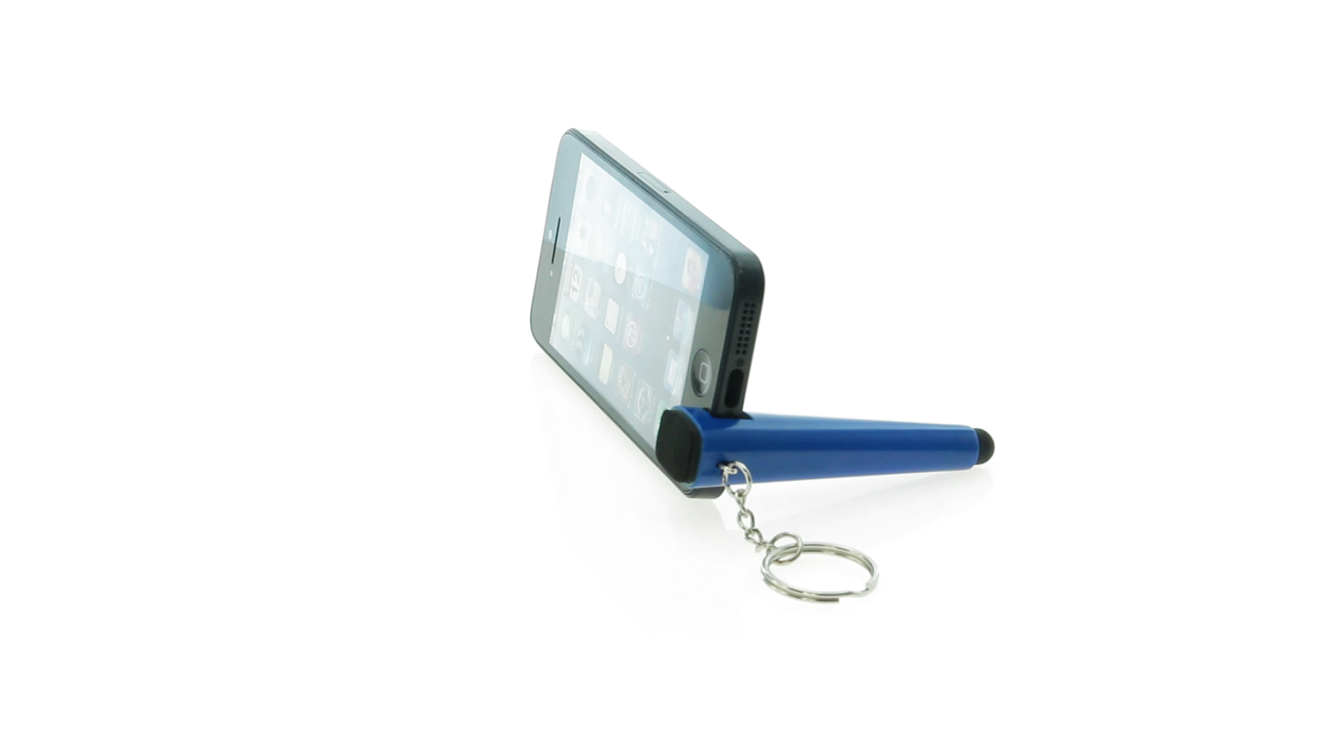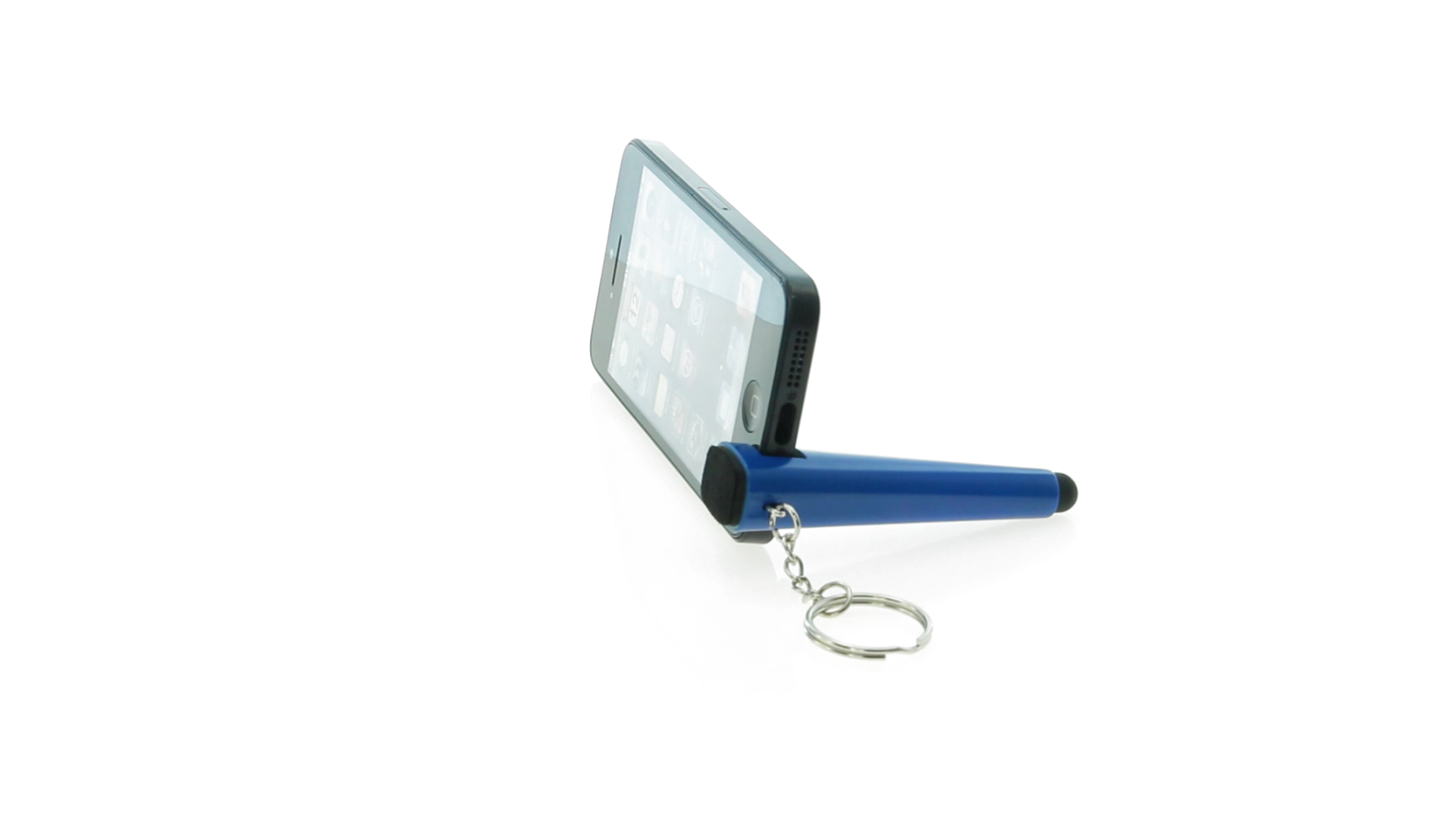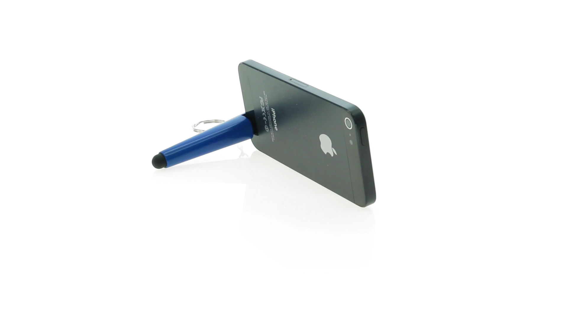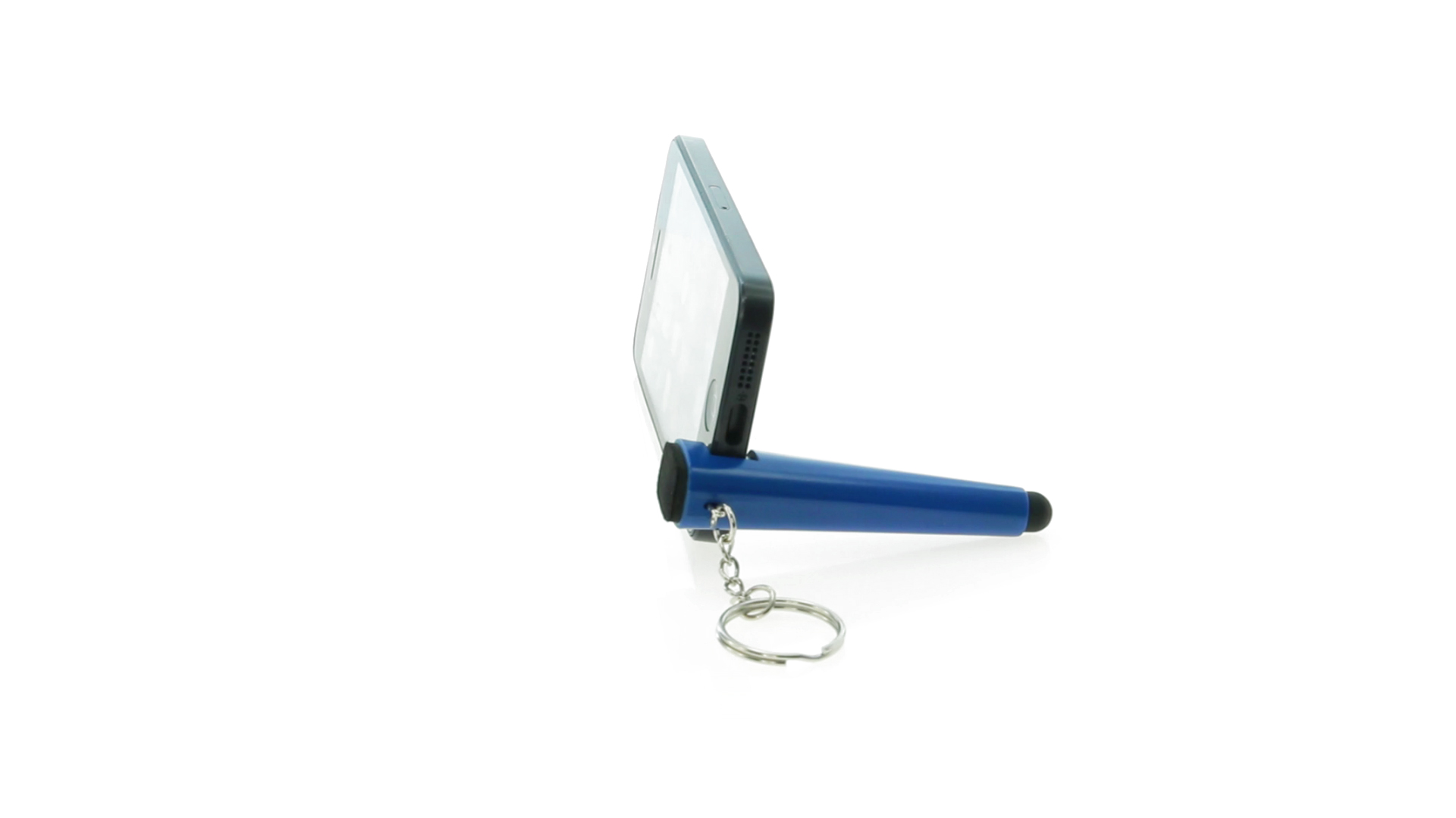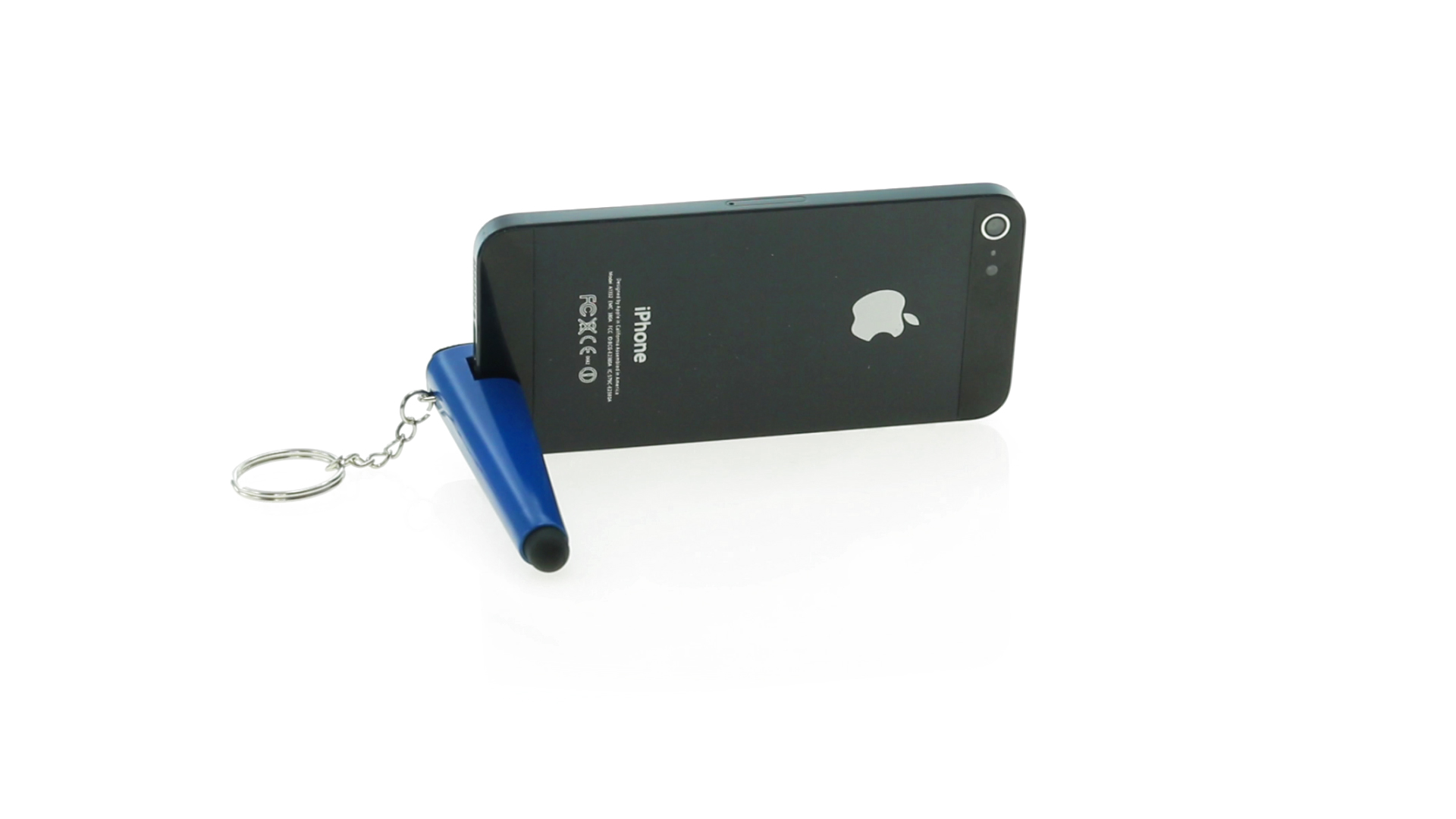 Multifunktions-Schlüsselanhänger mit Smartphone-Ständer und integriertem Stylus. Gehäuse in kräftigen, glänzenden Farben.