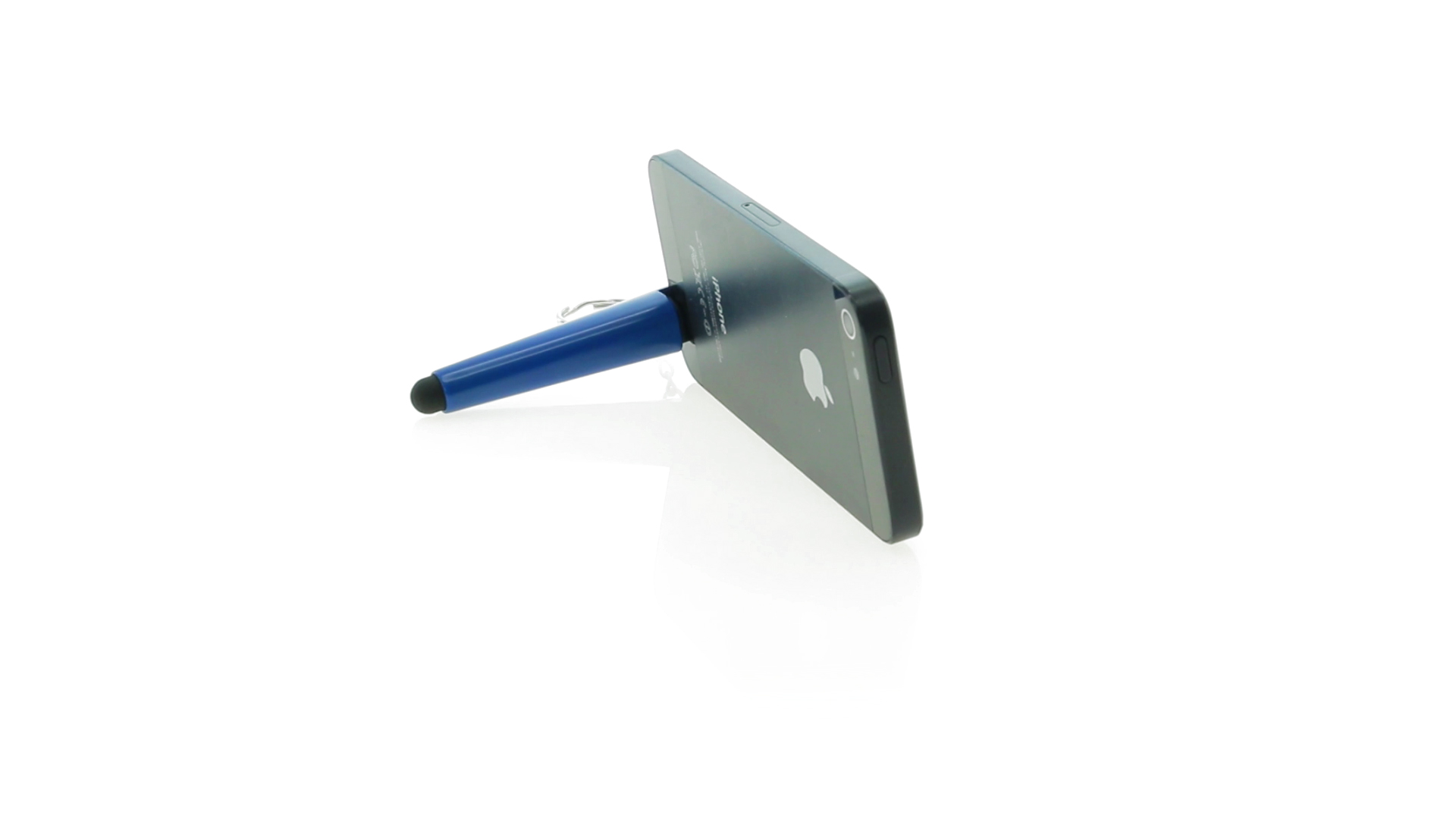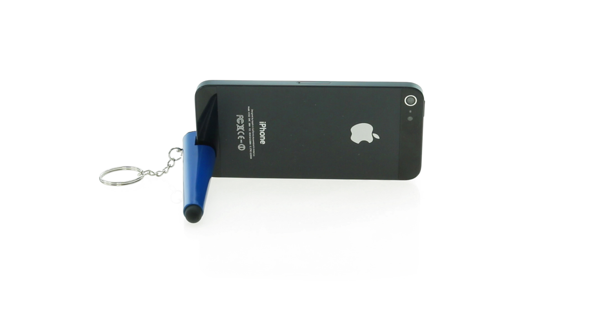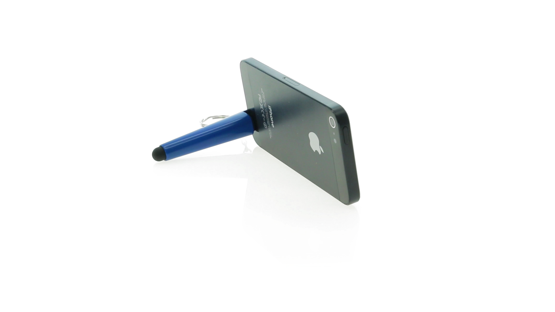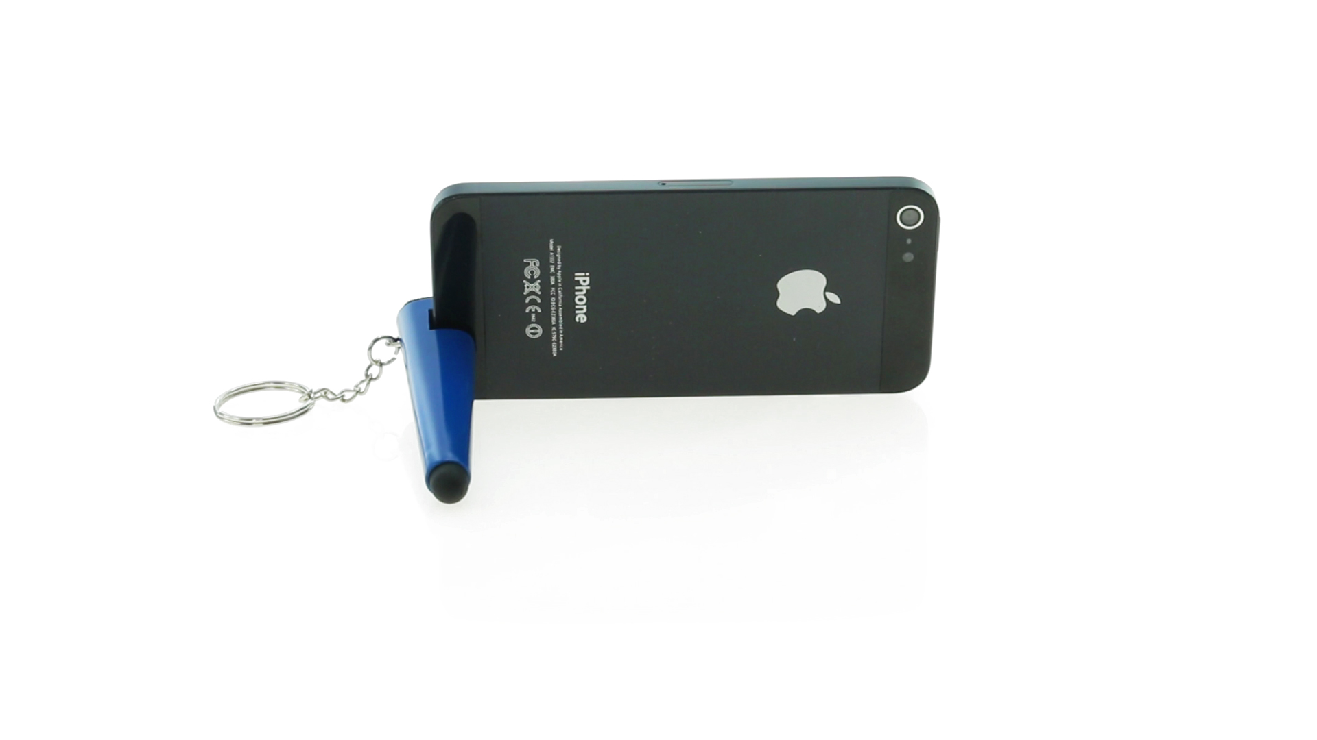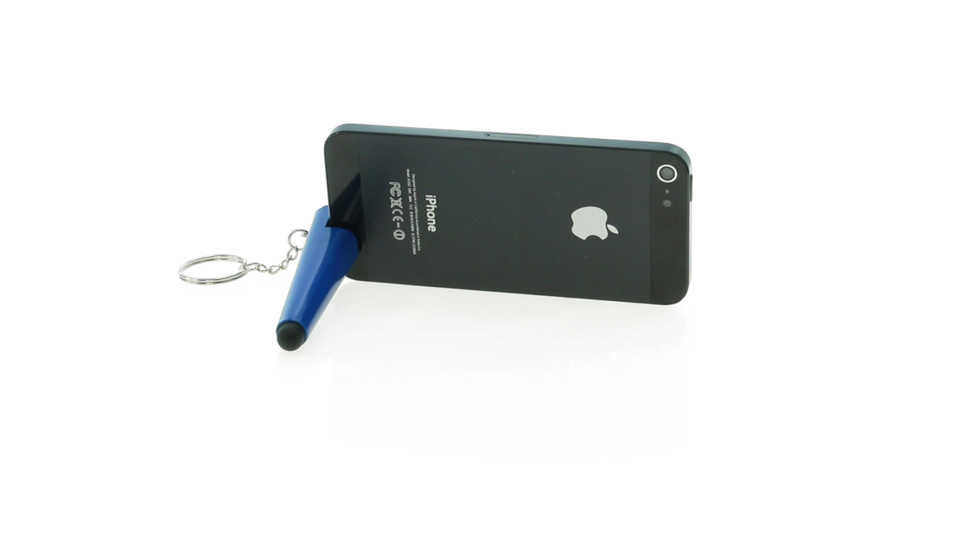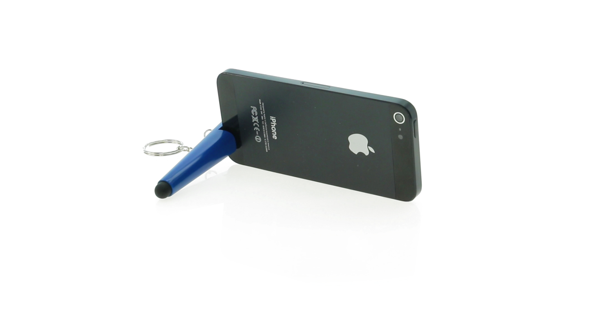Multifunktions-Schlüsselanhänger mit Smartphone-Ständer und integriertem Stylus. Gehäuse in kräftigen, glänzenden Farben.
